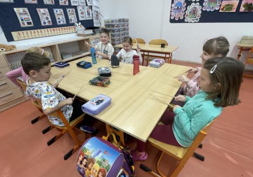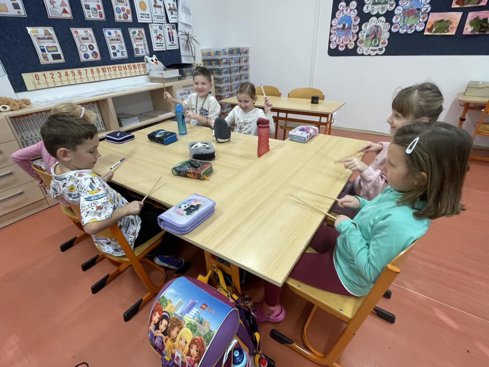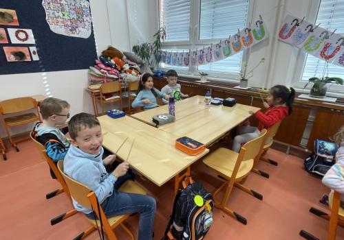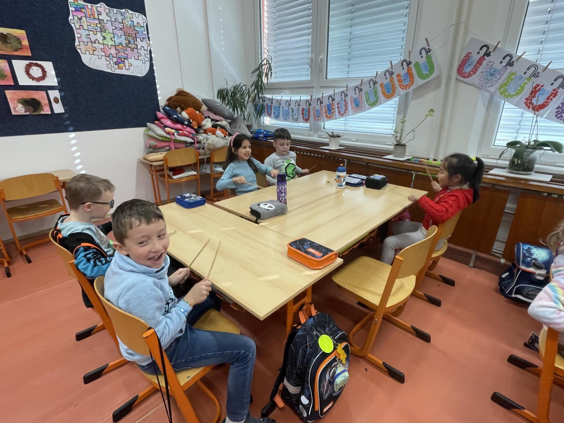 Žáci naší třídy bubnovali do lavic a využili k tomu připravené dřevěné hůlky, které akci dodaly ještě větší intenzitu.