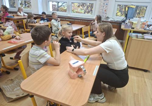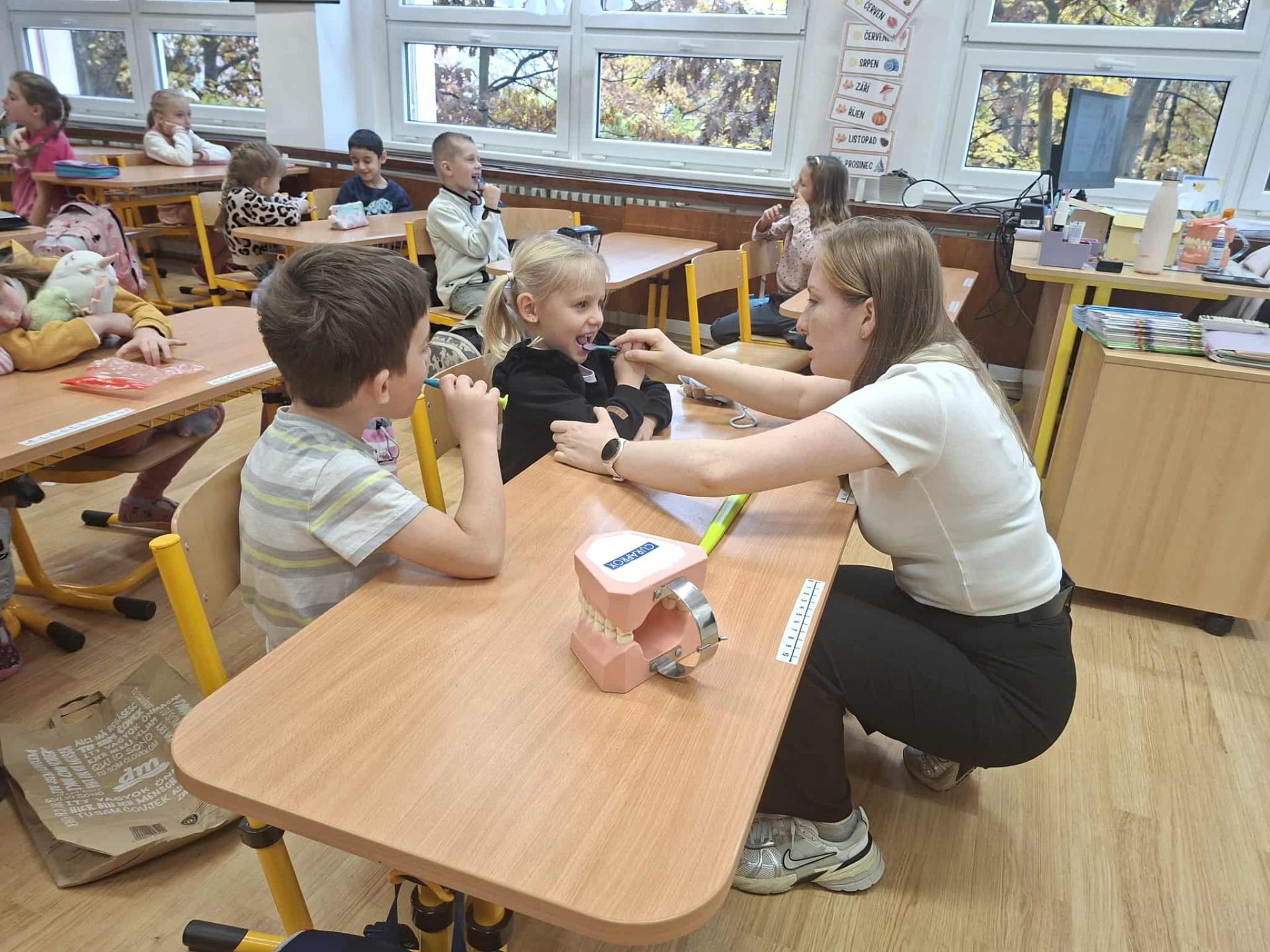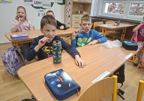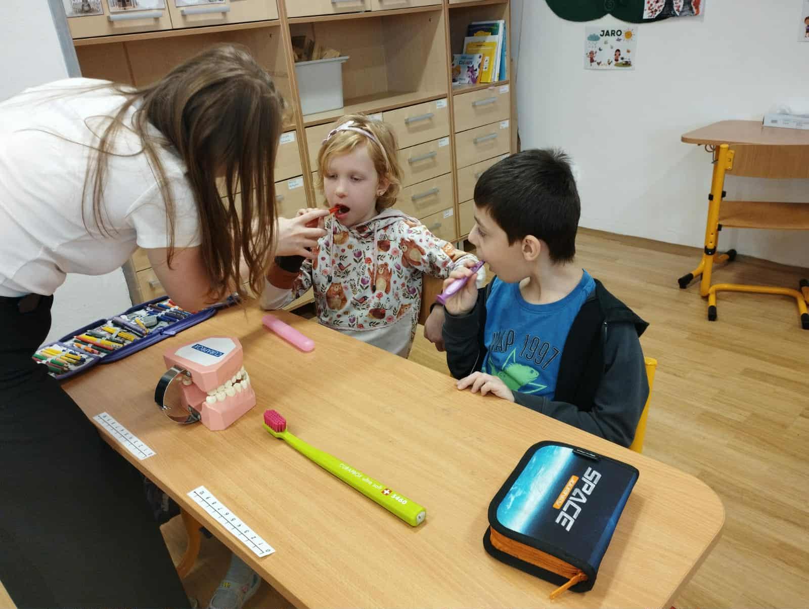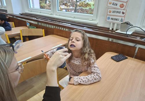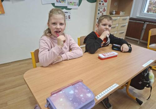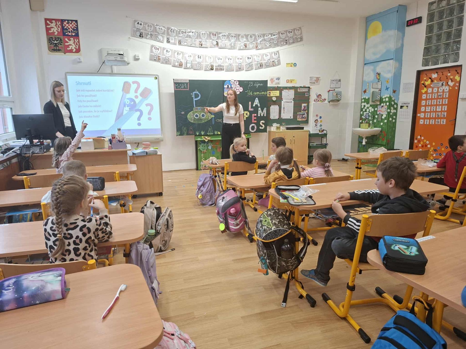 Dnes u nás ve třídě proběhla beseda na téma dentální prevence. Děti se dozvěděly, jak zub vypadá, jak se správně o zuby starat, jak by měl vypadat kartáček a jaké druhy kartáčků máme. V neposlední řadě měly možnost vyzkoušet si indikátor plaku a zjistit, jestli mají zoubky vyčištěné správně. Besedu jsme si moc užili!