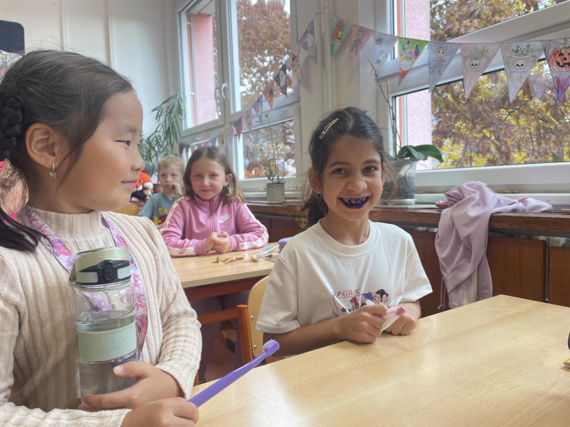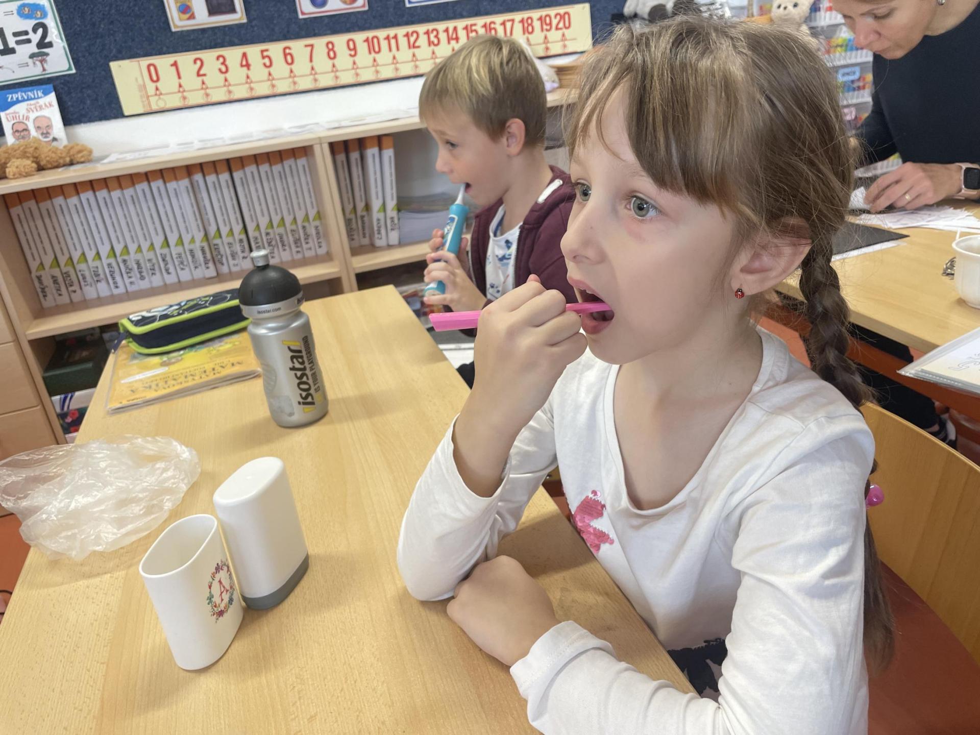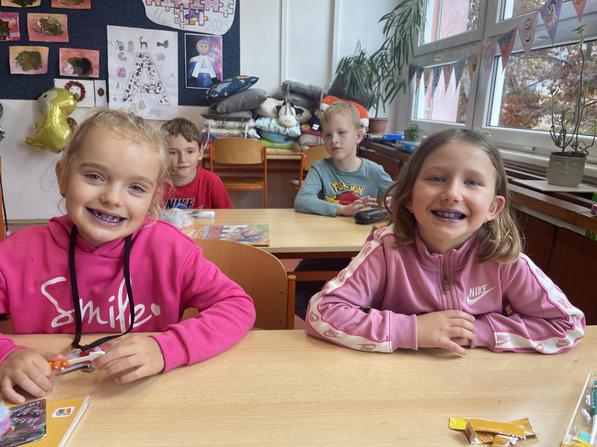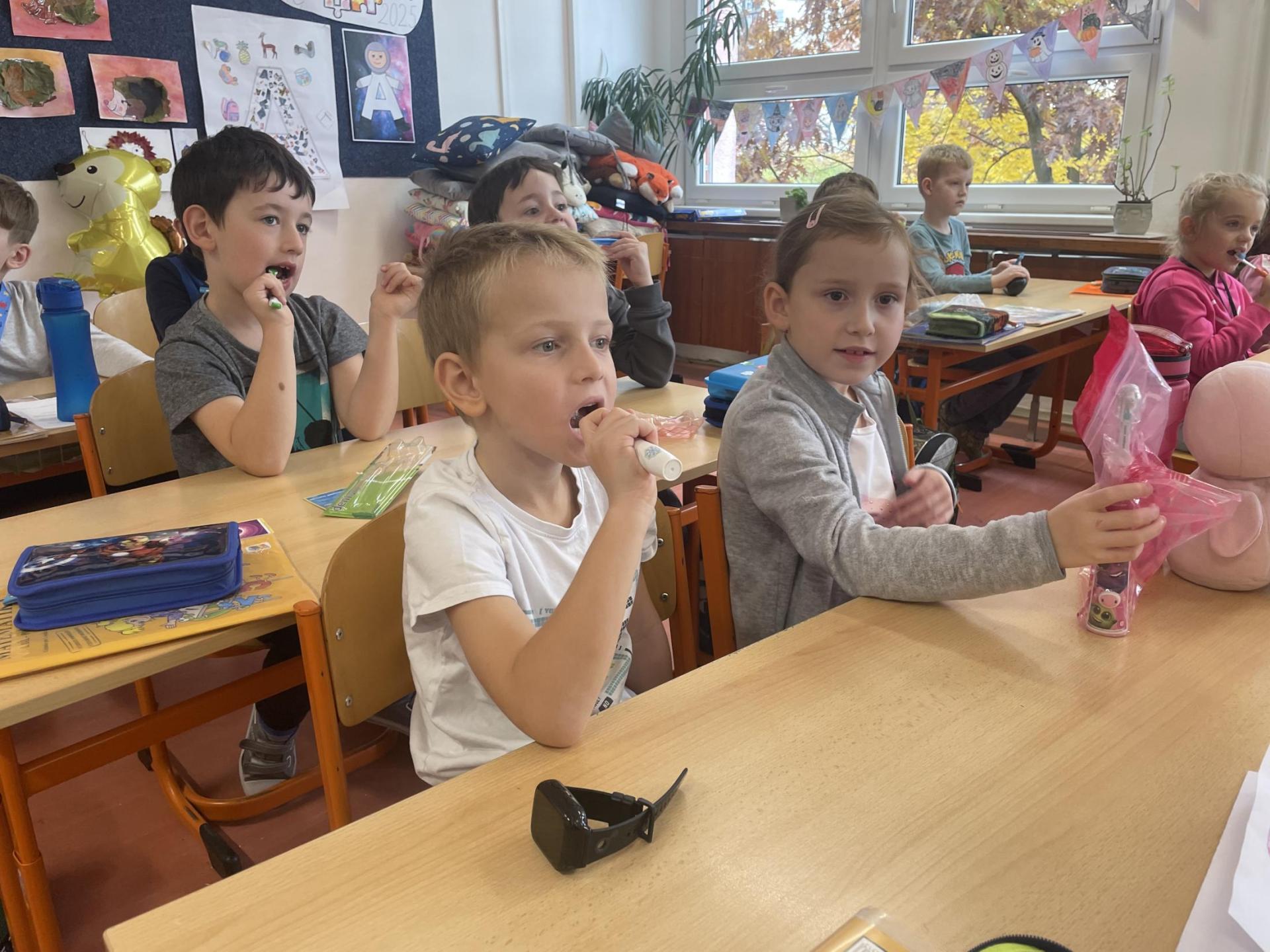Ve čtvrtek 23.10. nás navštívily lektorky a povídaly si s námi o tom, jak se starat o své zuby a dutinu ústní. Společně jsme si vyčistili zuby a pak jsme si mohli vyzkoušet nanést na zuby plak indikátor. Byla to sranda, měli jsme z toho modro fialové zuby.