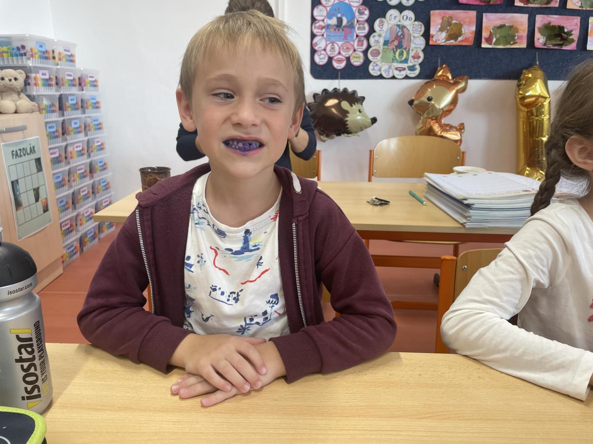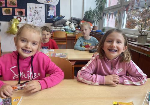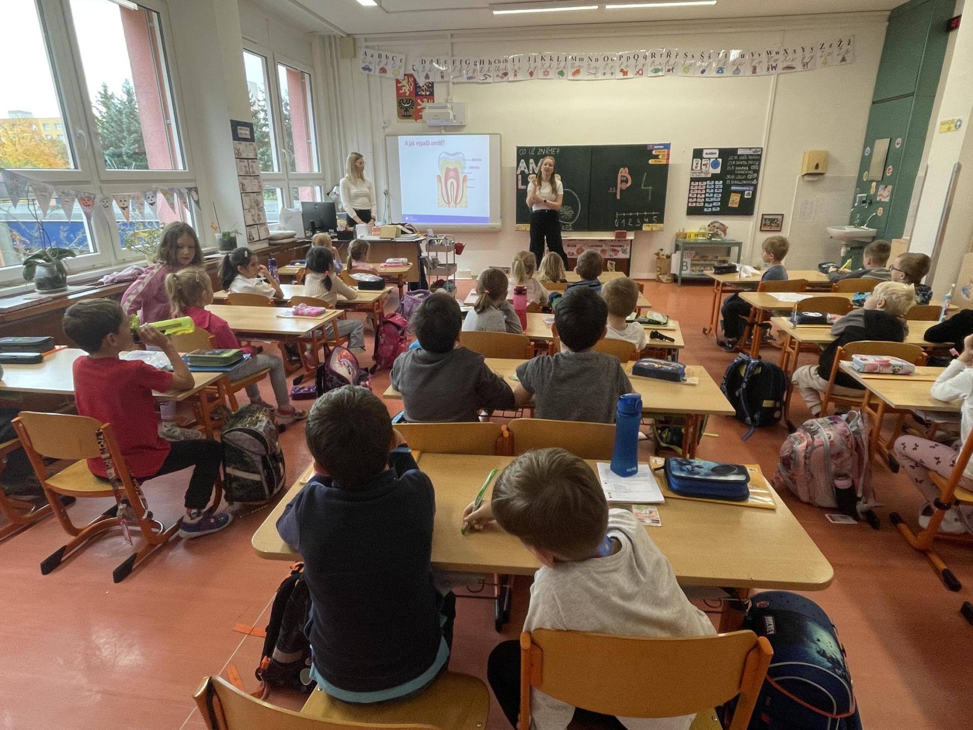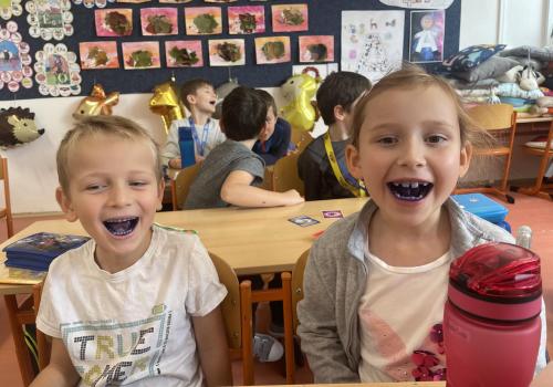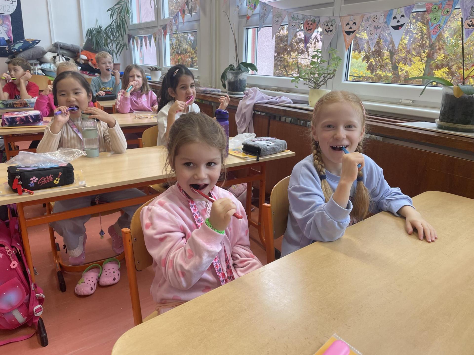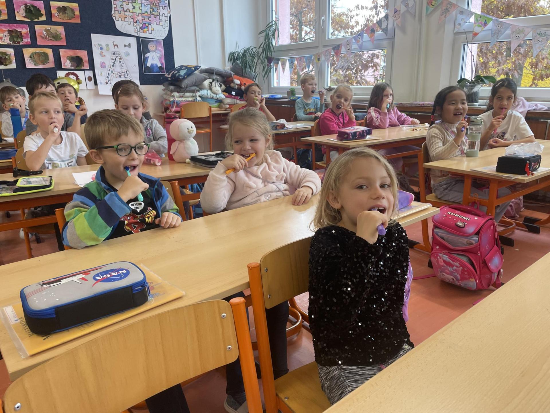 Ve čtvrtek 23.10. nás navštívily lektorky a povídaly si s námi o tom, jak se starat o své zuby a dutinu ústní. Společně jsme si vyčistili zuby a pak jsme si mohli vyzkoušet nanést na zuby plak indikátor. Byla to sranda, měli jsme z toho modro fialové zuby.