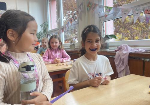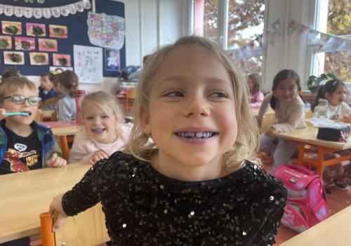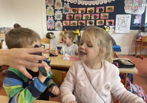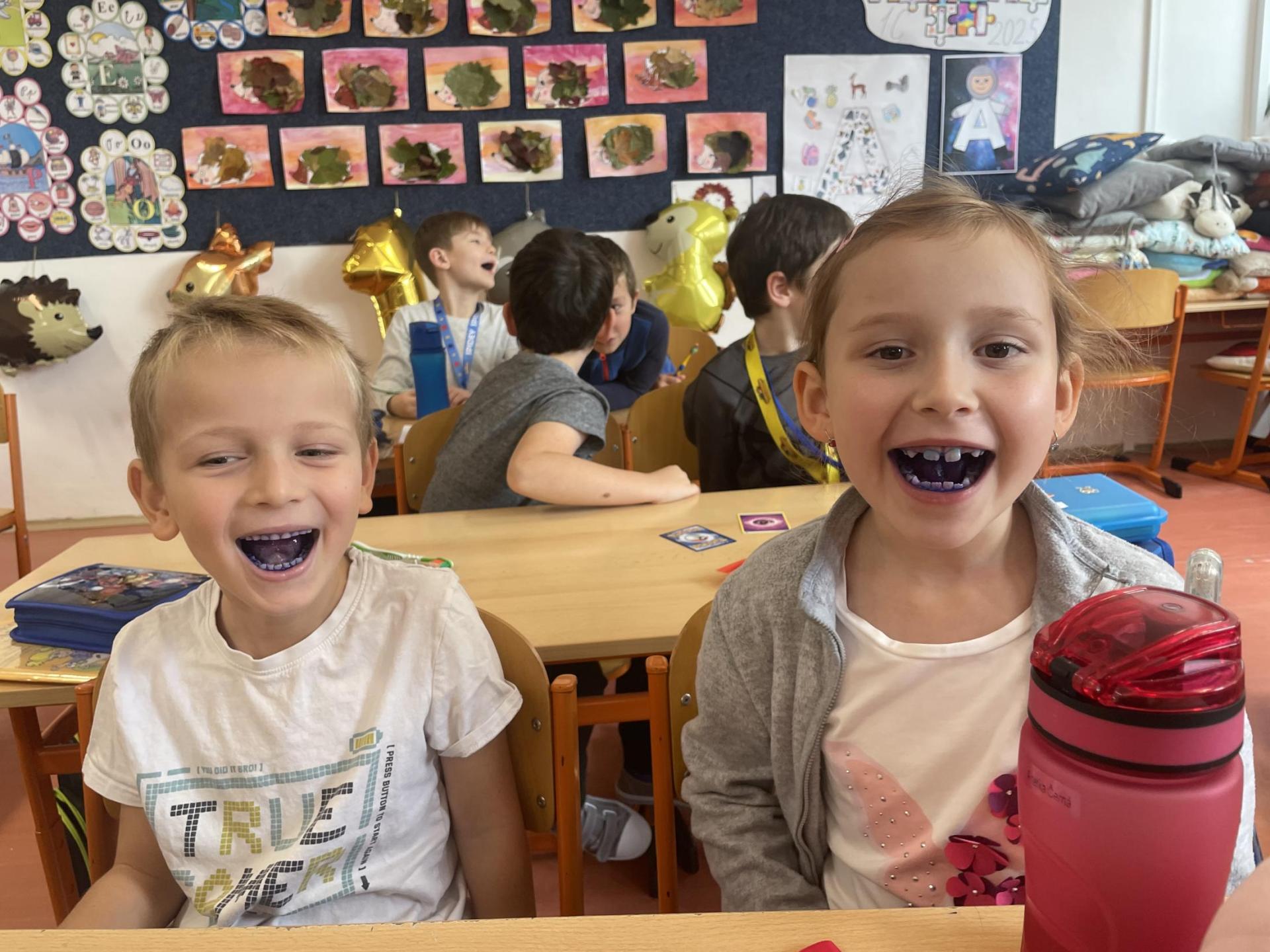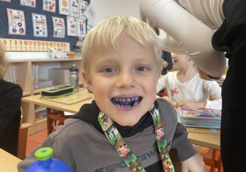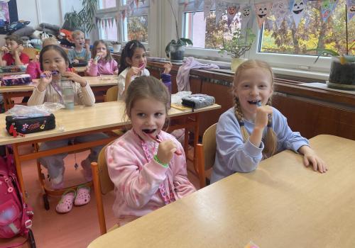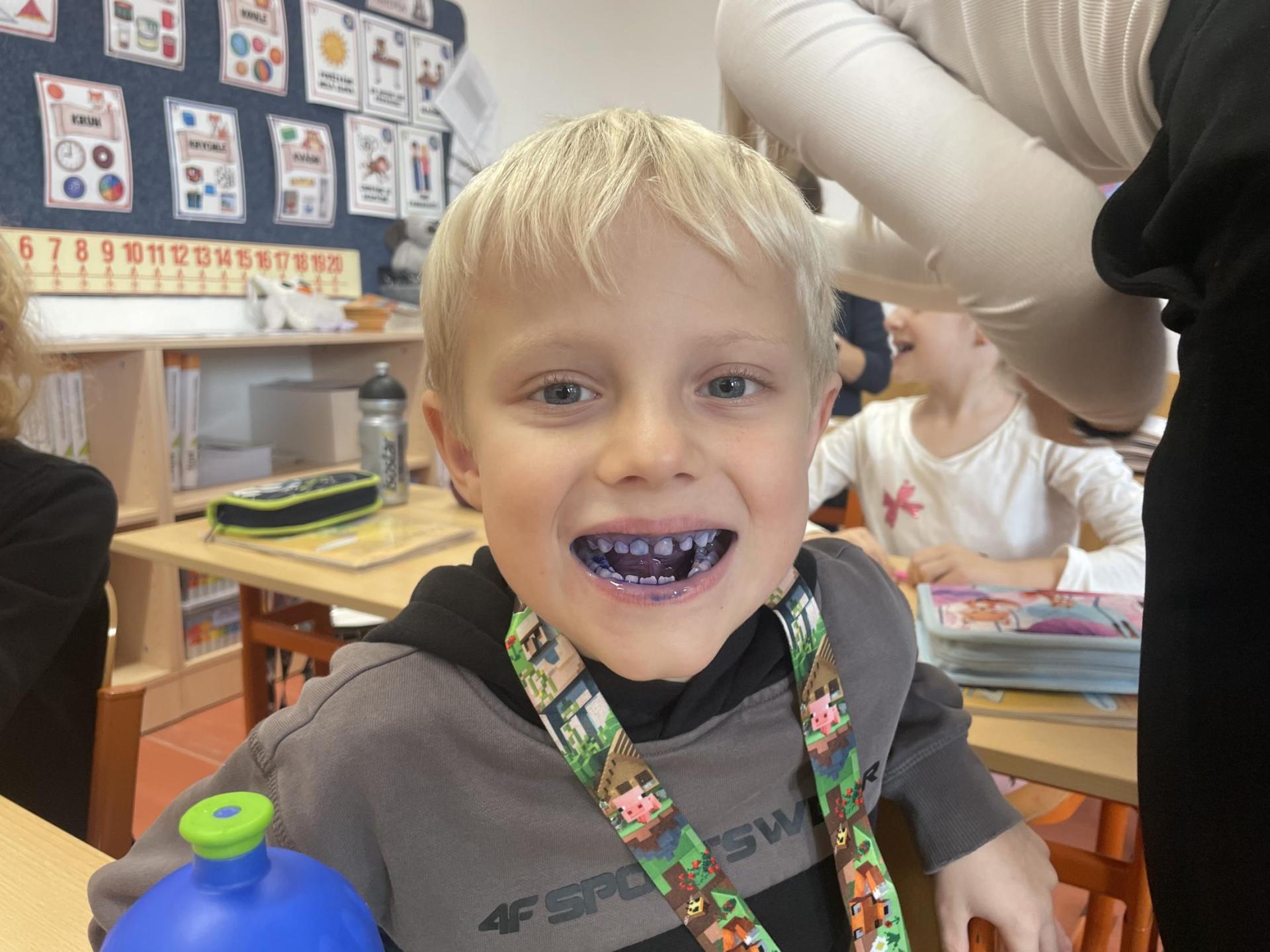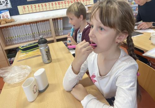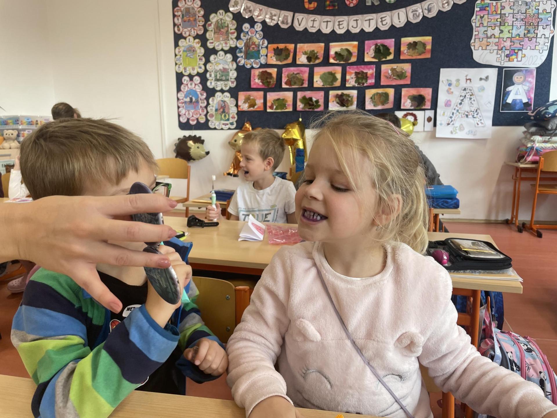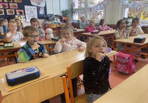 Ve čtvrtek 23.10. nás navštívily lektorky a povídaly si s námi o tom, jak se starat o své zuby a dutinu ústní. Společně jsme si vyčistili zuby a pak jsme si mohli vyzkoušet nanést na zuby plak indikátor. Byla to sranda, měli jsme z toho modro fialové zuby.