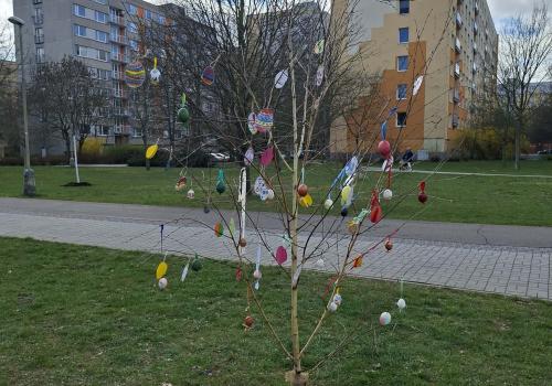 Vrcholem našich příprav bylo kreativní tvoření. Vyrobili jsme veselá velikonoční vajíčka, která zdobí stromy před naší školou. Teď dělají radost nejen nám, ale i všem rodičům a kolemjdoucím, kteří jdou kolem.