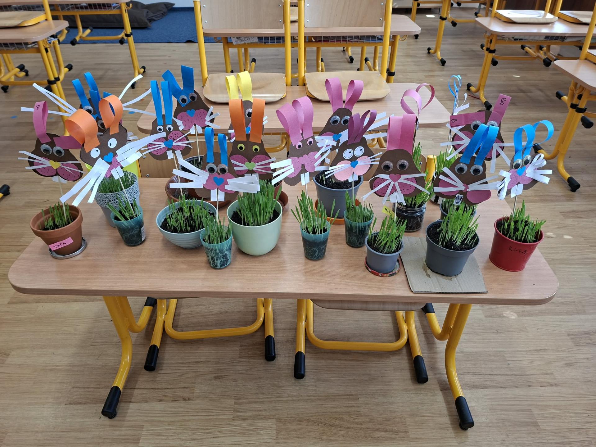 Kromě barevného oblečení jsme se poctivě starali o naše velikonoční osení. Každý den jsme kontrolovali, jak se zeleným stéblům daří, a poctivě zalévali, aby nám do svátků krásně vyrostlo.