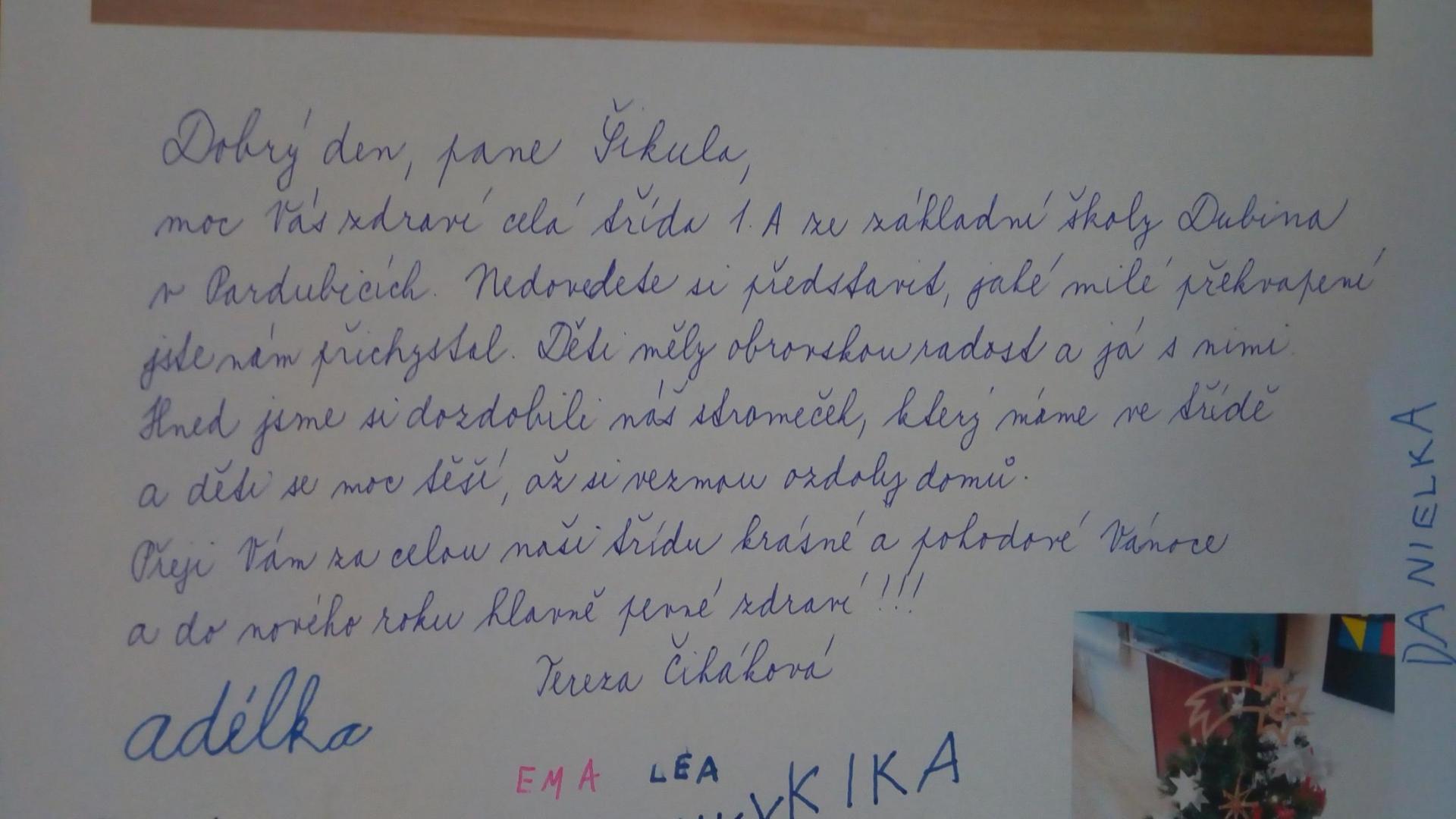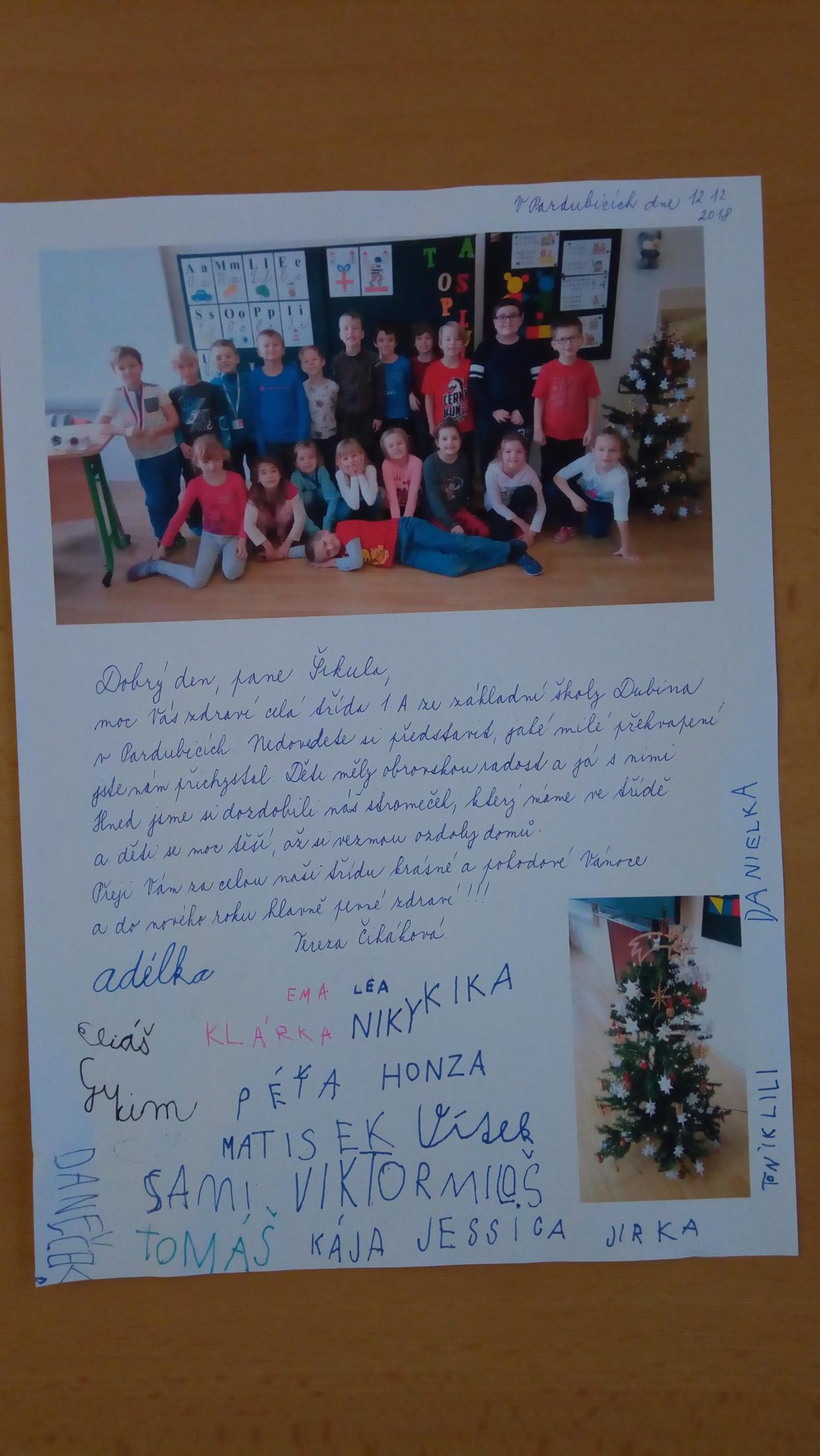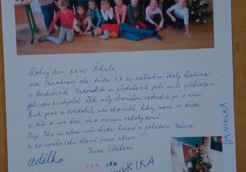 Ano, je... Ozdoby jsme si pověsili na náš stromeček a panu Šikulovi jsme napsali dopis. Děti se těsí, až si vezmou ozdoby na Vánoce domů a z dopisu měly velkou radost.