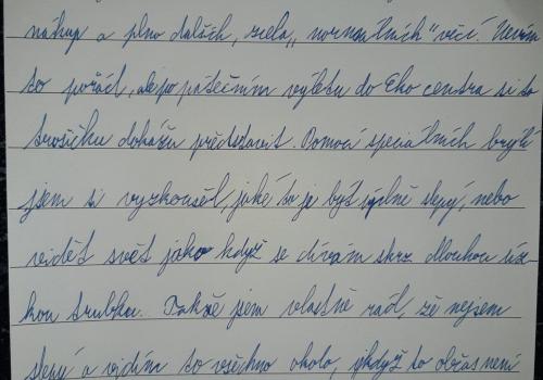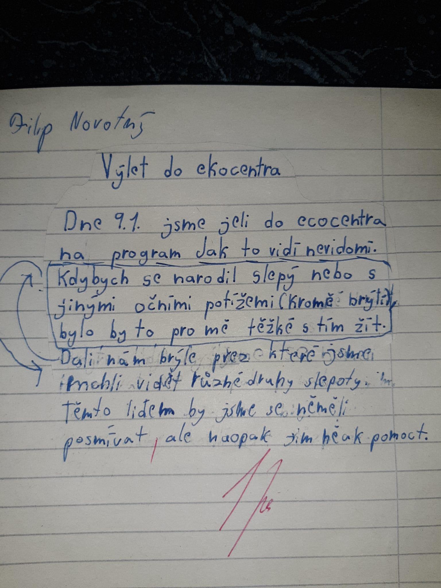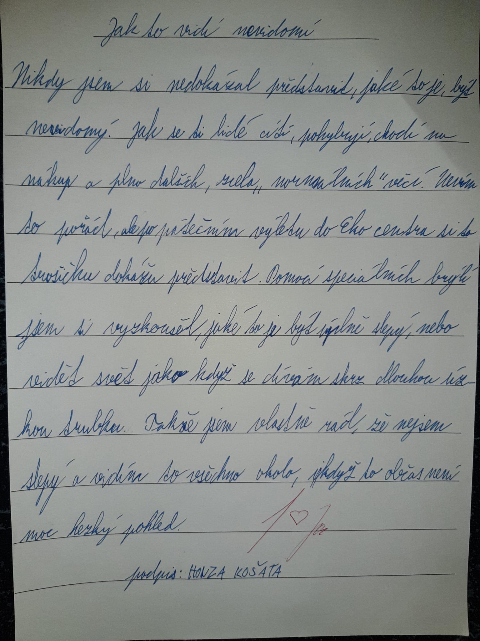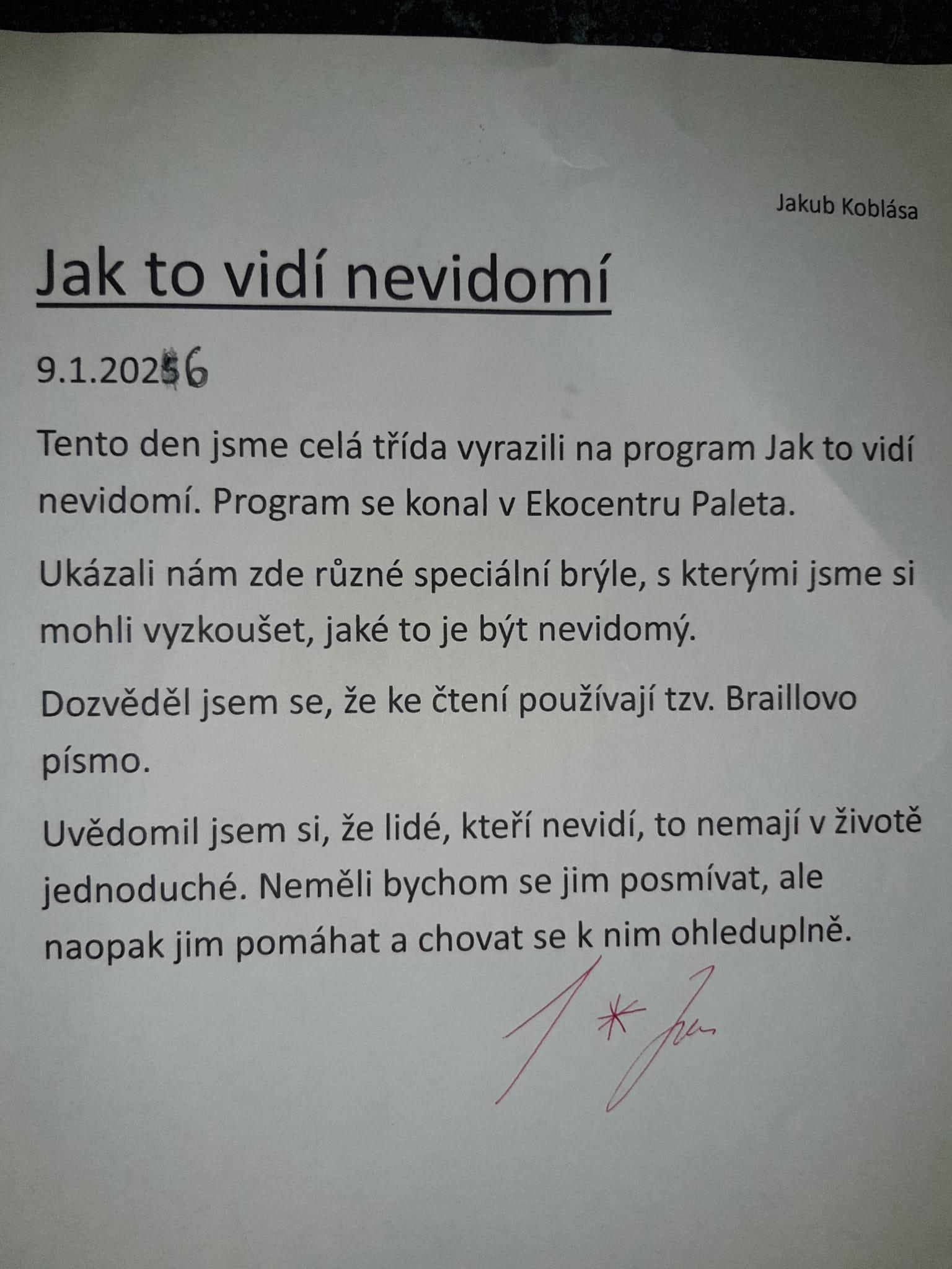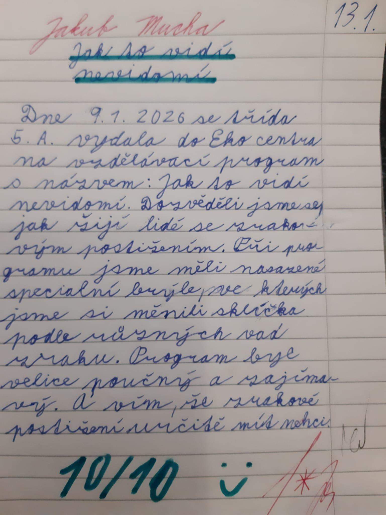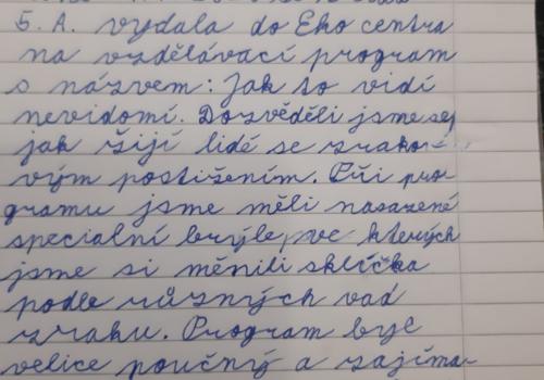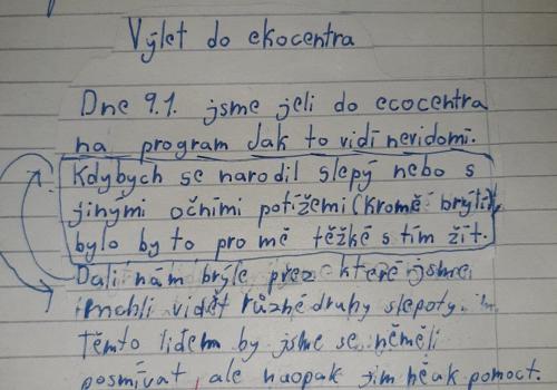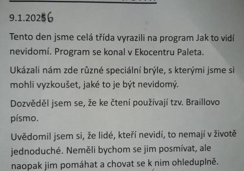 Doporučuji však, přečíst si (otevřít!) slohové práce žáků. Opravdu stojí za to. Každý z žáků zpracoval téma svým způsobem. Někdo vtipně, jiný se dokázal zamyslet nad tím, jak je nevidomým (zde vidím v náznacích slohový útvar ÚVAHA).