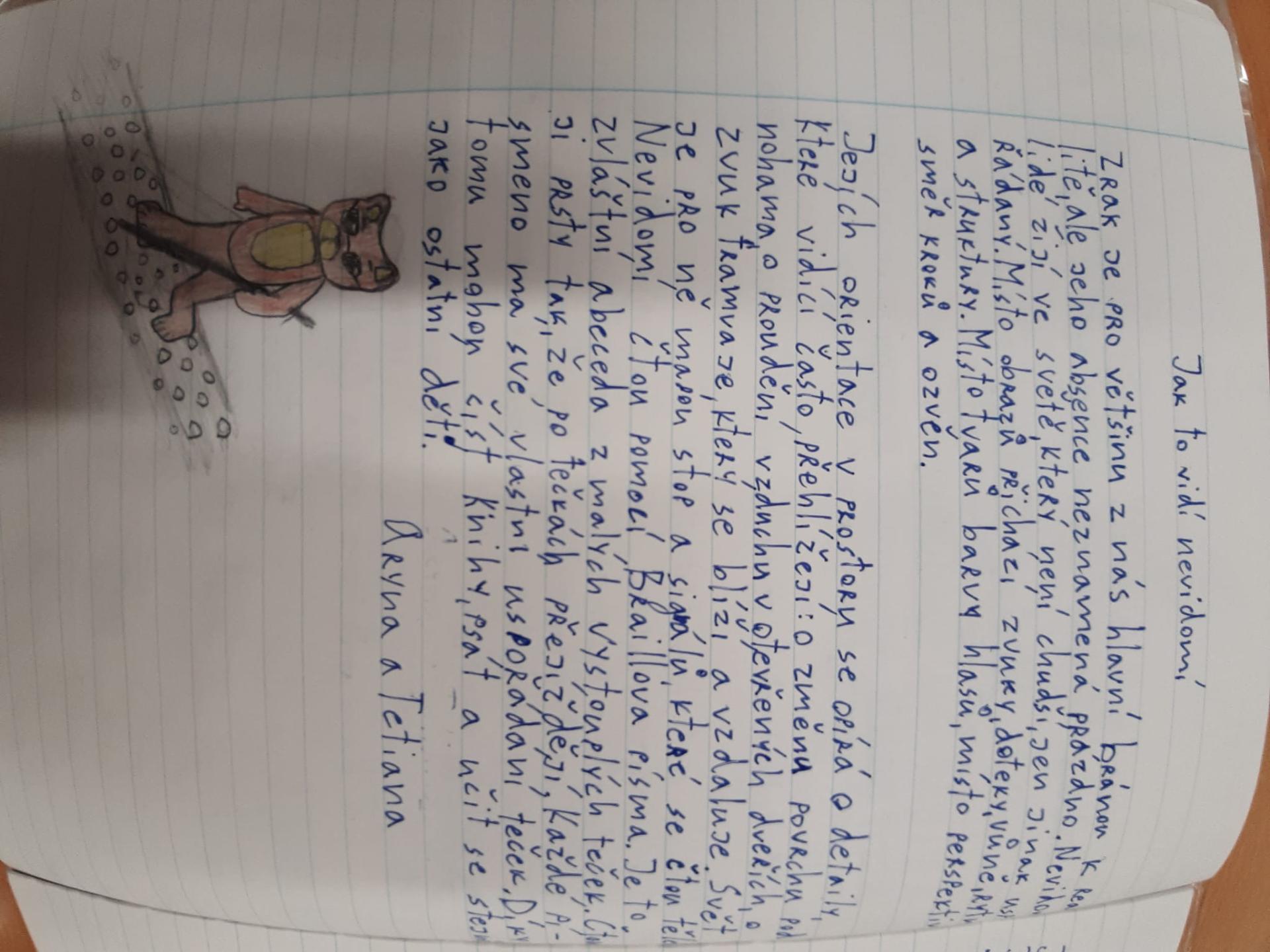 Dále obdivuji práci Arynky a její maminky Tetiany, jelikož bezchybnou češtinou se dokázaly do hloubky ponořit do prapodivného světa nevidomých. Arynčina slova vedla k zamyšlení nad tímto světem lidí, kteří postrádají jeden z nejdůležitějších lidských smyslů.