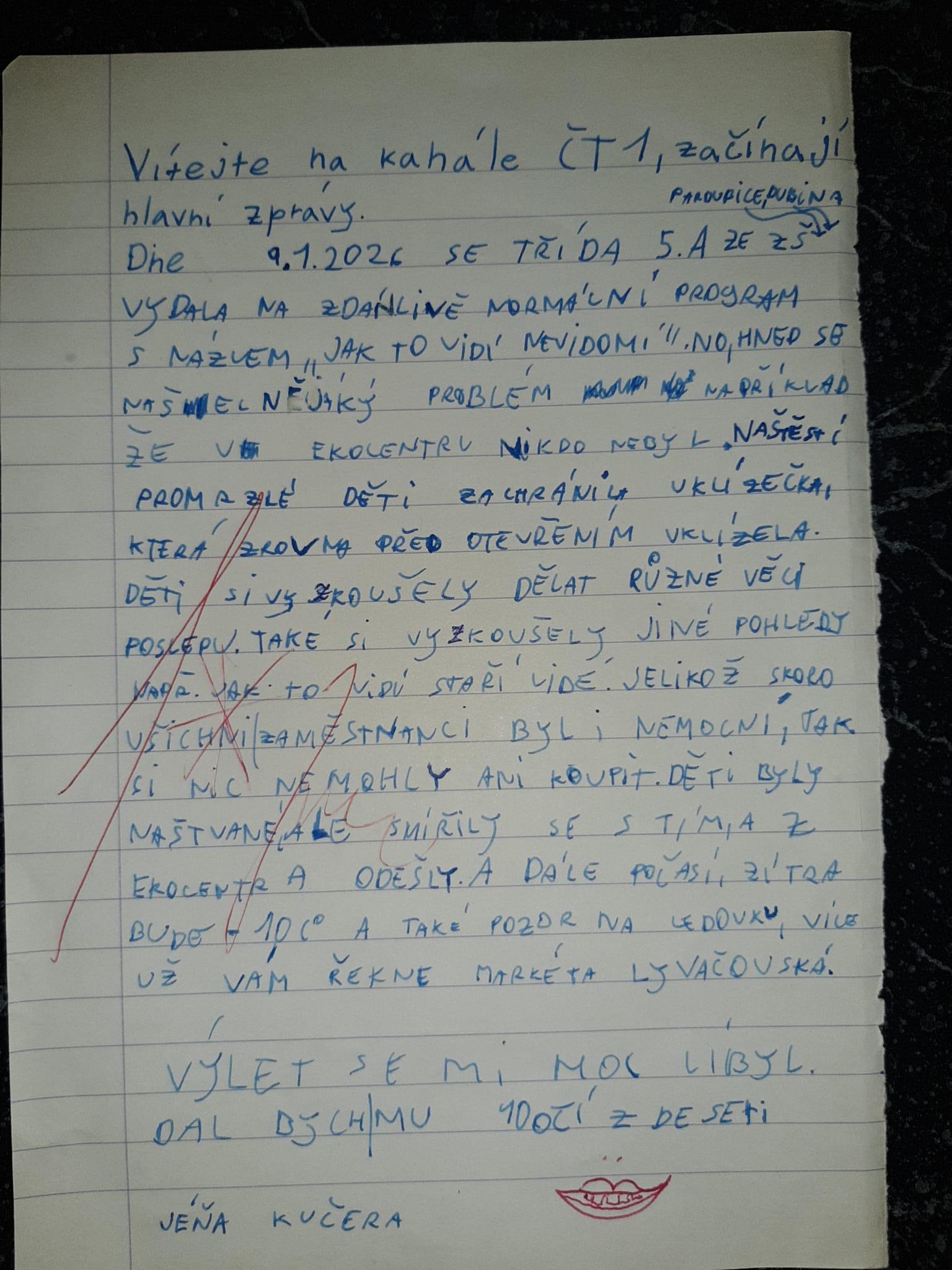 K interpretaci: Obdiv zaslouží Jéňa, který pobavil spolužáky i učitelku, přestože téma bylo vážné, přednesl ho s lehkostí a úsměvem, jako by to bylo vysílání ČT, ba dokonce i nahrál znělku Televizních novin, kde frčí zprávy jedna za druhou. Také závěr je velice vtipný.