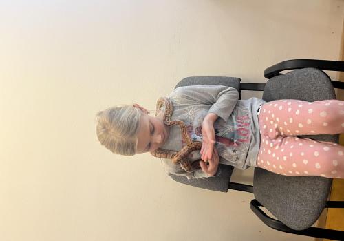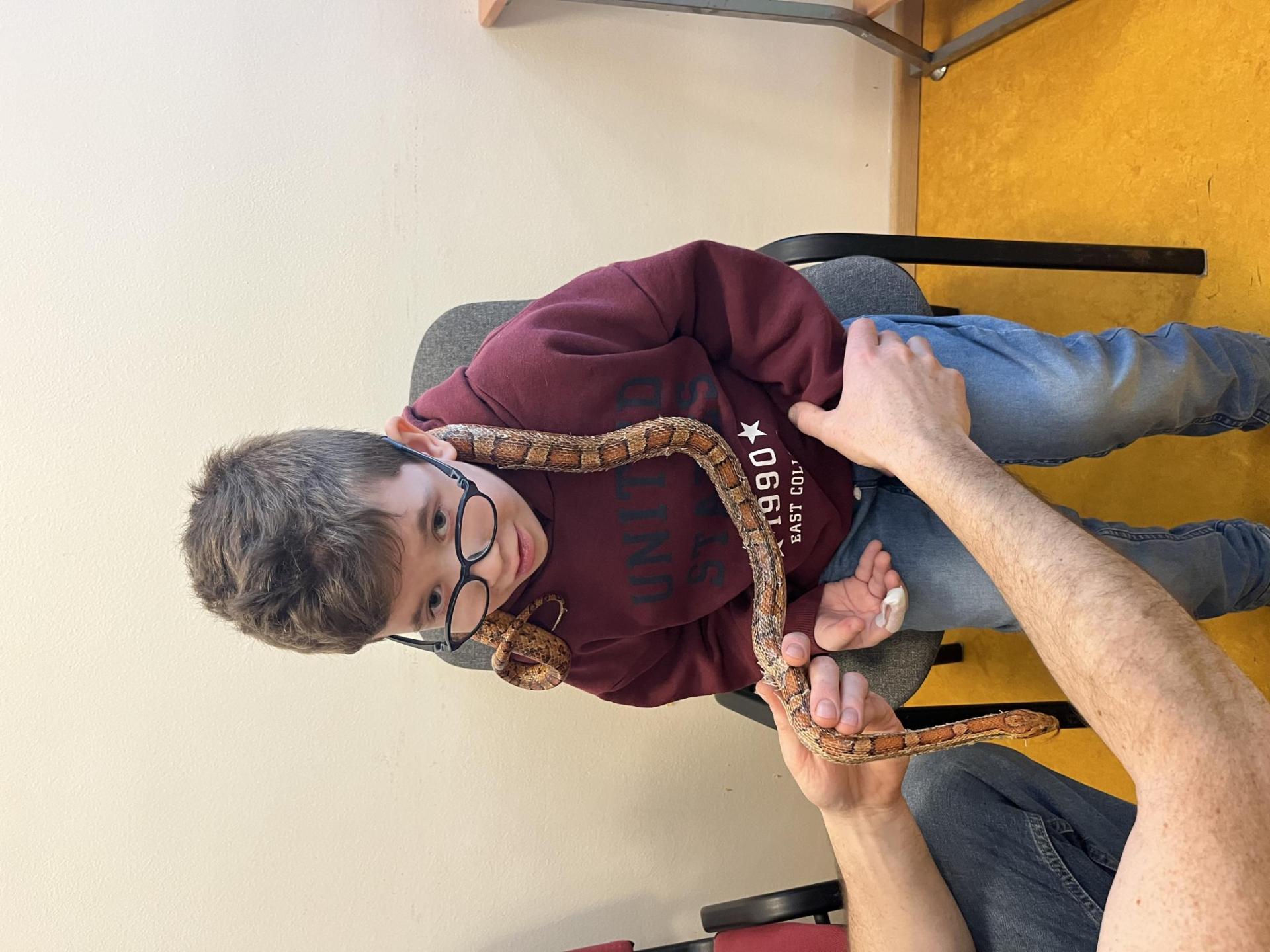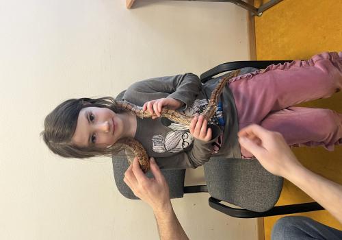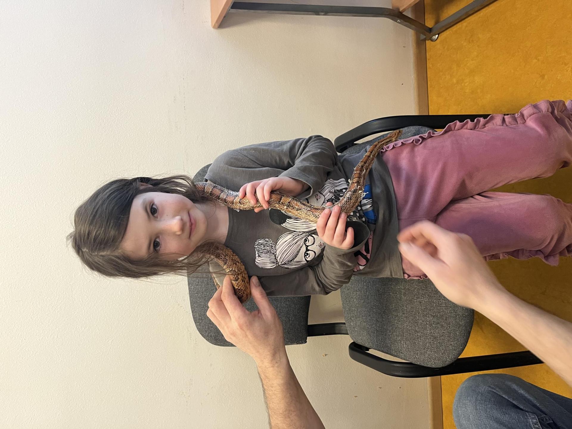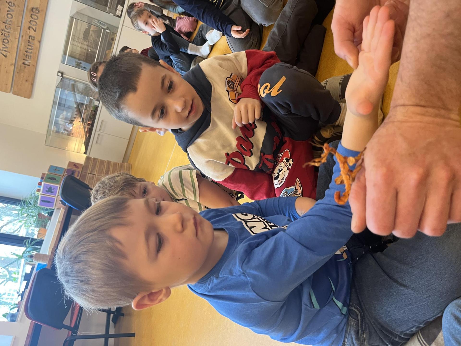 Obdiv si také získala užovka. Některé odvážné děti si ji dokonce mohly dát kolem krku a pozorovat ji z bezprostřední blízkosti. Během programu jsme si také vyzkoušeli poznávání zvířat hmatem – například jsme sahali na suchou hadí kůži nebo na krunýř želvy.