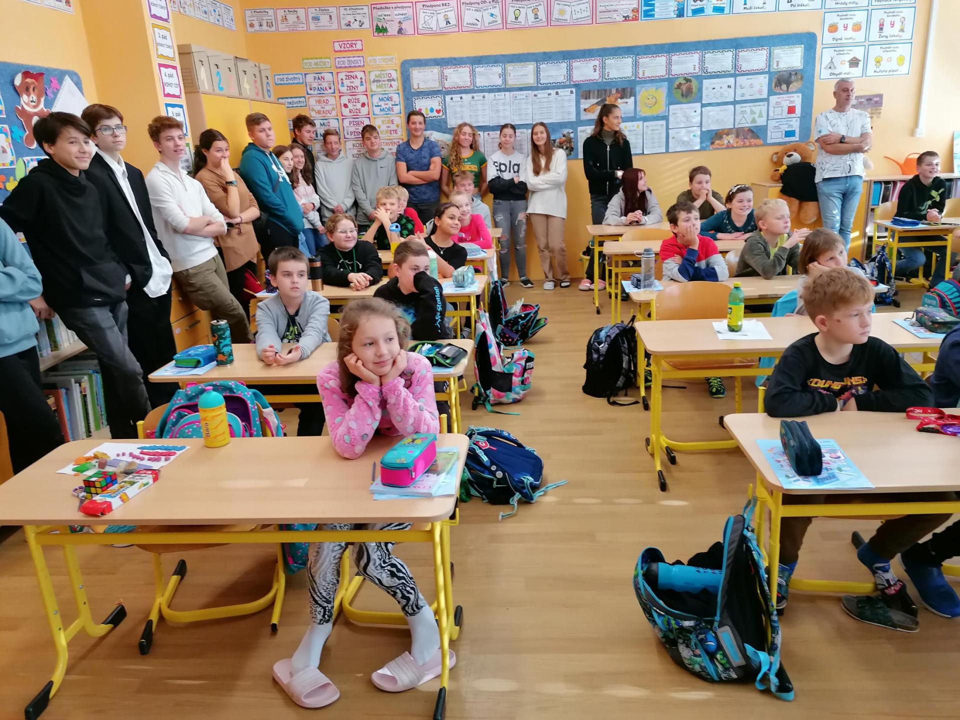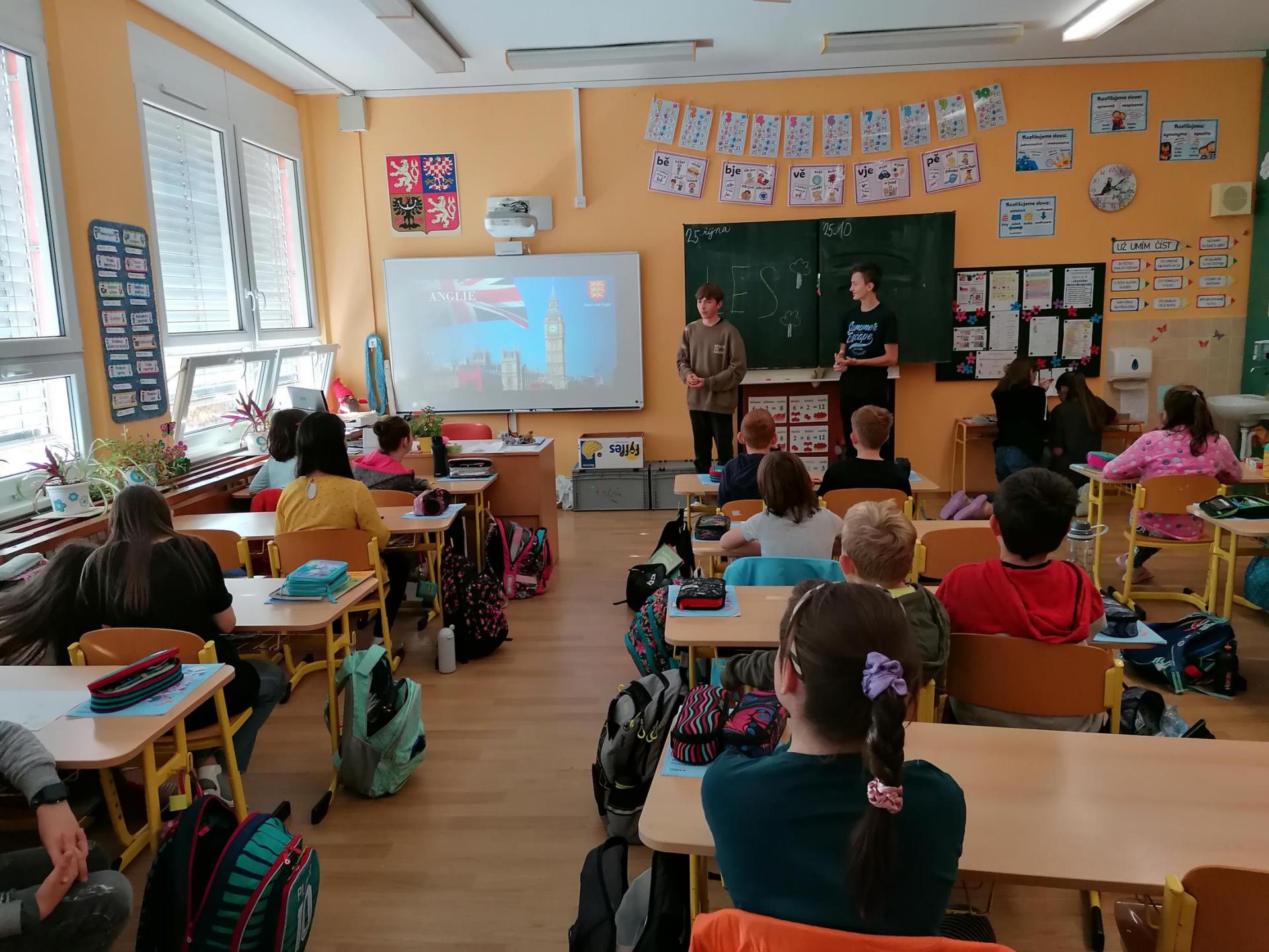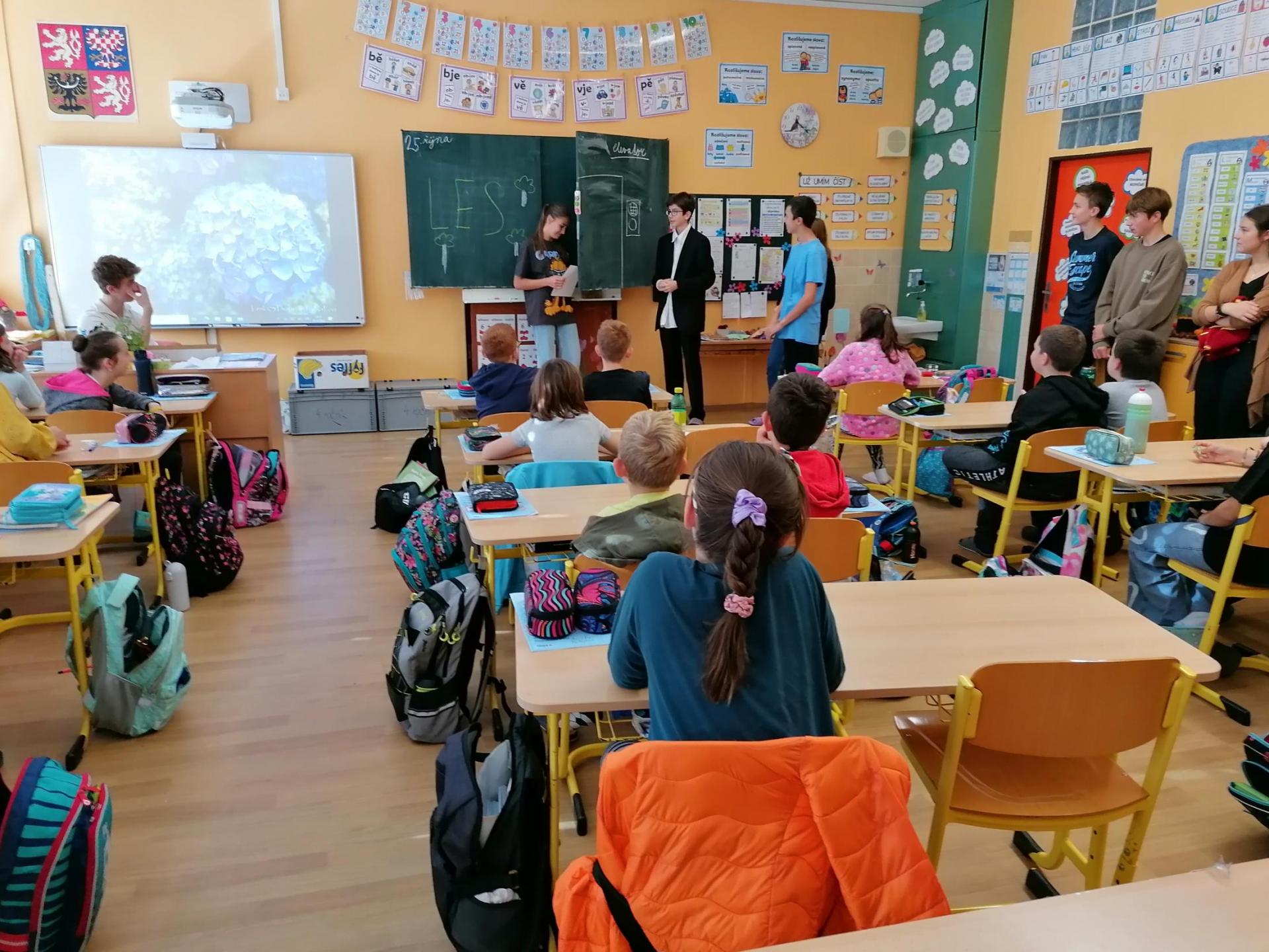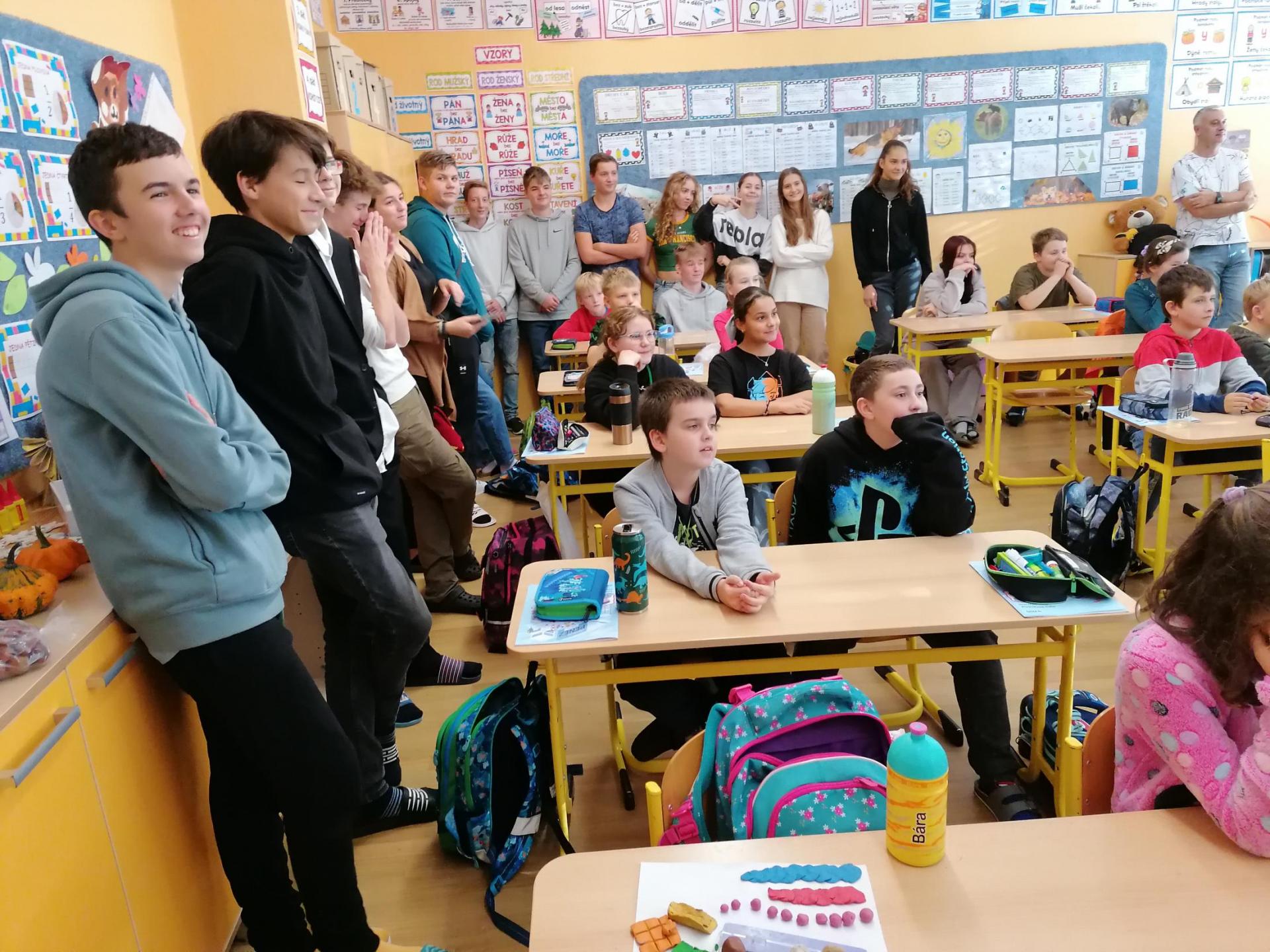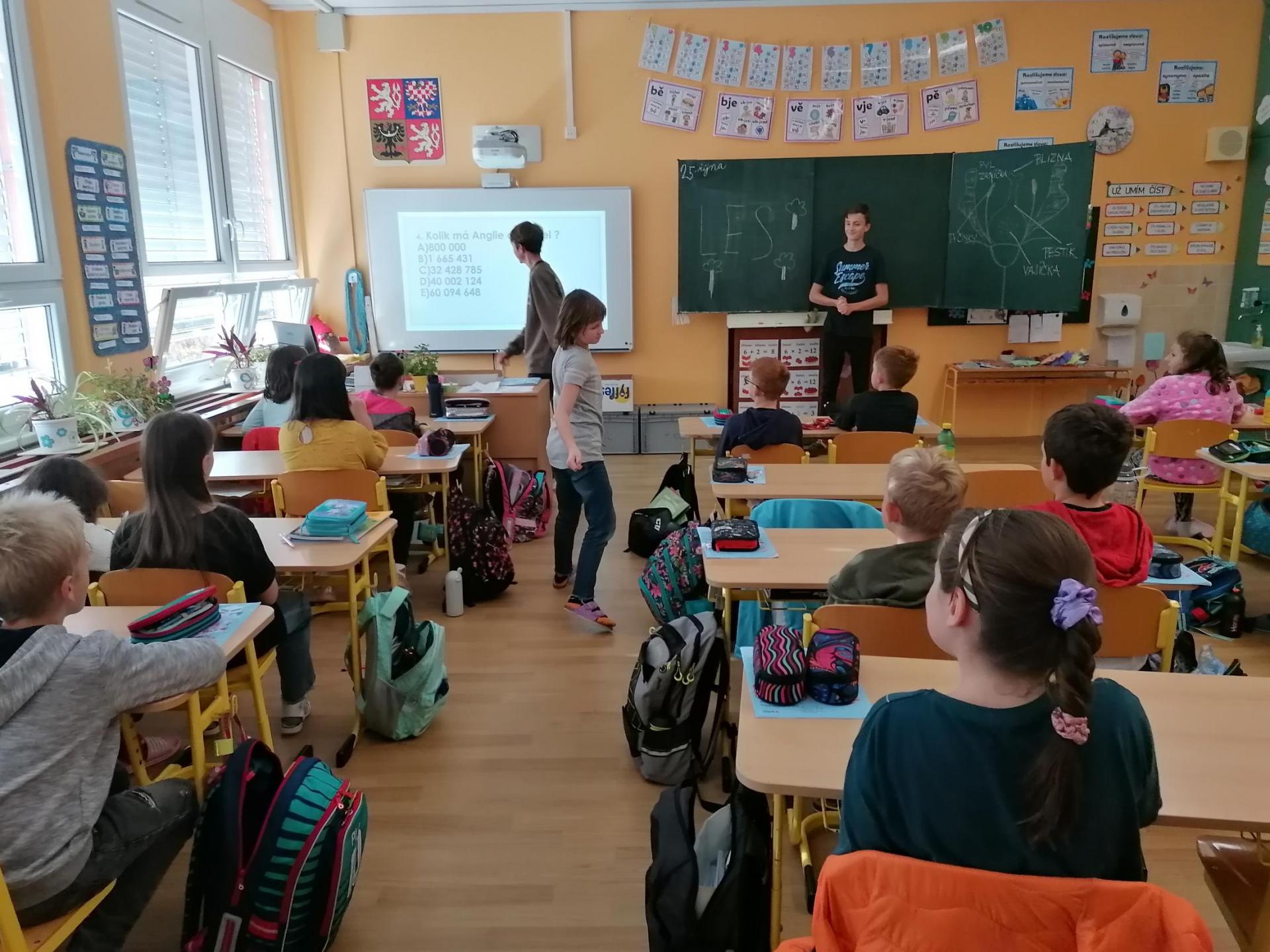 Dnes nás navštívila třída 9.A s prezentací o Velké Británii. Po prezentaci nás čekal vědomostní kvíz a scénky z filmů v anglickém jazyce. Všem se nám moc líbilo vystoupení 9.A
