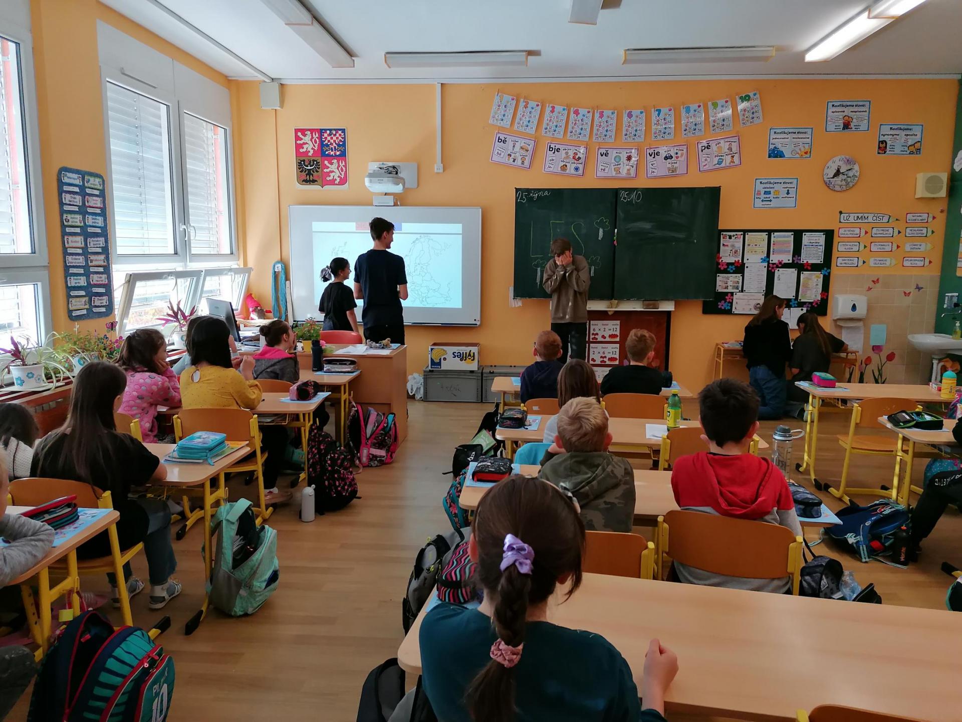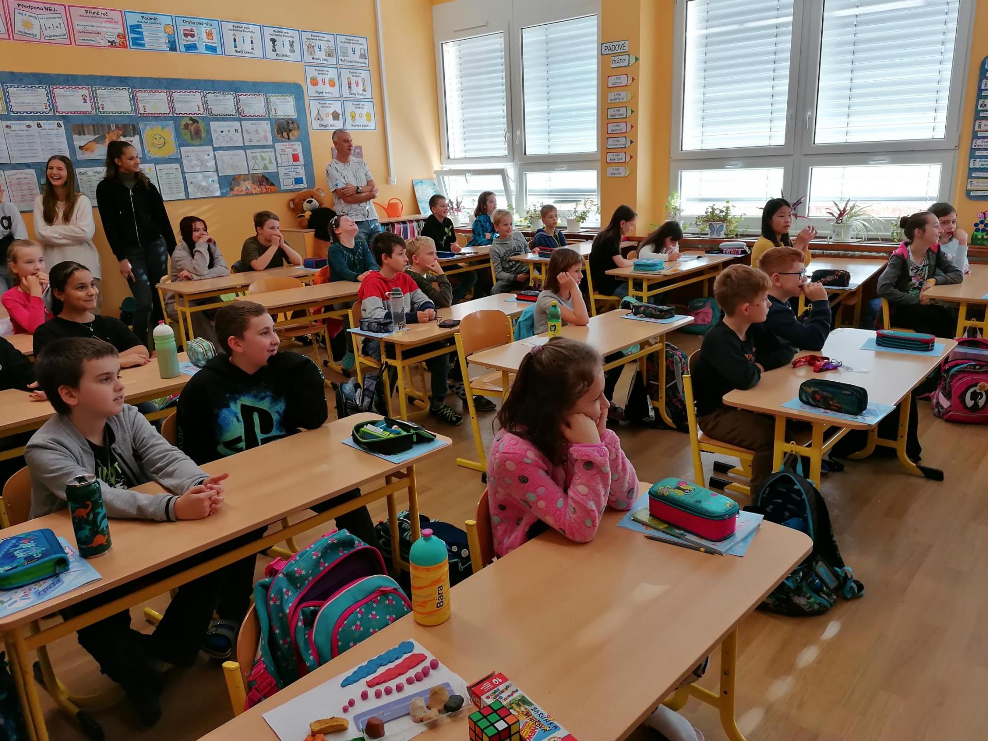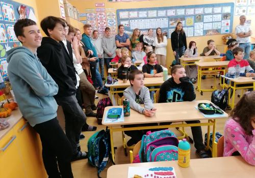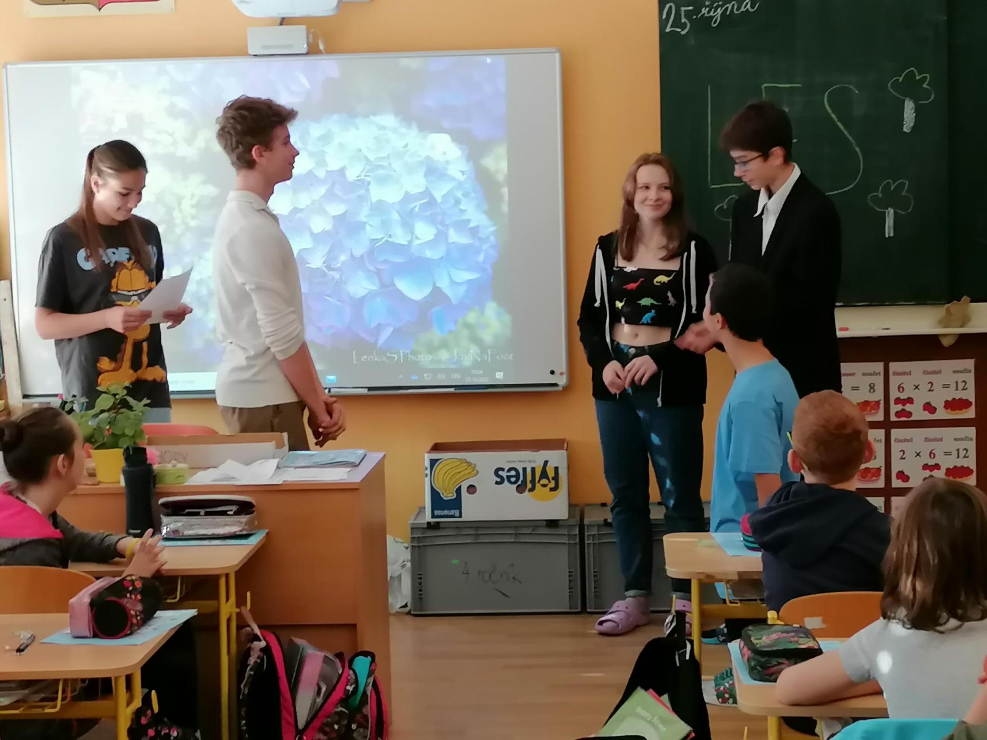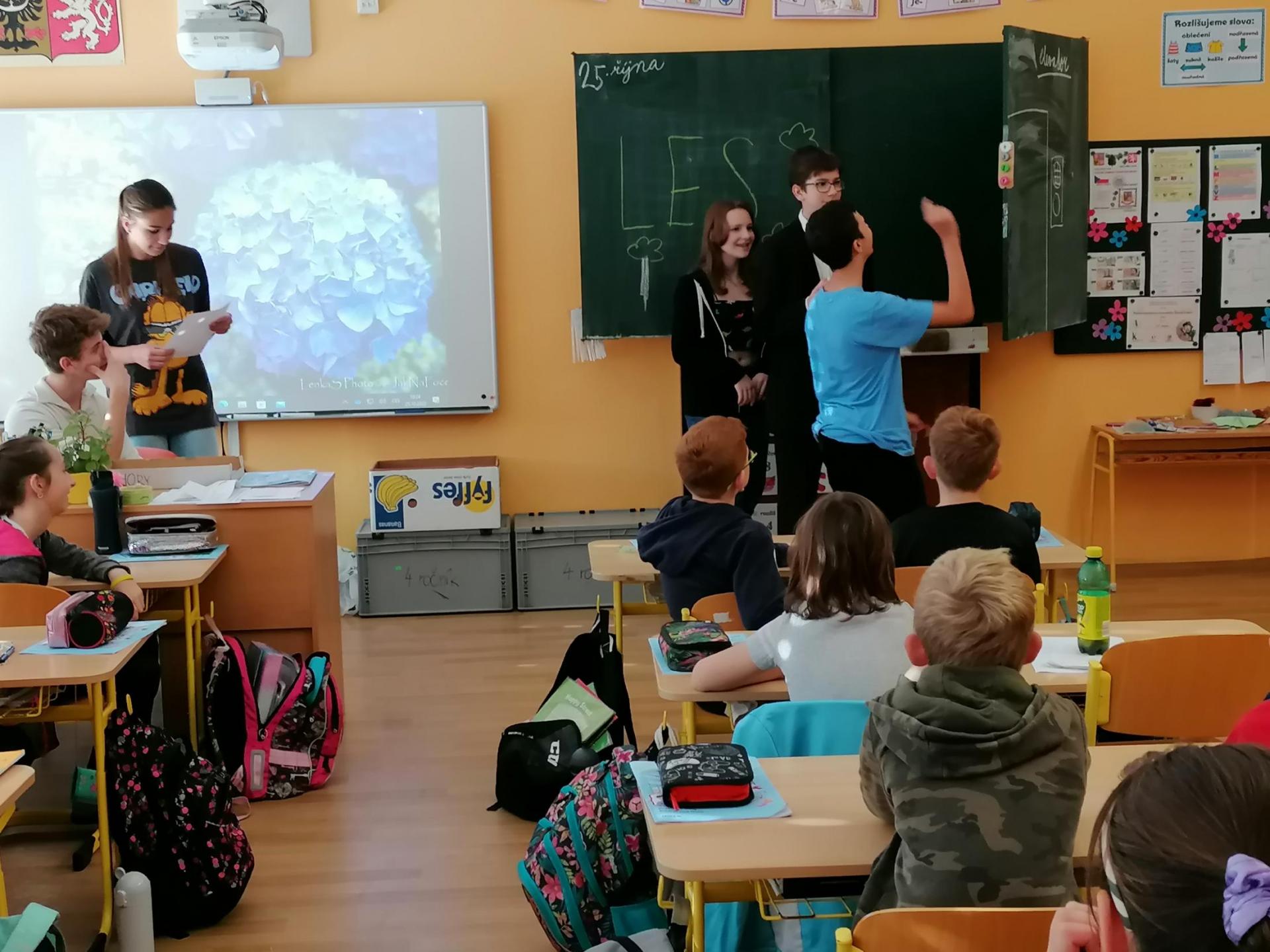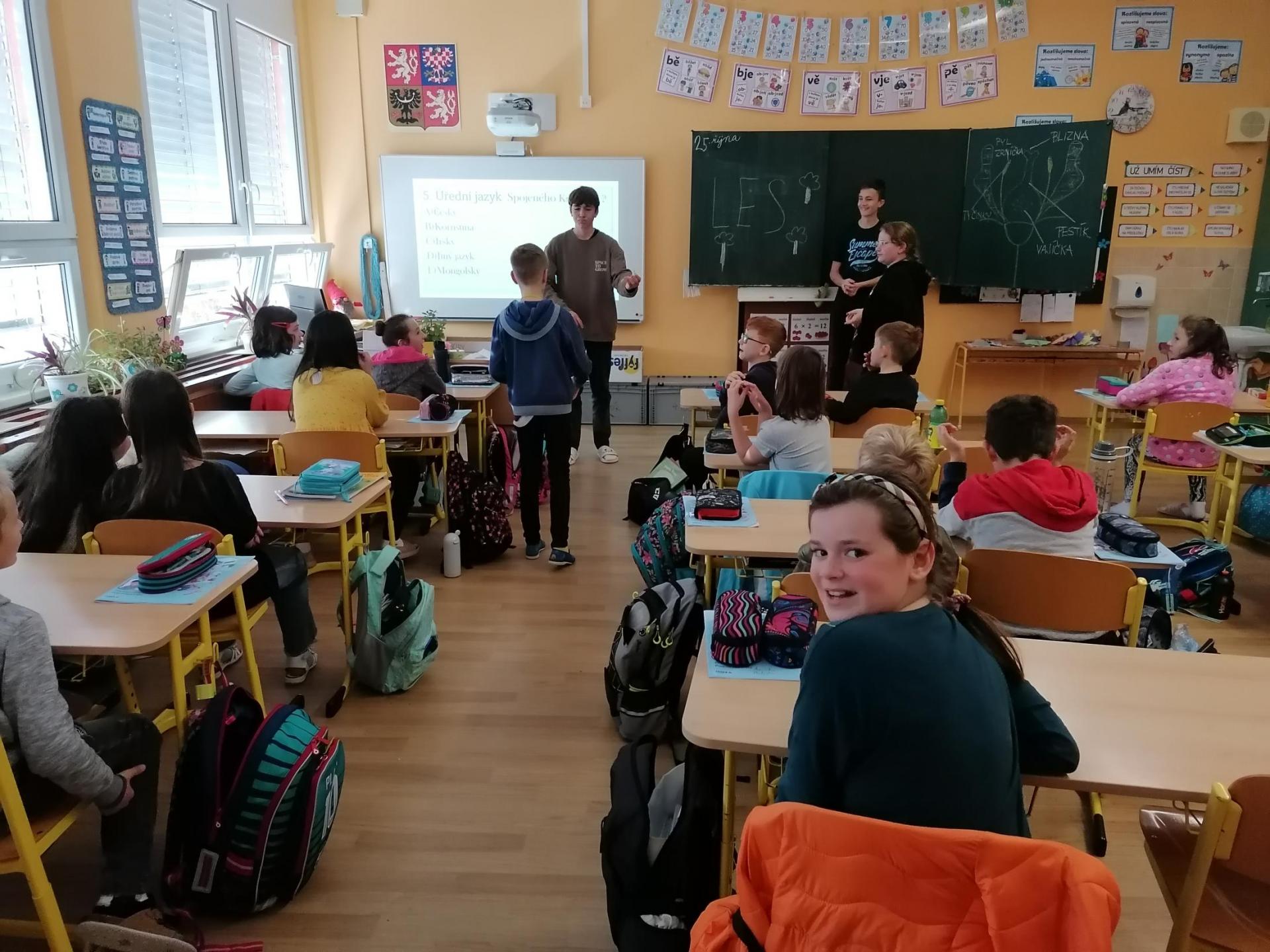 Dnes nás navštívila třída 9.A s prezentací o Velké Británii. Po prezentaci nás čekal vědomostní kvíz a scénky z filmů v anglickém jazyce. Všem se nám moc líbilo vystoupení 9.A