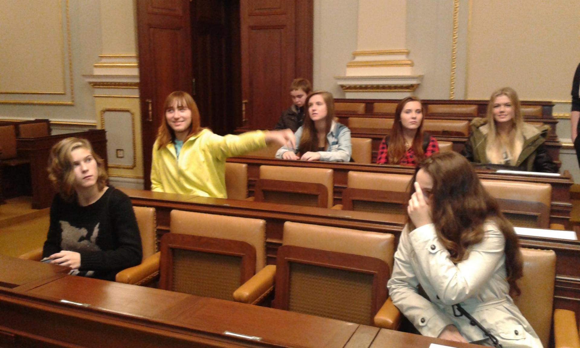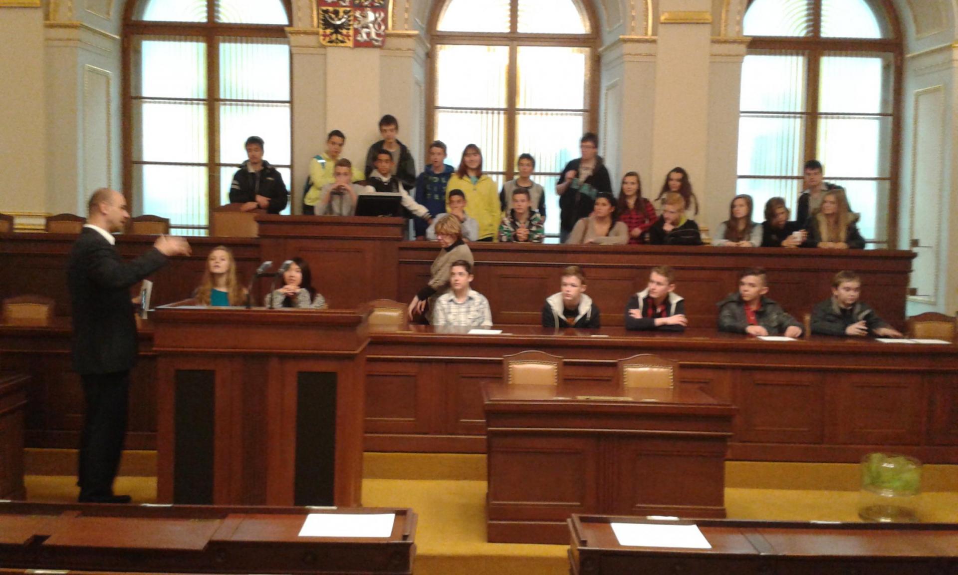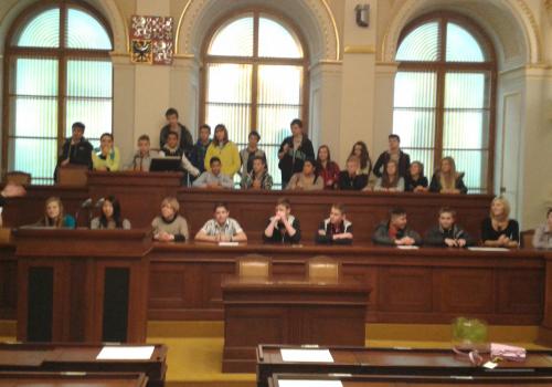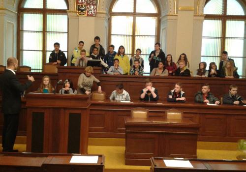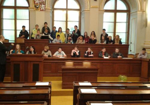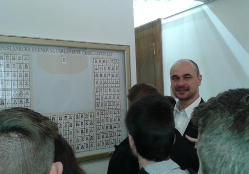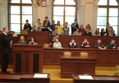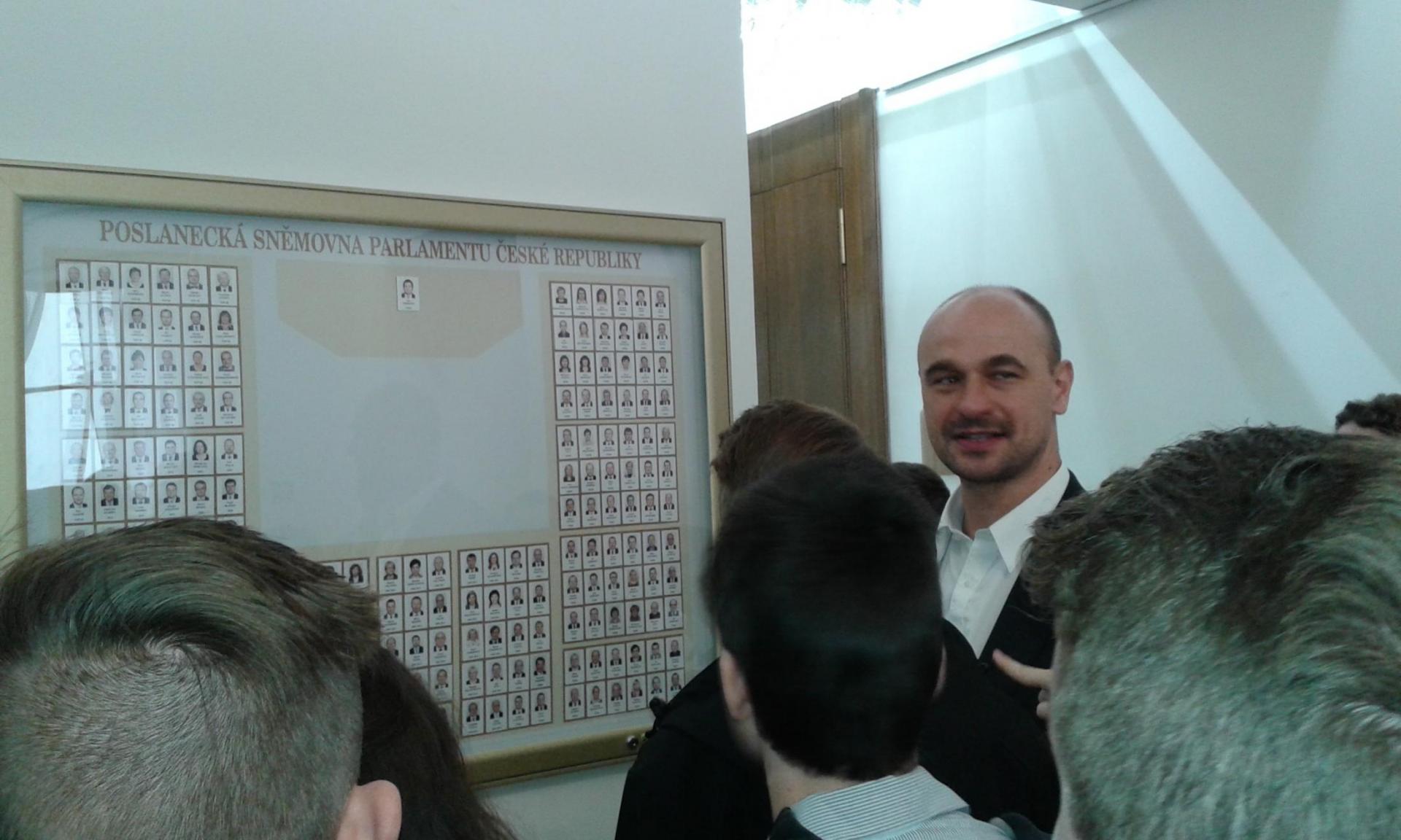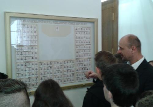 V Parlamentu jsme nejprve zamířili do Informačního centra. Paní průvodkyně nám řekla základní informace a pustila nám film o českém parlamentarismu a o tom, jak to chodí v Poslanecké sněmovně a Senátu. Po pečlivé prohlídce ochrankou nás přivítal poslanec za hnutí Ano pro Pardubický kraj Ing. Martin Kolovrátník. Díky jeho přítomnosti jsme se nejenom dozvěděli zajímavosti z dění ve sněmovně, ale také se dostali například před kancelář předsedy sněmovny a také do jednacího sálu. Tam jsme si vyzkoušeli, jak pohodlné jsou poslanecké lavice a jak se stojí za mikrofonem. Pan Kolovrátník s úsměvem zodpověděl všechny všetečné dotazy.