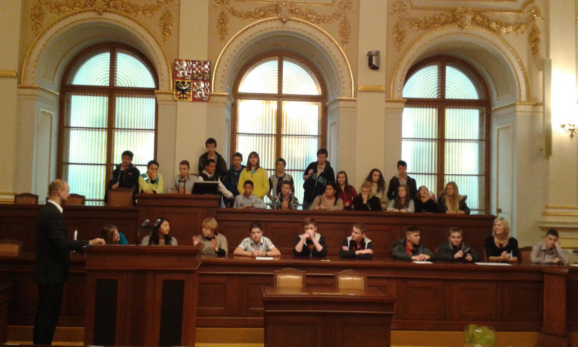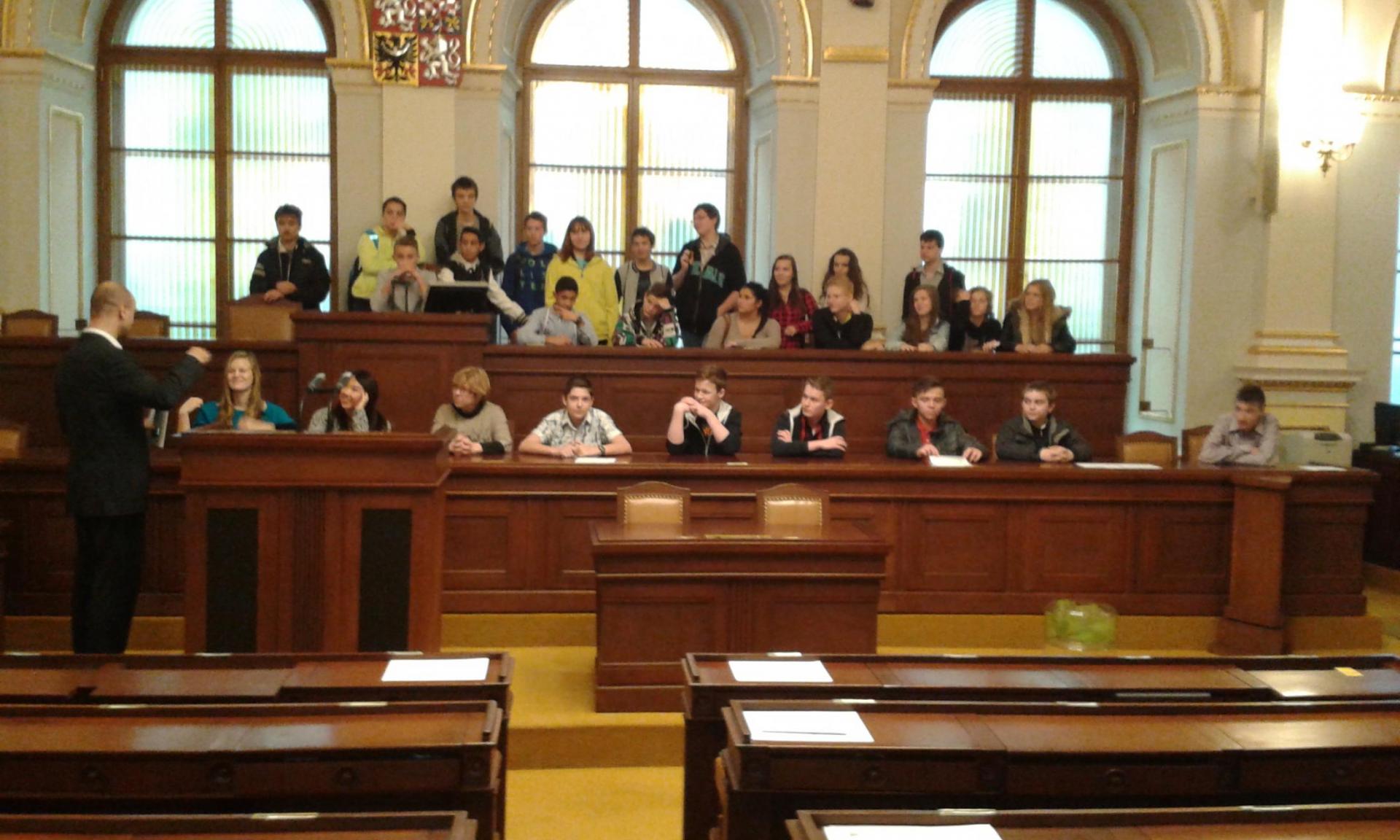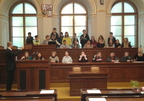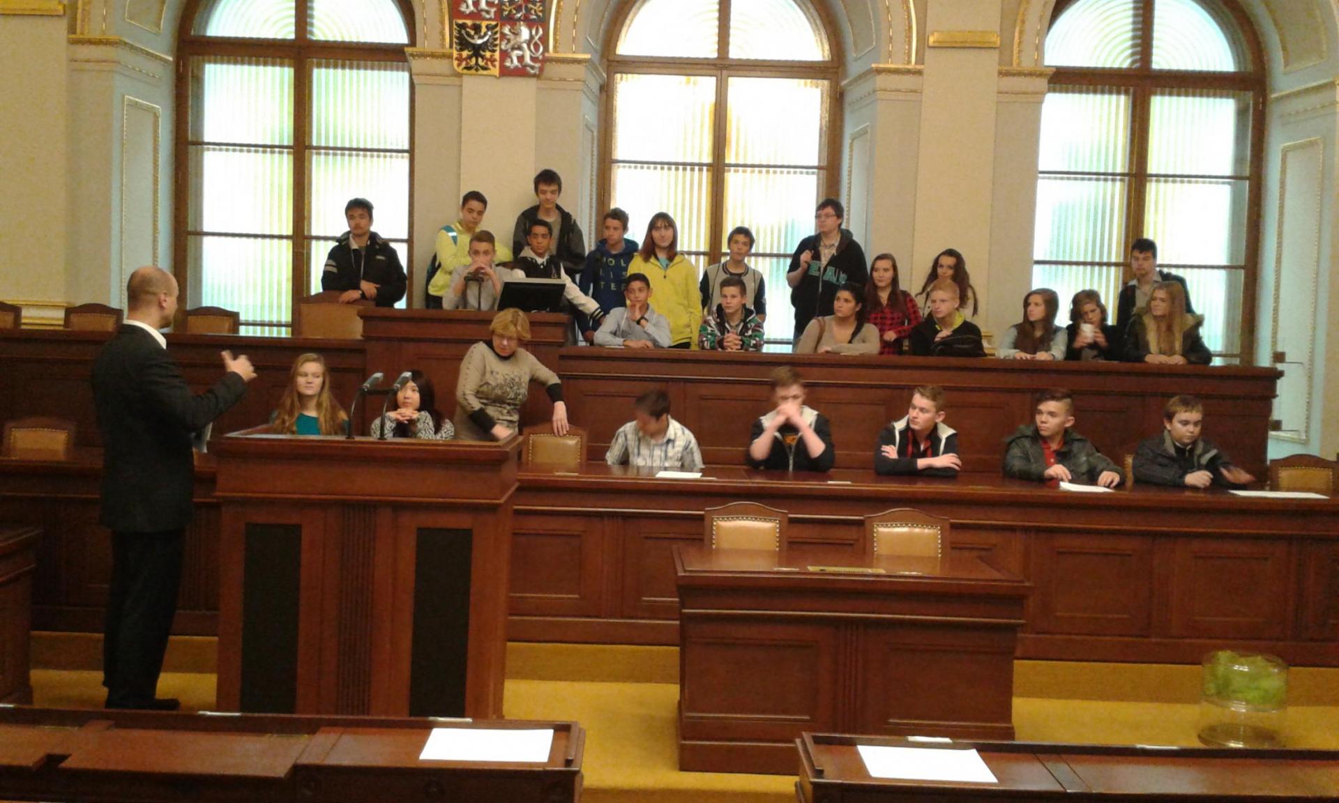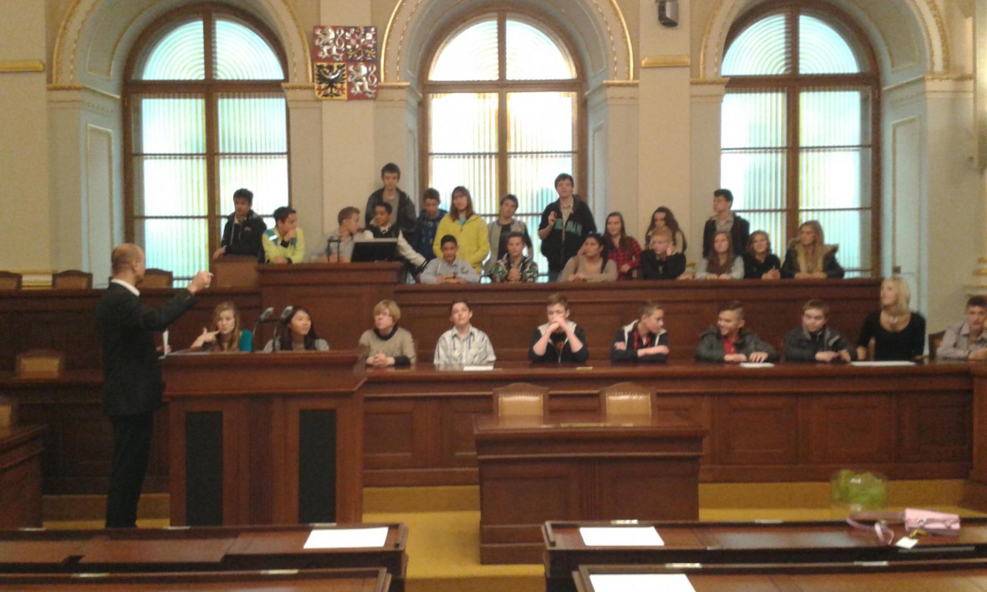 V Parlamentu jsme nejprve zamířili do Informačního centra. Paní průvodkyně nám řekla základní informace a pustila nám film o českém parlamentarismu a o tom, jak to chodí v Poslanecké sněmovně a Senátu. Po pečlivé prohlídce ochrankou nás přivítal poslanec za hnutí Ano pro Pardubický kraj Ing. Martin Kolovrátník. Díky jeho přítomnosti jsme se nejenom dozvěděli zajímavosti z dění ve sněmovně, ale také se dostali například před kancelář předsedy sněmovny a také do jednacího sálu. Tam jsme si vyzkoušeli, jak pohodlné jsou poslanecké lavice a jak se stojí za mikrofonem. Pan Kolovrátník s úsměvem zodpověděl všechny všetečné dotazy.