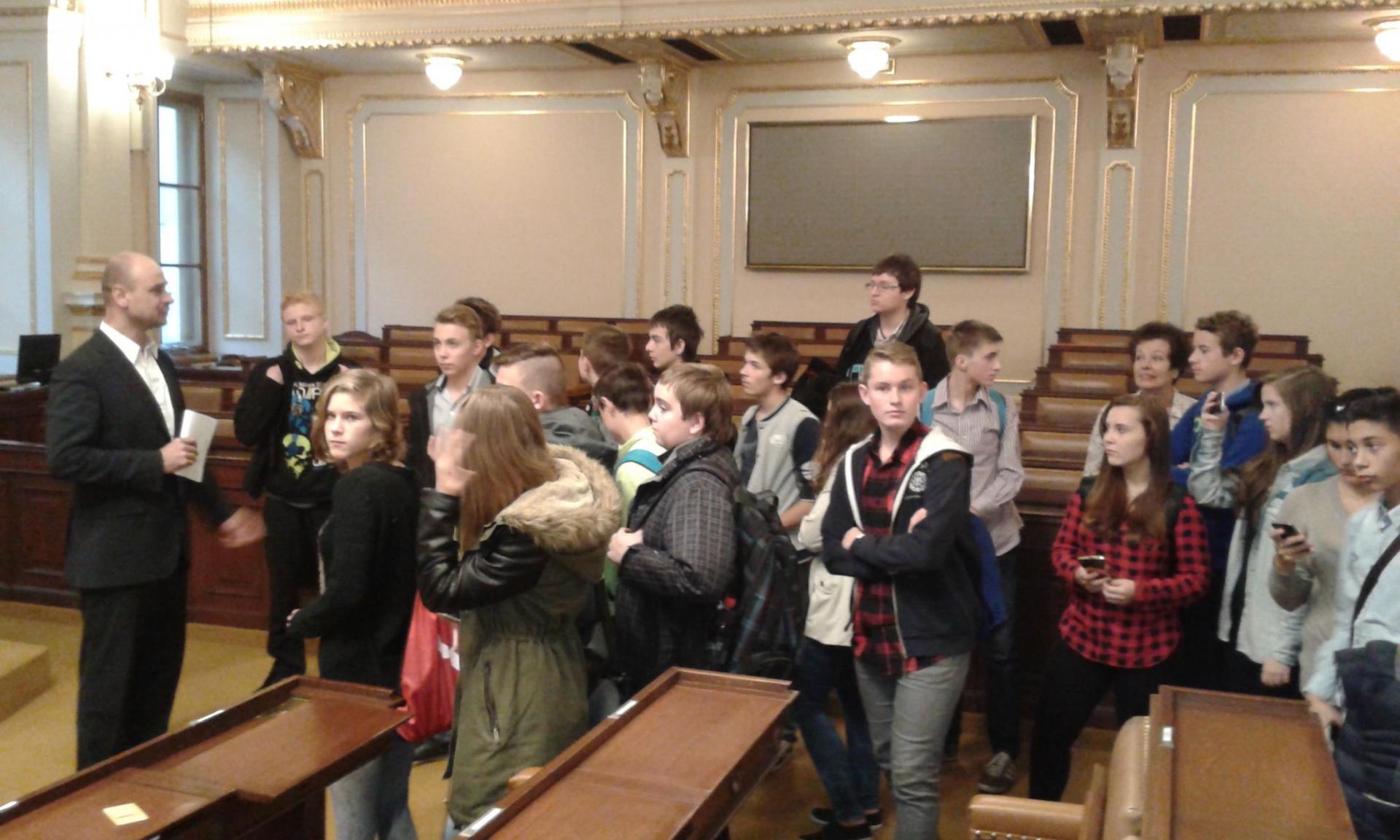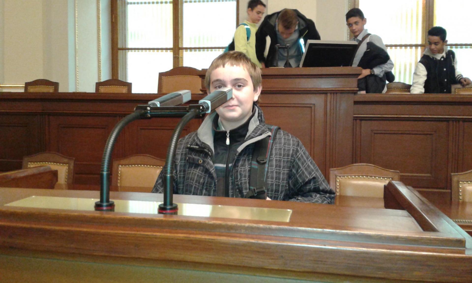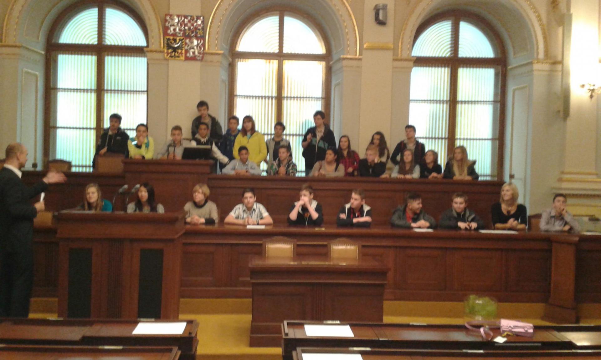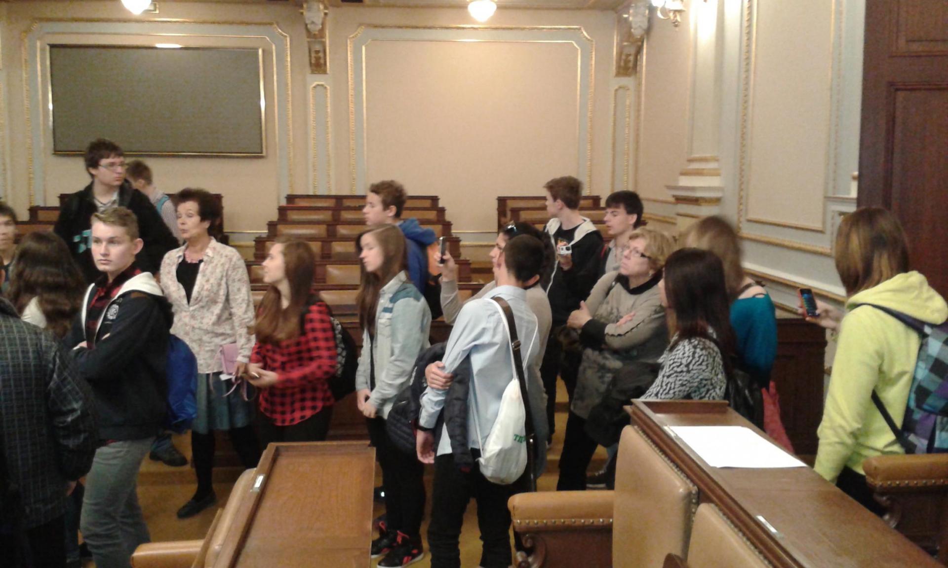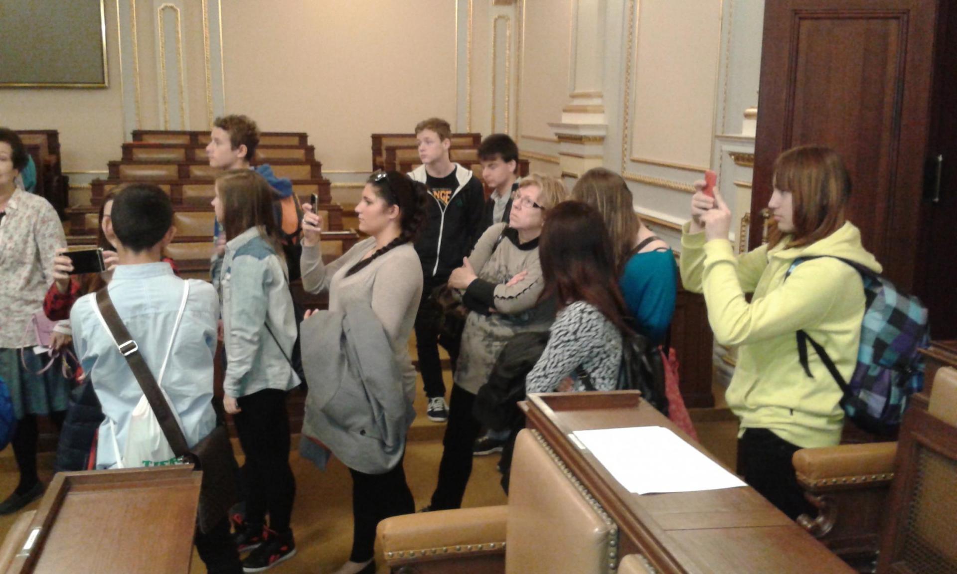 V Parlamentu jsme nejprve zamířili do Informačního centra. Paní průvodkyně nám řekla základní informace a pustila nám film o českém parlamentarismu a o tom, jak to chodí v Poslanecké sněmovně a Senátu. Po pečlivé prohlídce ochrankou nás přivítal poslanec za hnutí Ano pro Pardubický kraj Ing. Martin Kolovrátník. Díky jeho přítomnosti jsme se nejenom dozvěděli zajímavosti z dění ve sněmovně, ale také se dostali například před kancelář předsedy sněmovny a také do jednacího sálu. Tam jsme si vyzkoušeli, jak pohodlné jsou poslanecké lavice a jak se stojí za mikrofonem. Pan Kolovrátník s úsměvem zodpověděl všechny všetečné dotazy.