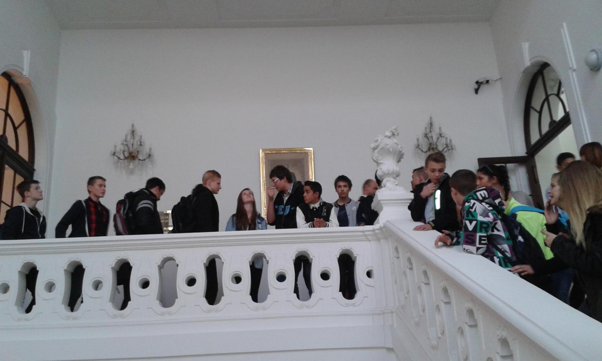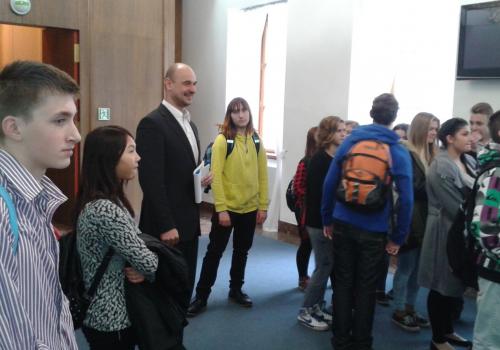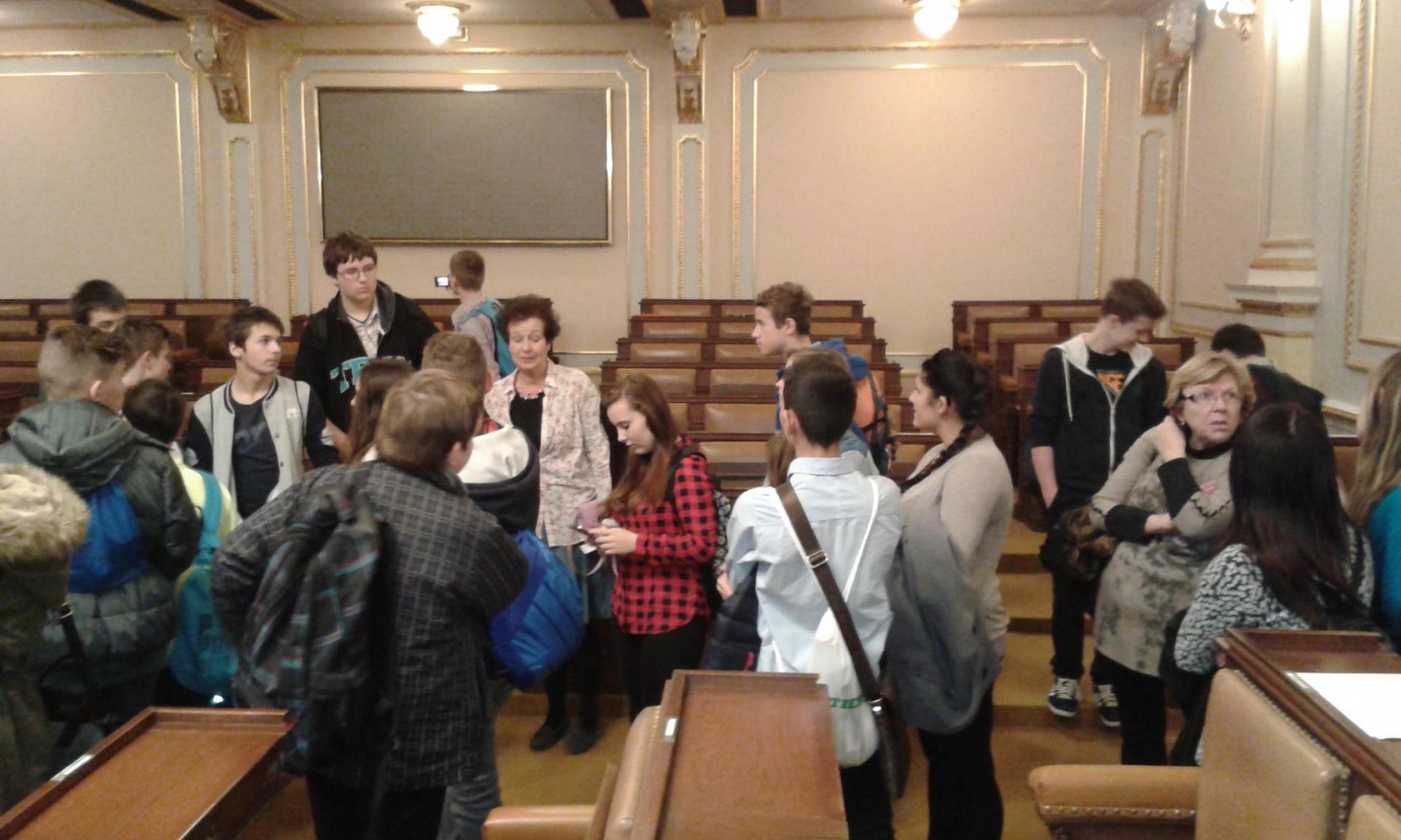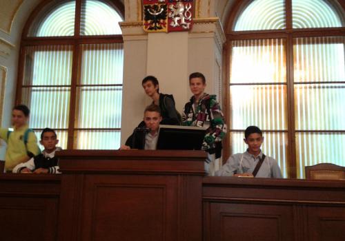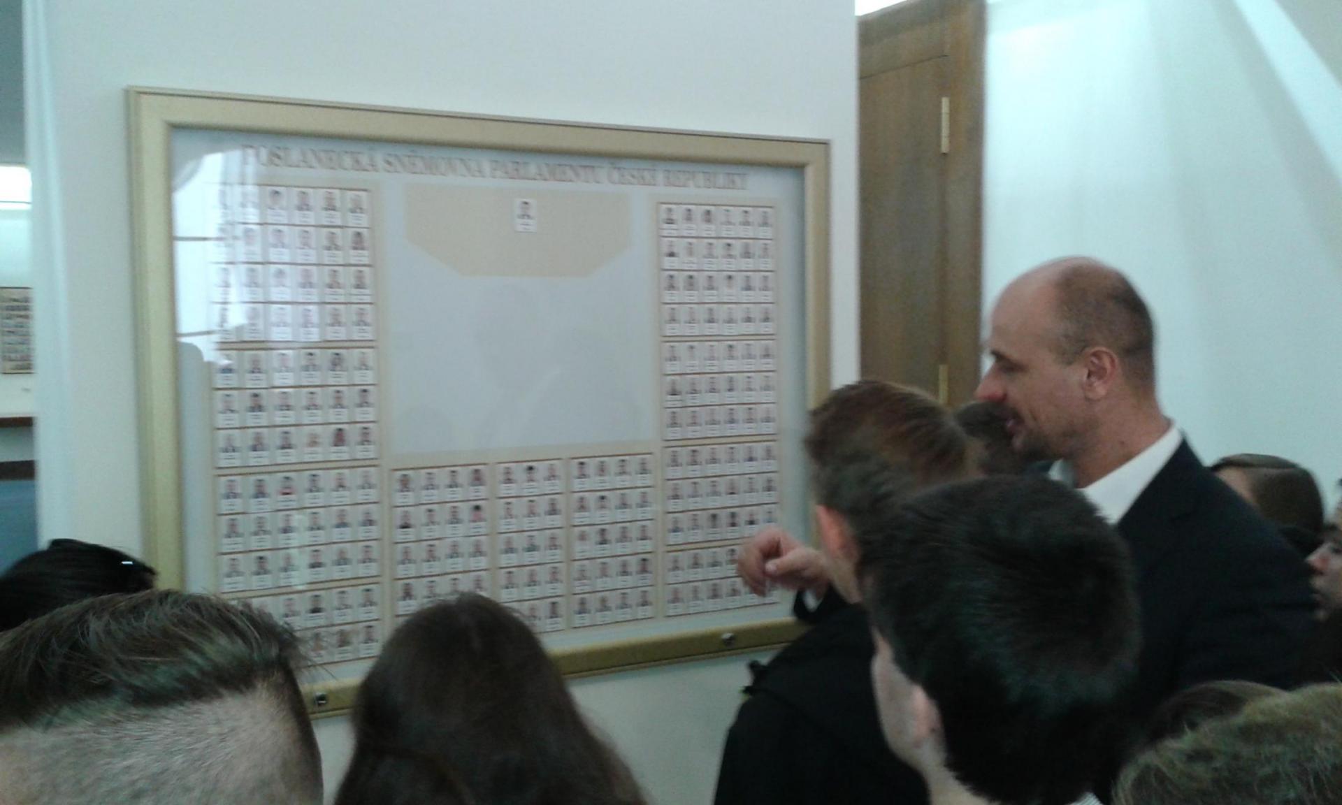 V Parlamentu jsme nejprve zamířili do Informačního centra. Paní průvodkyně nám řekla základní informace a pustila nám film o českém parlamentarismu a o tom, jak to chodí v Poslanecké sněmovně a Senátu. Po pečlivé prohlídce ochrankou nás přivítal poslanec za hnutí Ano pro Pardubický kraj Ing. Martin Kolovrátník. Díky jeho přítomnosti jsme se nejenom dozvěděli zajímavosti z dění ve sněmovně, ale také se dostali například před kancelář předsedy sněmovny a také do jednacího sálu. Tam jsme si vyzkoušeli, jak pohodlné jsou poslanecké lavice a jak se stojí za mikrofonem. Pan Kolovrátník s úsměvem zodpověděl všechny všetečné dotazy.