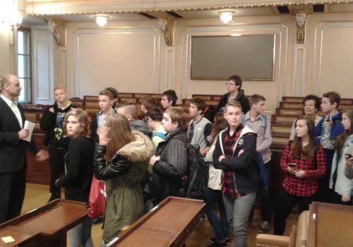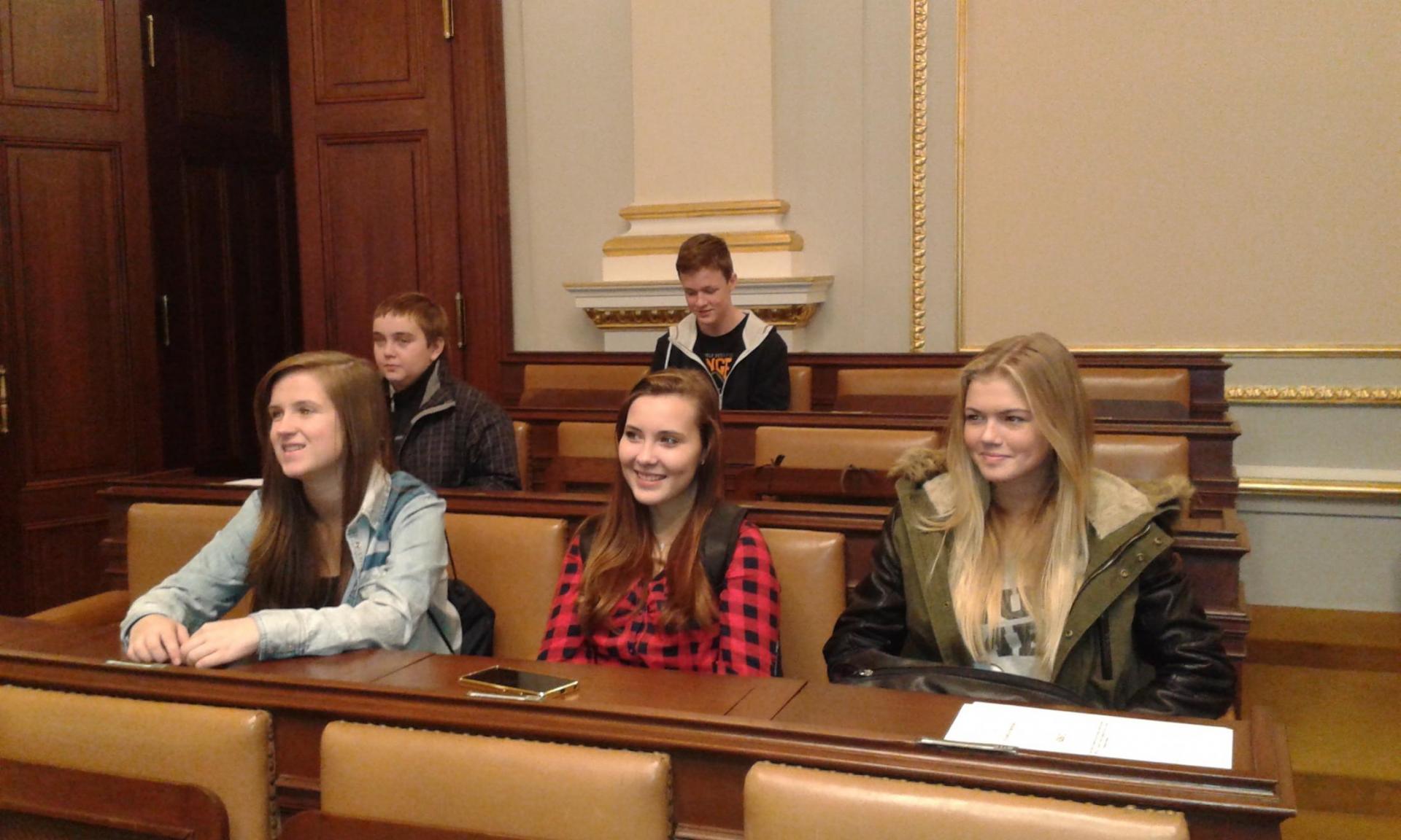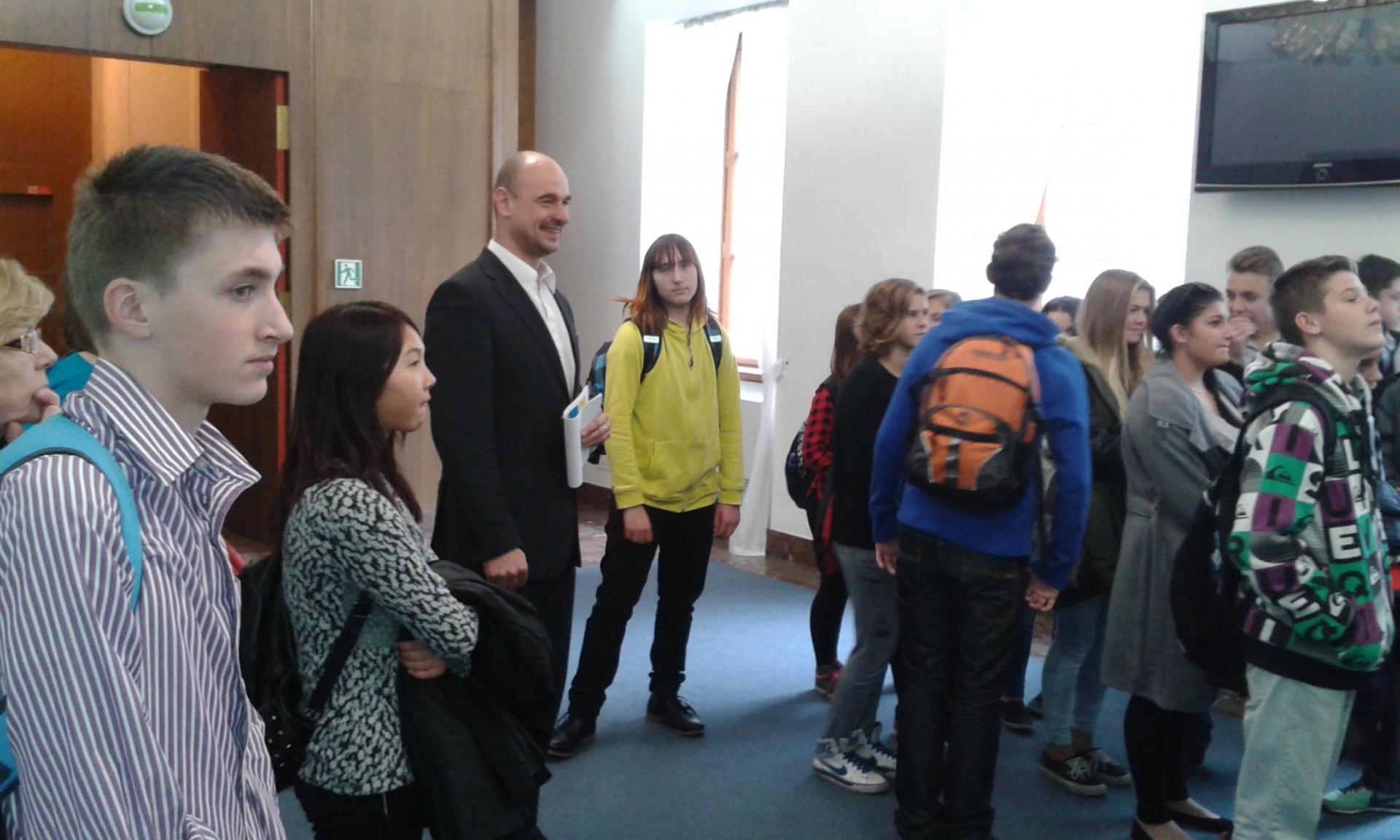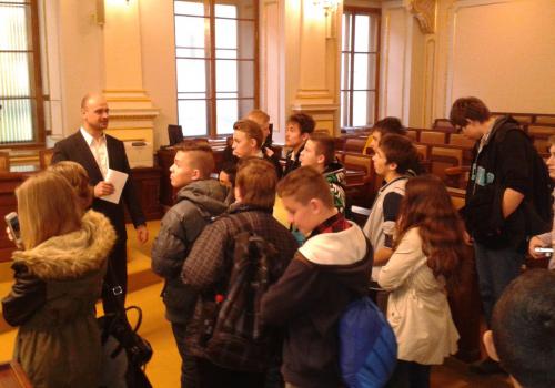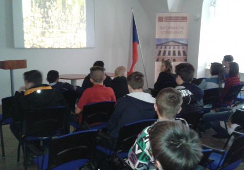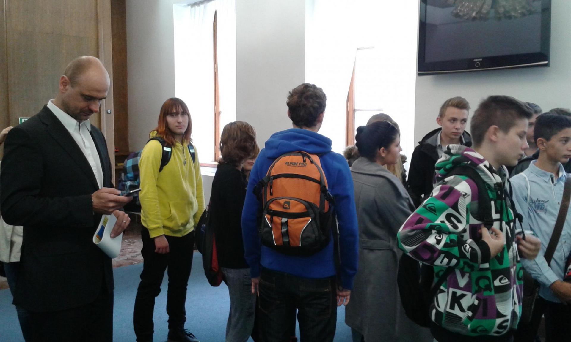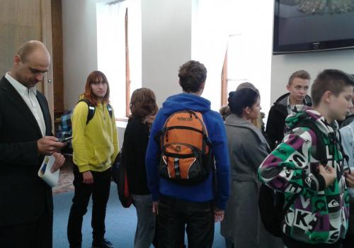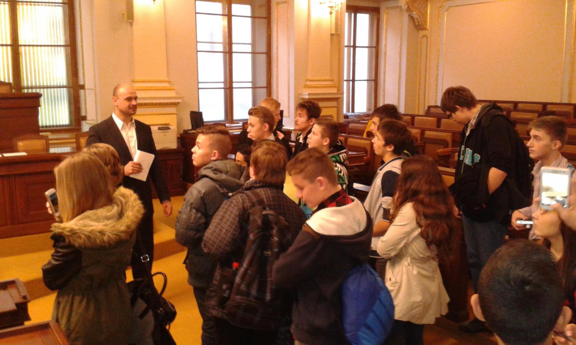 V Parlamentu jsme nejprve zamířili do Informačního centra. Paní průvodkyně nám řekla základní informace a pustila nám film o českém parlamentarismu a o tom, jak to chodí v Poslanecké sněmovně a Senátu. Po pečlivé prohlídce ochrankou nás přivítal poslanec za hnutí Ano pro Pardubický kraj Ing. Martin Kolovrátník. Díky jeho přítomnosti jsme se nejenom dozvěděli zajímavosti z dění ve sněmovně, ale také se dostali například před kancelář předsedy sněmovny a také do jednacího sálu. Tam jsme si vyzkoušeli, jak pohodlné jsou poslanecké lavice a jak se stojí za mikrofonem. Pan Kolovrátník s úsměvem zodpověděl všechny všetečné dotazy.