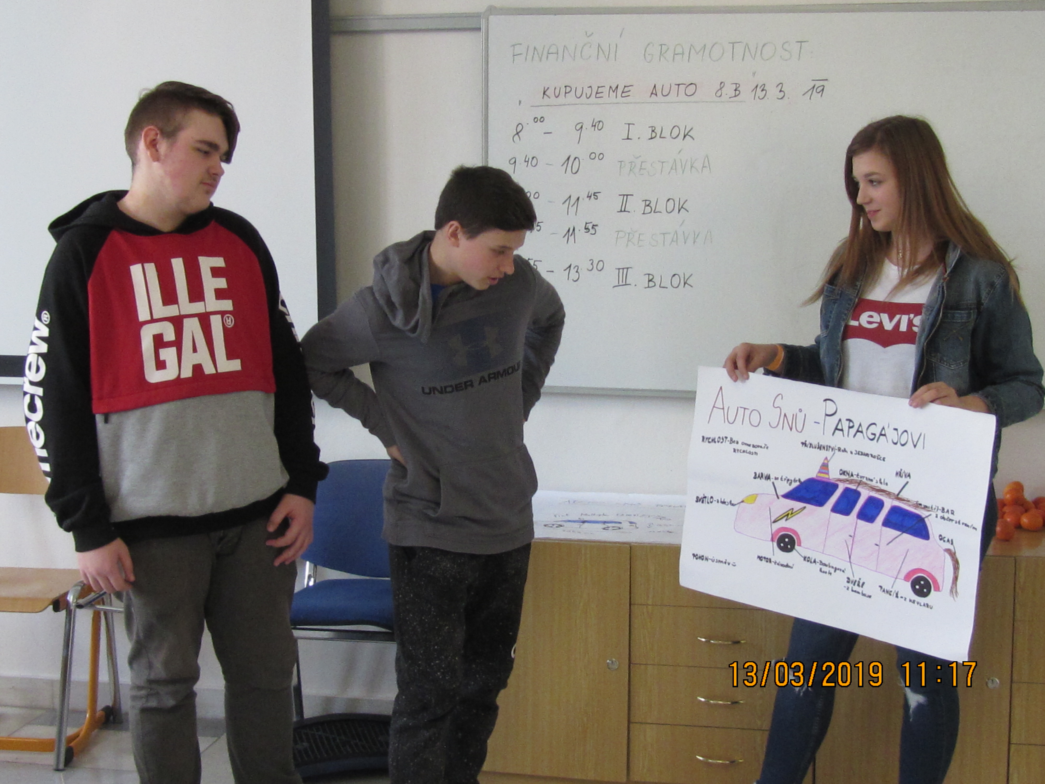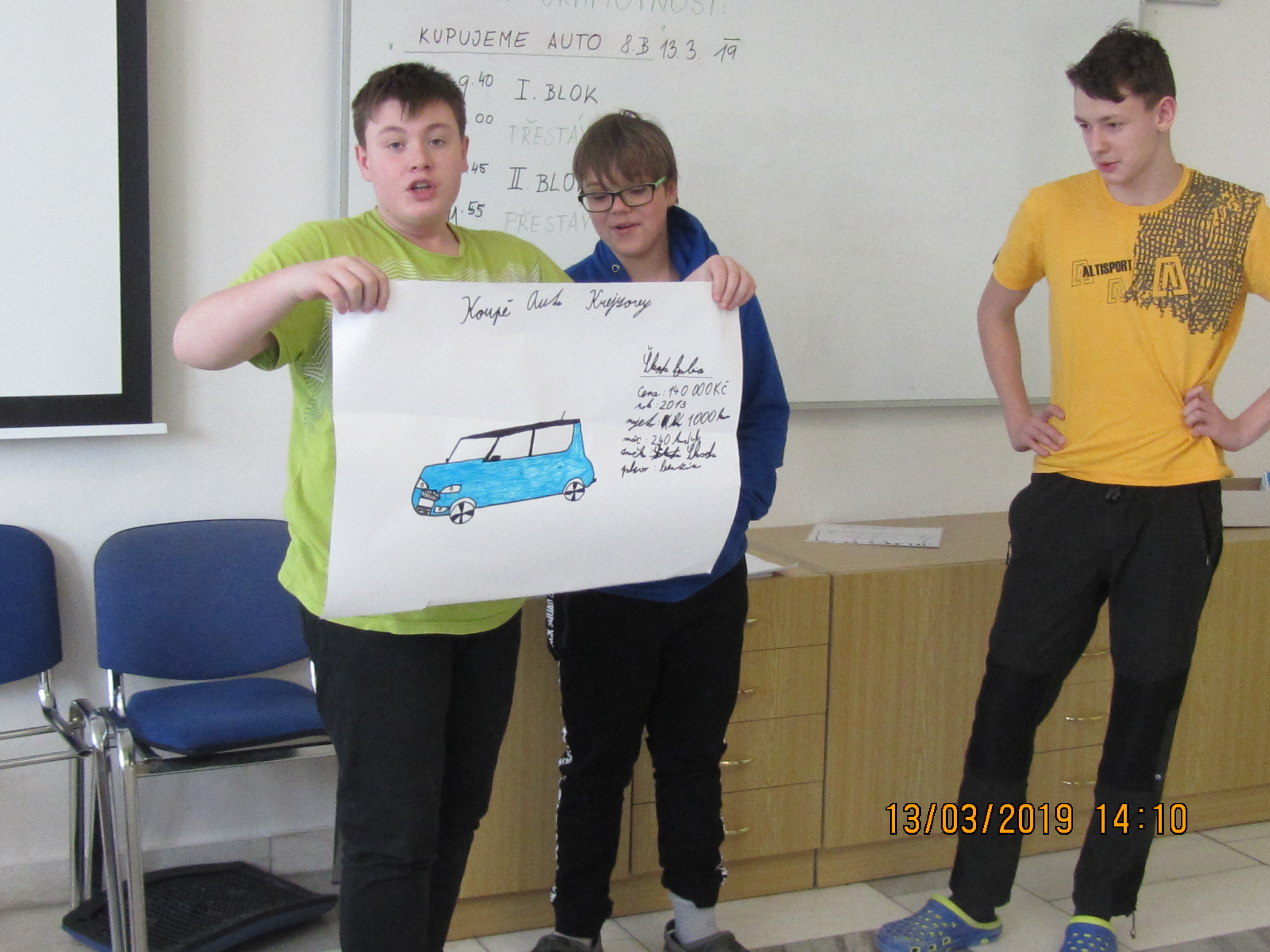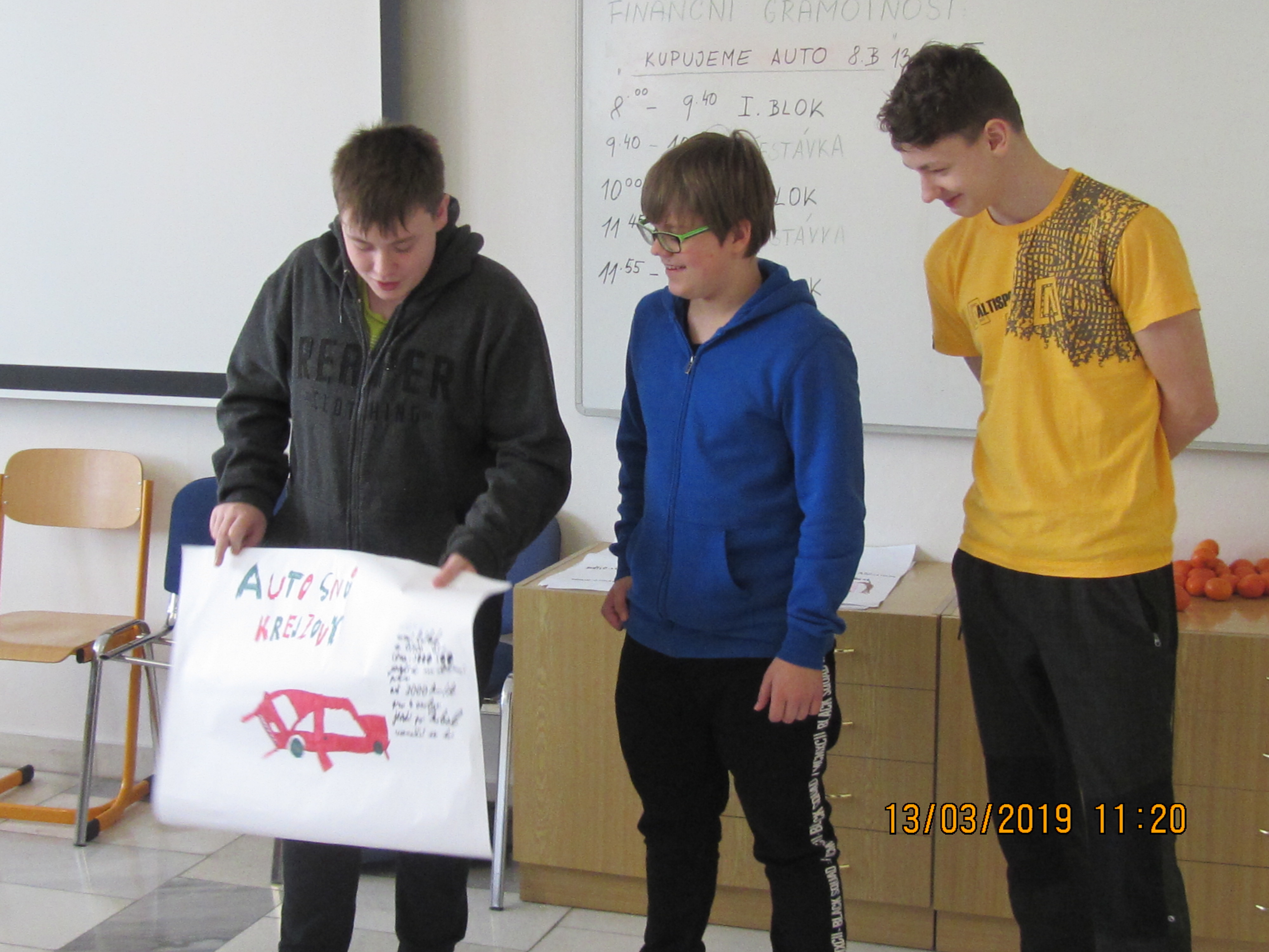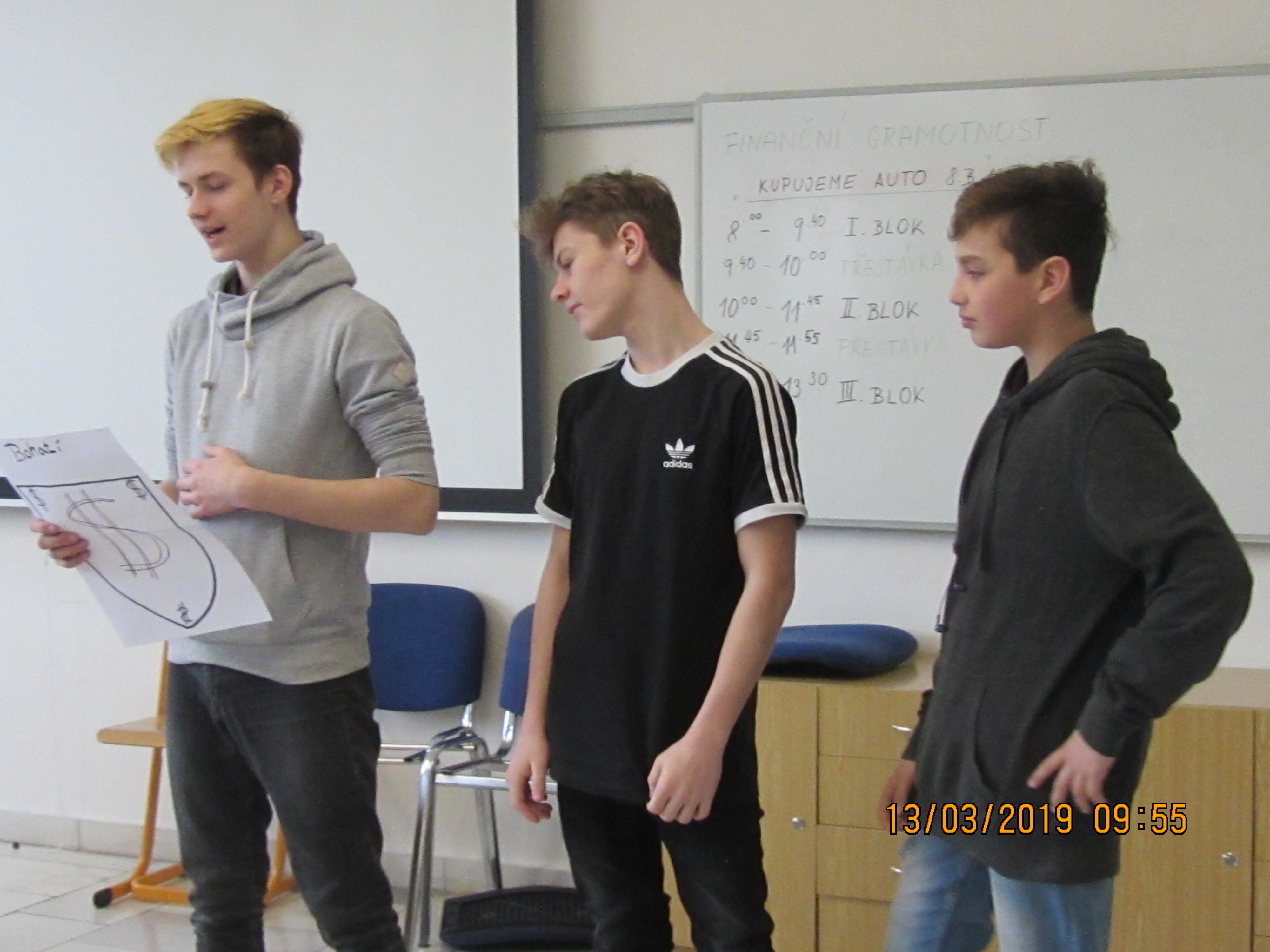 Ve třídě 8.B proběhly již dva projektové dny zaměřené na rozvoj finanční gramotnosti, první v prosinci 2018 na téma "Hospodaření domácnosti" a druhý v březnu 2019 na téma "Kupujeme auto". Během prvního projektového dne si žáci vytvořili modelové domácnosti, kde každý zastává nějakou roli, vymysleli si názvy a erb - vznikli Papagájovi, Štístkovi, Bohatí, Krejzovy a Komárkovi. Charakteristiky jednotlivých domácností byly předem namodelovány. Některá domácnost je sociálně slabší, jiná průměrná nebo bohatá. Zamýšleli jsme se nad tím, co patří do příjmů a výdajů domácnosti a jednotlivé domácnosti si vytvořily své rozpočty. Cílem bylo, aby byly příjmy vyšší než výdaje. Během druhého projektového dne každá domácnost kupovala auto. Před tím jsme se zamýšleli, jaká kritéria rozhodují při výběru nového automobilu, co patří do povinné, standardní a nadstandardní výbavy automobilu a především, jaké platby souvisí s provozem automobilu. Jednotlivé domácnosti kreslily své "auto snů". Poté jsme do domácností rozdali příběhy rodin, které kupovaly auto. Jednotlivé domácnosti pak prezentovaly ostatním jednotlivé příběhy a zamýšlely se nad tím, jestli rodiny postupovaly správně a jaké finanční služby a prostředky na to použily. Na závěr si každá domácnost koupila auto a zaznamenala náklady na jeho provoz do rozpočtu. Během těchto projektových dnů se děti seznámily s mnoha novými pojmy jako leasing, povinné ručení, havarijní pojištění, kreditní a debetní karta aj. Oba dny nás provázely aktivity na uvolnění jako koberečky, kolečko a švihadla, ubrus, osmisměrka. Doufáme, že si děti odnesly mnoho poučných informací a těšíme se na další projektový den.