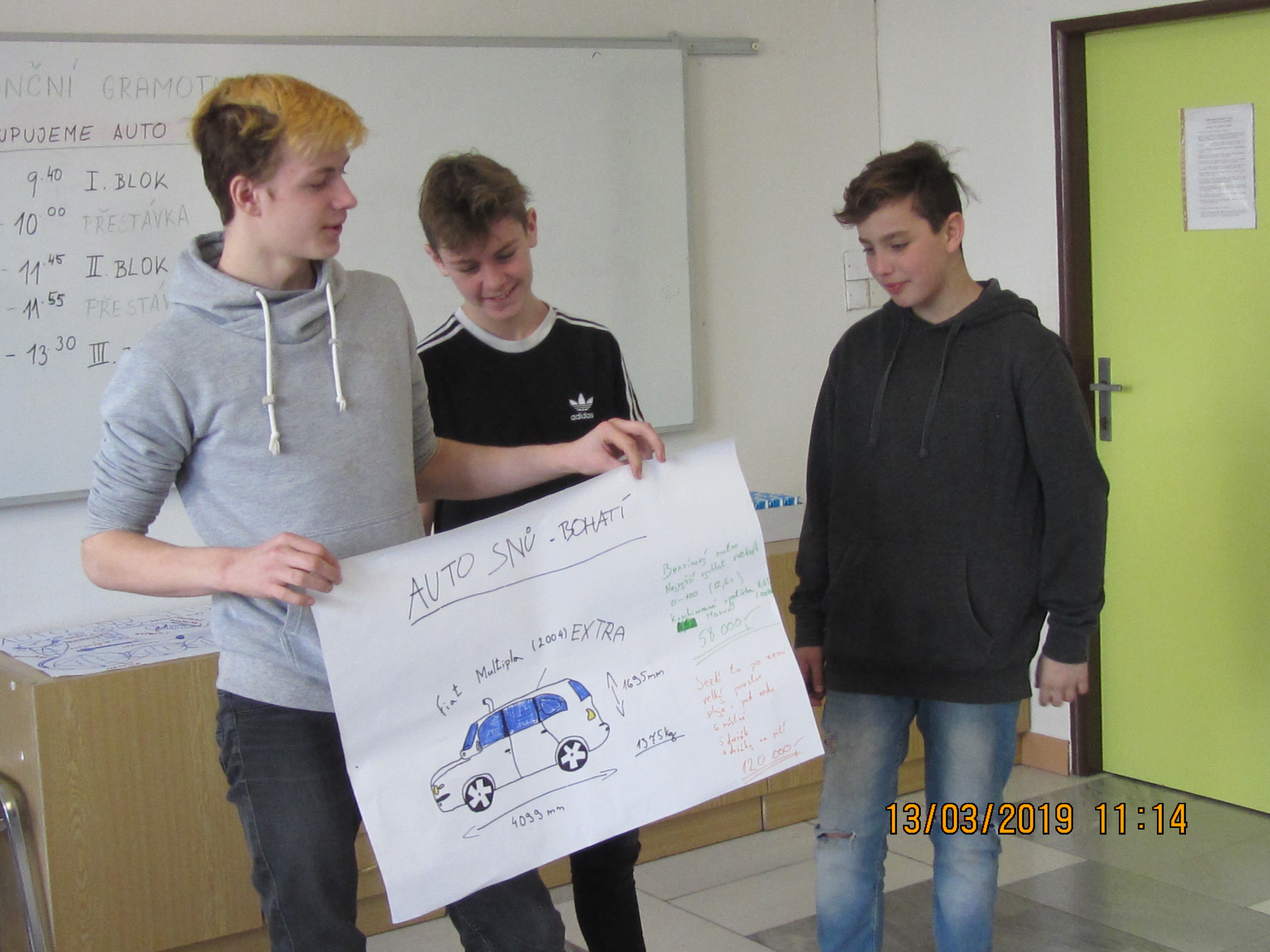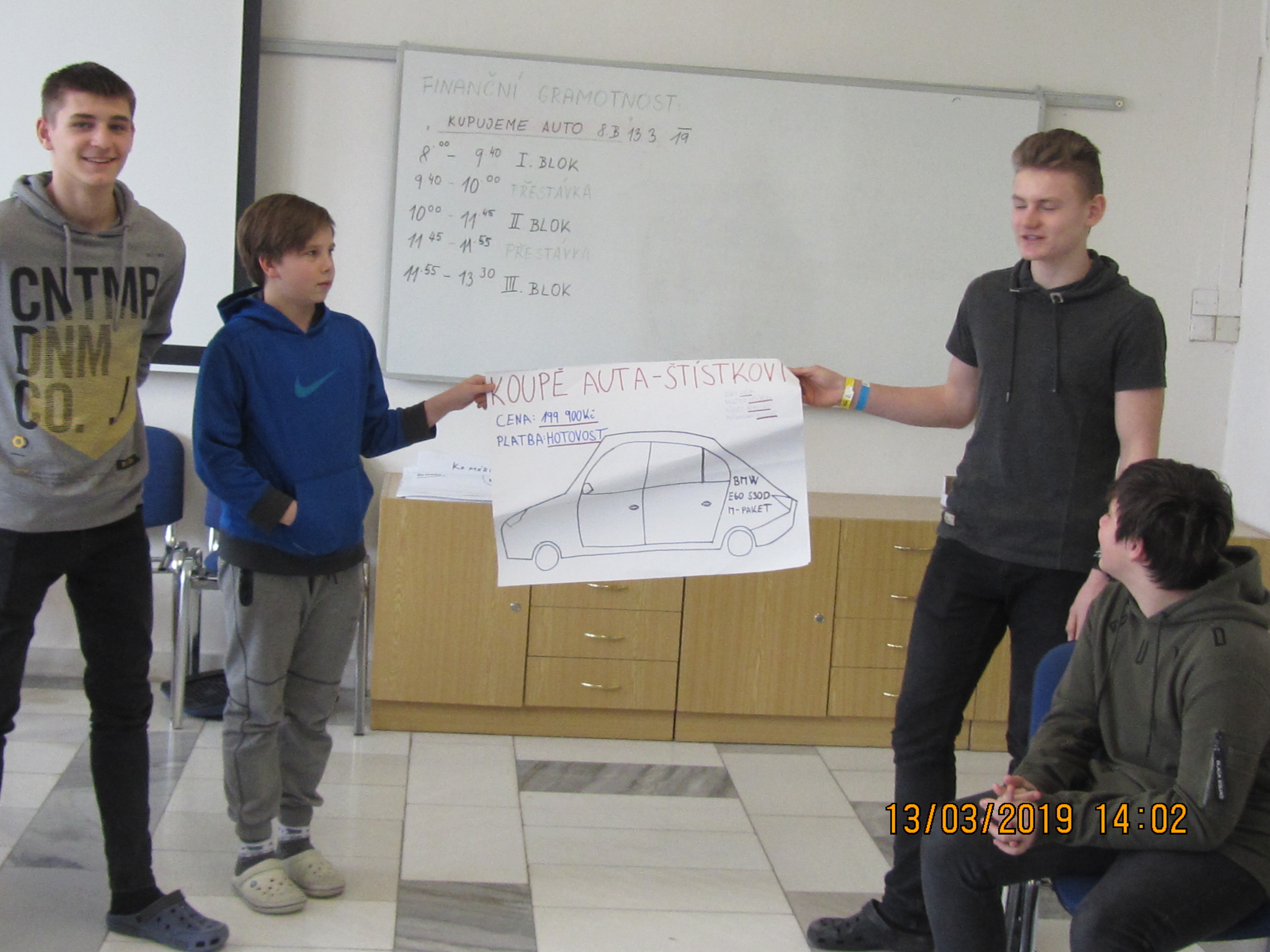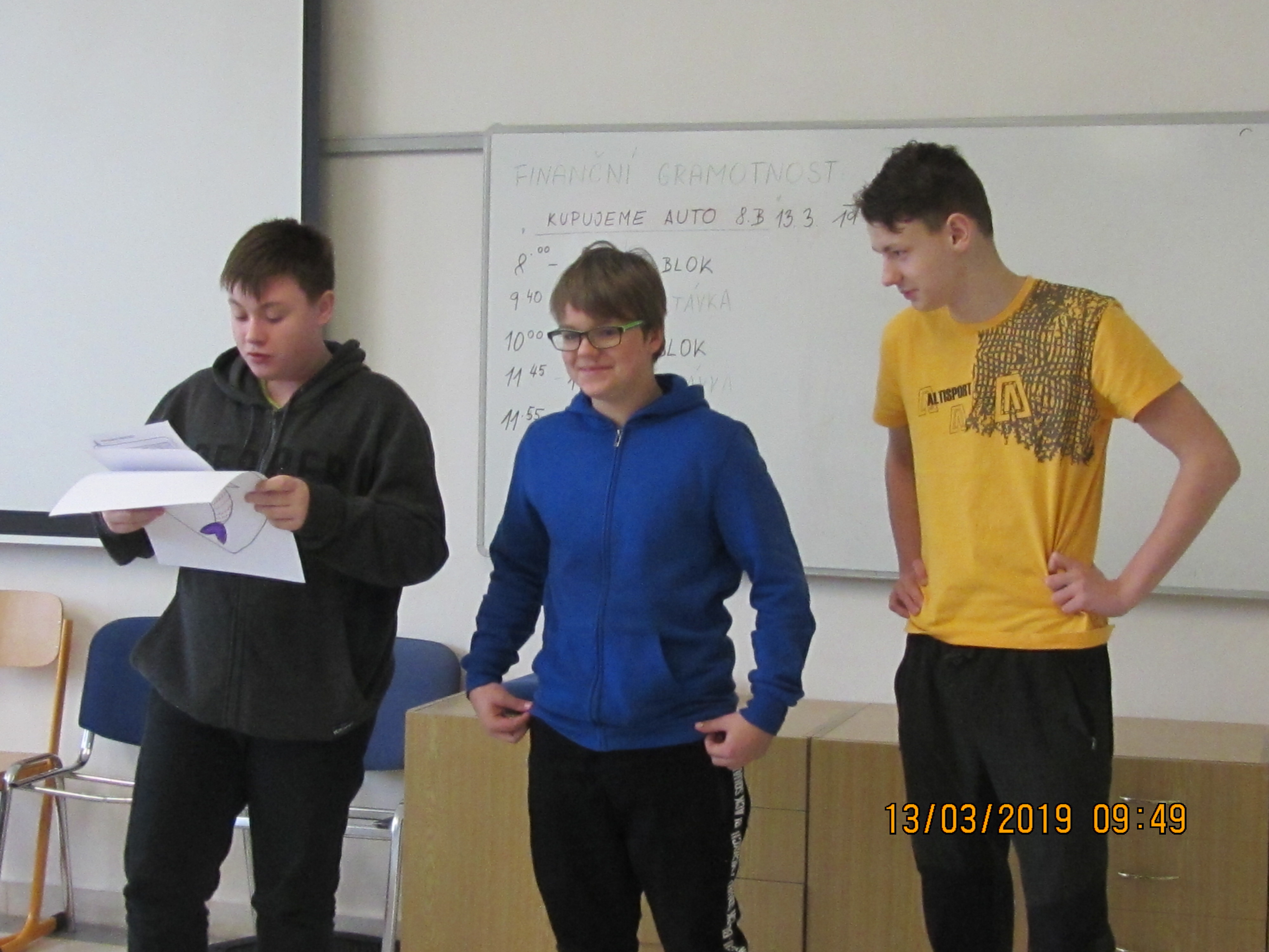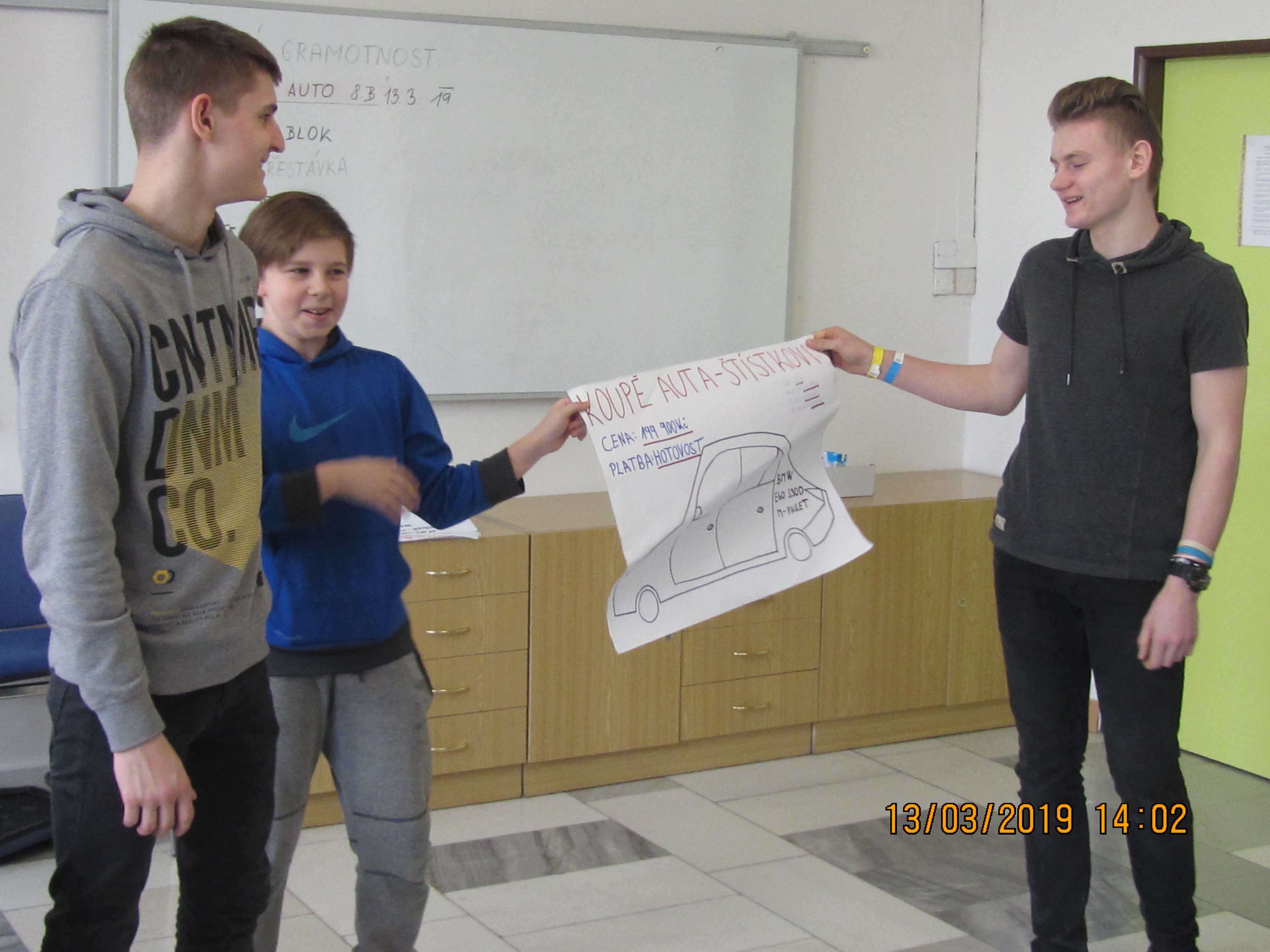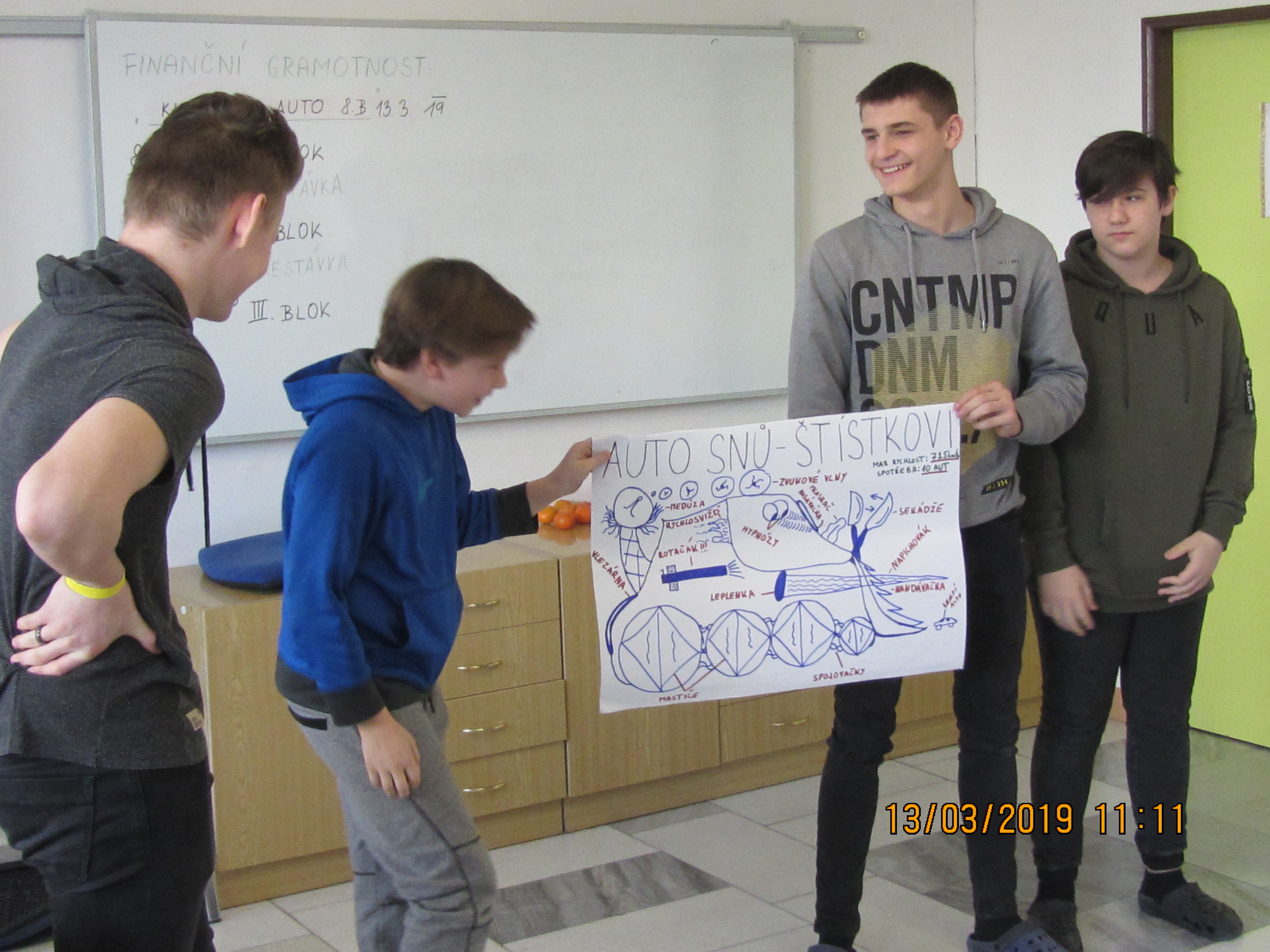 Ve třídě 8.B proběhly již dva projektové dny zaměřené na rozvoj finanční gramotnosti, první v prosinci 2018 na téma "Hospodaření domácnosti" a druhý v březnu 2019 na téma "Kupujeme auto". Během prvního projektového dne si žáci vytvořili modelové domácnosti, kde každý zastává nějakou roli, vymysleli si názvy a erb - vznikli Papagájovi, Štístkovi, Bohatí, Krejzovy a Komárkovi. Charakteristiky jednotlivých domácností byly předem namodelovány. Některá domácnost je sociálně slabší, jiná průměrná nebo bohatá. Zamýšleli jsme se nad tím, co patří do příjmů a výdajů domácnosti a jednotlivé domácnosti si vytvořily své rozpočty. Cílem bylo, aby byly příjmy vyšší než výdaje. Během druhého projektového dne každá domácnost kupovala auto. Před tím jsme se zamýšleli, jaká kritéria rozhodují při výběru nového automobilu, co patří do povinné, standardní a nadstandardní výbavy automobilu a především, jaké platby souvisí s provozem automobilu. Jednotlivé domácnosti kreslily své "auto snů". Poté jsme do domácností rozdali příběhy rodin, které kupovaly auto. Jednotlivé domácnosti pak prezentovaly ostatním jednotlivé příběhy a zamýšlely se nad tím, jestli rodiny postupovaly správně a jaké finanční služby a prostředky na to použily. Na závěr si každá domácnost koupila auto a zaznamenala náklady na jeho provoz do rozpočtu. Během těchto projektových dnů se děti seznámily s mnoha novými pojmy jako leasing, povinné ručení, havarijní pojištění, kreditní a debetní karta aj. Oba dny nás provázely aktivity na uvolnění jako koberečky, kolečko a švihadla, ubrus, osmisměrka. Doufáme, že si děti odnesly mnoho poučných informací a těšíme se na další projektový den.