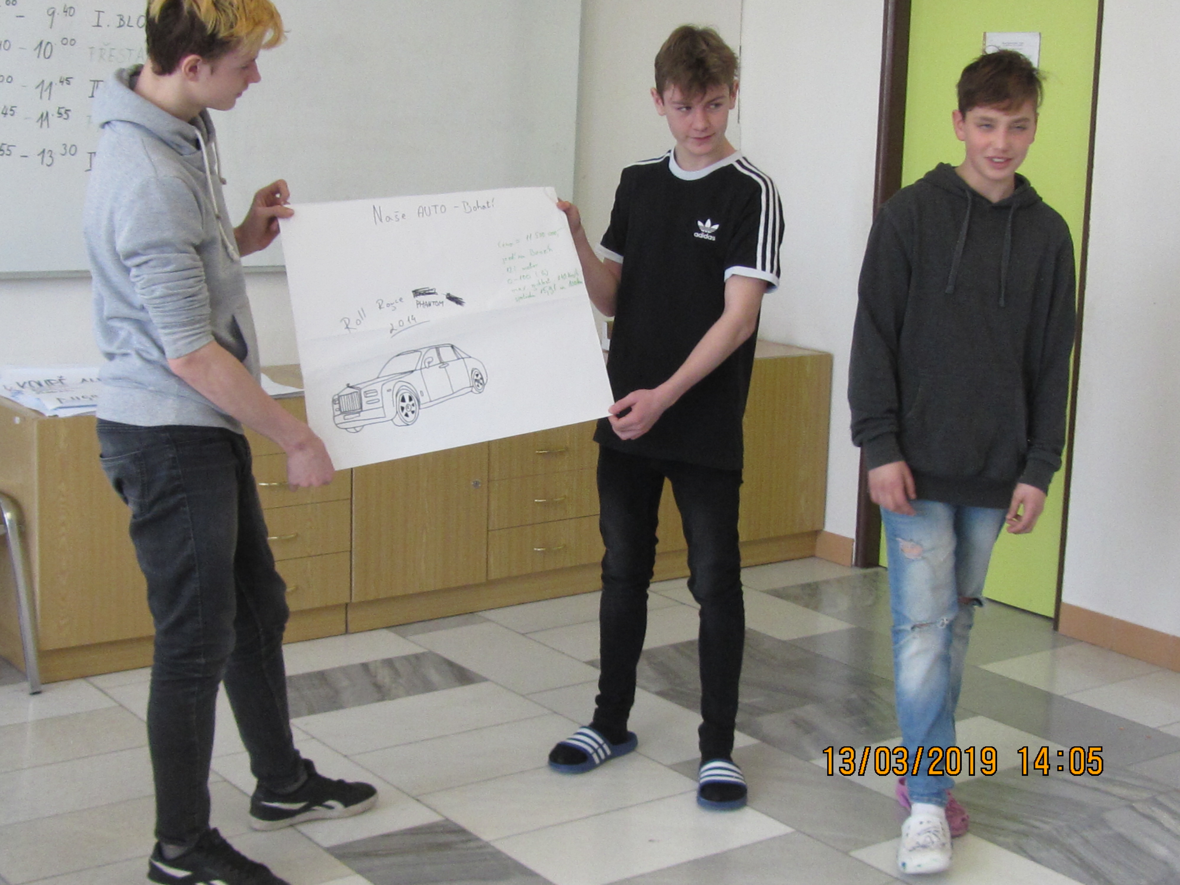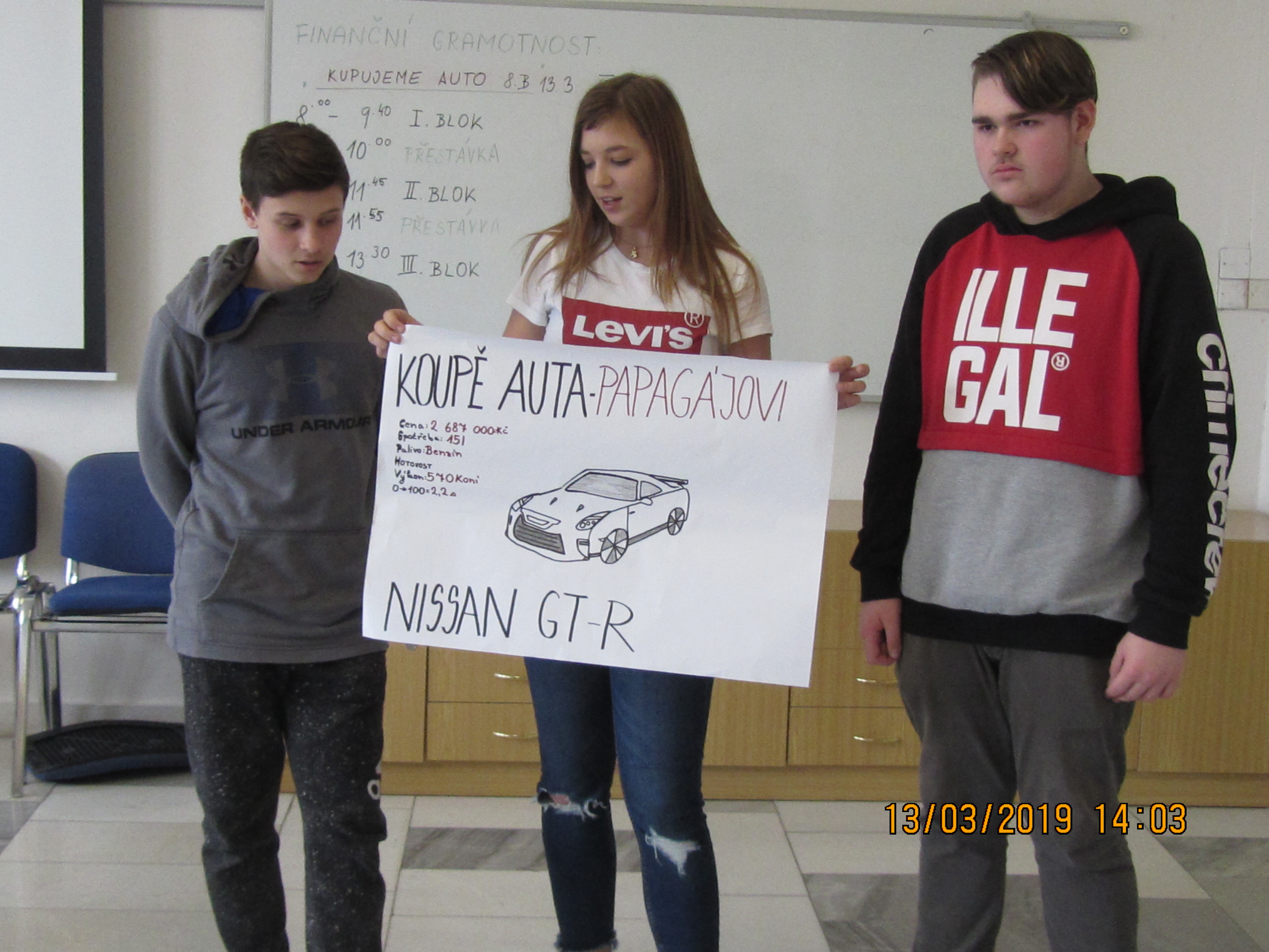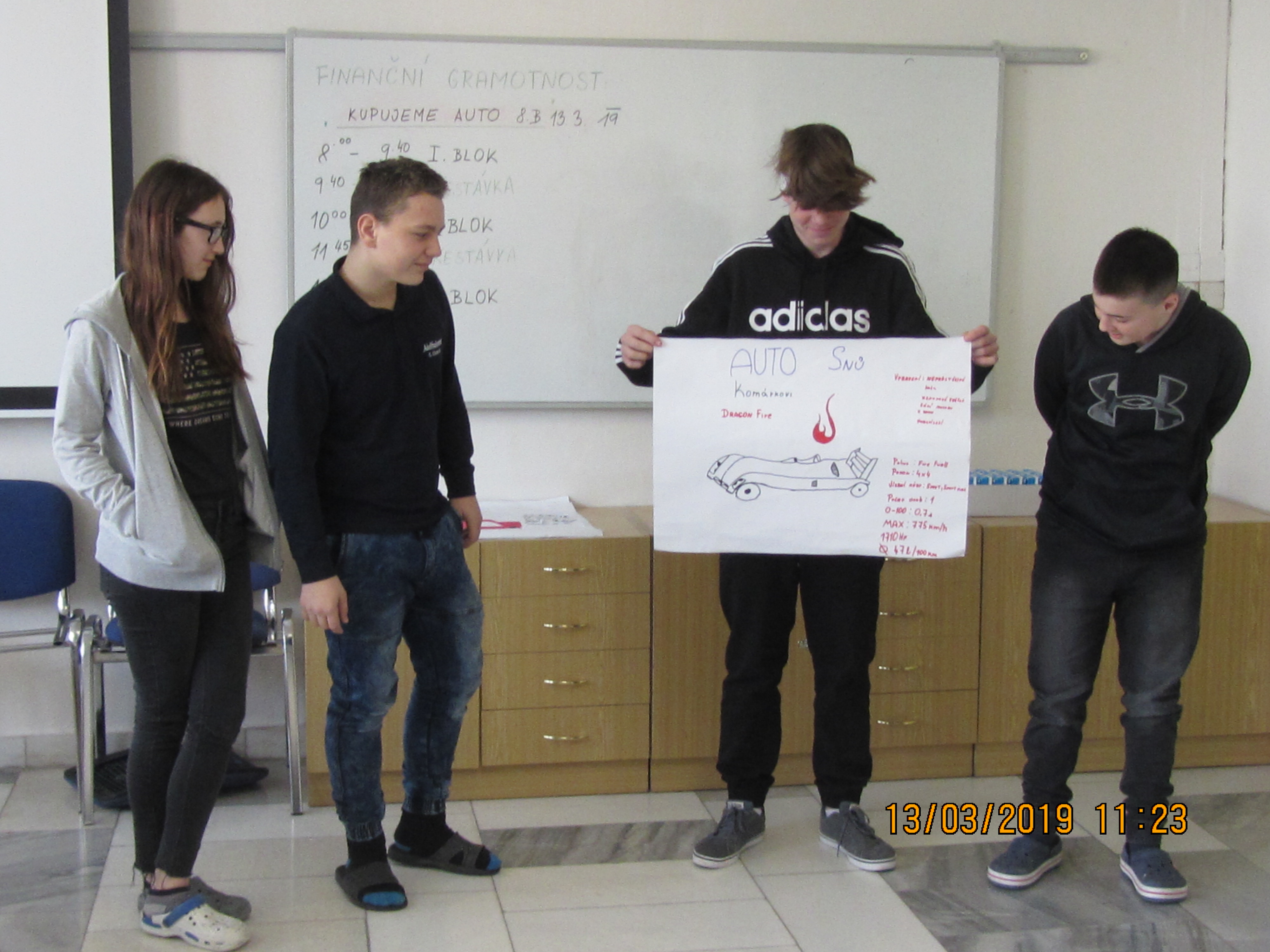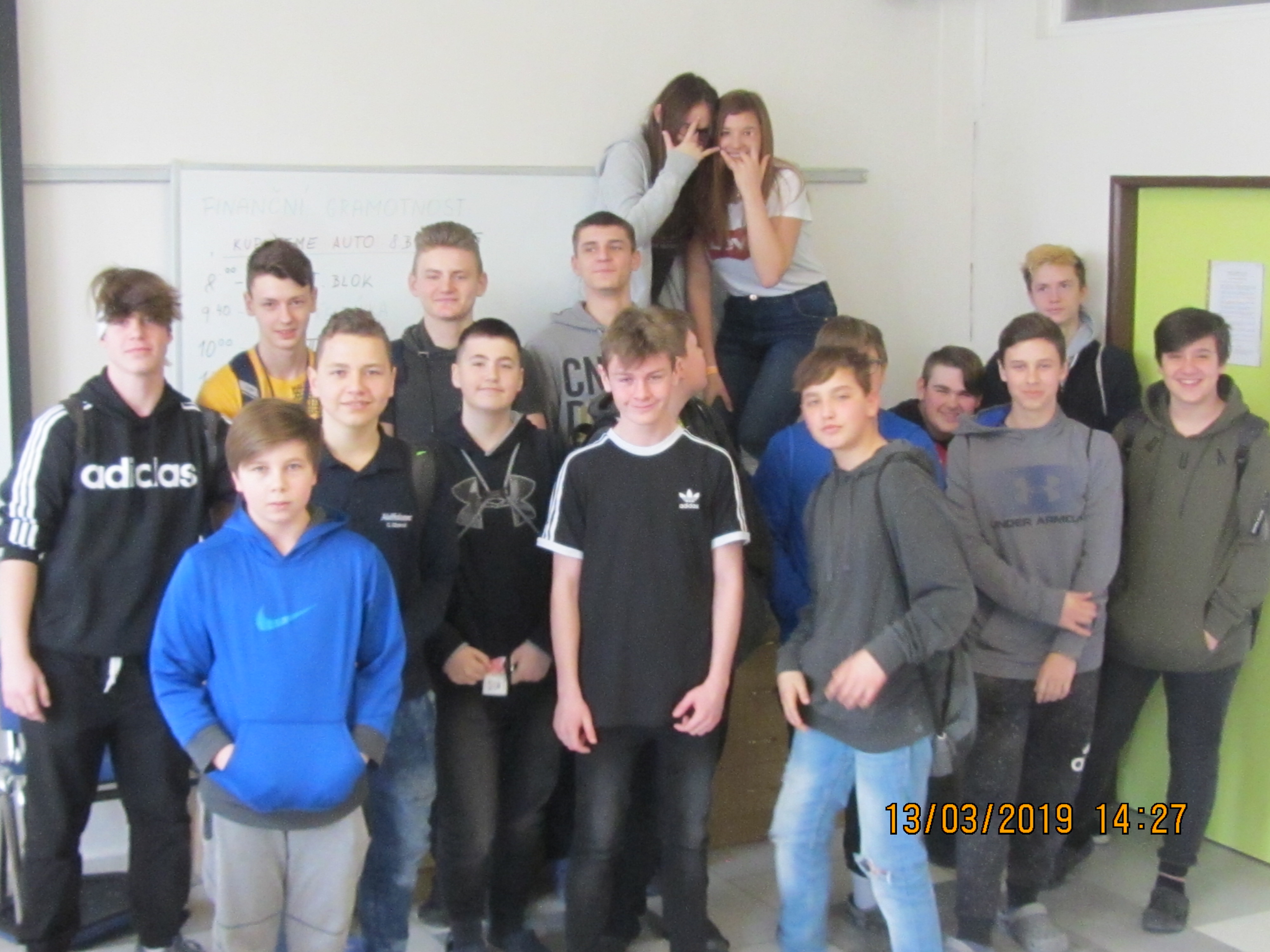 Ve třídě 8.B proběhly již dva projektové dny zaměřené na rozvoj finanční gramotnosti, první v prosinci 2018 na téma "Hospodaření domácnosti" a druhý v březnu 2019 na téma "Kupujeme auto". Během prvního projektového dne si žáci vytvořili modelové domácnosti, kde každý zastává nějakou roli, vymysleli si názvy a erb - vznikli Papagájovi, Štístkovi, Bohatí, Krejzovy a Komárkovi. Charakteristiky jednotlivých domácností byly předem namodelovány. Některá domácnost je sociálně slabší, jiná průměrná nebo bohatá. Zamýšleli jsme se nad tím, co patří do příjmů a výdajů domácnosti a jednotlivé domácnosti si vytvořily své rozpočty. Cílem bylo, aby byly příjmy vyšší než výdaje. Během druhého projektového dne každá domácnost kupovala auto. Před tím jsme se zamýšleli, jaká kritéria rozhodují při výběru nového automobilu, co patří do povinné, standardní a nadstandardní výbavy automobilu a především, jaké platby souvisí s provozem automobilu. Jednotlivé domácnosti kreslily své "auto snů". Poté jsme do domácností rozdali příběhy rodin, které kupovaly auto. Jednotlivé domácnosti pak prezentovaly ostatním jednotlivé příběhy a zamýšlely se nad tím, jestli rodiny postupovaly správně a jaké finanční služby a prostředky na to použily. Na závěr si každá domácnost koupila auto a zaznamenala náklady na jeho provoz do rozpočtu. Během těchto projektových dnů se děti seznámily s mnoha novými pojmy jako leasing, povinné ručení, havarijní pojištění, kreditní a debetní karta aj. Oba dny nás provázely aktivity na uvolnění jako koberečky, kolečko a švihadla, ubrus, osmisměrka. Doufáme, že si děti odnesly mnoho poučných informací a těšíme se na další projektový den.