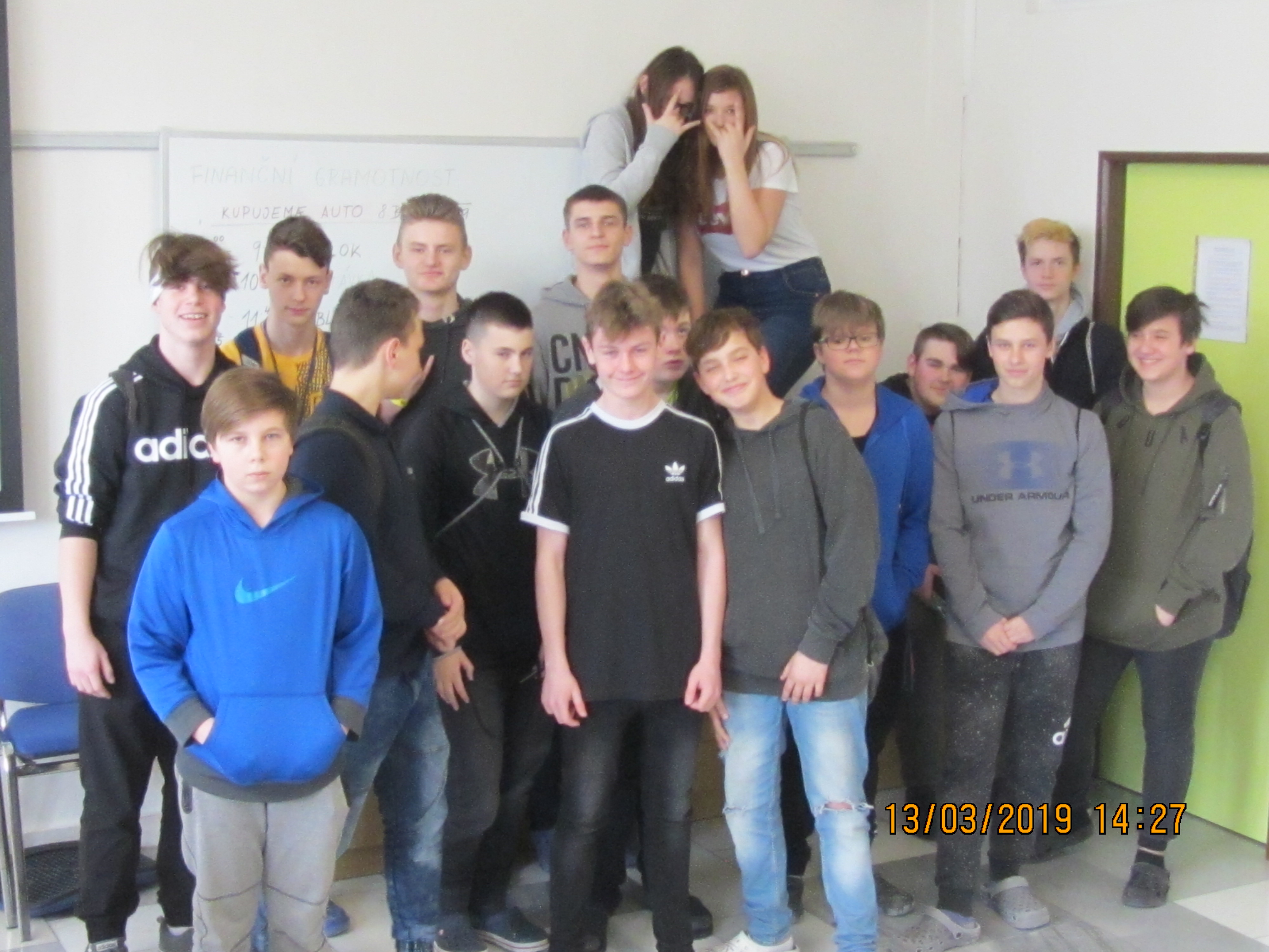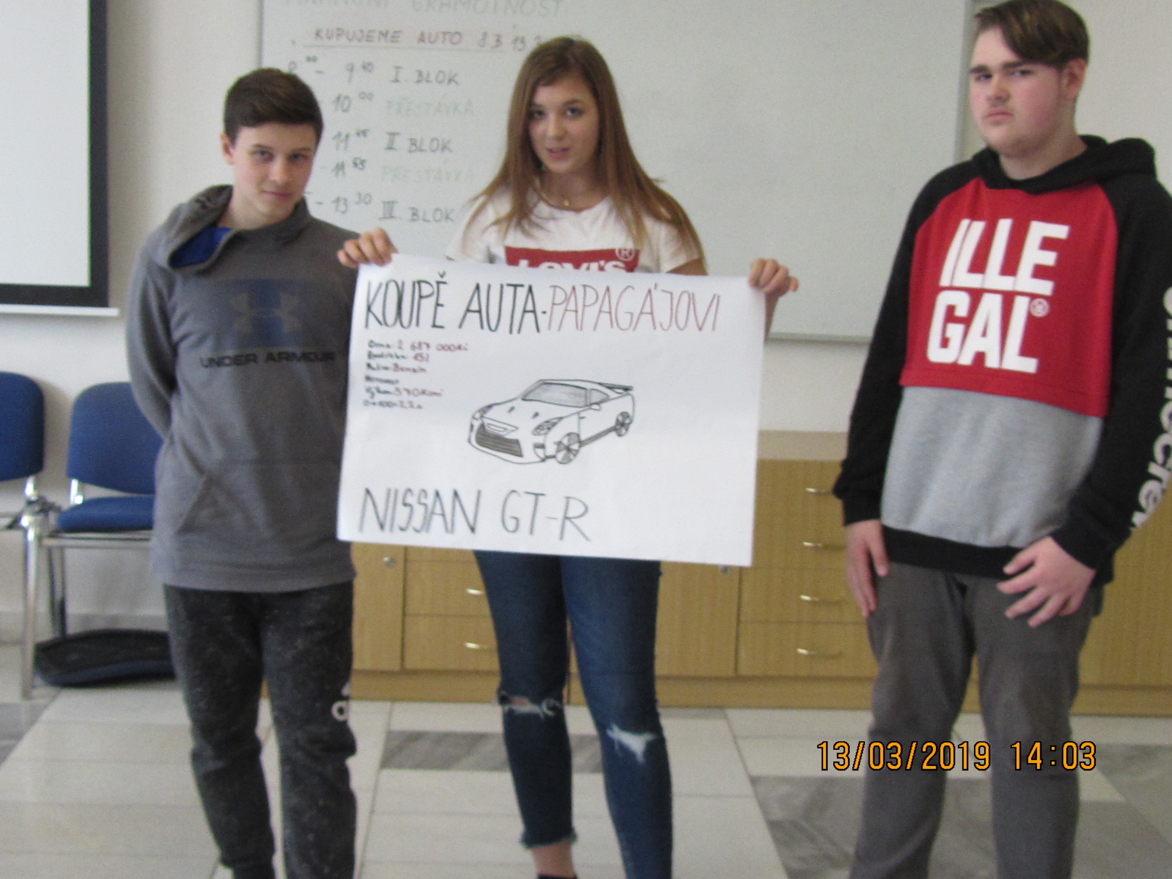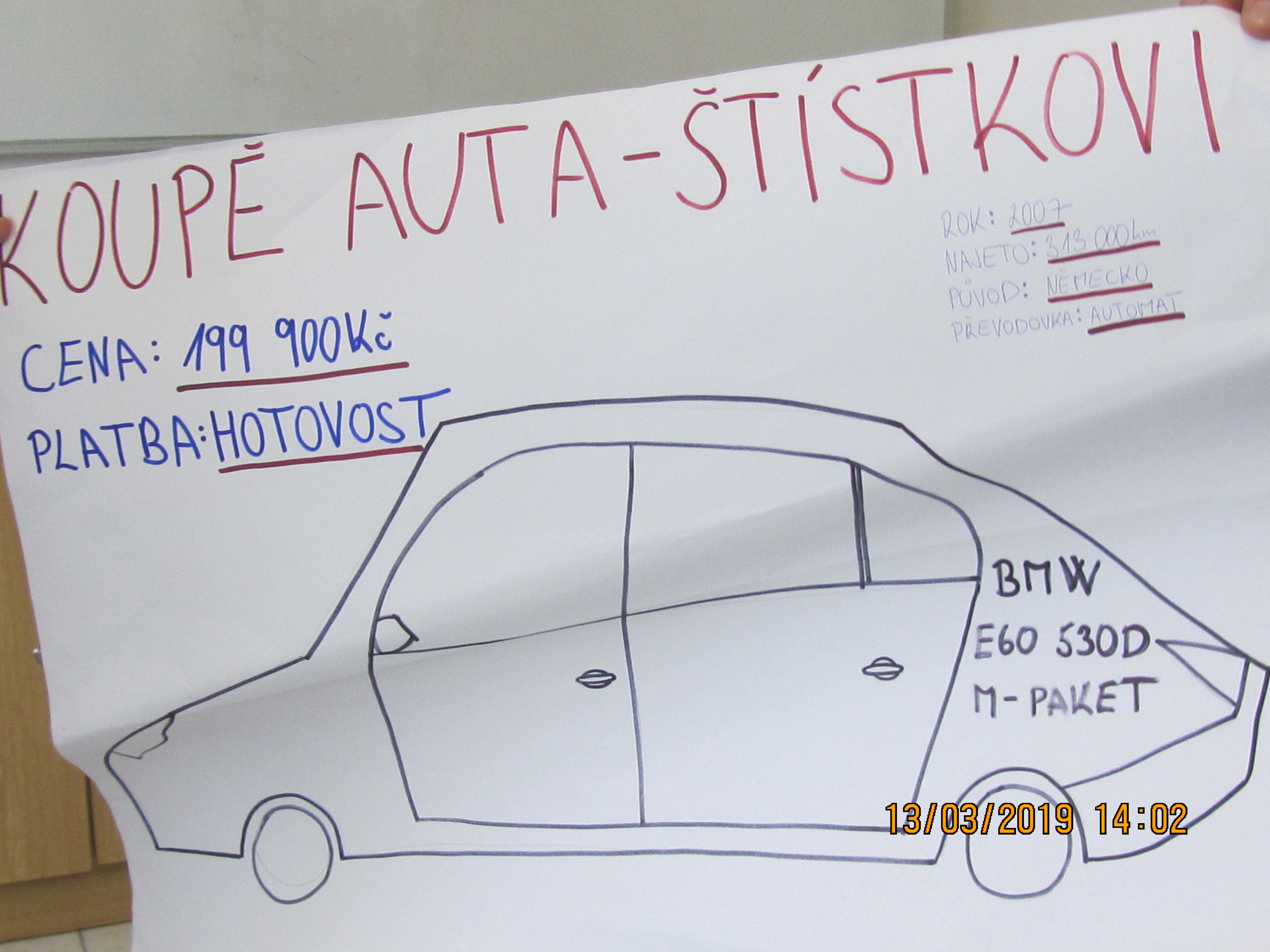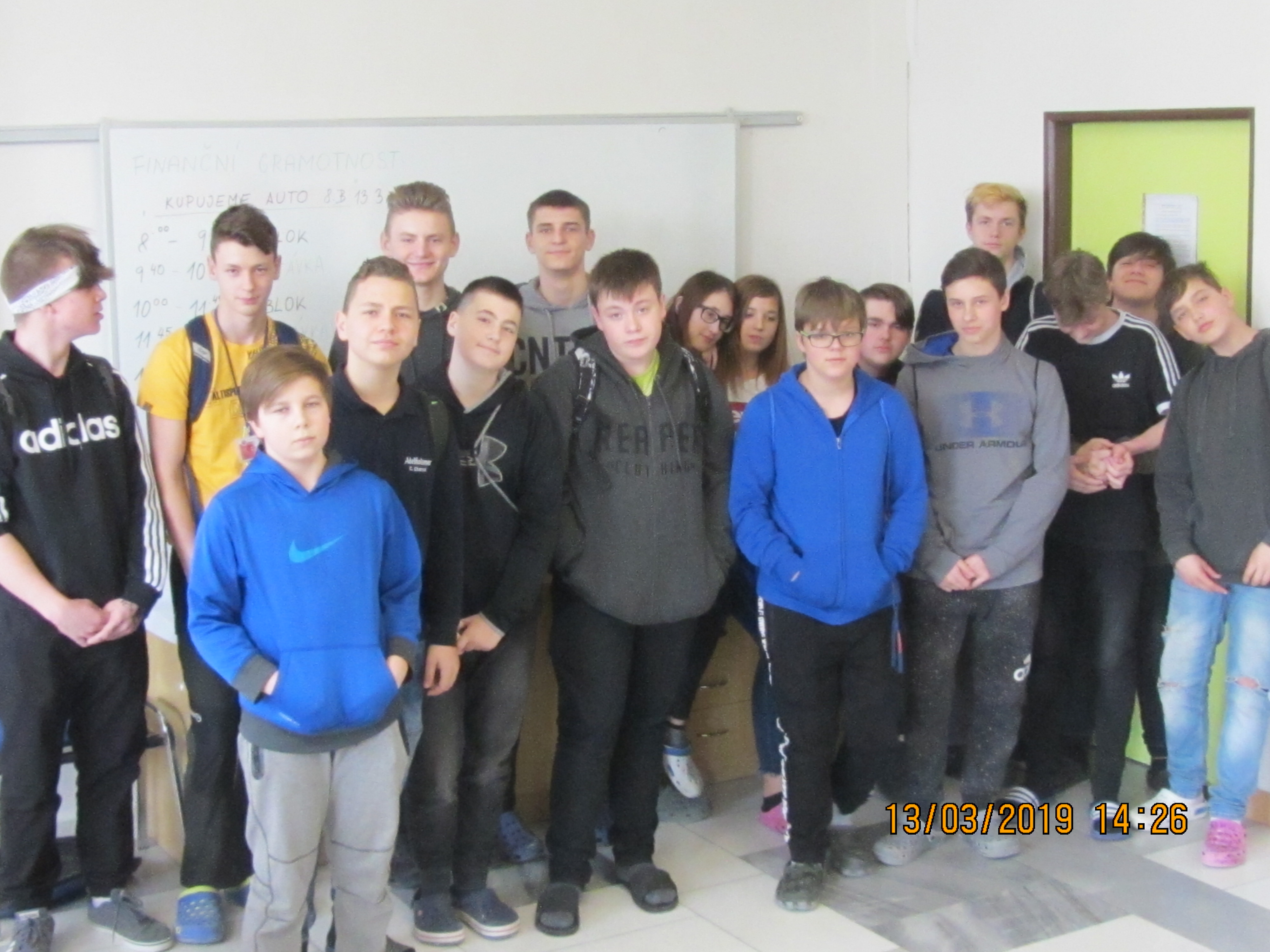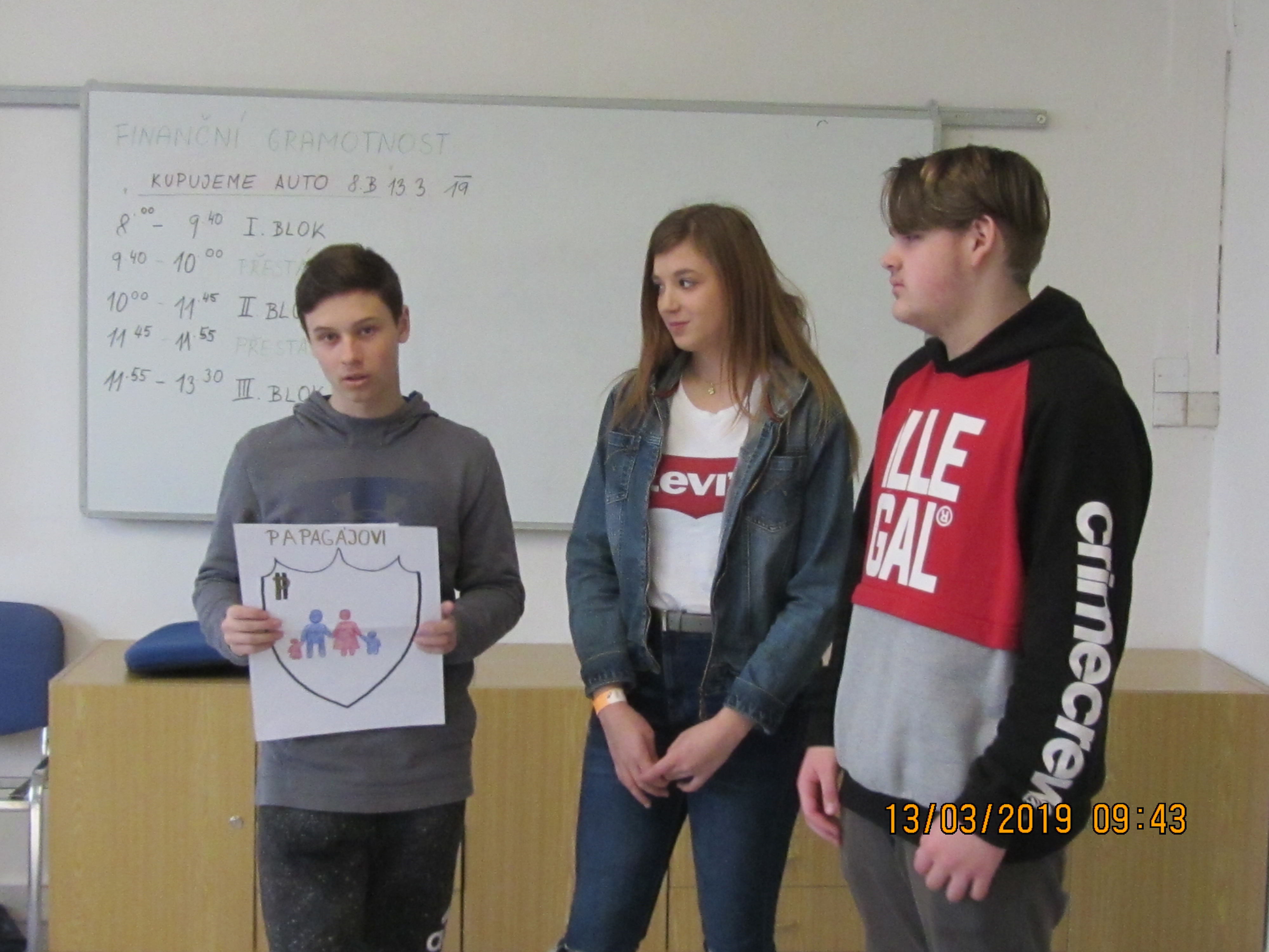 Ve třídě 8.B proběhly již dva projektové dny zaměřené na rozvoj finanční gramotnosti, první v prosinci 2018 na téma "Hospodaření domácnosti" a druhý v březnu 2019 na téma "Kupujeme auto". Během prvního projektového dne si žáci vytvořili modelové domácnosti, kde každý zastává nějakou roli, vymysleli si názvy a erb - vznikli Papagájovi, Štístkovi, Bohatí, Krejzovy a Komárkovi. Charakteristiky jednotlivých domácností byly předem namodelovány. Některá domácnost je sociálně slabší, jiná průměrná nebo bohatá. Zamýšleli jsme se nad tím, co patří do příjmů a výdajů domácnosti a jednotlivé domácnosti si vytvořily své rozpočty. Cílem bylo, aby byly příjmy vyšší než výdaje. Během druhého projektového dne každá domácnost kupovala auto. Před tím jsme se zamýšleli, jaká kritéria rozhodují při výběru nového automobilu, co patří do povinné, standardní a nadstandardní výbavy automobilu a především, jaké platby souvisí s provozem automobilu. Jednotlivé domácnosti kreslily své "auto snů". Poté jsme do domácností rozdali příběhy rodin, které kupovaly auto. Jednotlivé domácnosti pak prezentovaly ostatním jednotlivé příběhy a zamýšlely se nad tím, jestli rodiny postupovaly správně a jaké finanční služby a prostředky na to použily. Na závěr si každá domácnost koupila auto a zaznamenala náklady na jeho provoz do rozpočtu. Během těchto projektových dnů se děti seznámily s mnoha novými pojmy jako leasing, povinné ručení, havarijní pojištění, kreditní a debetní karta aj. Oba dny nás provázely aktivity na uvolnění jako koberečky, kolečko a švihadla, ubrus, osmisměrka. Doufáme, že si děti odnesly mnoho poučných informací a těšíme se na další projektový den.
