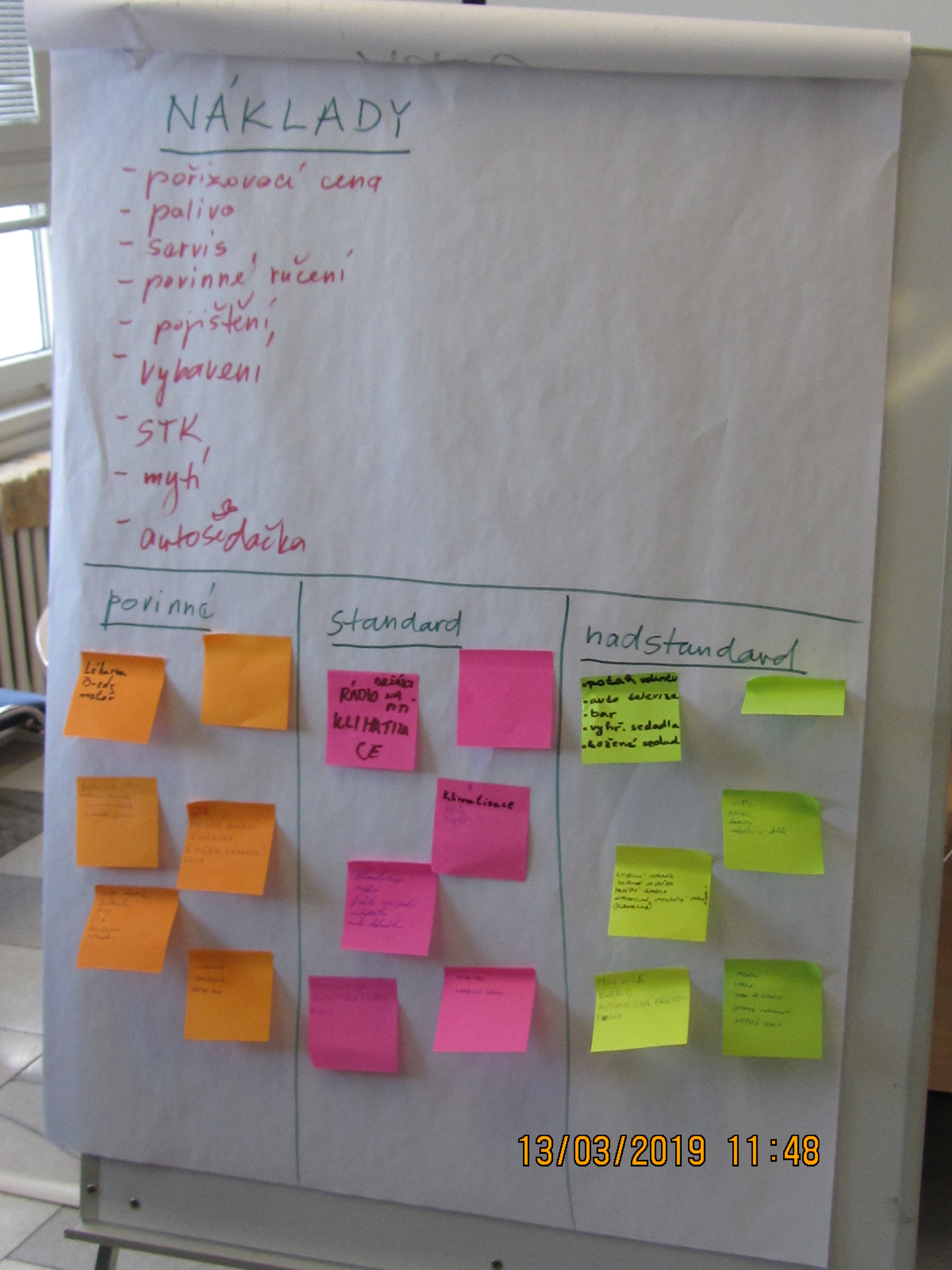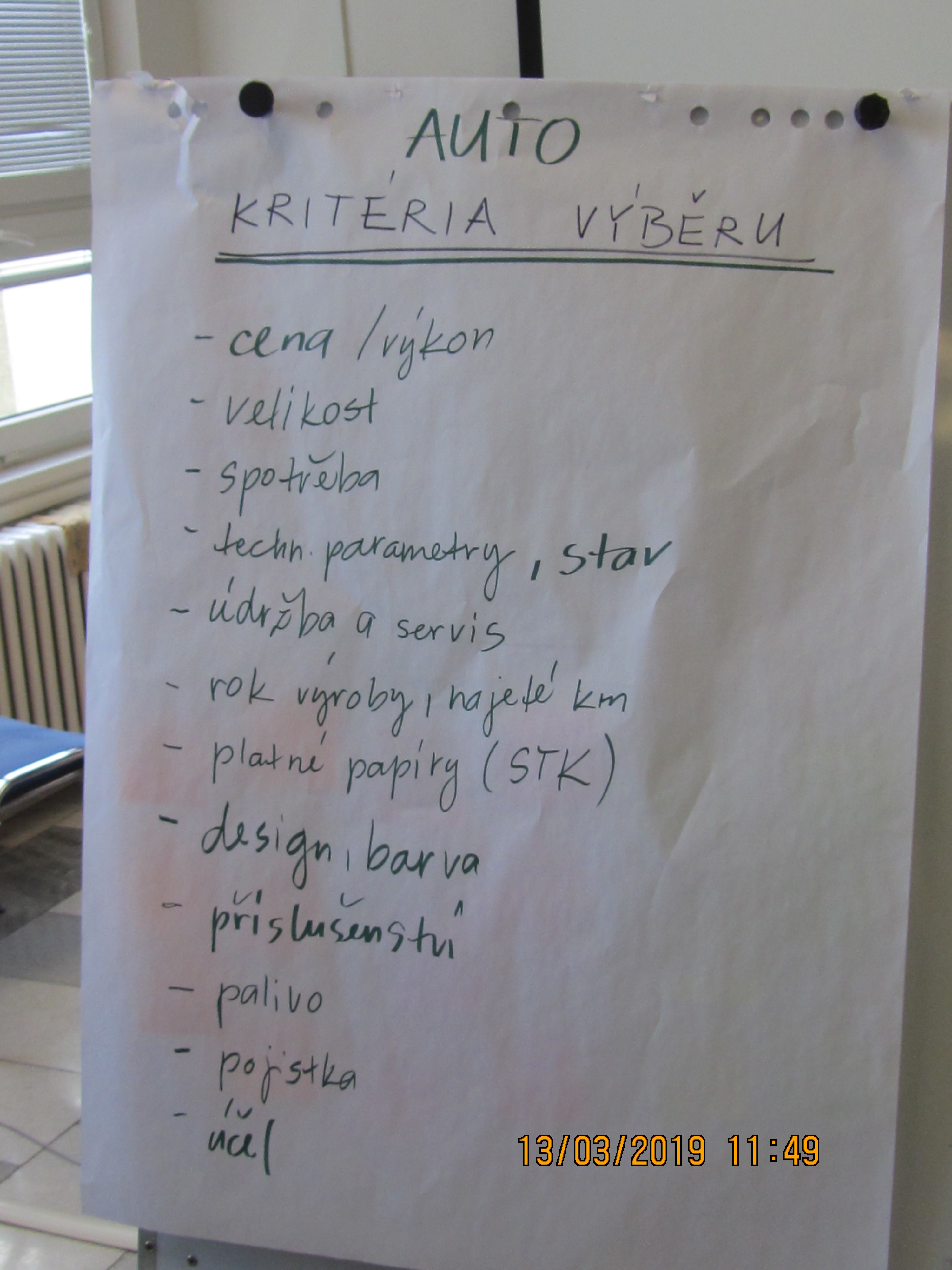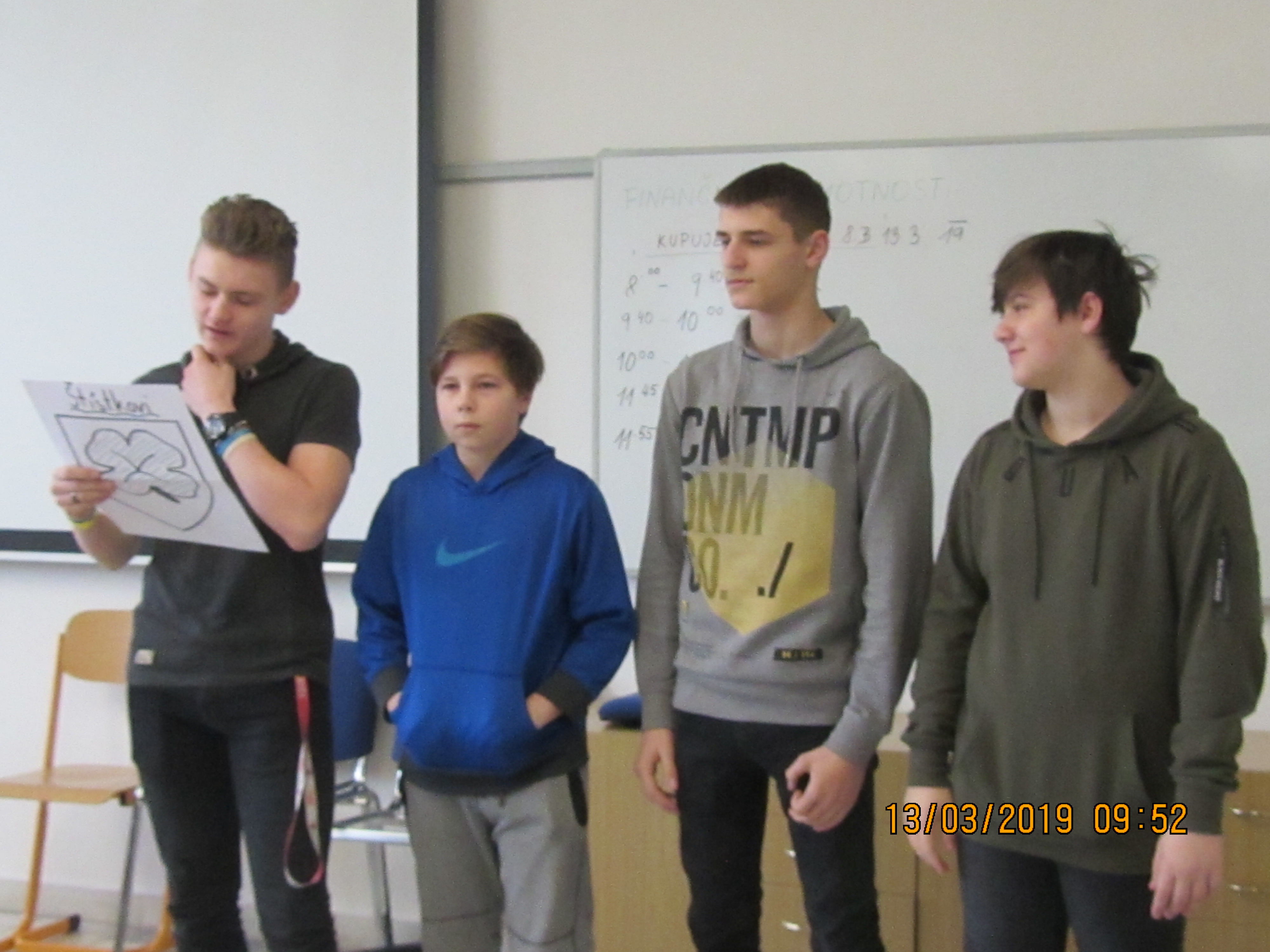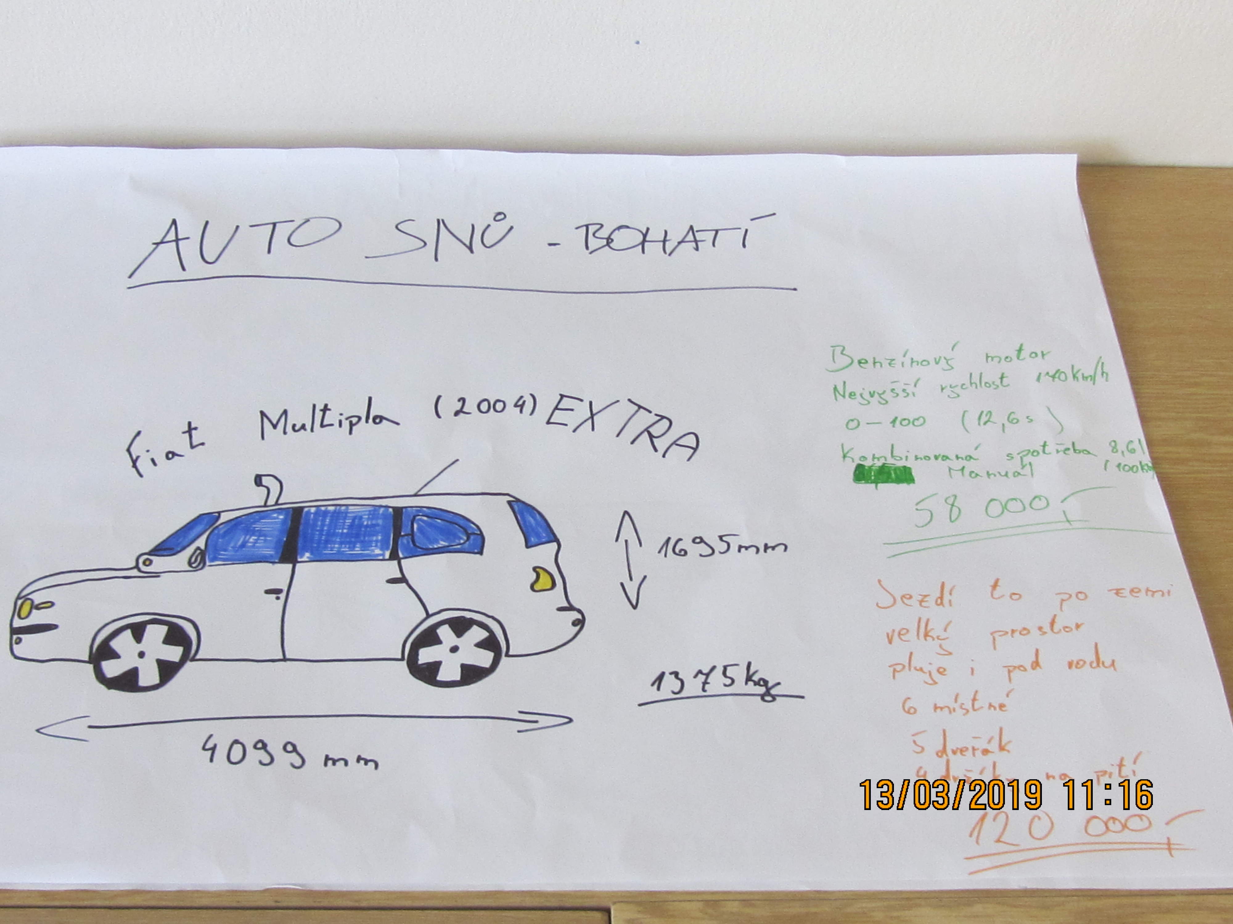 Ve třídě 8.B proběhly již dva projektové dny zaměřené na rozvoj finanční gramotnosti, první v prosinci 2018 na téma "Hospodaření domácnosti" a druhý v březnu 2019 na téma "Kupujeme auto". Během prvního projektového dne si žáci vytvořili modelové domácnosti, kde každý zastává nějakou roli, vymysleli si názvy a erb - vznikli Papagájovi, Štístkovi, Bohatí, Krejzovy a Komárkovi. Charakteristiky jednotlivých domácností byly předem namodelovány. Některá domácnost je sociálně slabší, jiná průměrná nebo bohatá. Zamýšleli jsme se nad tím, co patří do příjmů a výdajů domácnosti a jednotlivé domácnosti si vytvořily své rozpočty. Cílem bylo, aby byly příjmy vyšší než výdaje. Během druhého projektového dne každá domácnost kupovala auto. Před tím jsme se zamýšleli, jaká kritéria rozhodují při výběru nového automobilu, co patří do povinné, standardní a nadstandardní výbavy automobilu a především, jaké platby souvisí s provozem automobilu. Jednotlivé domácnosti kreslily své "auto snů". Poté jsme do domácností rozdali příběhy rodin, které kupovaly auto. Jednotlivé domácnosti pak prezentovaly ostatním jednotlivé příběhy a zamýšlely se nad tím, jestli rodiny postupovaly správně a jaké finanční služby a prostředky na to použily. Na závěr si každá domácnost koupila auto a zaznamenala náklady na jeho provoz do rozpočtu. Během těchto projektových dnů se děti seznámily s mnoha novými pojmy jako leasing, povinné ručení, havarijní pojištění, kreditní a debetní karta aj. Oba dny nás provázely aktivity na uvolnění jako koberečky, kolečko a švihadla, ubrus, osmisměrka. Doufáme, že si děti odnesly mnoho poučných informací a těšíme se na další projektový den.