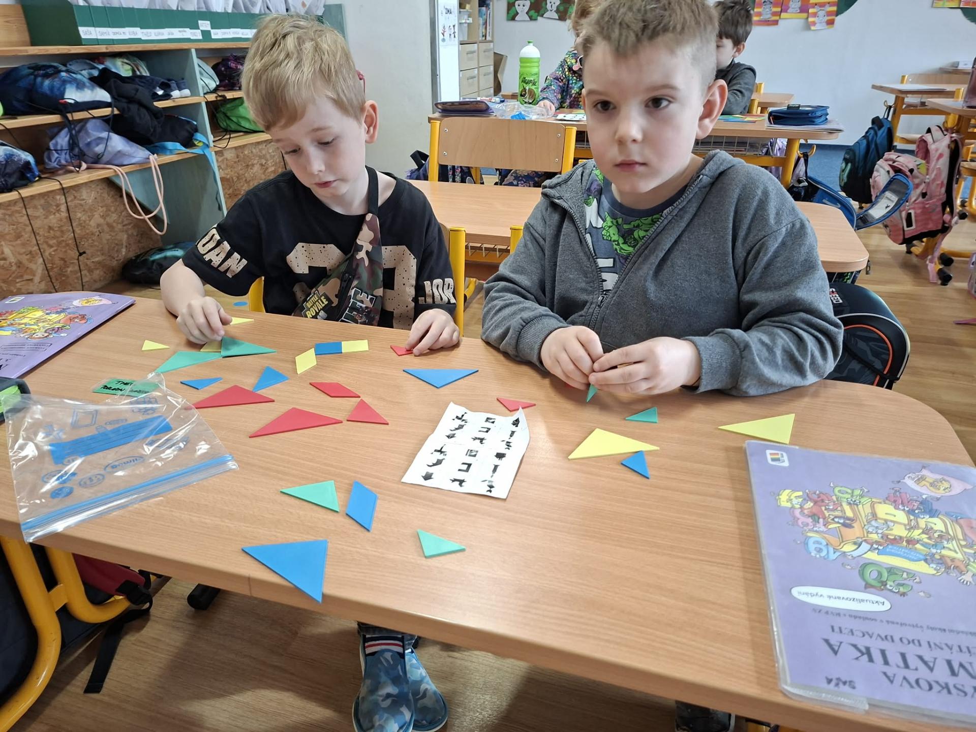 A matematika? Procvičili jsme si geometrické tvary pomocí tangramů. Tahle stará čínská skládačka nás pořádně potrápila i nadchla. Složit z trojúhelníků, čtverců a kosočtverců konkrétní obrazce vyžaduje nejen znalost tvarů, ale i pořádnou dávku prostorové představivosti a trpělivosti.