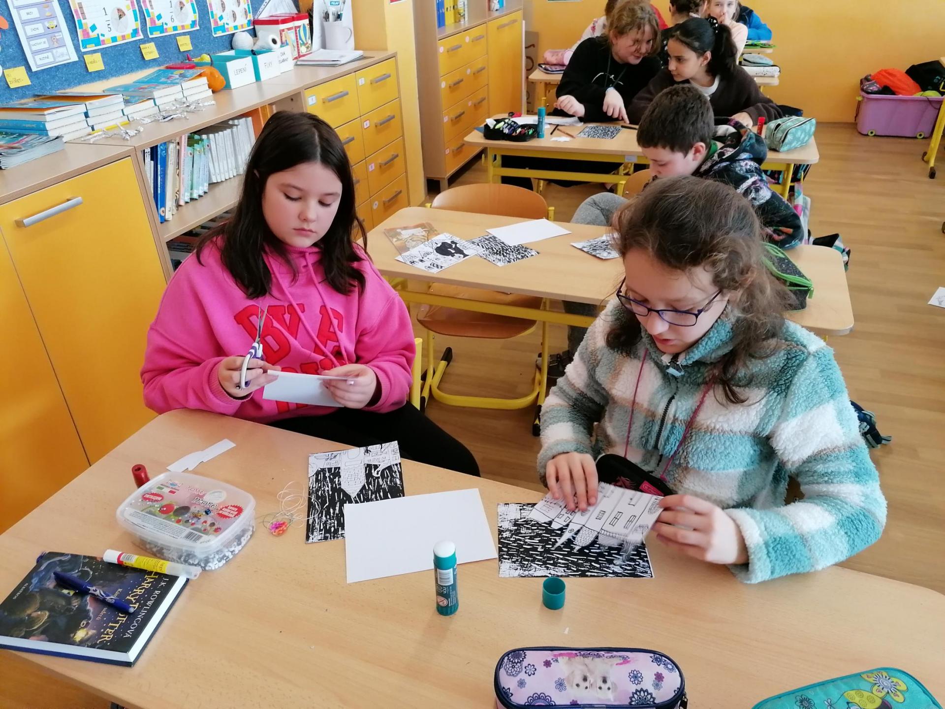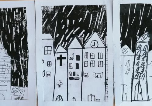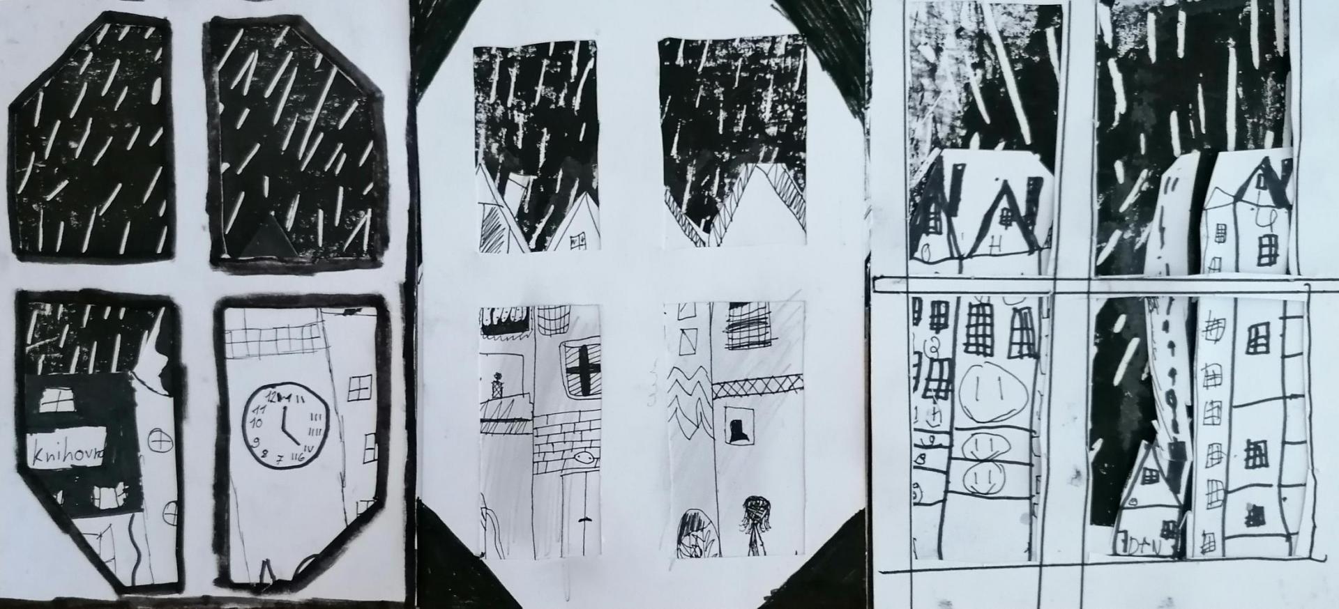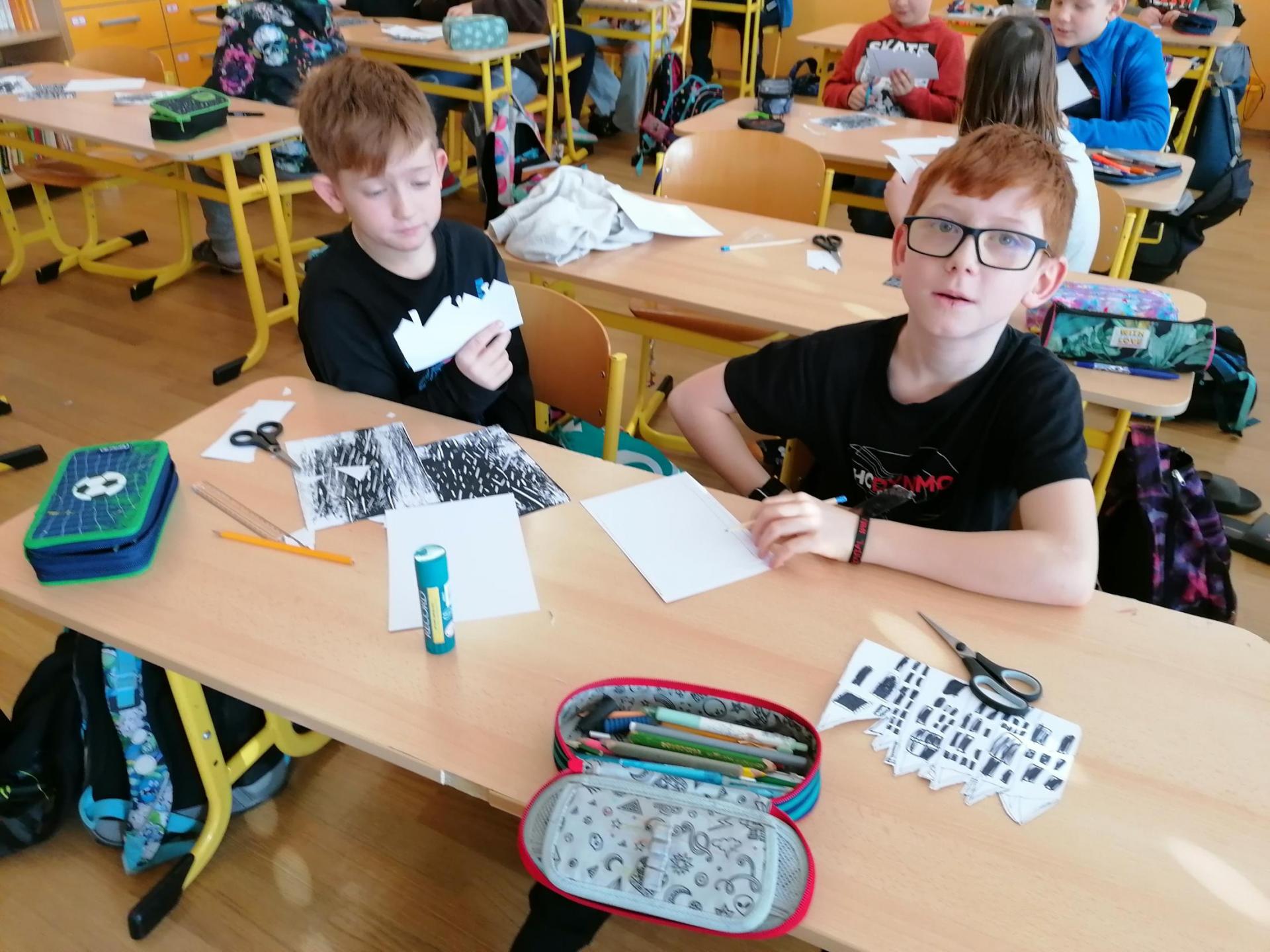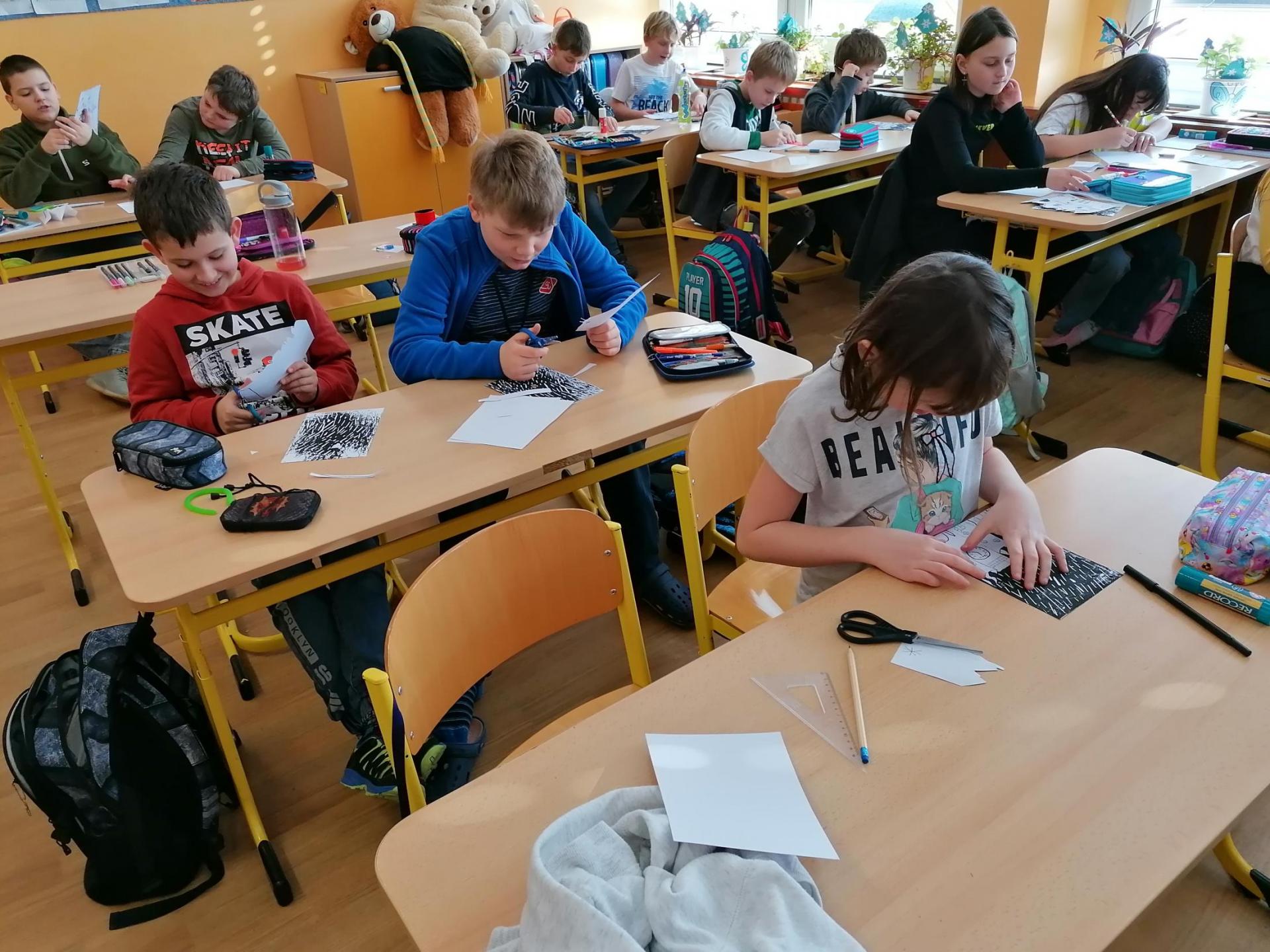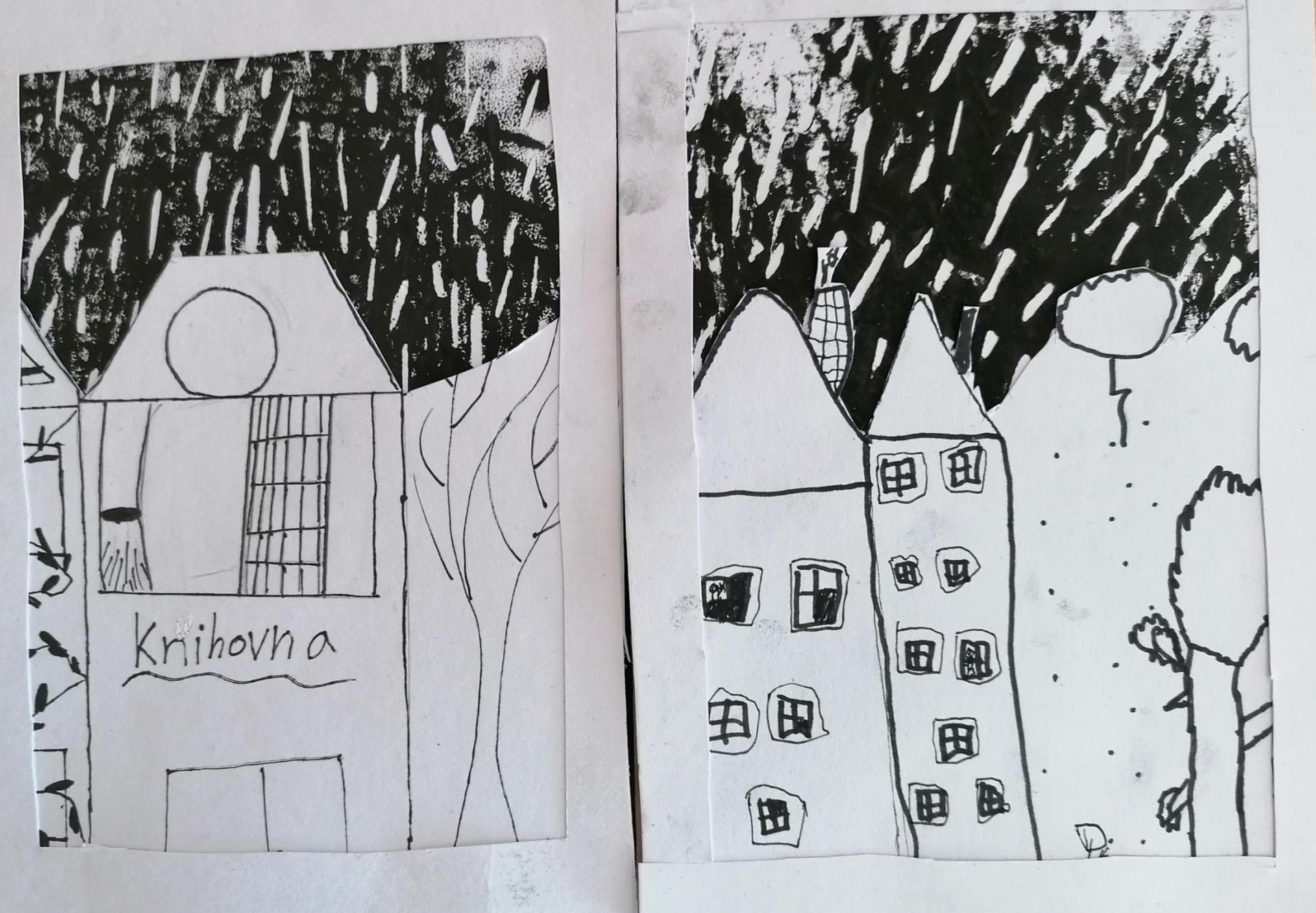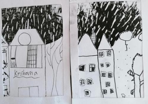 V Krajské knihovně v centru U Vokolků na Přihrádku jsme si zkusili linoryt. Ten byl základ našeho obrázku, který jsme ve škole dokončili.