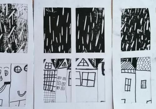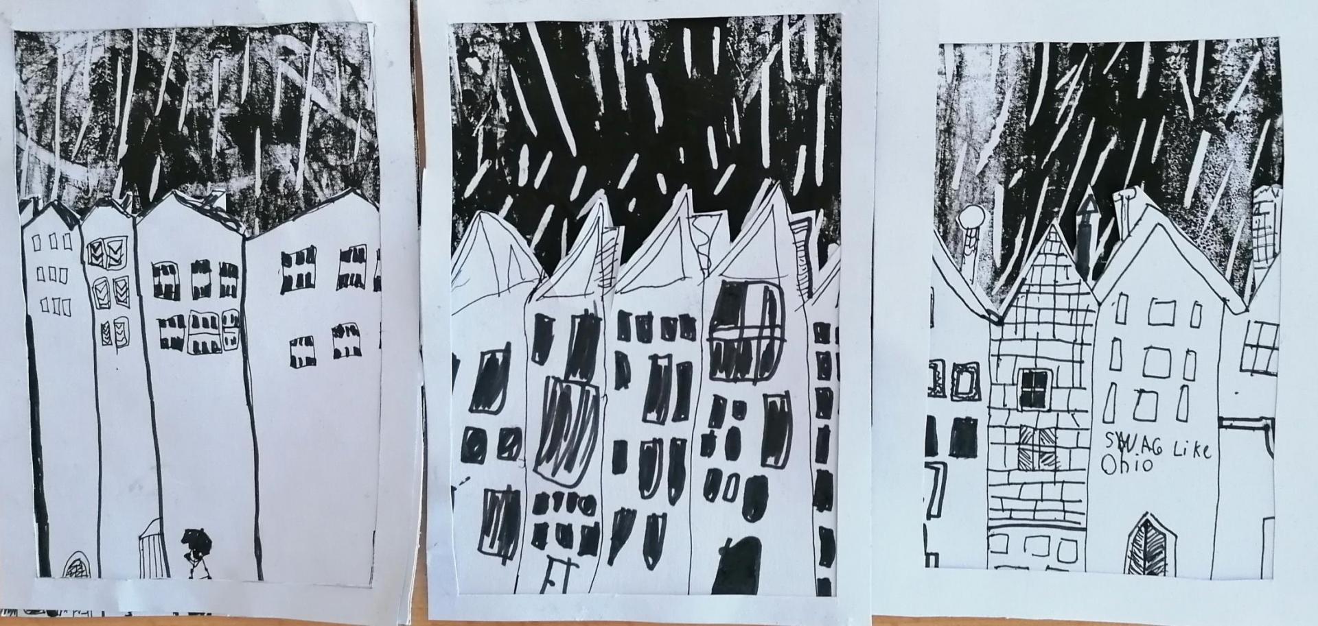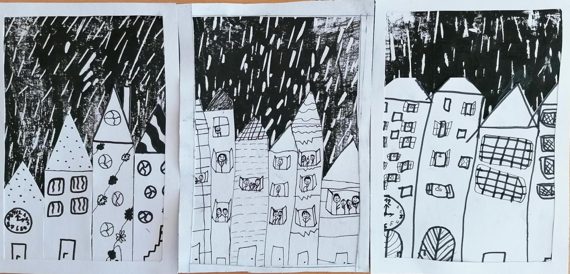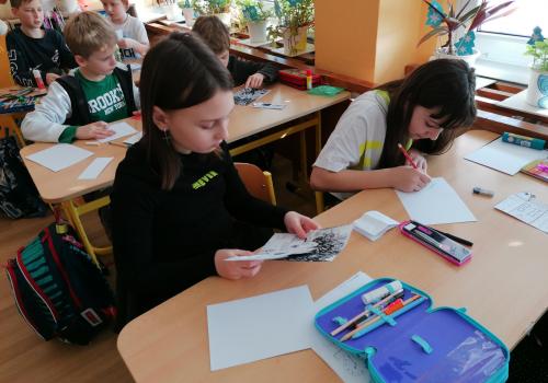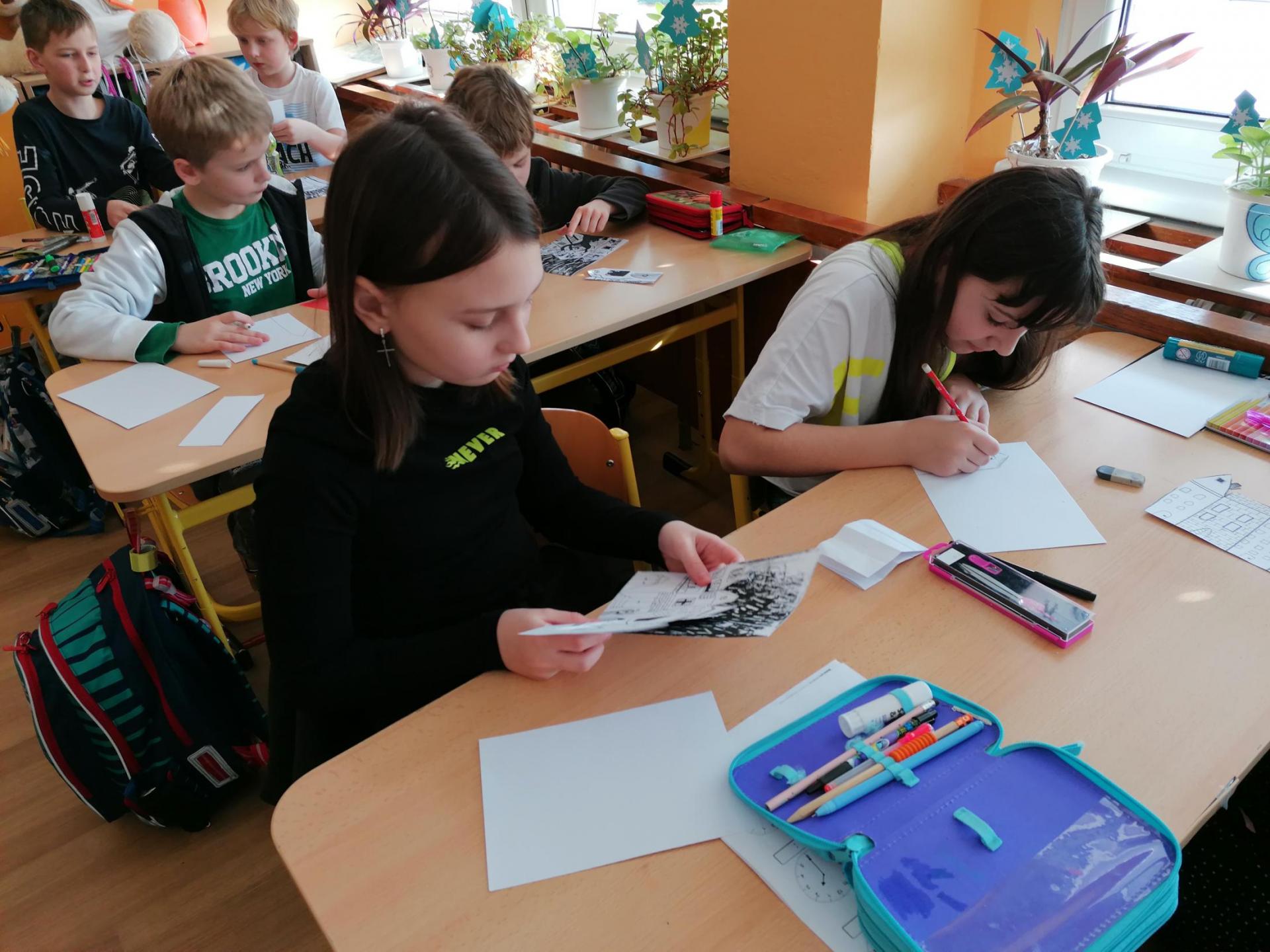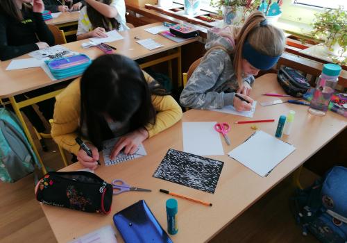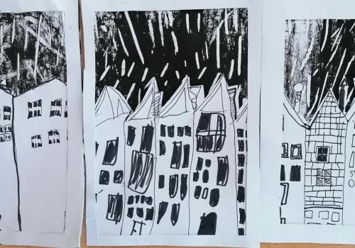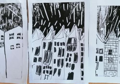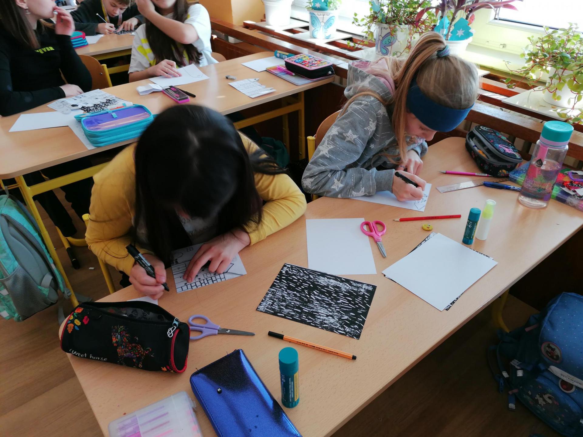 V Krajské knihovně v centru U Vokolků na Přihrádku jsme si zkusili linoryt. Ten byl základ našeho obrázku, který jsme ve škole dokončili.