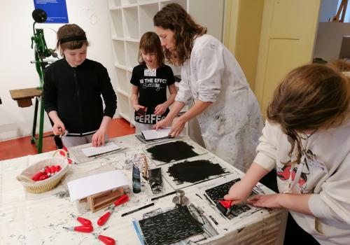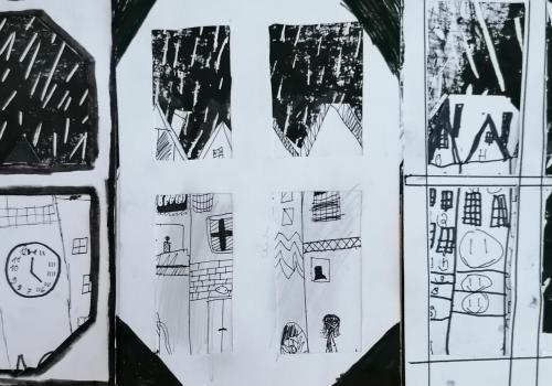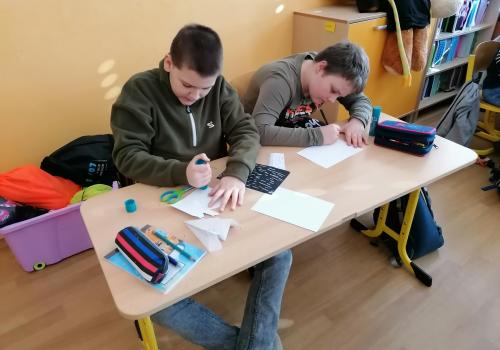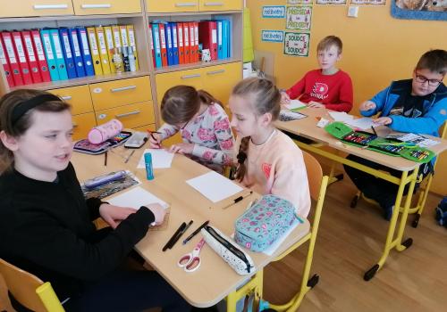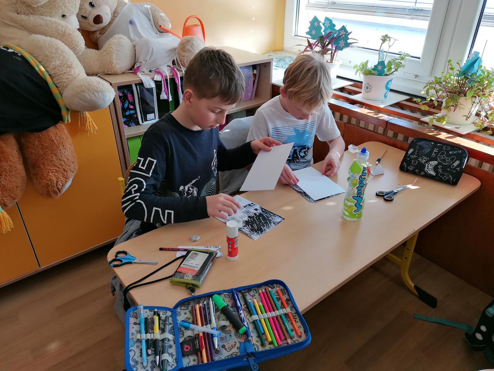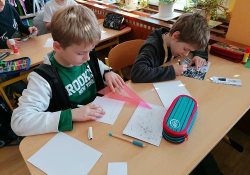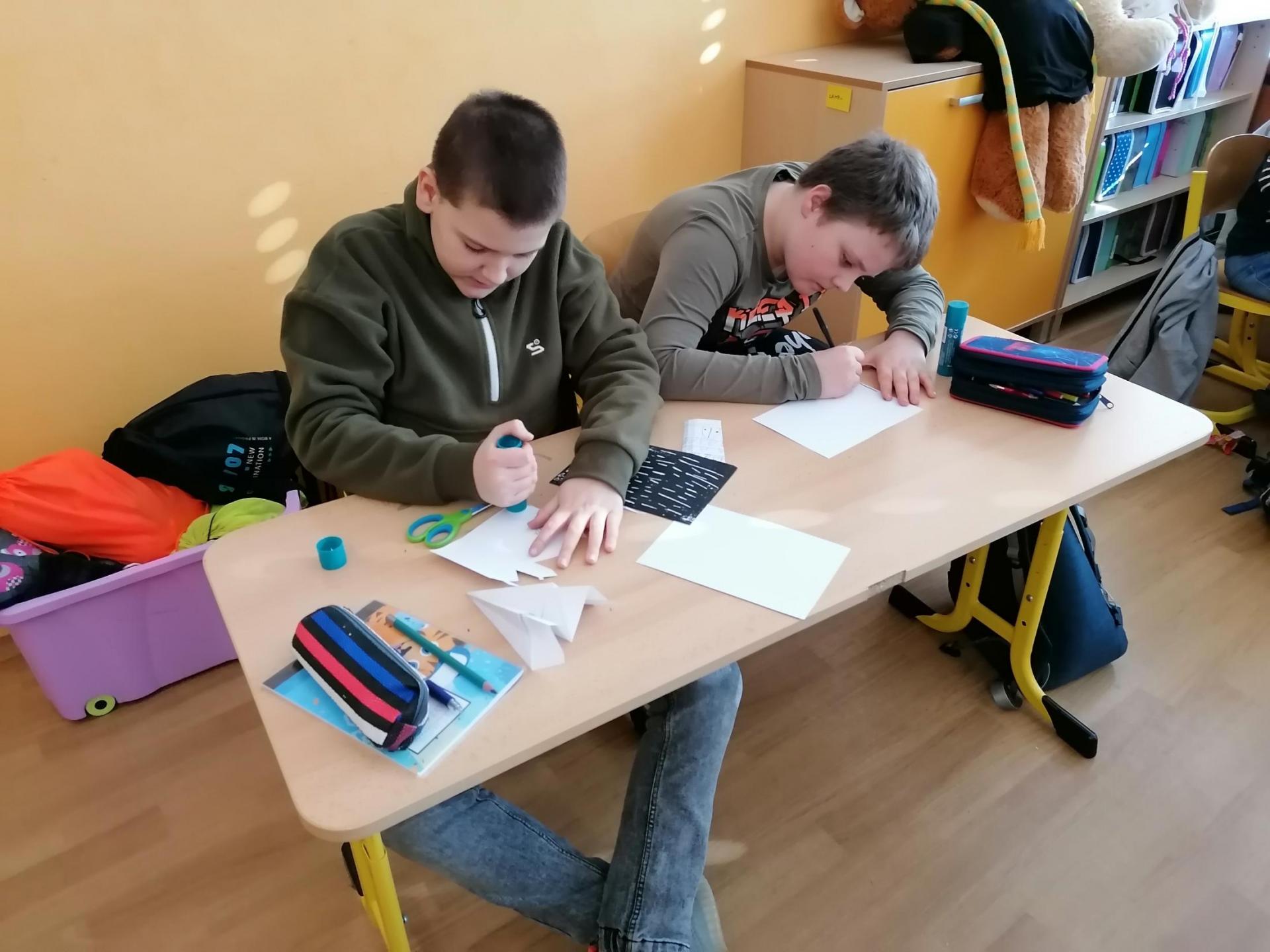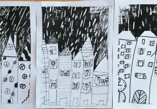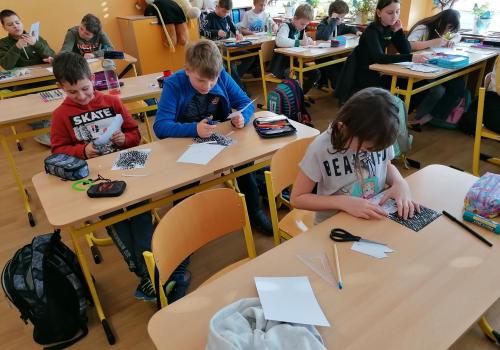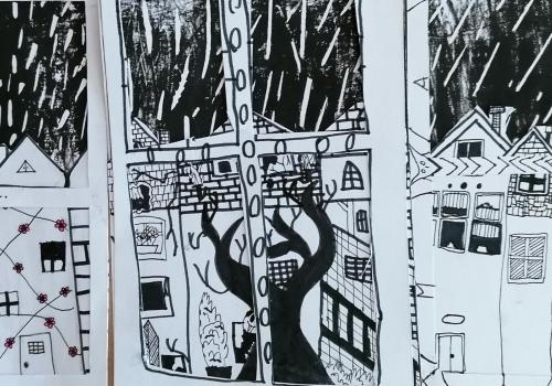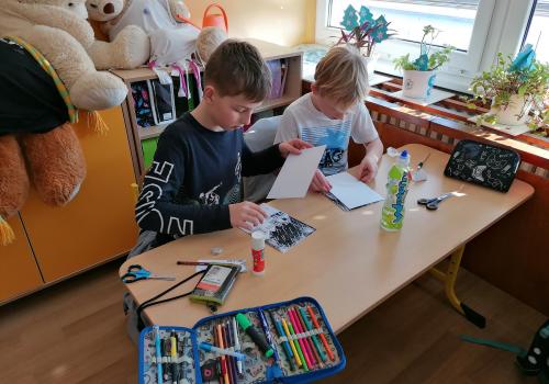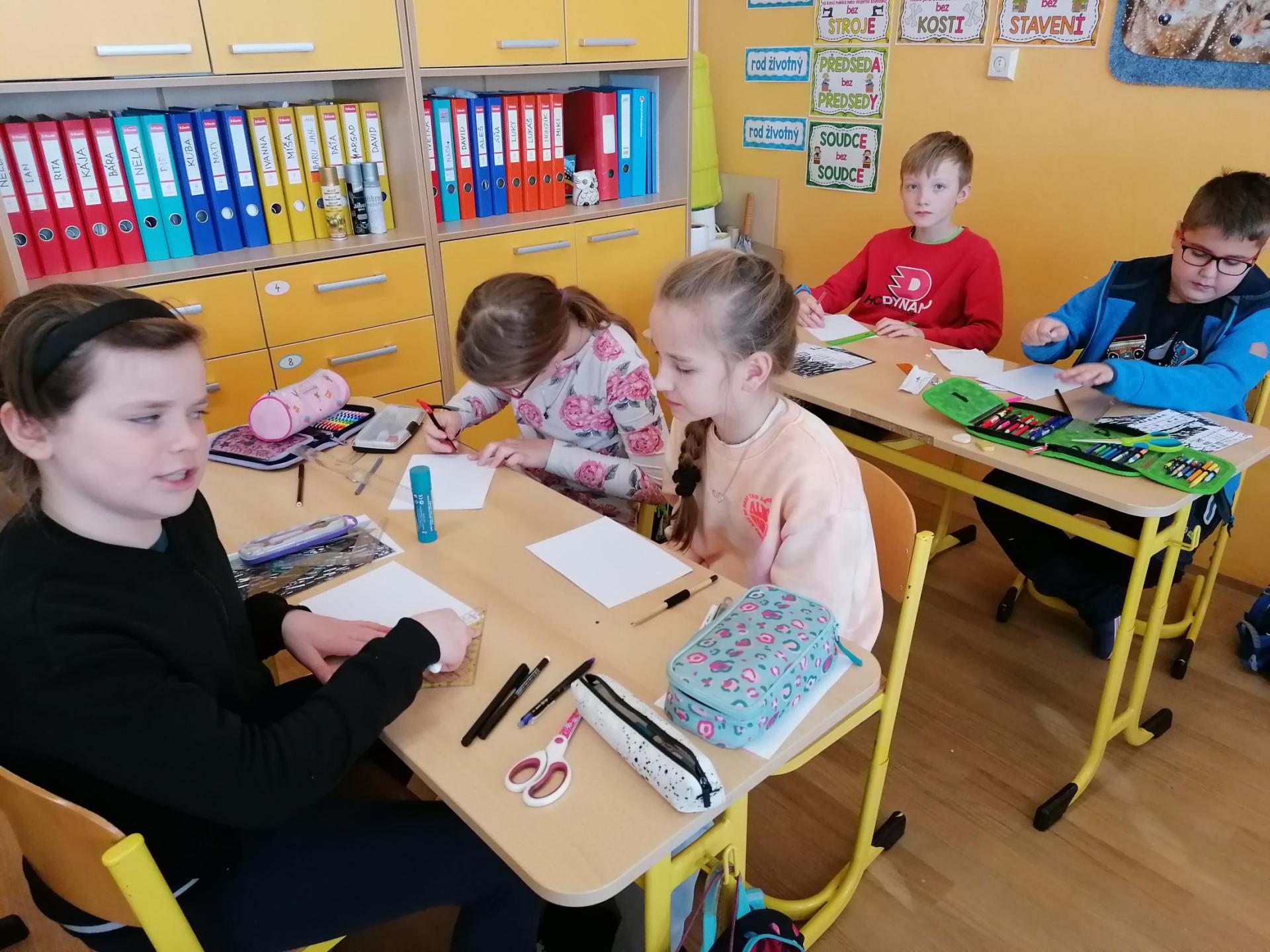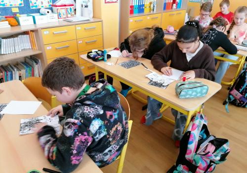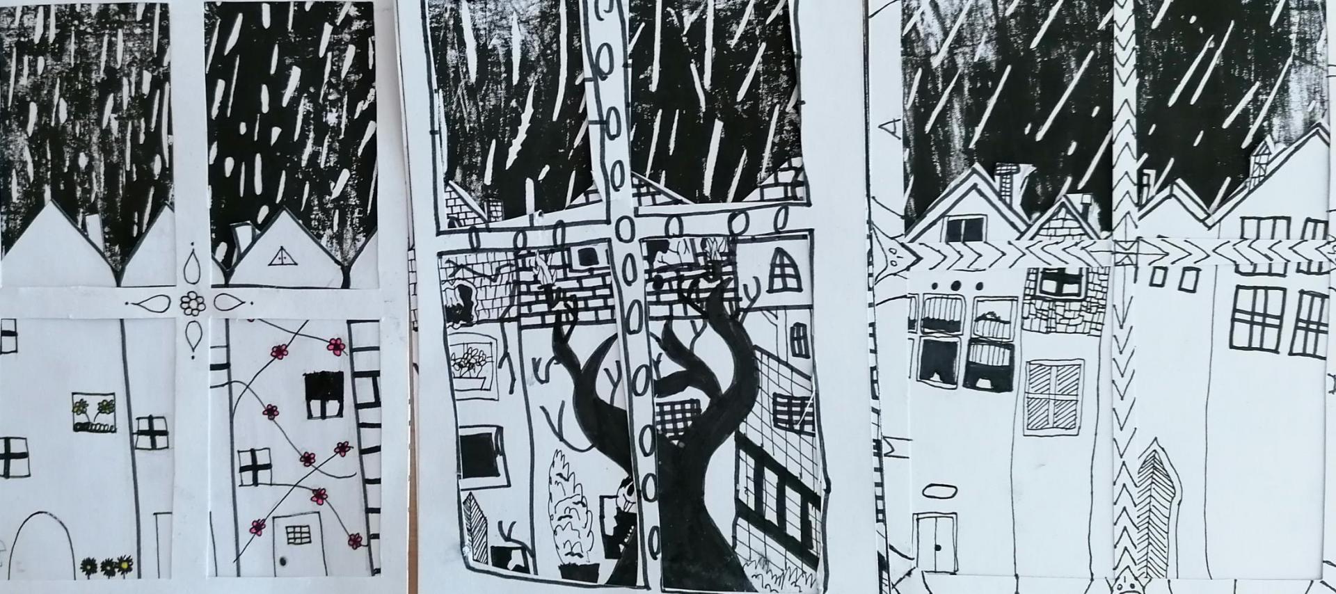 V Krajské knihovně v centru U Vokolků na Přihrádku jsme si zkusili linoryt. Ten byl základ našeho obrázku, který jsme ve škole dokončili.