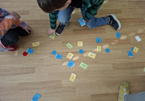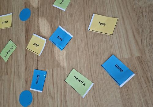 Po třídě byly rozmístěny kartičky se slovy, které byly rozděleny podle barevného kódu. Úkol dětí byl jasný: