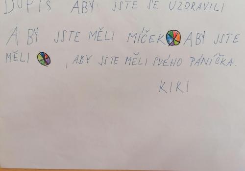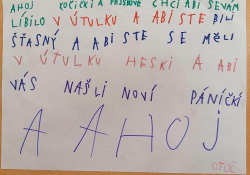 Poslali jsme do útulku pro kočičky a pejsky nějaké dobrůtky, hračky, deky i misku. Zvířátkům jsme napsali také dopisy.Myslíme na ně, aby se jim dařilo co nejlépe.