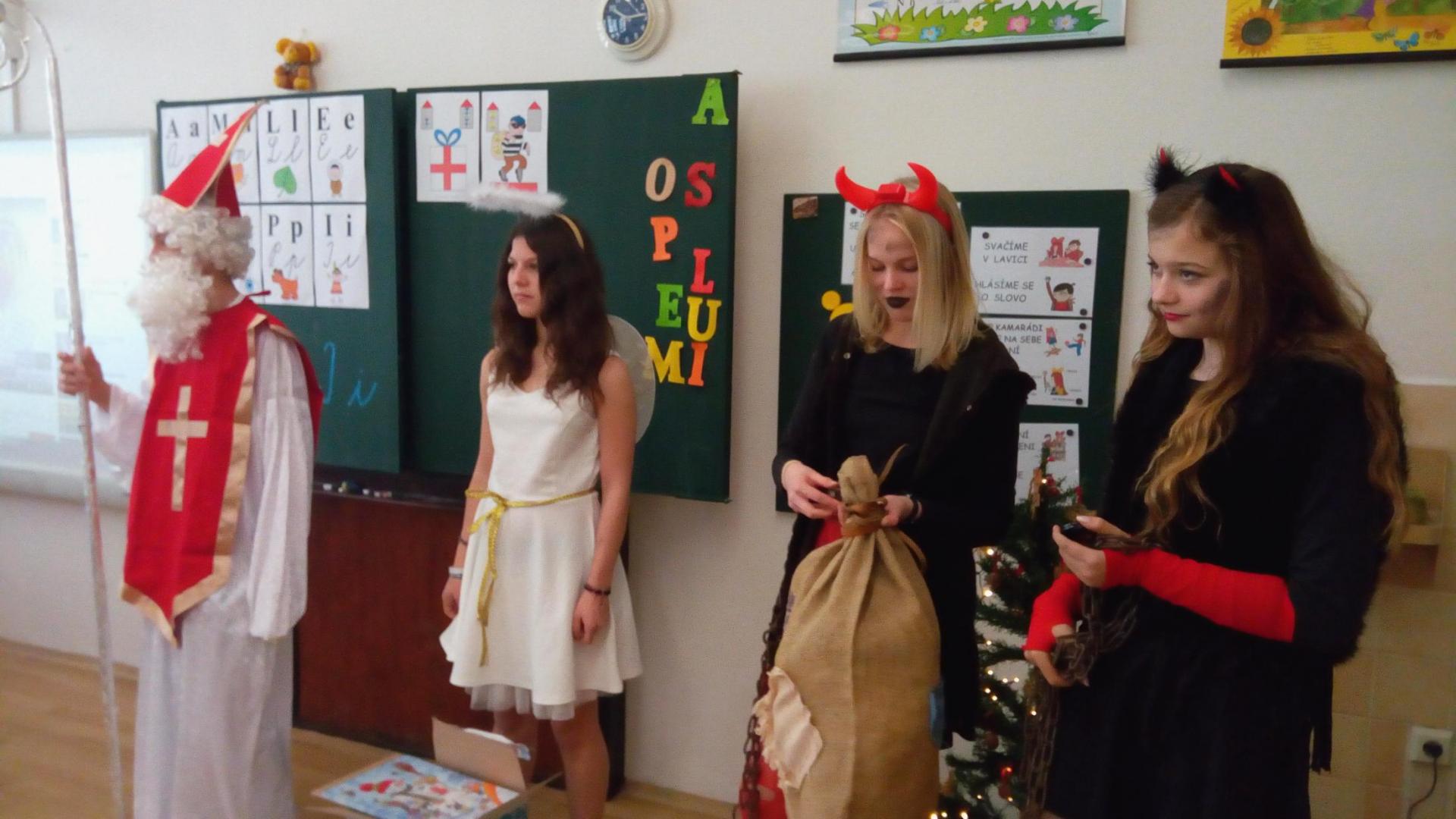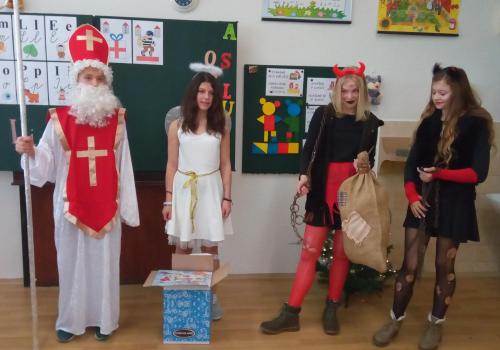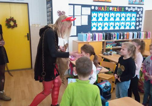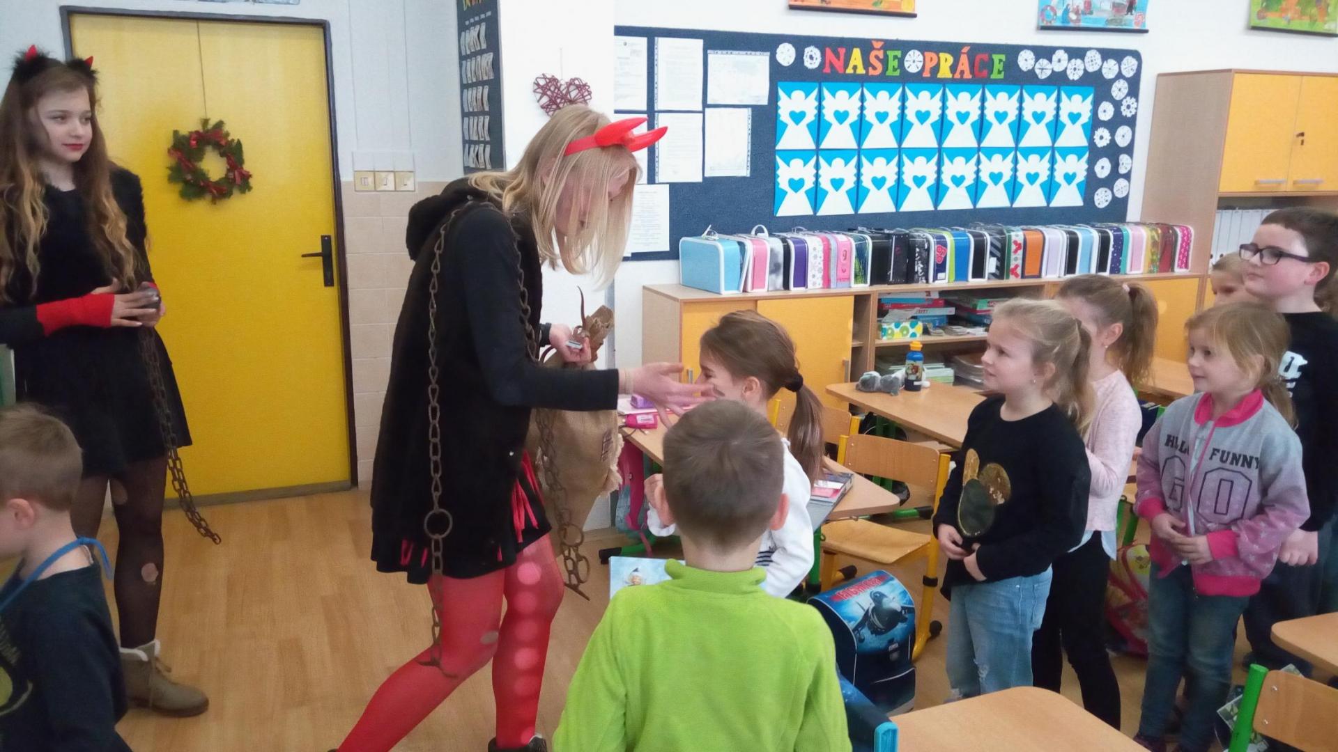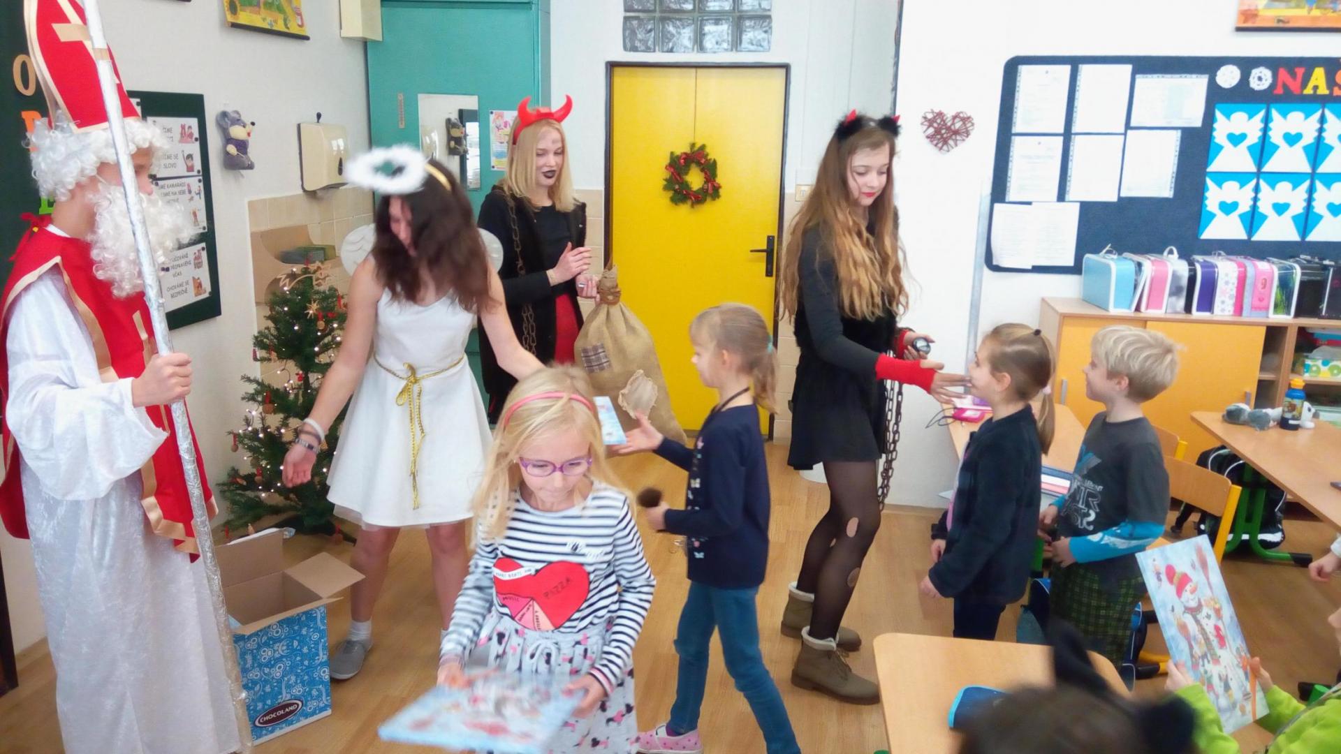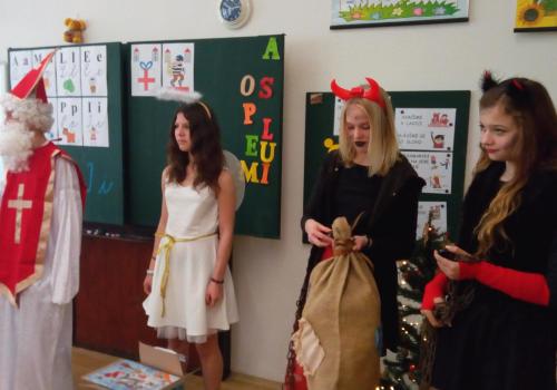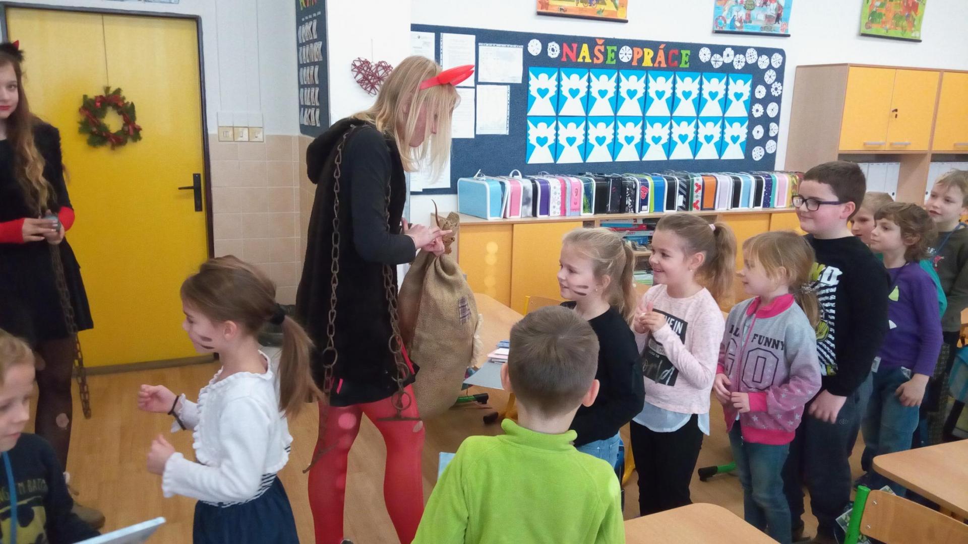 Zaklepání na dveře a už jsou tu! Mikuláš, andílek, čertíci. Byli moc hodní Děti řekly básničku a dostaly dobrůtku.