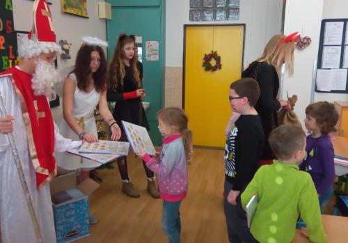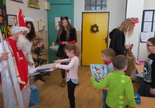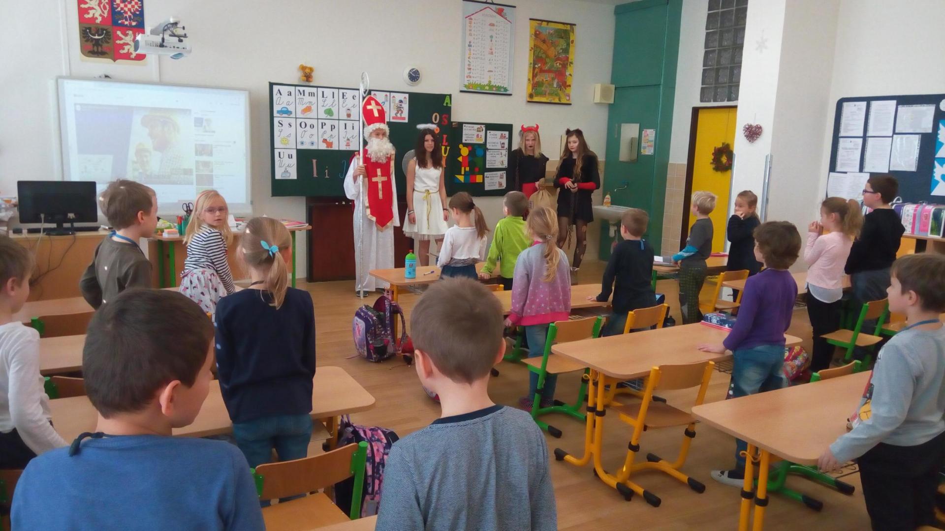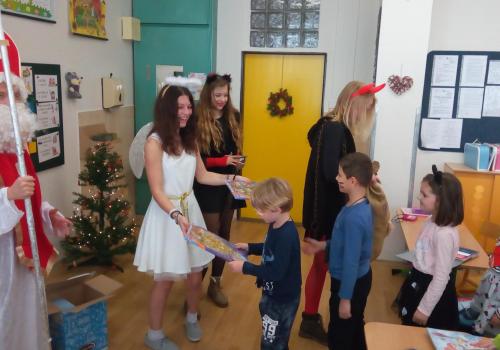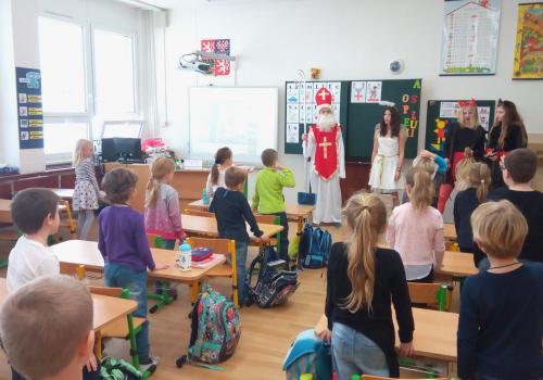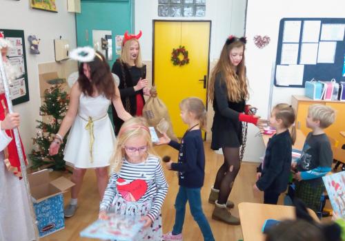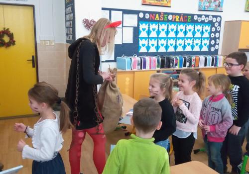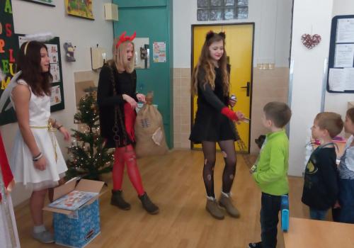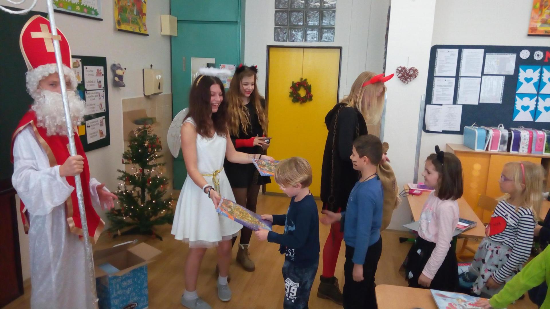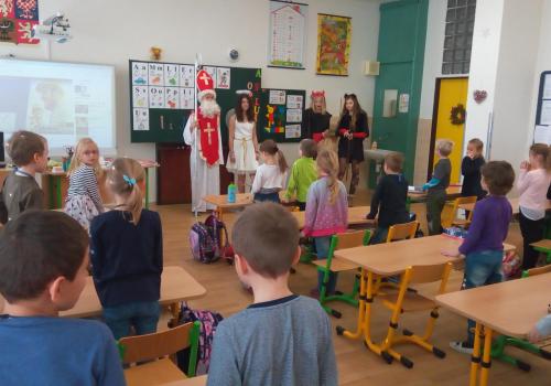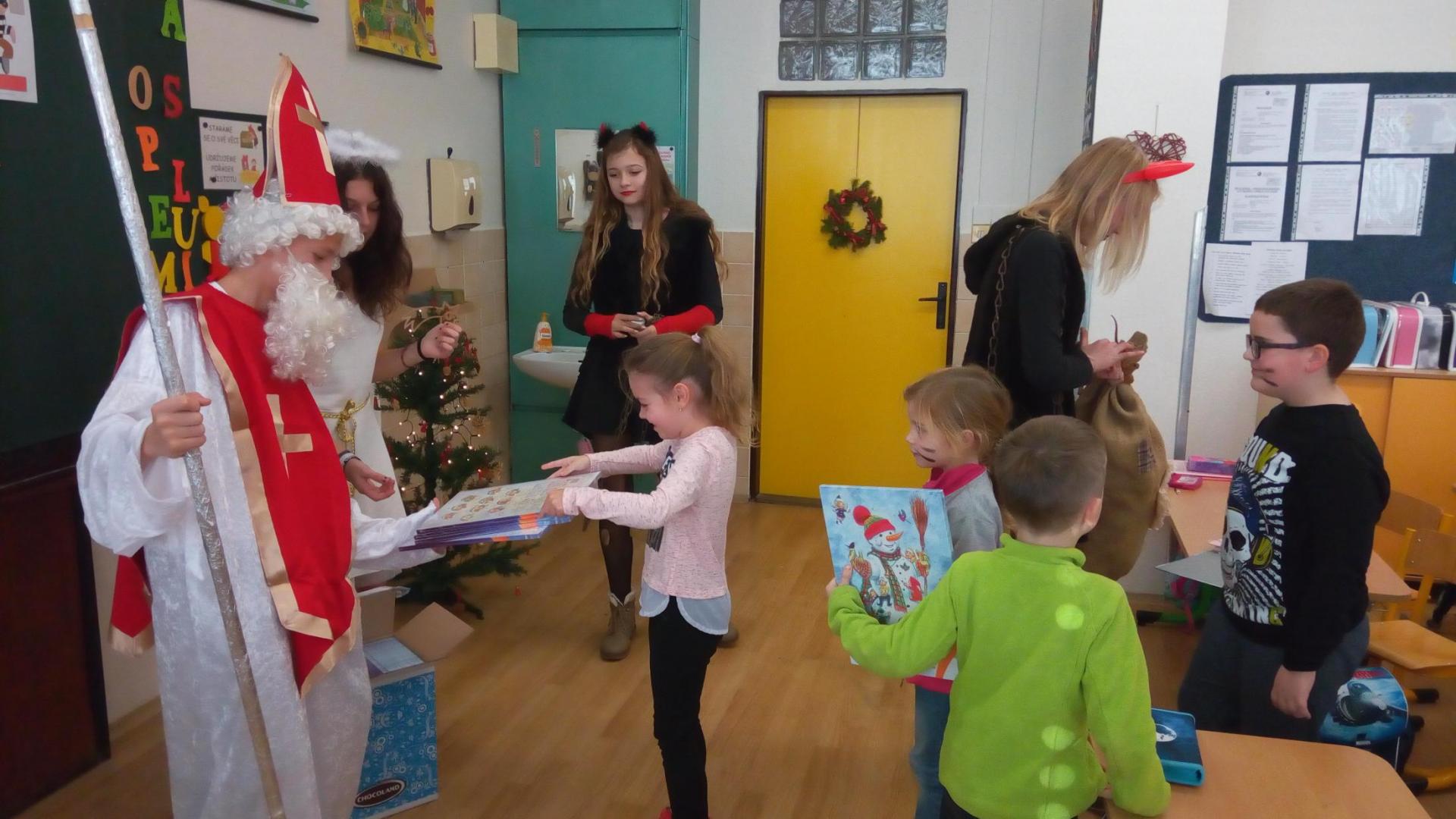 Zaklepání na dveře a už jsou tu! Mikuláš, andílek, čertíci. Byli moc hodní Děti řekly básničku a dostaly dobrůtku.