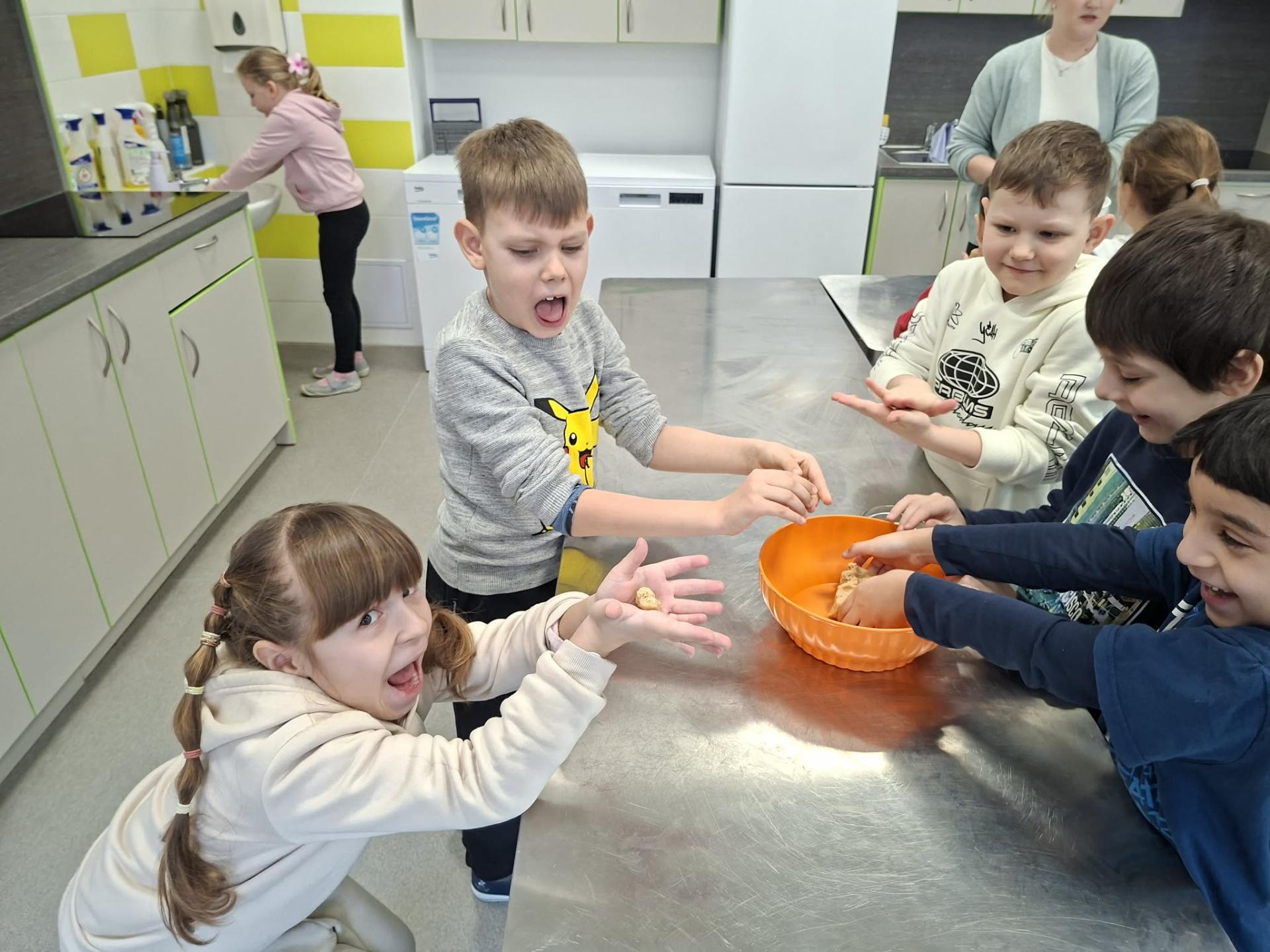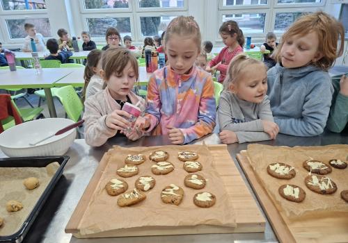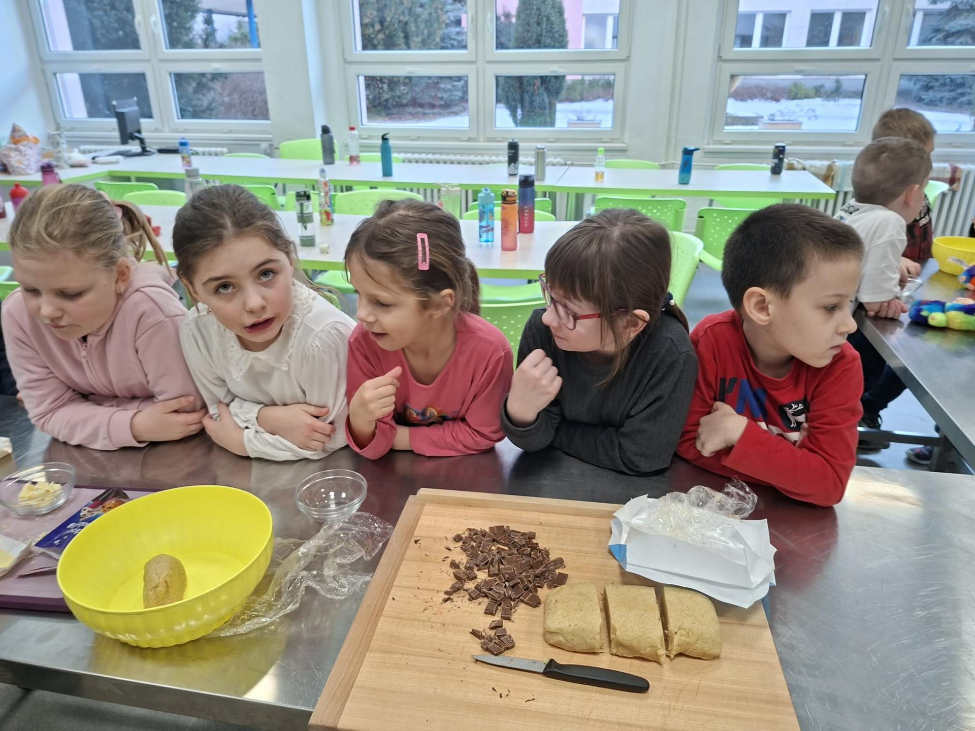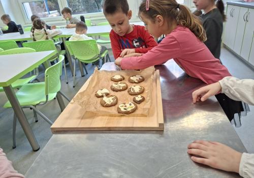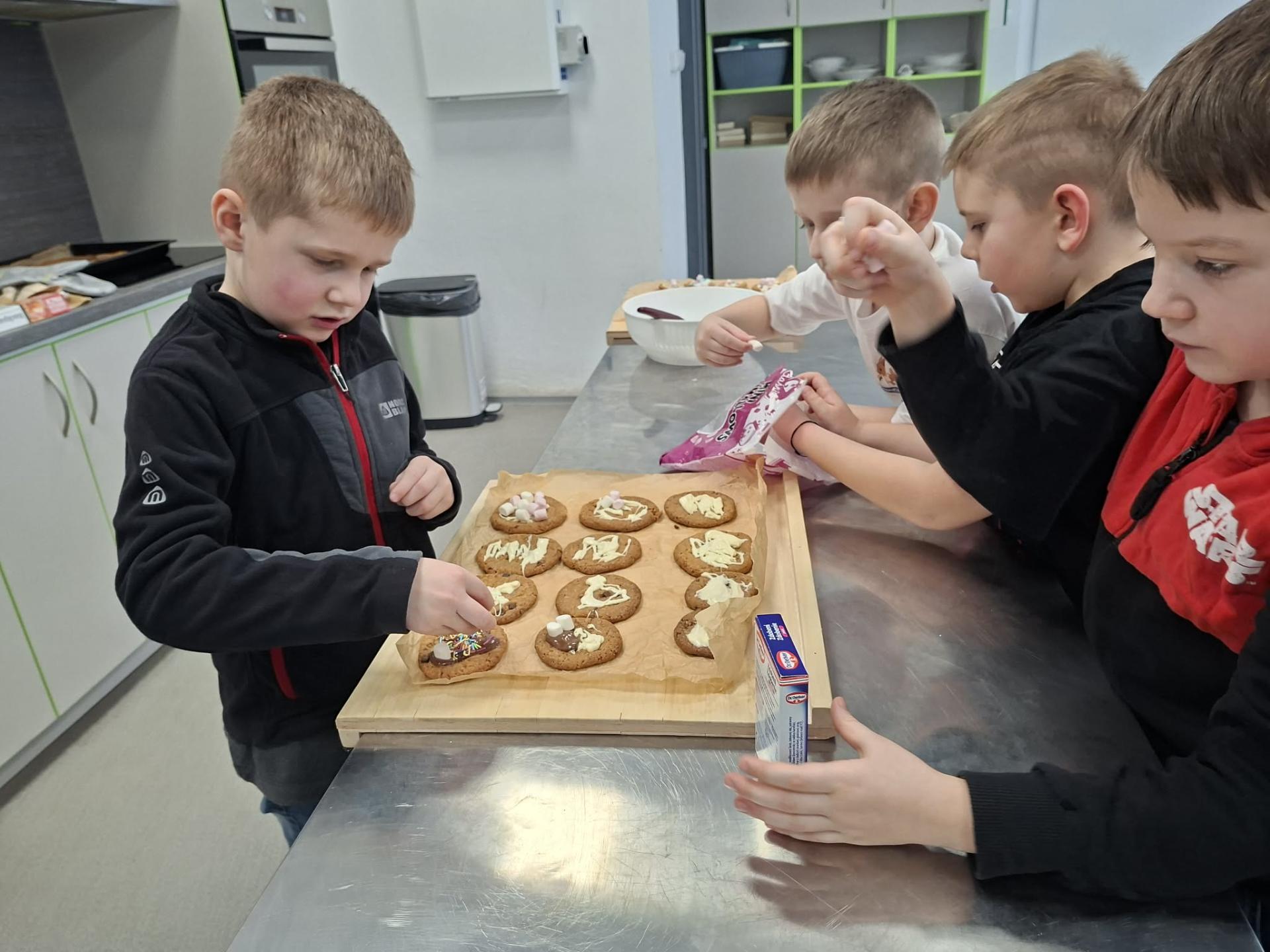 Dnes jsme s dětmi zavítali do školní kuchyňky, kde jsme si společně upekli lahodné cookies. Děti dostaly připravené těsto, do kterého si mohly přidat ingredience podle chuti – na výběr byla bílá a mléčná čokoláda nebo oříšky. Z těsta jsme tvořili kuličky, které jsme pokládali na plech, a pak už jsme netrpělivě čekali, jak budou sušenky po upečení vypadat.