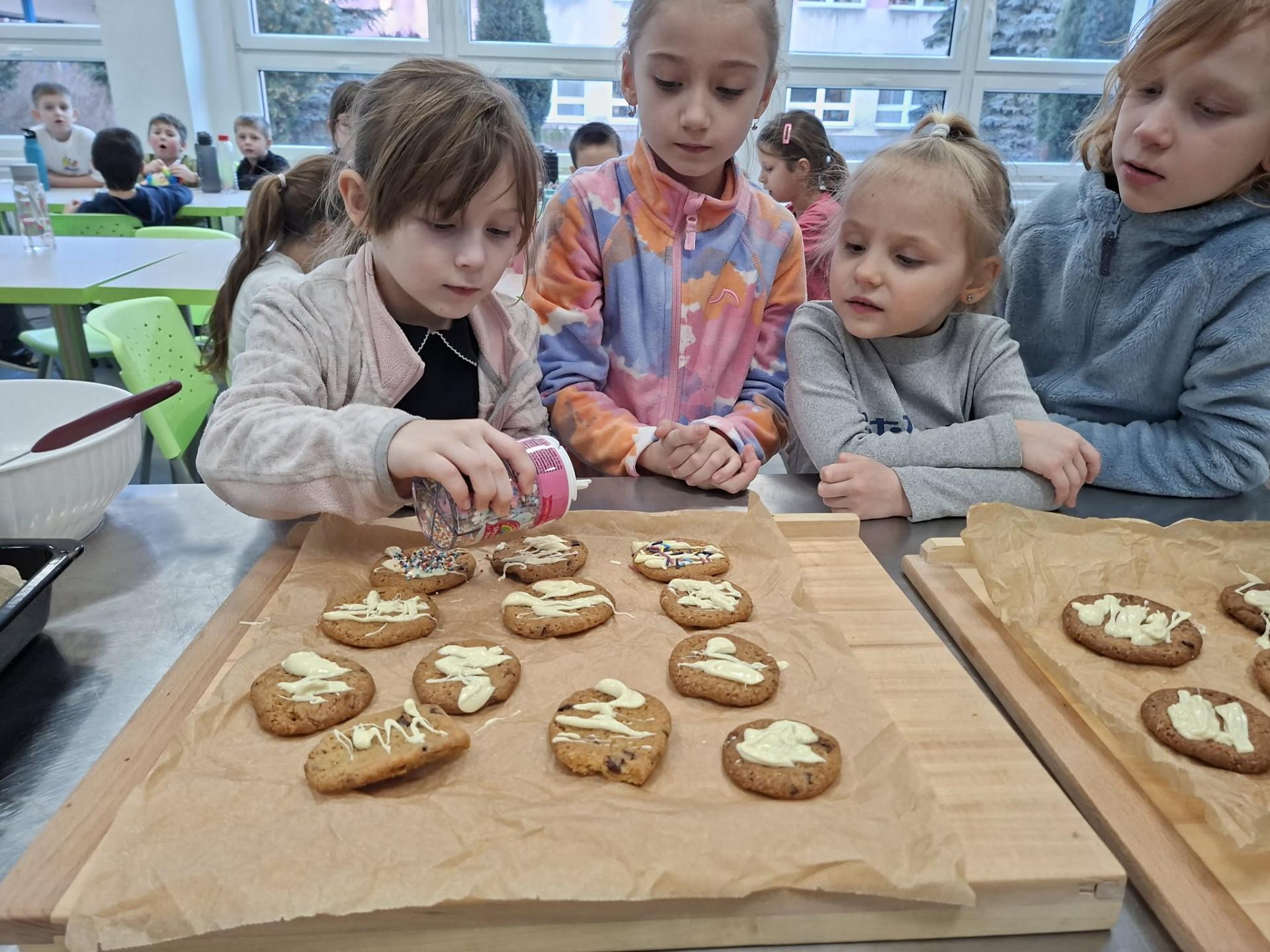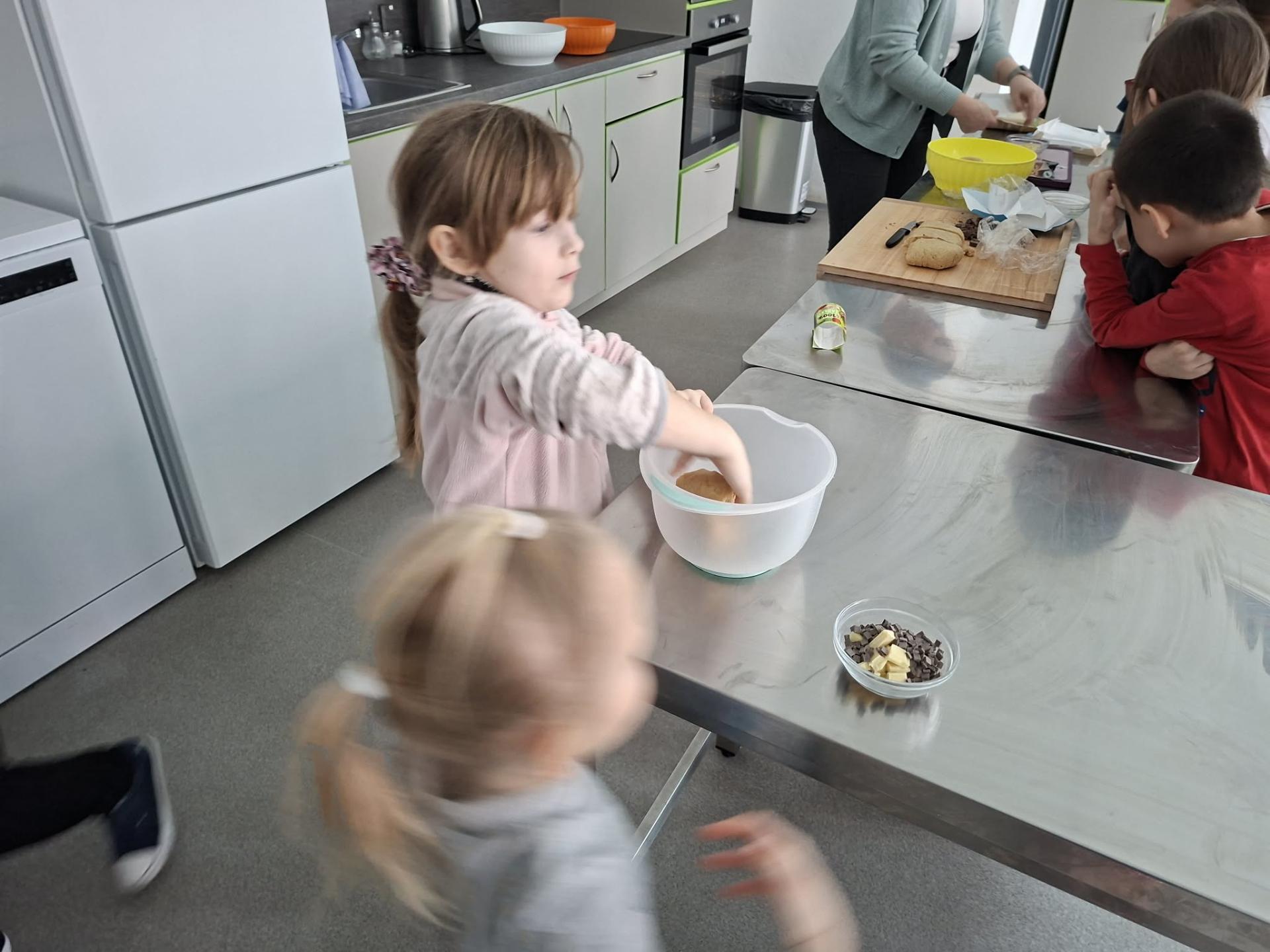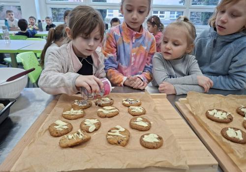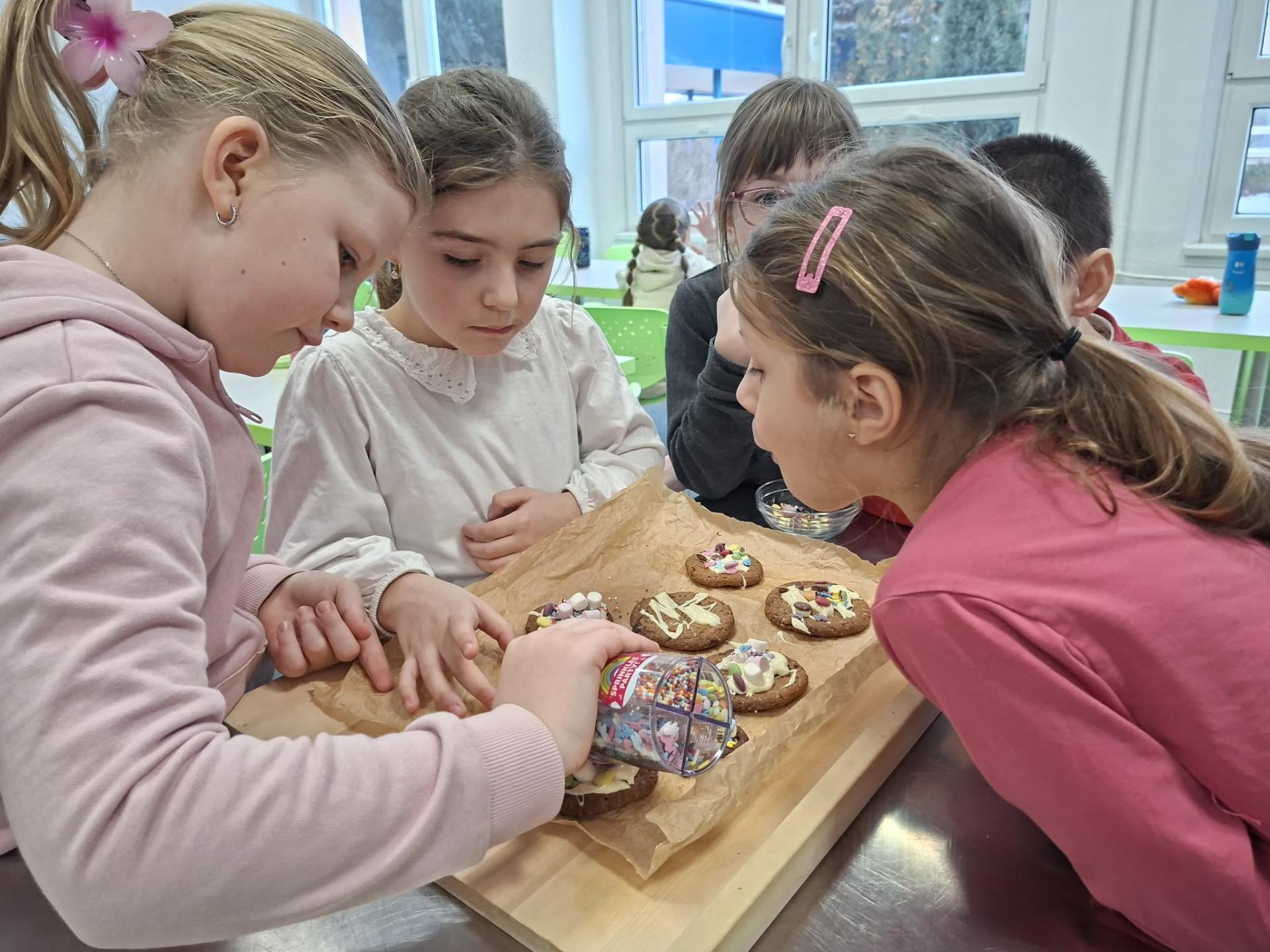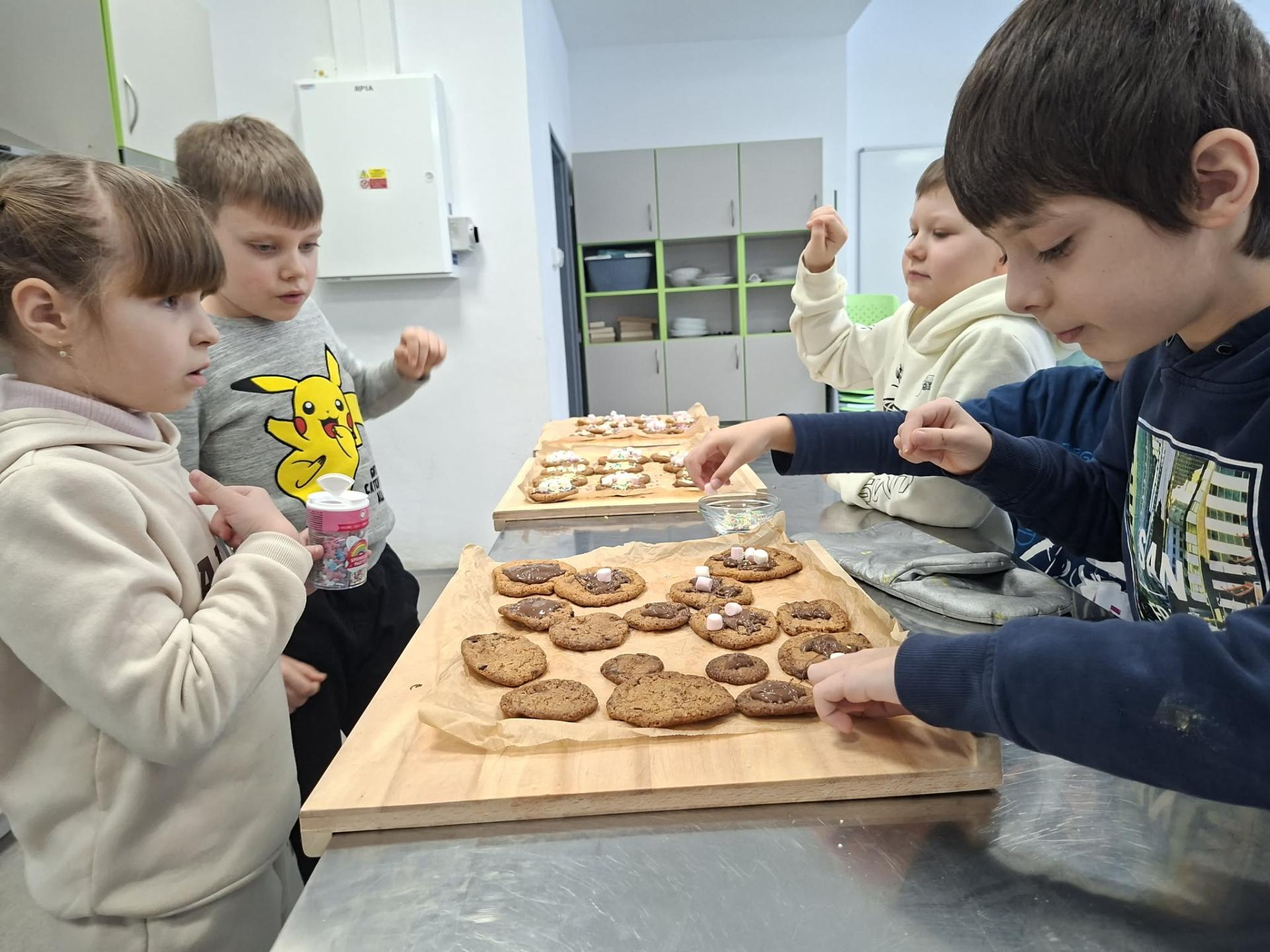 Dnes jsme s dětmi zavítali do školní kuchyňky, kde jsme si společně upekli lahodné cookies. Děti dostaly připravené těsto, do kterého si mohly přidat ingredience podle chuti – na výběr byla bílá a mléčná čokoláda nebo oříšky. Z těsta jsme tvořili kuličky, které jsme pokládali na plech, a pak už jsme netrpělivě čekali, jak budou sušenky po upečení vypadat.