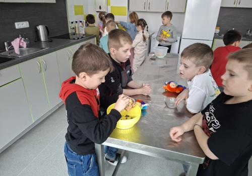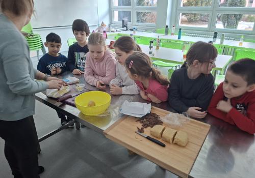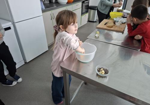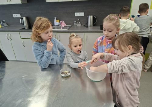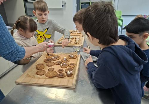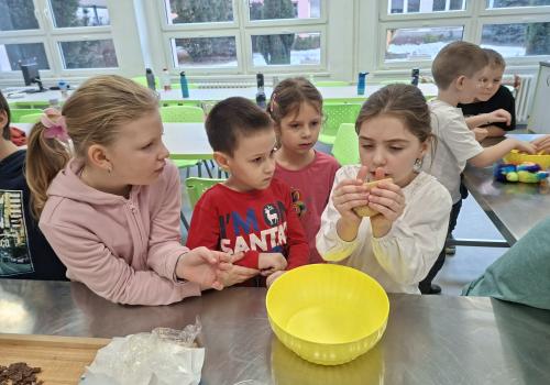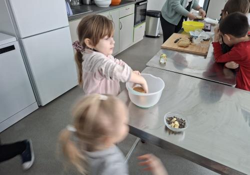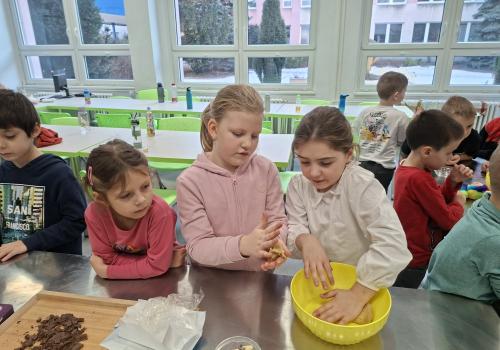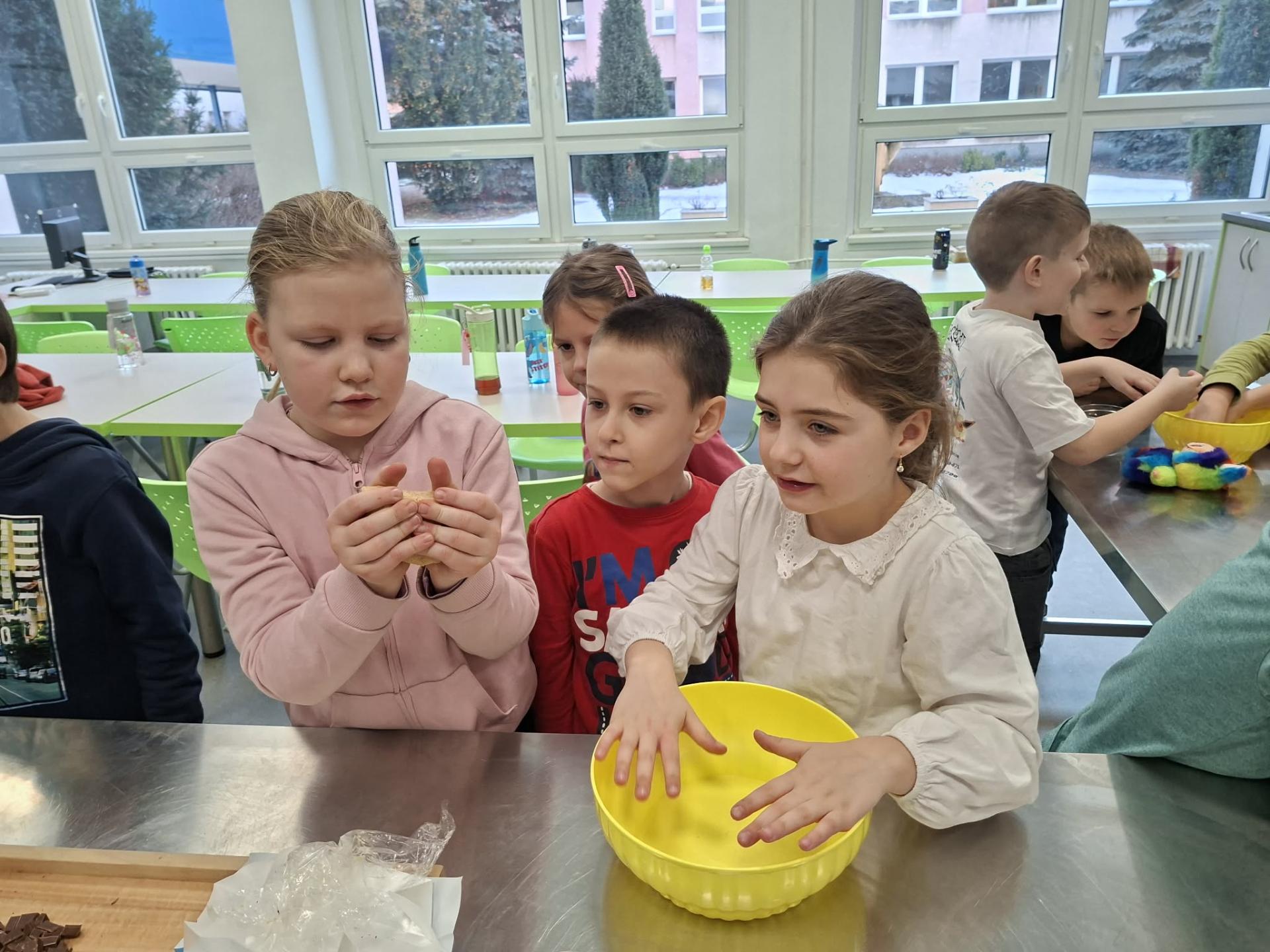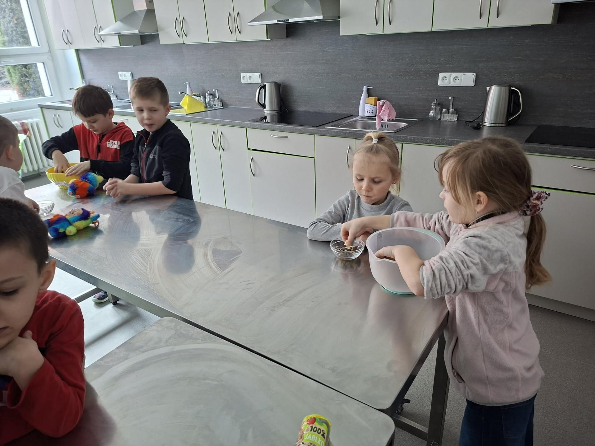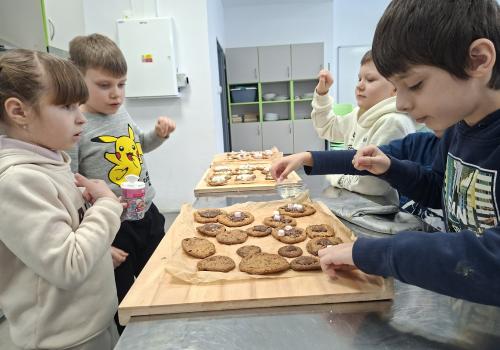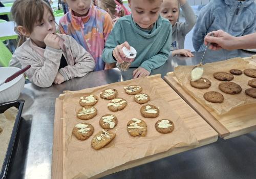 Dnes jsme s dětmi zavítali do školní kuchyňky, kde jsme si společně upekli lahodné cookies. Děti dostaly připravené těsto, do kterého si mohly přidat ingredience podle chuti – na výběr byla bílá a mléčná čokoláda nebo oříšky. Z těsta jsme tvořili kuličky, které jsme pokládali na plech, a pak už jsme netrpělivě čekali, jak budou sušenky po upečení vypadat.
