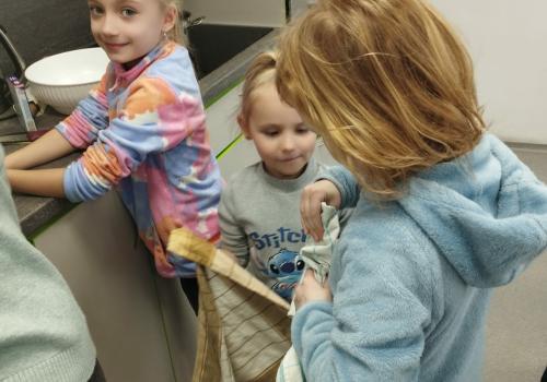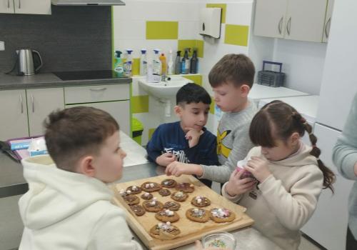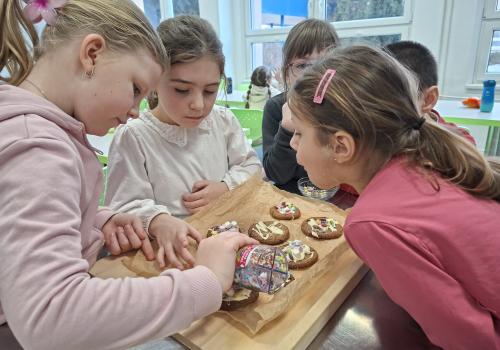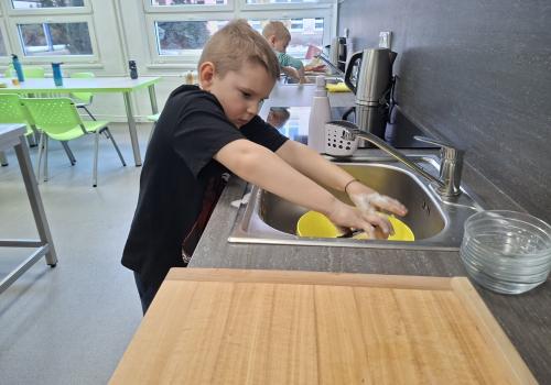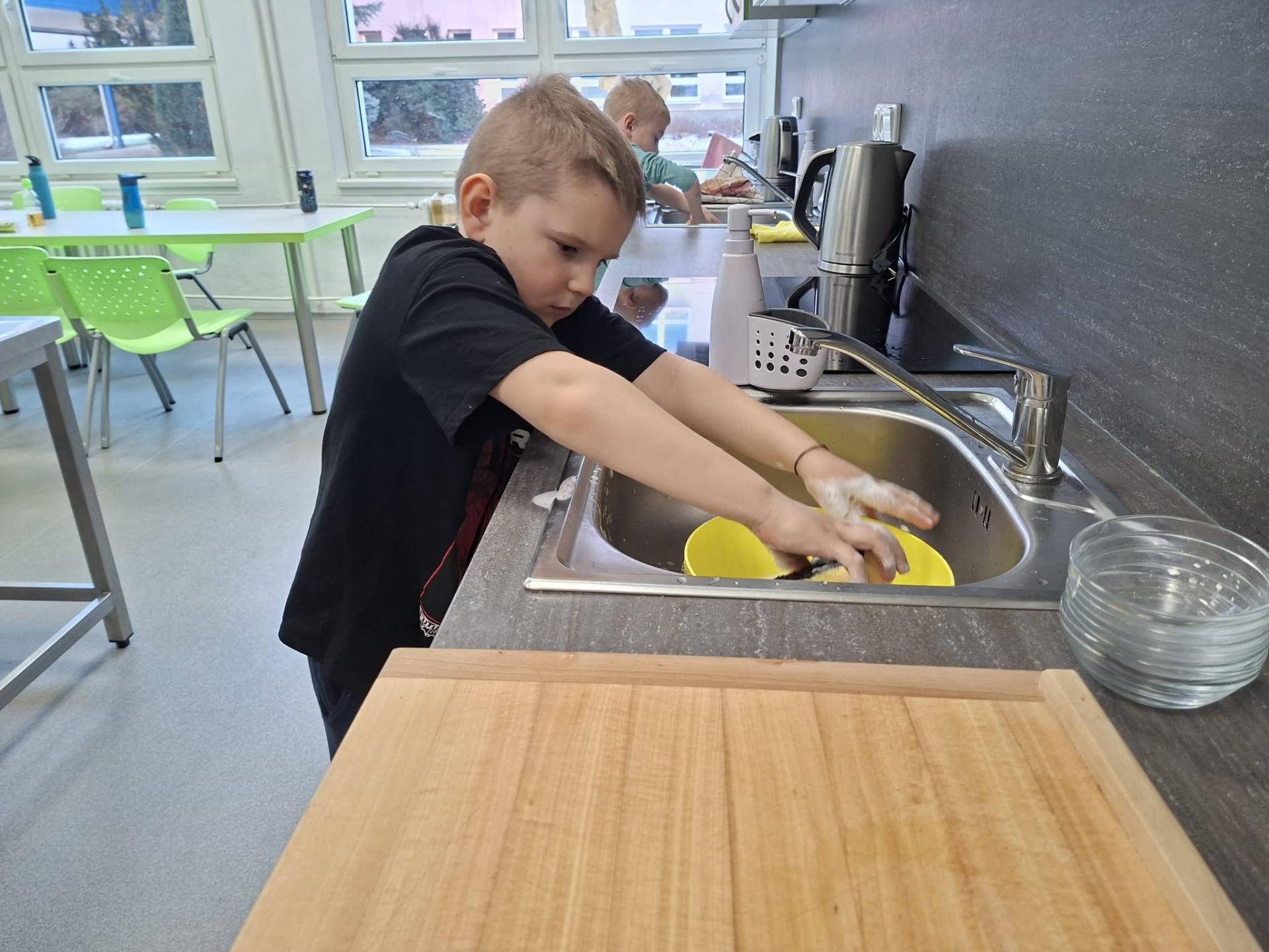 Po vytažení z trouby přišla na řadu kreativní část – zdobení. Sušenky jsme polili rozpuštěnou čokoládou a ozdobili různobarevnými posypkami. A protože k pečení neodmyslitelně patří i úklid, děti si po sobě umyly nádobí, utřely ho a vše pečlivě uklidily.