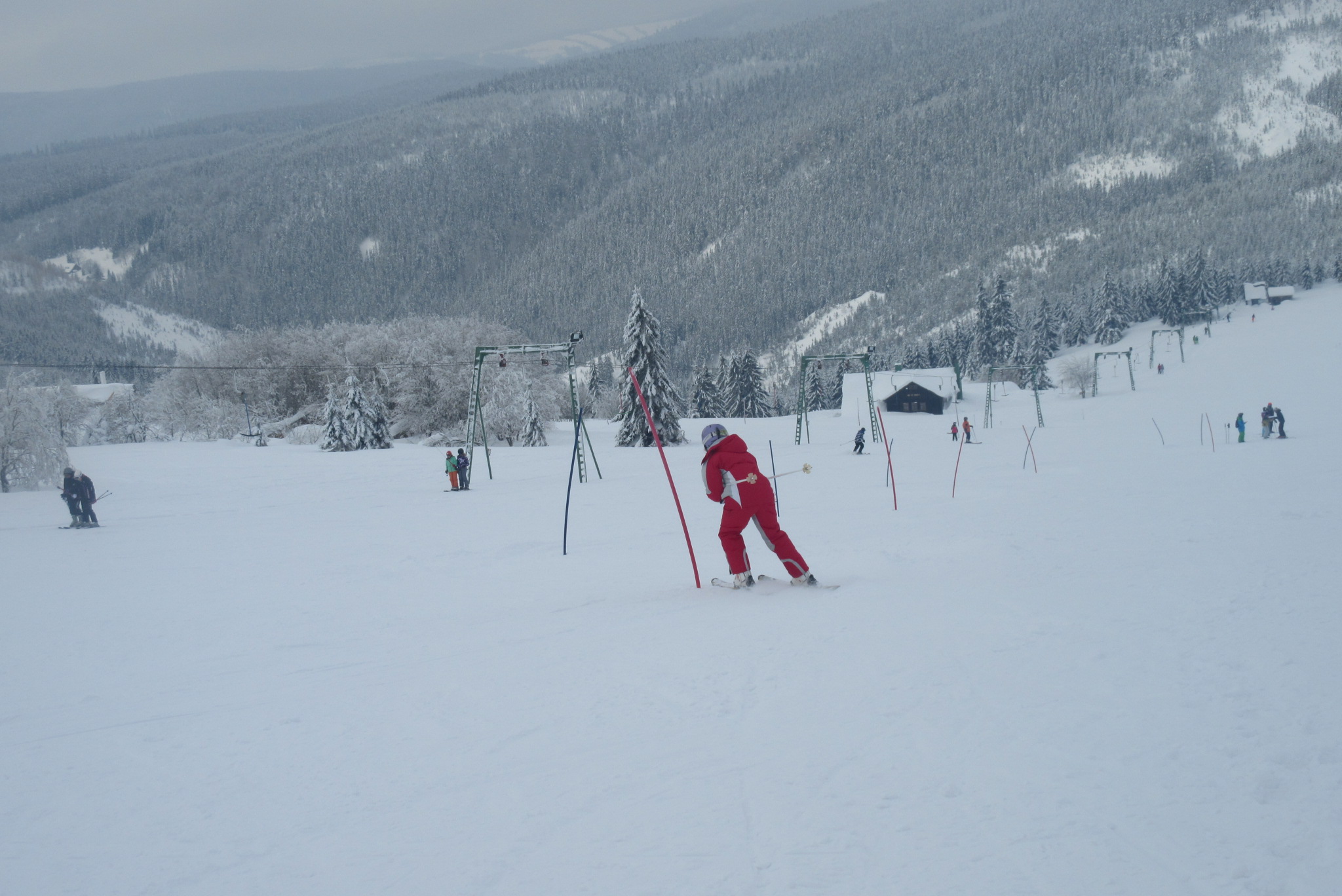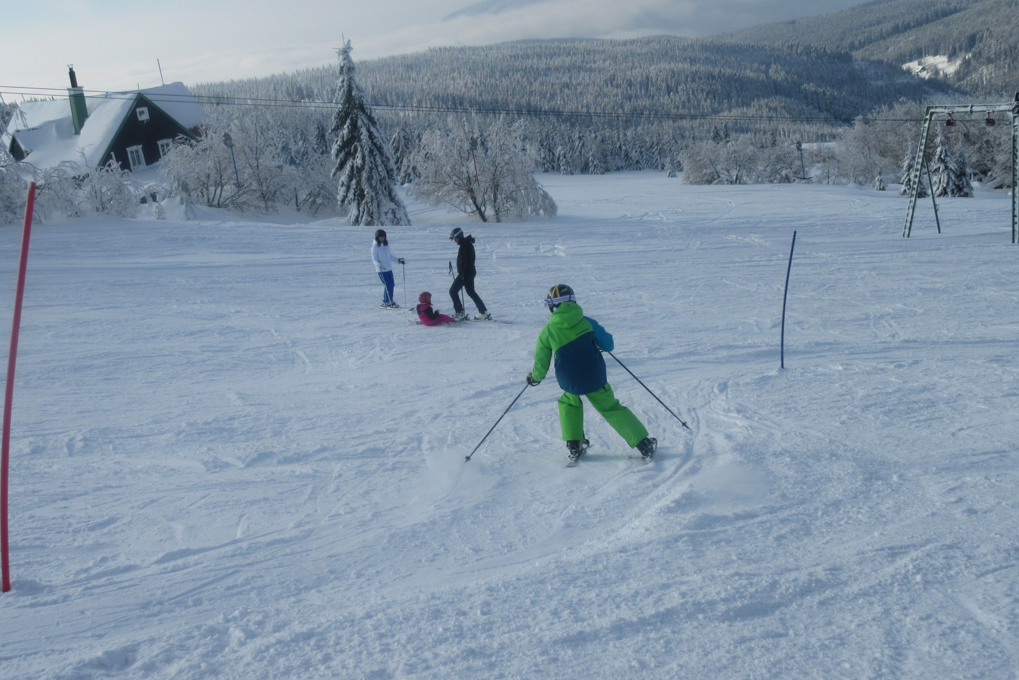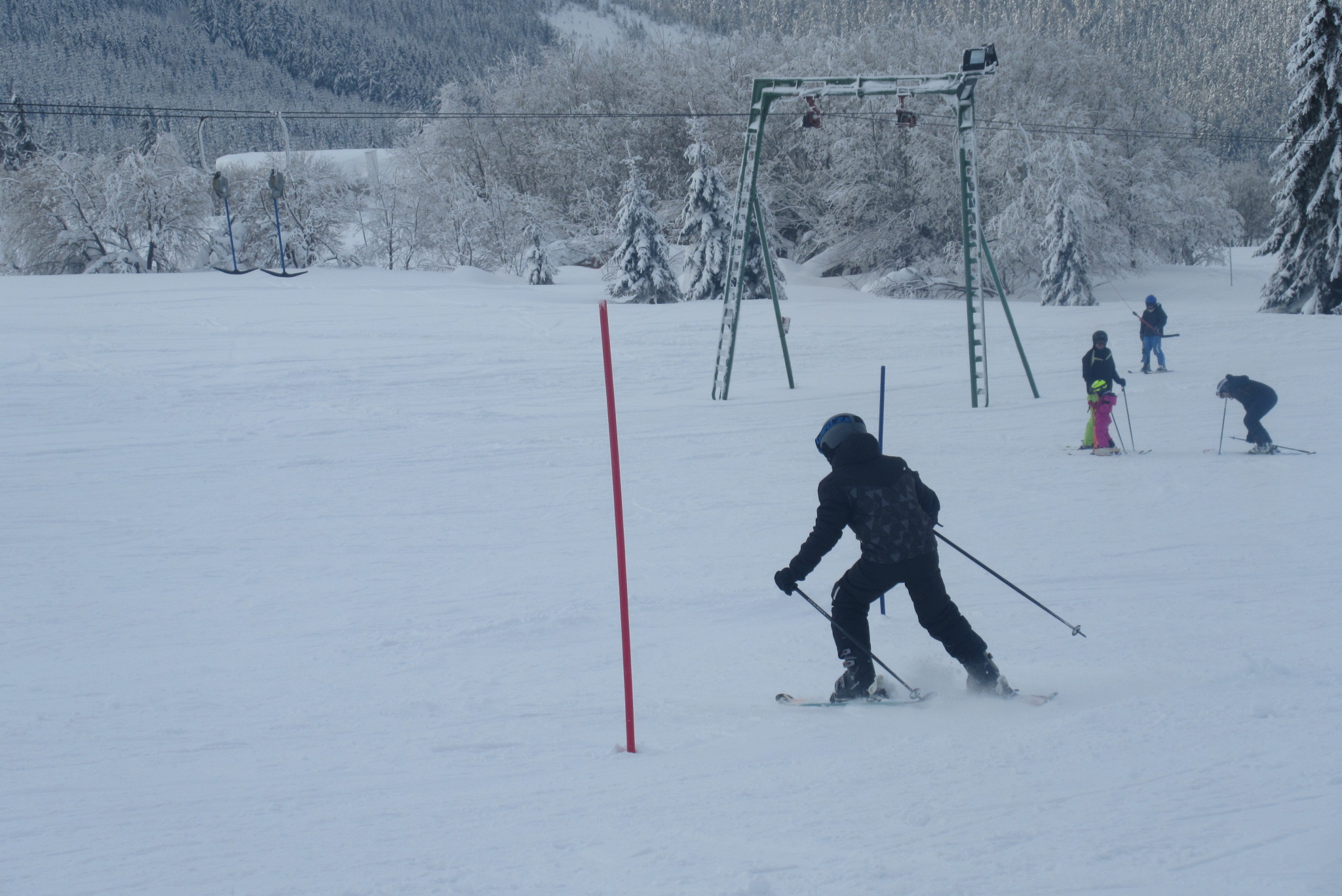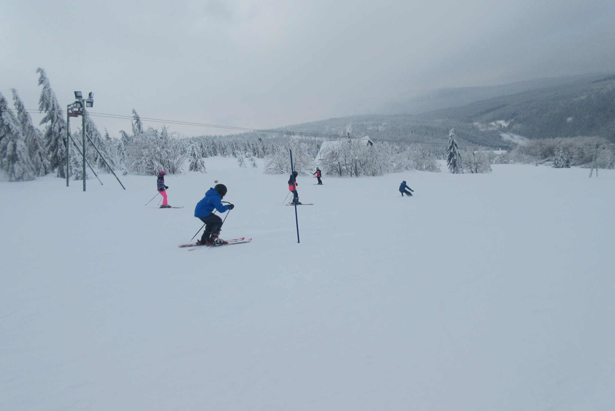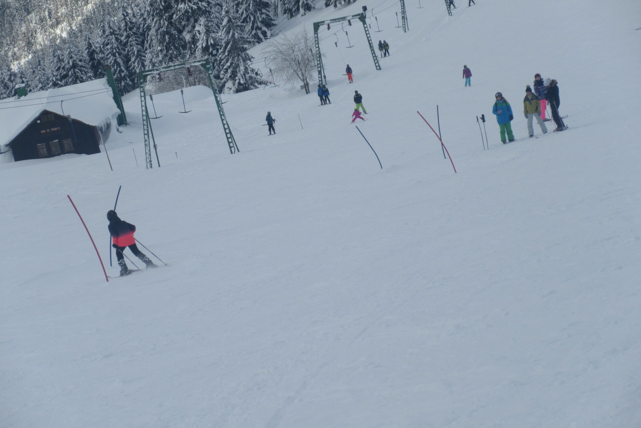 Dnešní den se vyvíjel v soutěžním duchu, protože byly na dopoledne naplánovány závody ve slalomu...až na pár marodů, kteří se nám trochu rozmnožili na tomto kurzu, všichni zúčastnění zdárně zajeli 2 kola a některým se podařilo probojovat až na stupně vítězů: Na 3. místě z děvčat se umístila Nela Syrůčková, 2. místo obsadila Káťa Rulcová a nejlepší slalomářkou se stala Míša Dvořáková. Mezi chlapci 3. místo obsadil Filip Kroužel, 2. Patrik Stohanzl a pomyslné zlato získal Martin Starý, který se stal zároveň celkovým vítězem. Odpoledne probíhalo na svahu už spíše volnější lyžování pouze s individuálním dolaďováním techniky řezaného oblouku, a protože bylo 31.1., rozdávalo se dětem na svahu vysvědčení