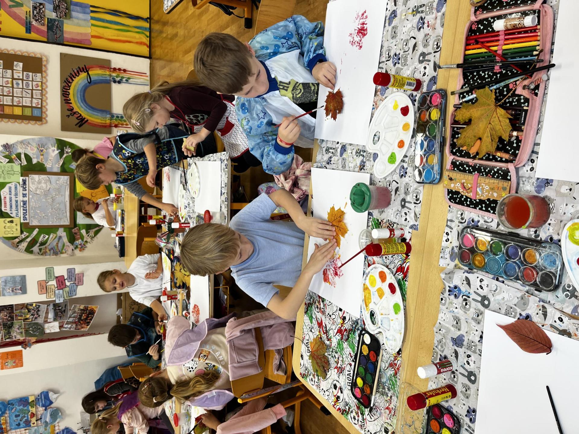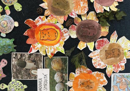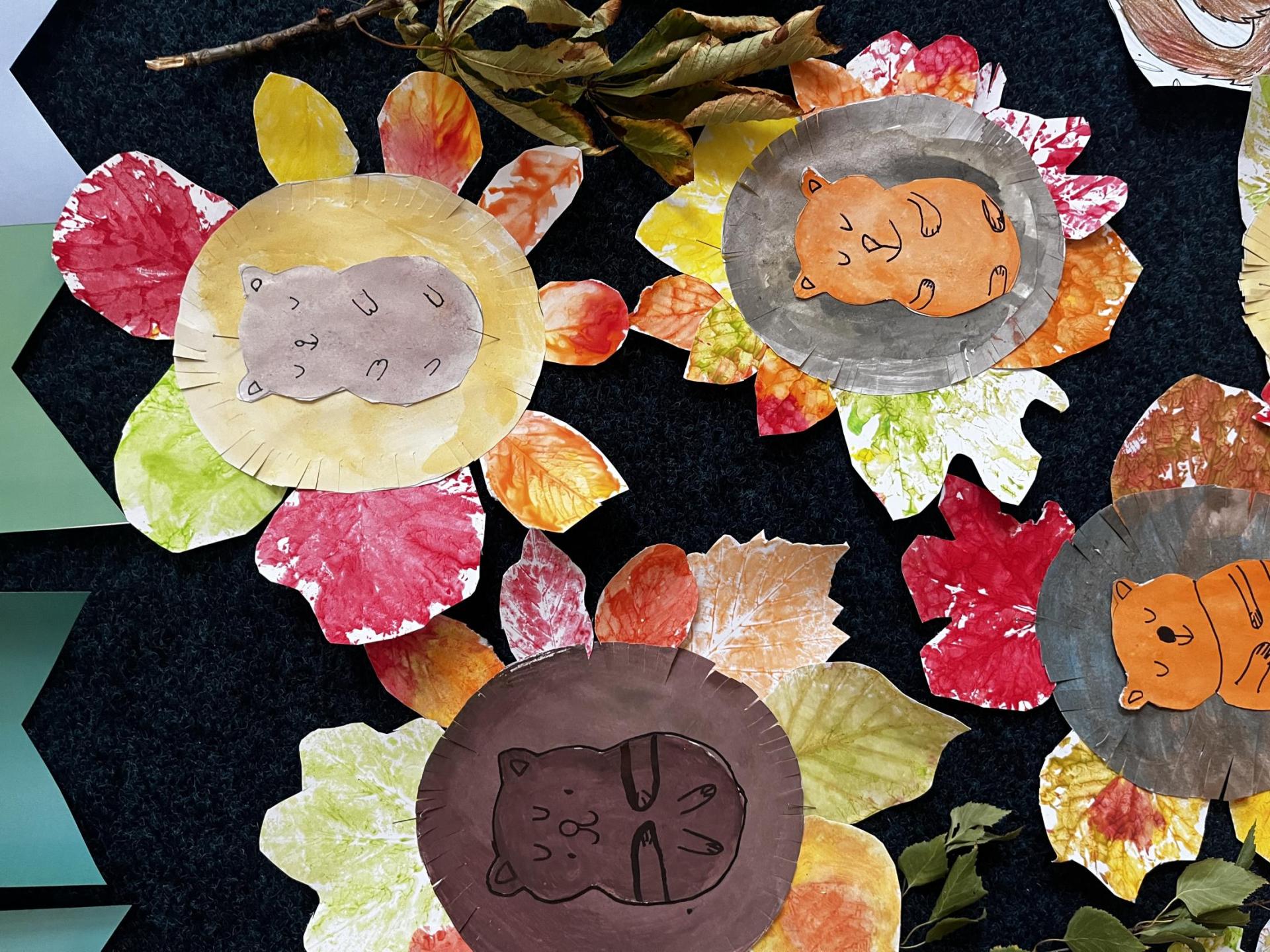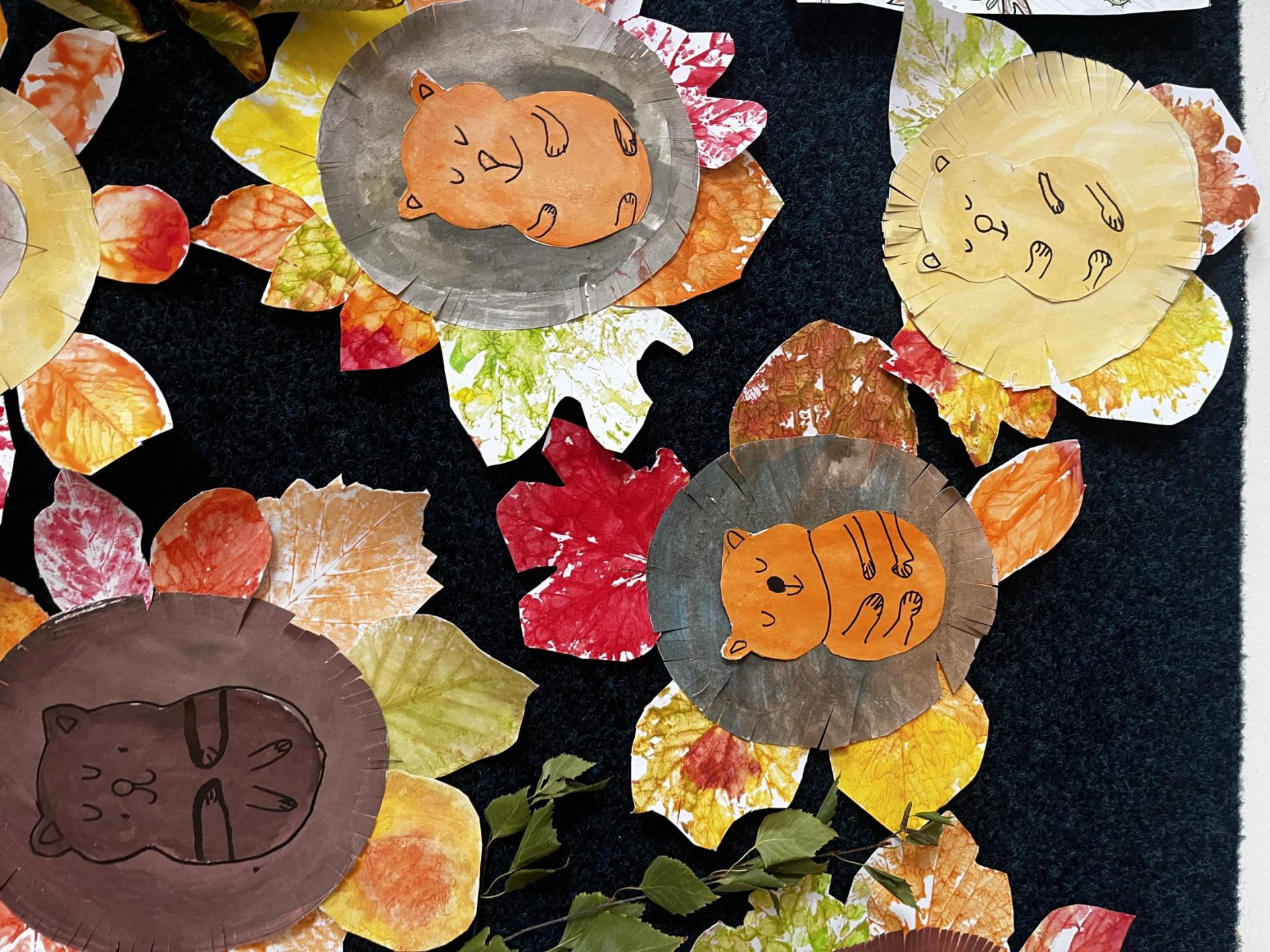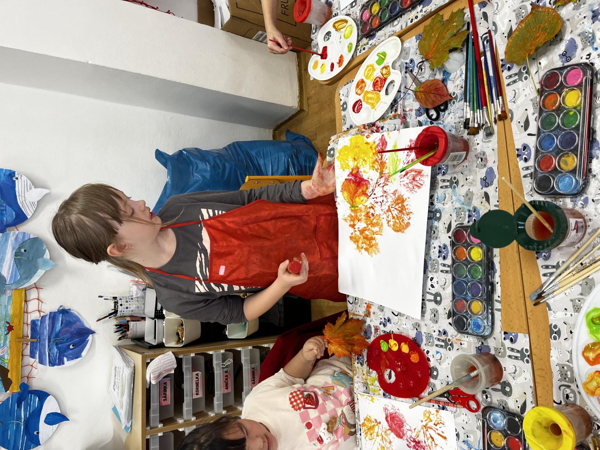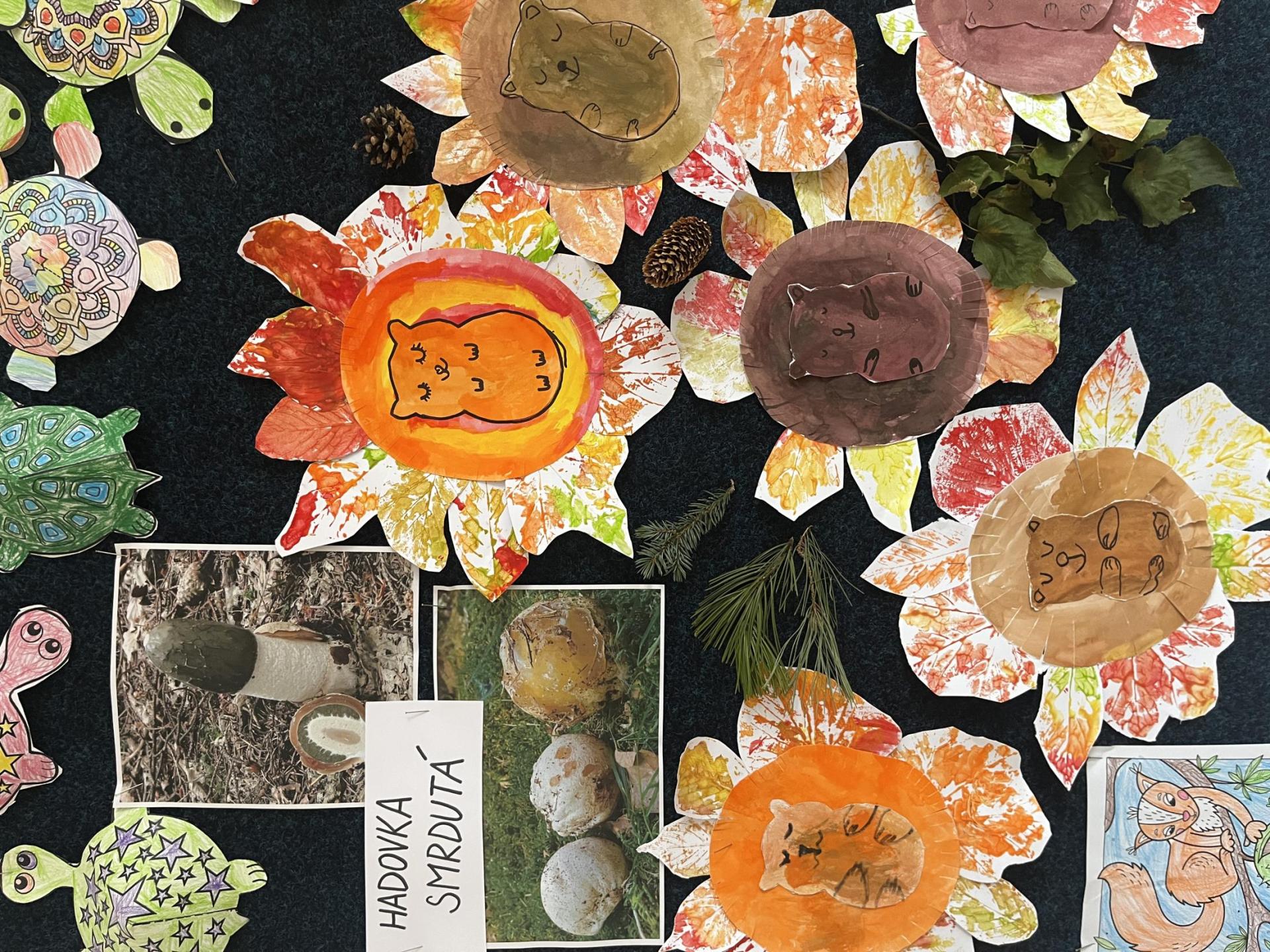 Na podzim jsme se učili o stromech, zvířatech v lese a tak jsme i o výtvarce tyto náměty využili. Použili jsme listy a vytvořili jsme takové veverky zachumlané v listí. U toho jsme se učili být pečliví a pečlivě stříhat.