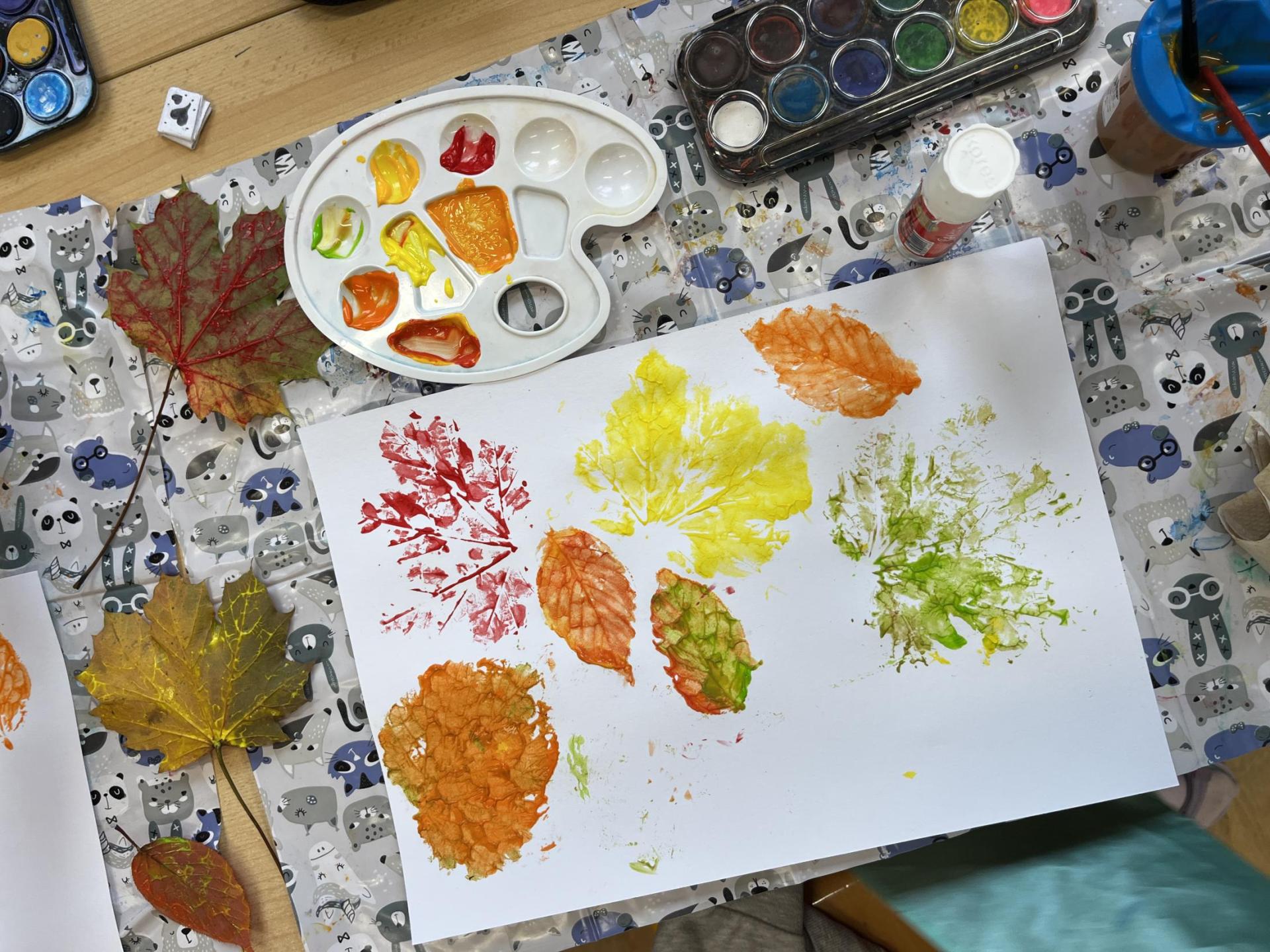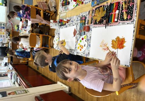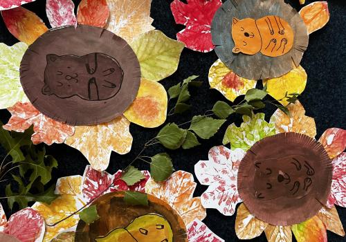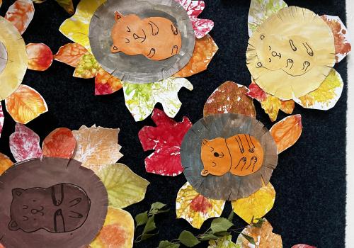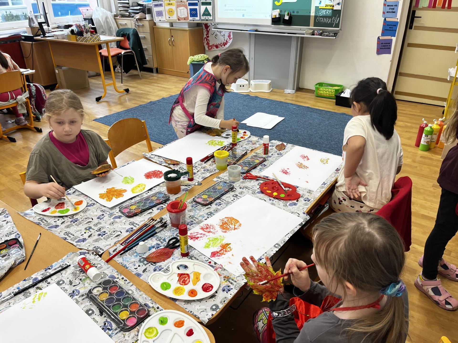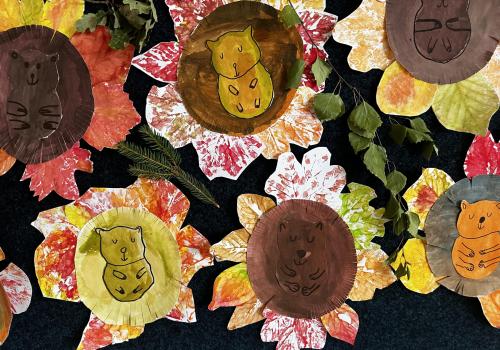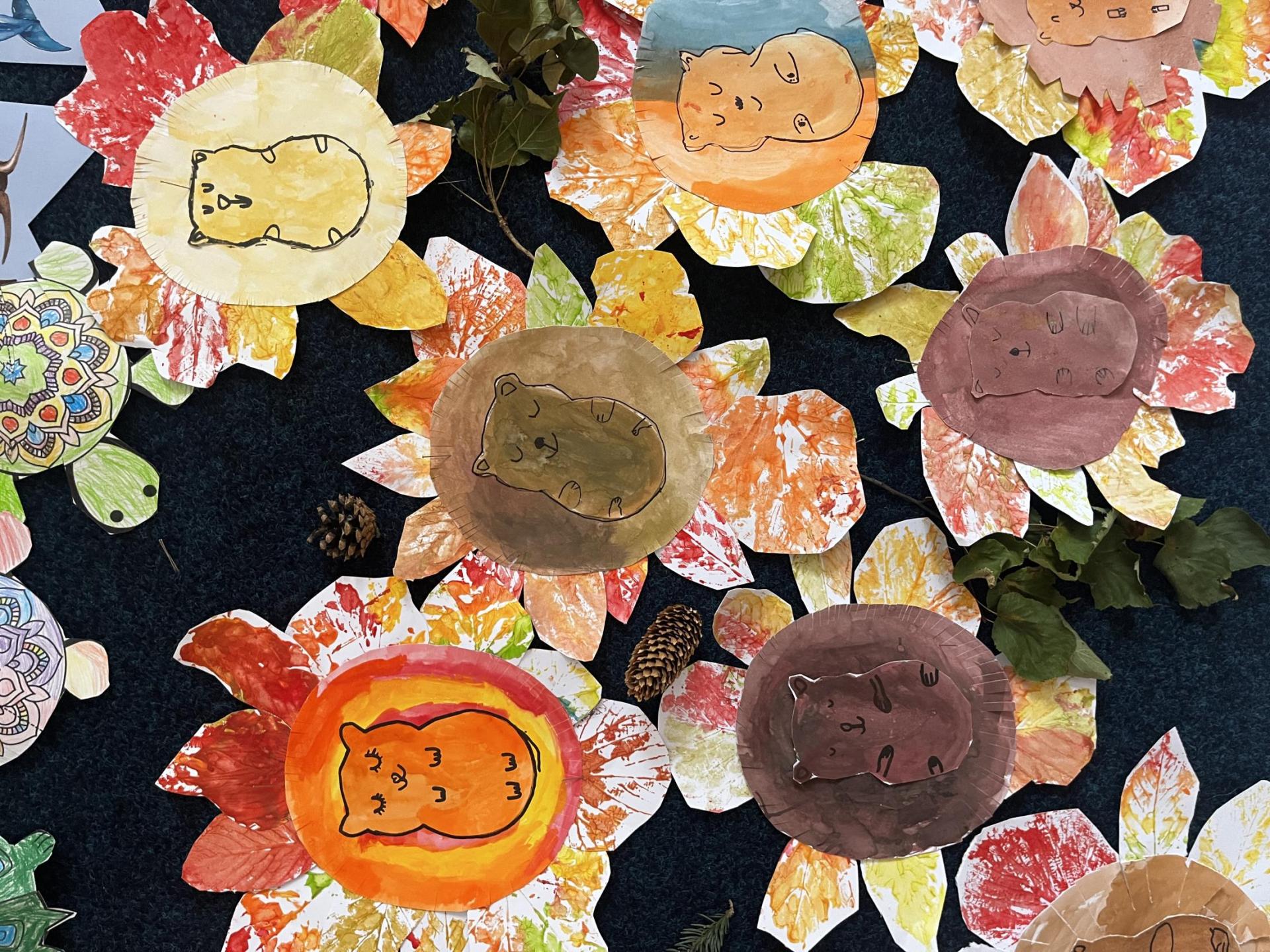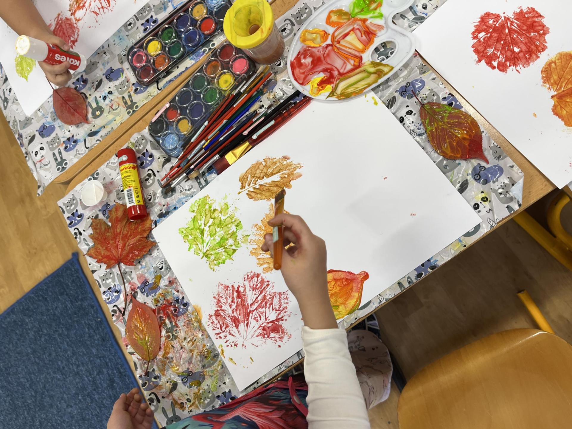 Na podzim jsme se učili o stromech, zvířatech v lese a tak jsme i o výtvarce tyto náměty využili. Použili jsme listy a vytvořili jsme takové veverky zachumlané v listí. U toho jsme se učili být pečliví a pečlivě stříhat.