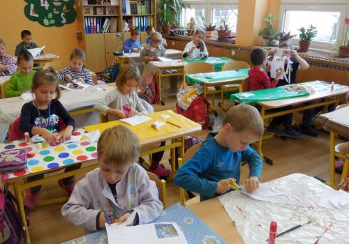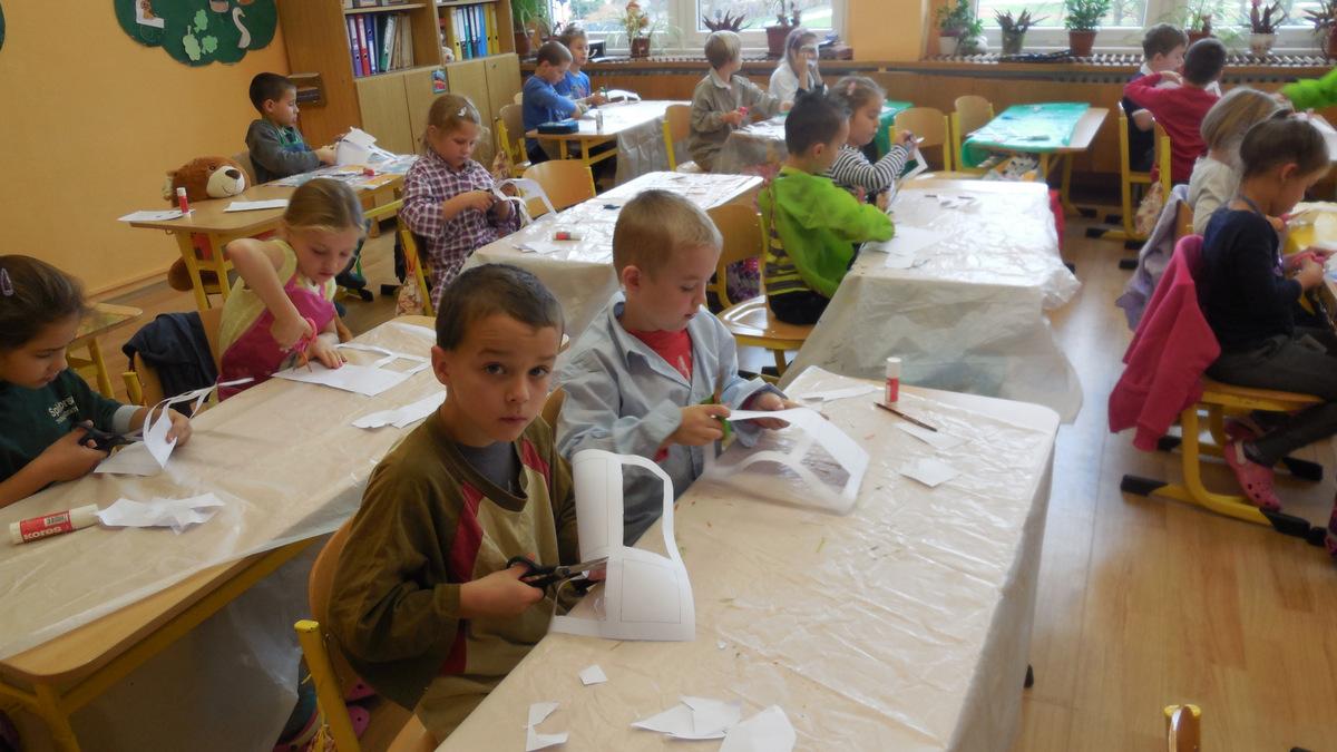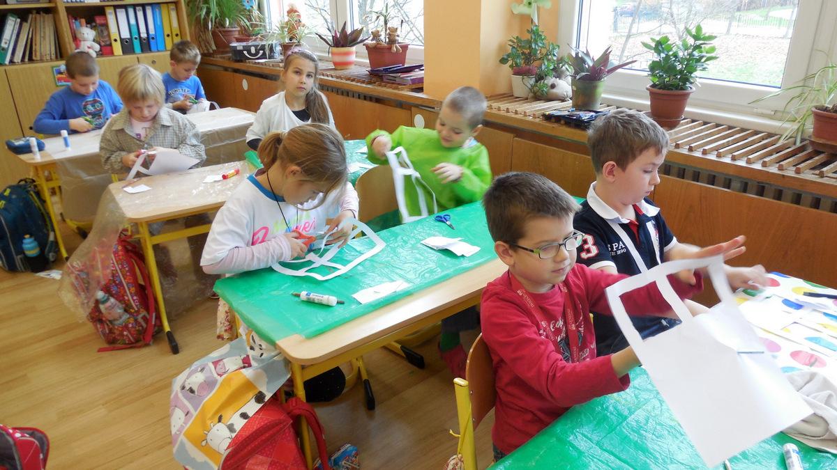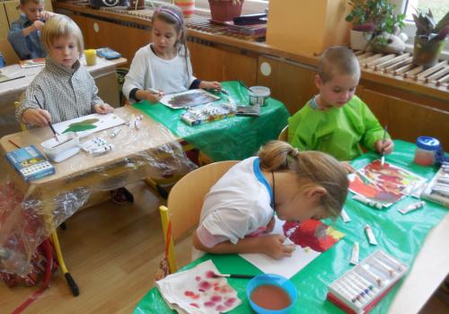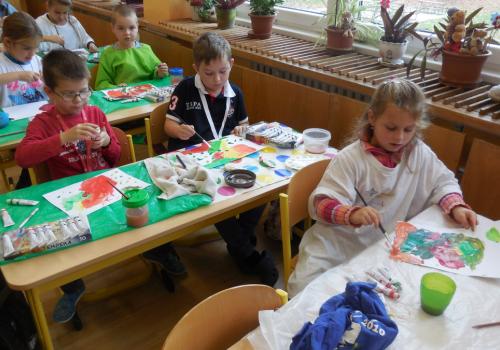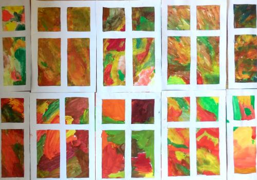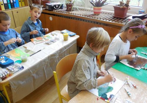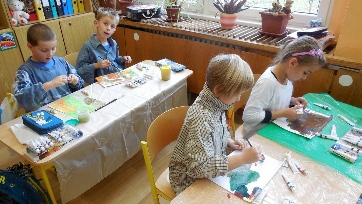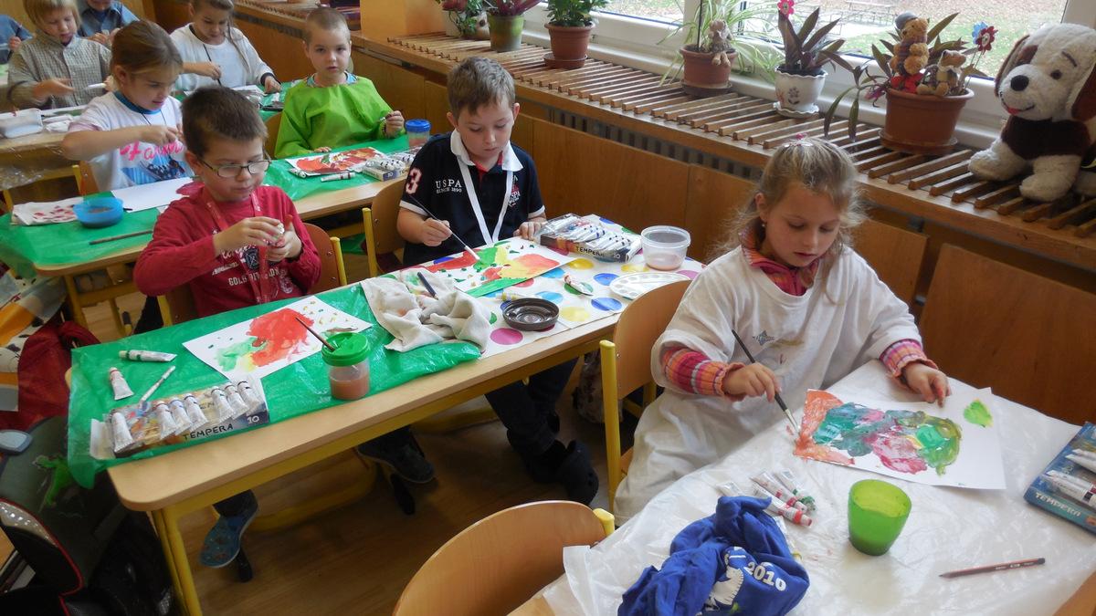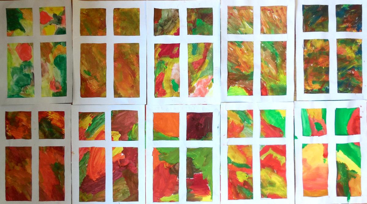 Poprvé jsme si s temperovými barvami vlastně hráli - skoro kouzlili. Pozorovali jsme, jak se mění barvy při jejich míchání. Vystříhnout a nalepit rám okna už byl větší oříšek, ale nakonec jsme ho také rozlouskli.