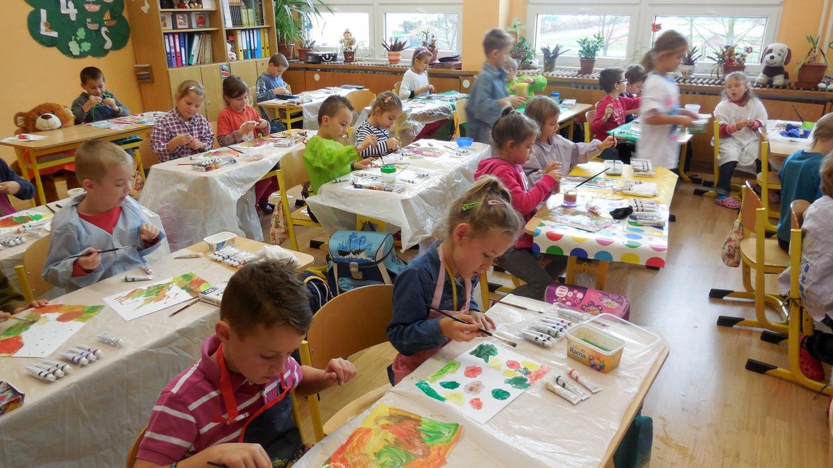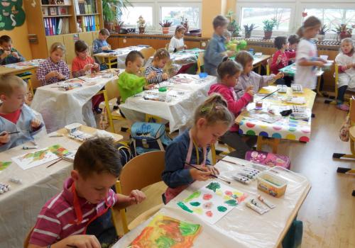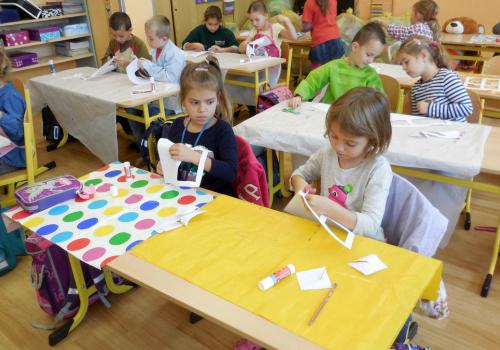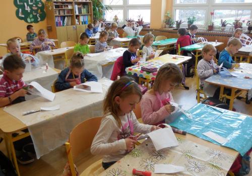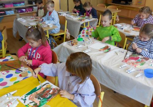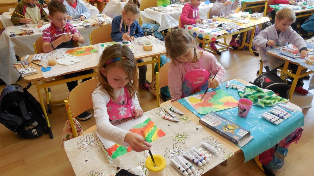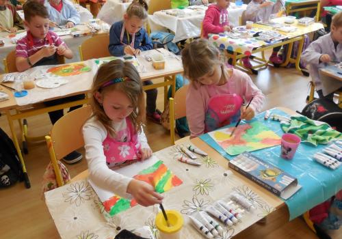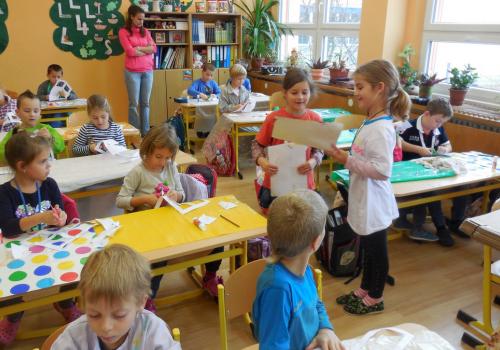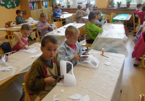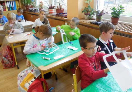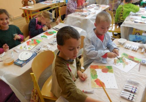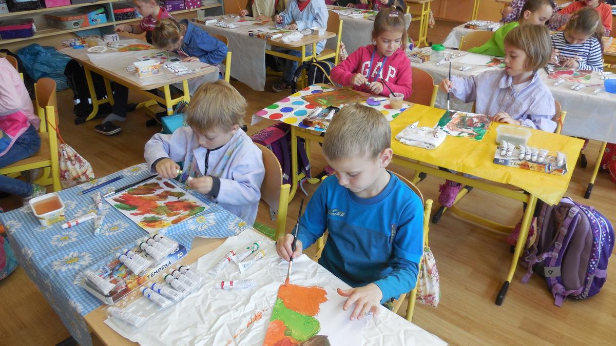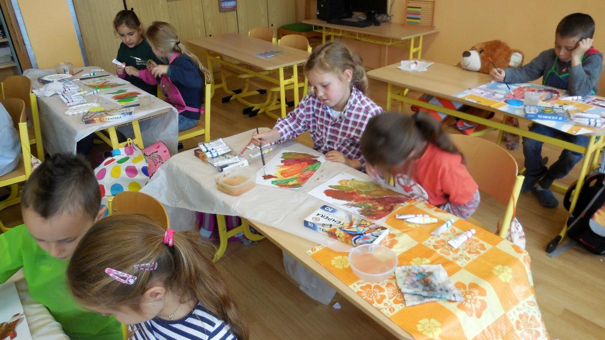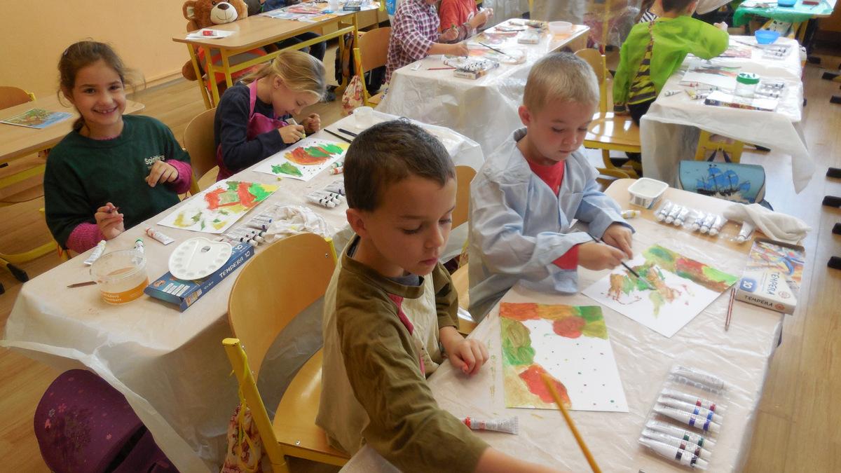 Poprvé jsme si s temperovými barvami vlastně hráli - skoro kouzlili. Pozorovali jsme, jak se mění barvy při jejich míchání. Vystříhnout a nalepit rám okna už byl větší oříšek, ale nakonec jsme ho také rozlouskli.