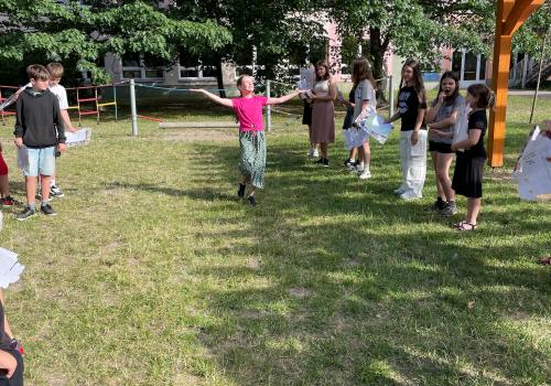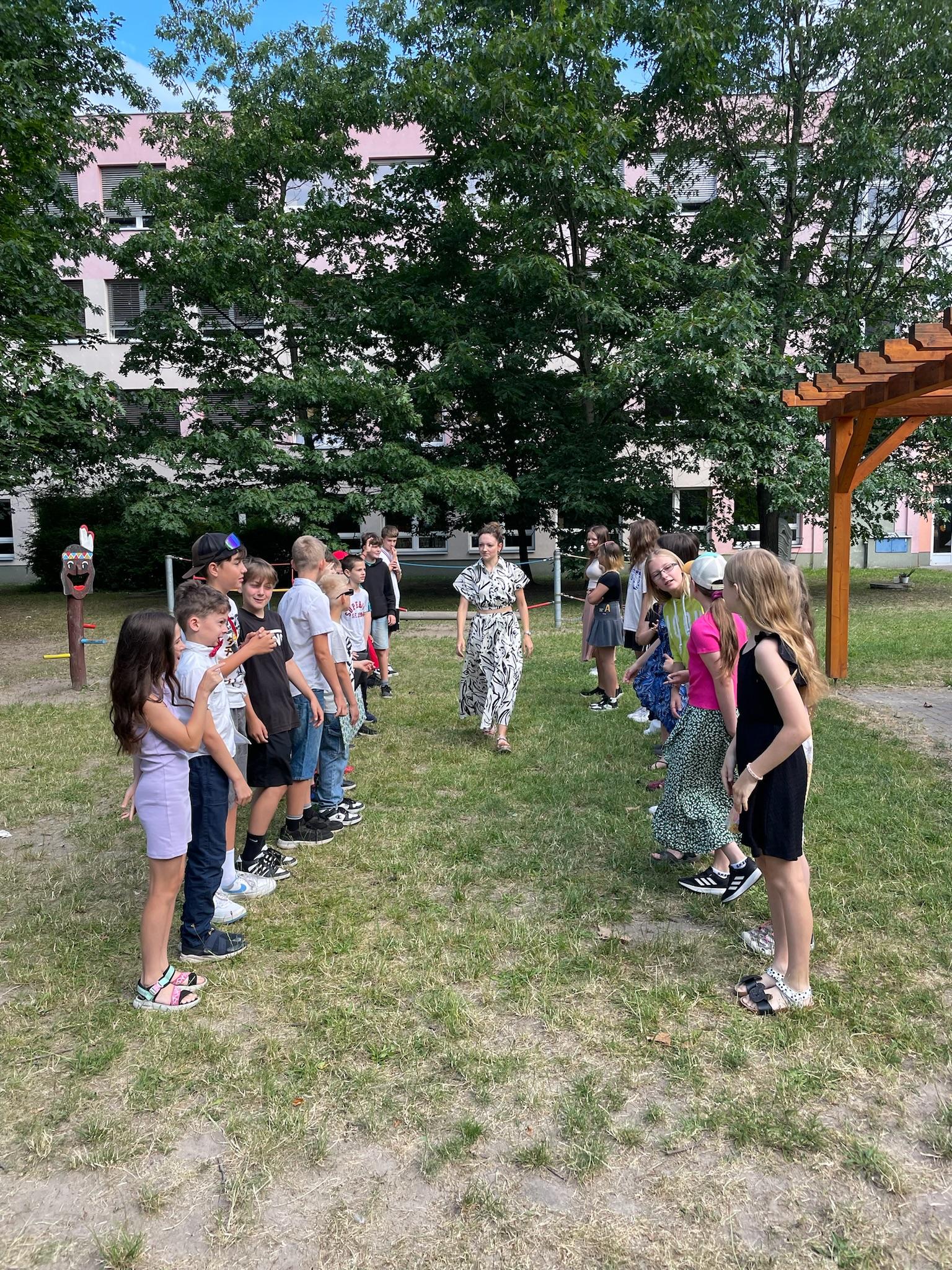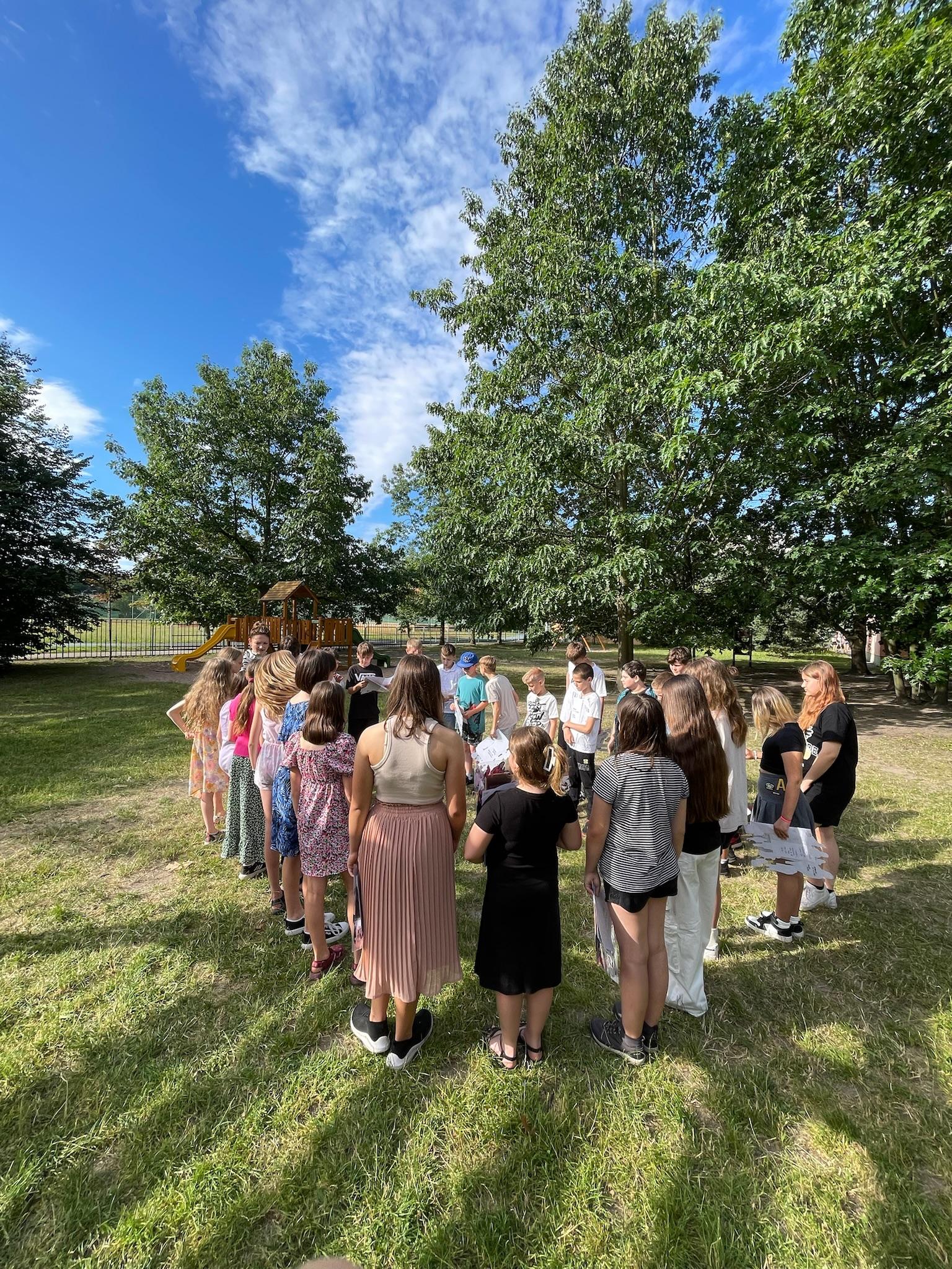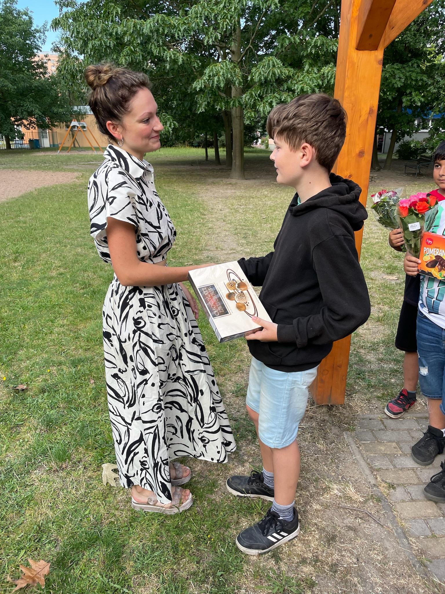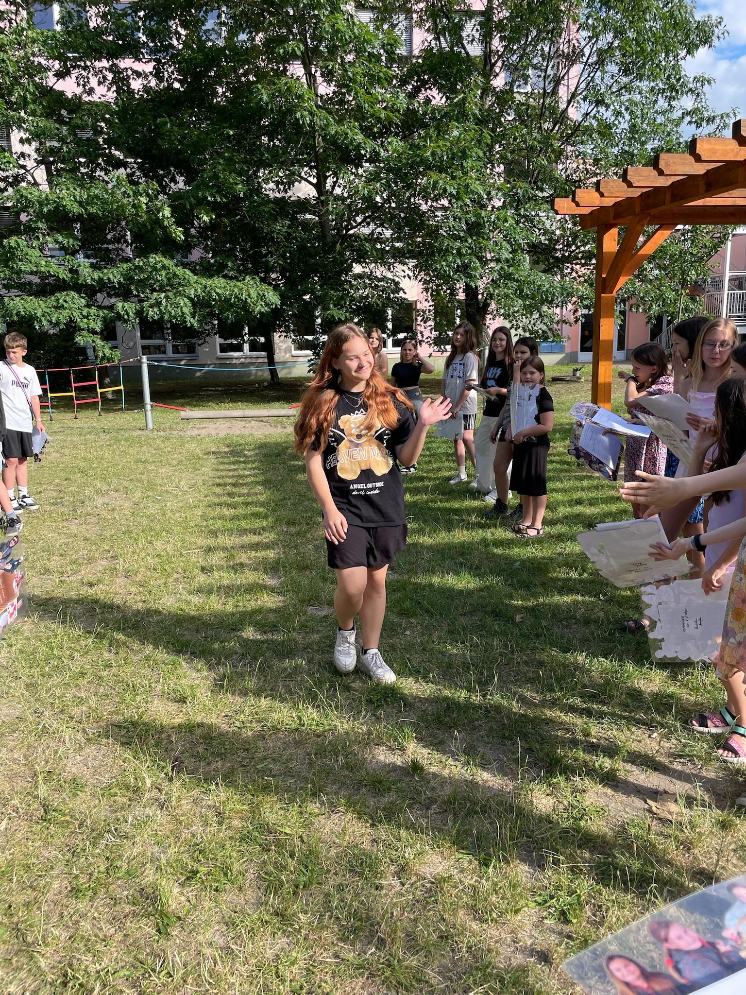 Protože třída už byla holá a my i paní učitelka se stěhujeme jinam, tak jsme si vysvědčení rozdali na zahradě.