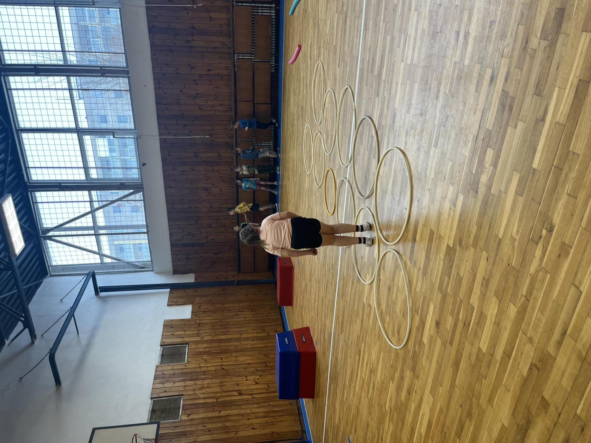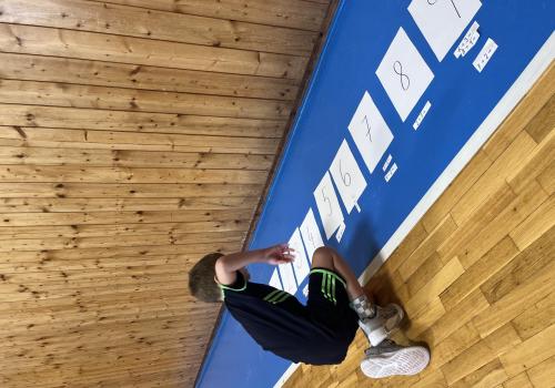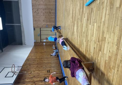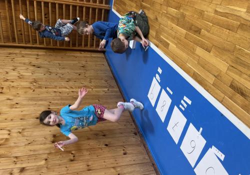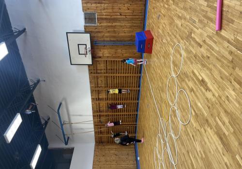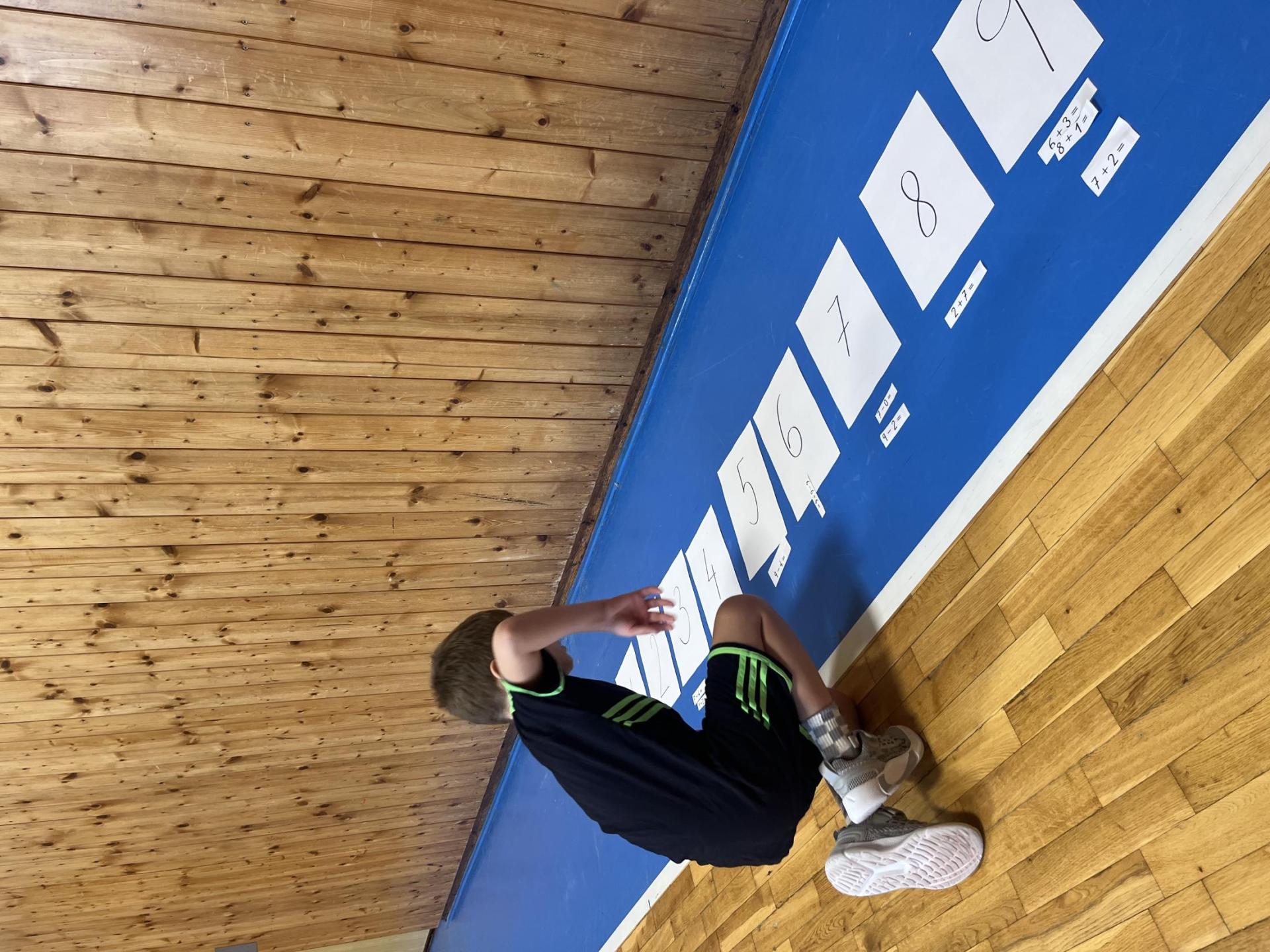 Dnešní hodina tělesné výchovy se nesla v duchu překážkové dráhy. Děti postupně překonávaly připravené překážky a zároveň si zábavnou formou procvičily matematiku – vybíraly příklady, správně je vypočítaly a přiřazovaly k odpovídajícím výsledkům. Tato pohybová aktivita děti velmi bavila.