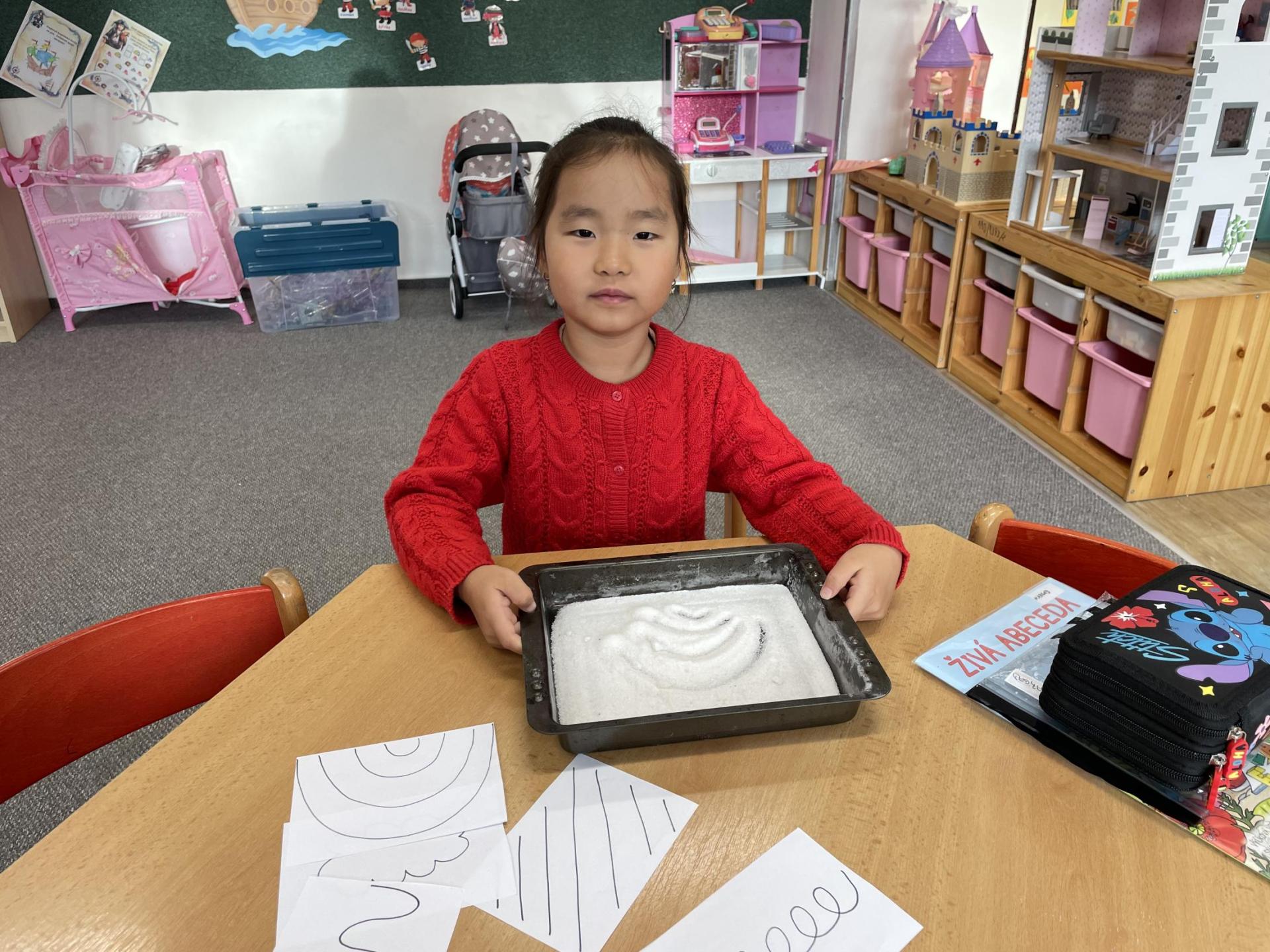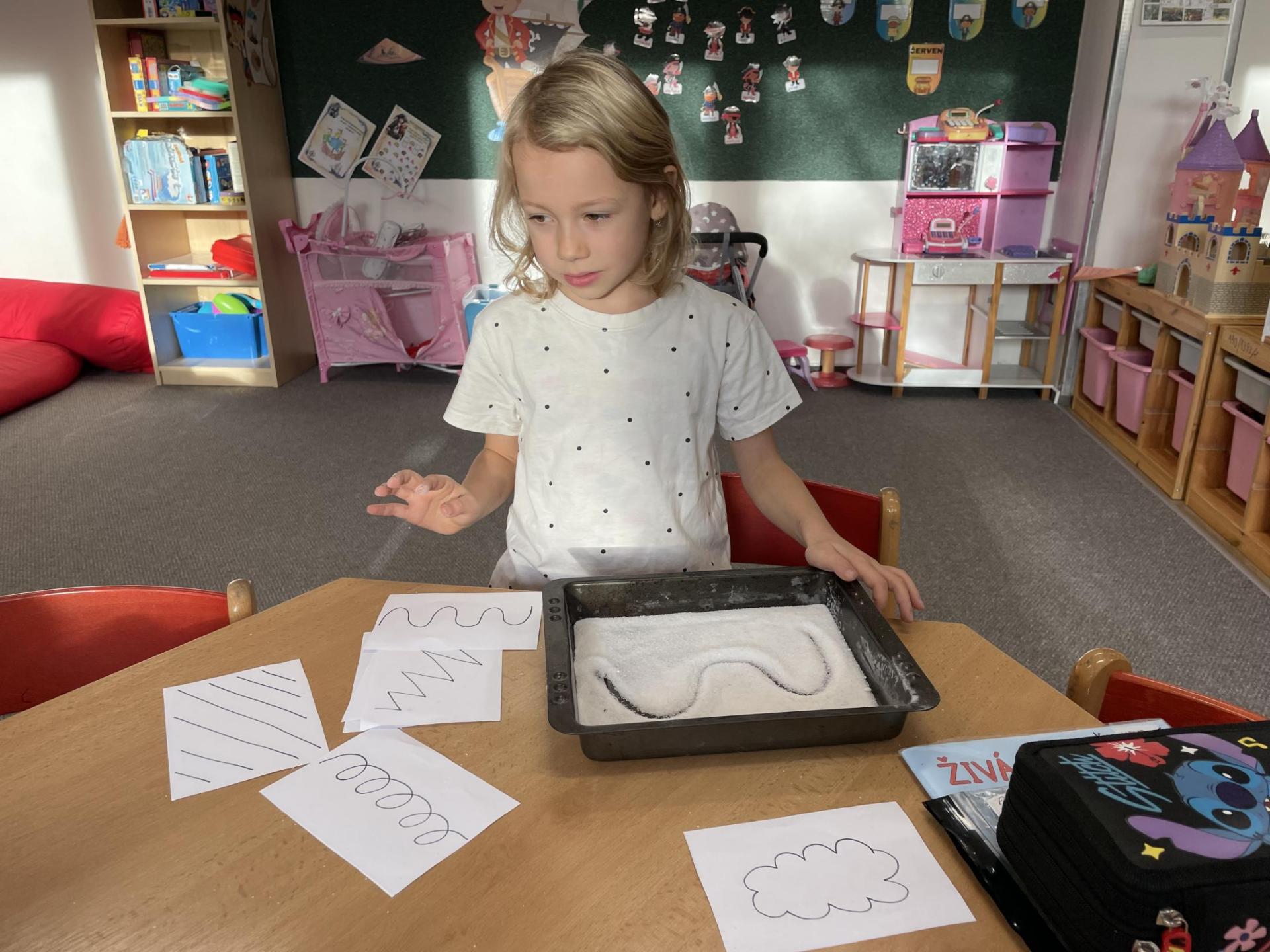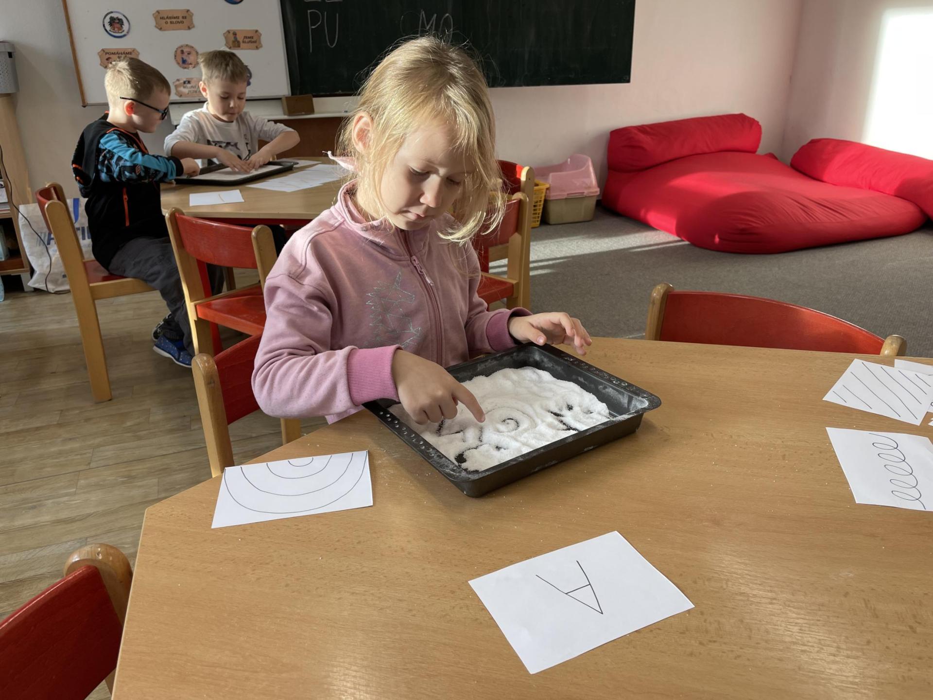 Již od září jsme připravovali ruku na psaní. Důležité bylo uvolnit ruku a pohlídat si držení tužky ve špetkovém úchopu. Ke správnému držení tužky nám pomáhá říkanka: