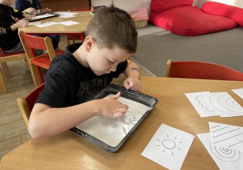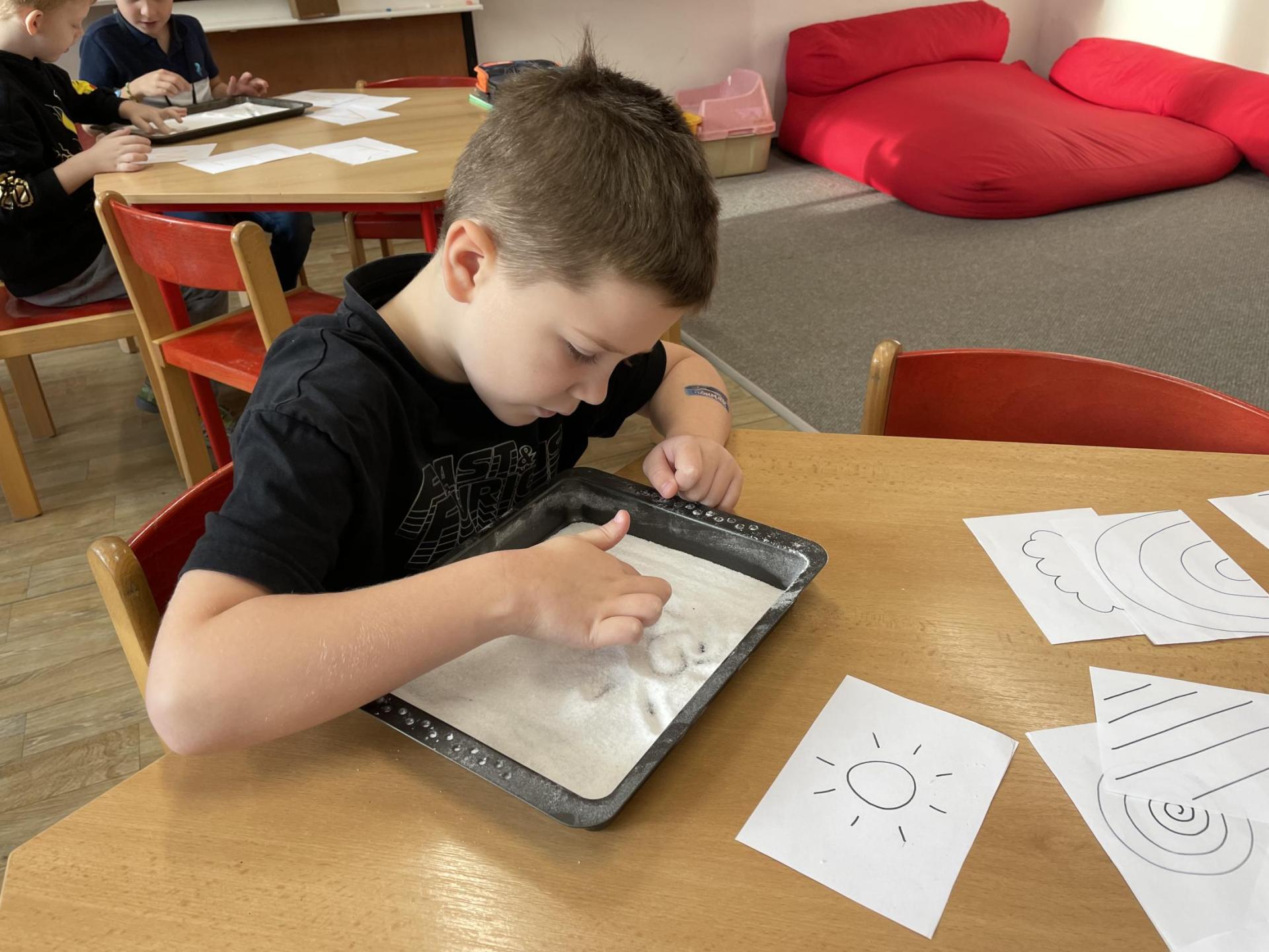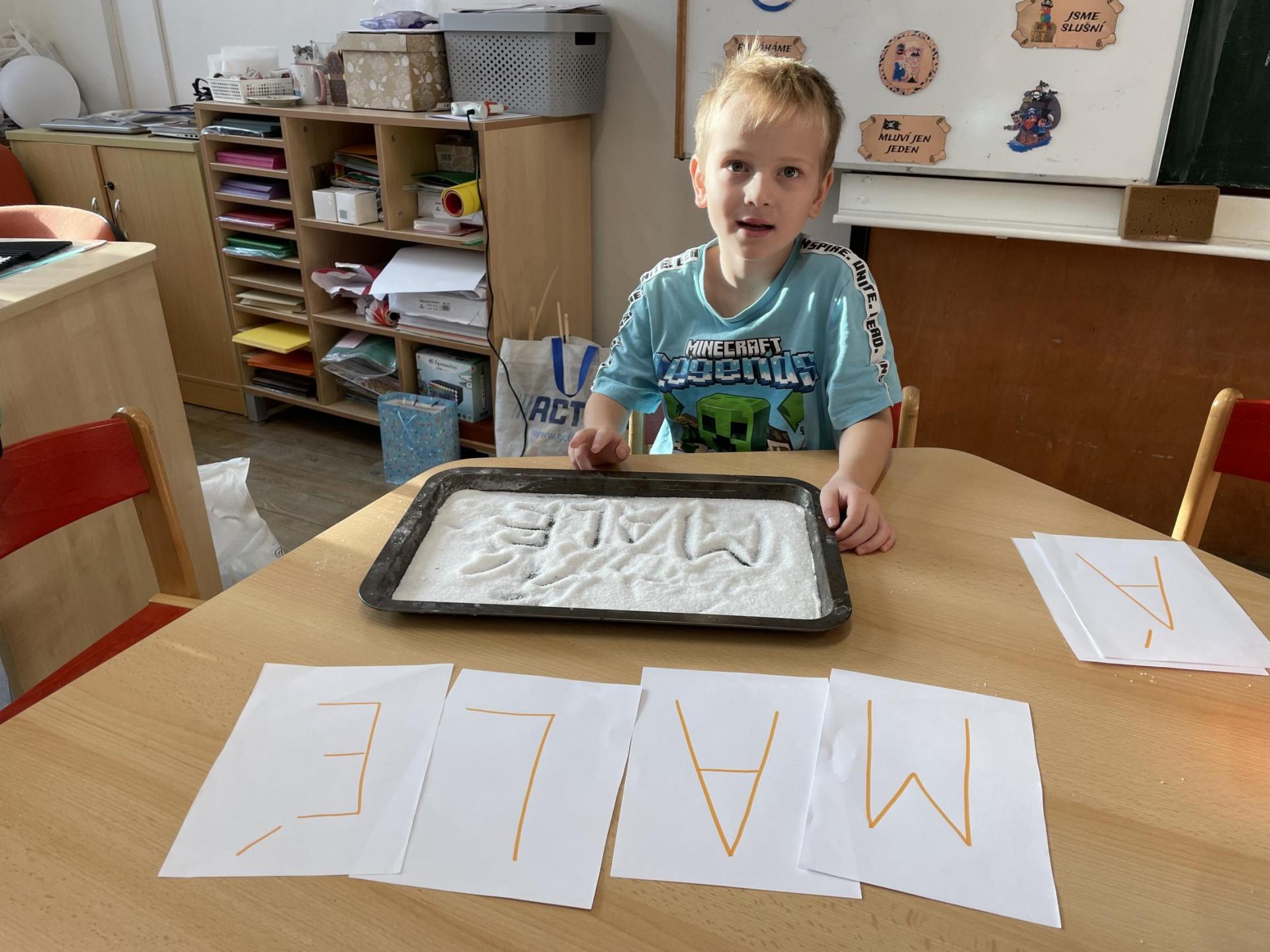 Pak jsme zkoušeli různé techniky na metodu zatlač a povol. A asi nejvíce nás bavilo psaní a kreslení do soli.