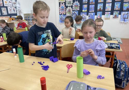 Názvy rostlin si žáci pravidelně upevňovali z plakátů, které jsme měli ve třídě vyvěšené. K lepšímu zapamatování přispělo i výtvarné tvoření – díky tomu teď naši třídu zdobí sněženky, tulipány, hyacinty a dokonce i jedna živá rostlinka – prvosenka jarní (petrklíč).