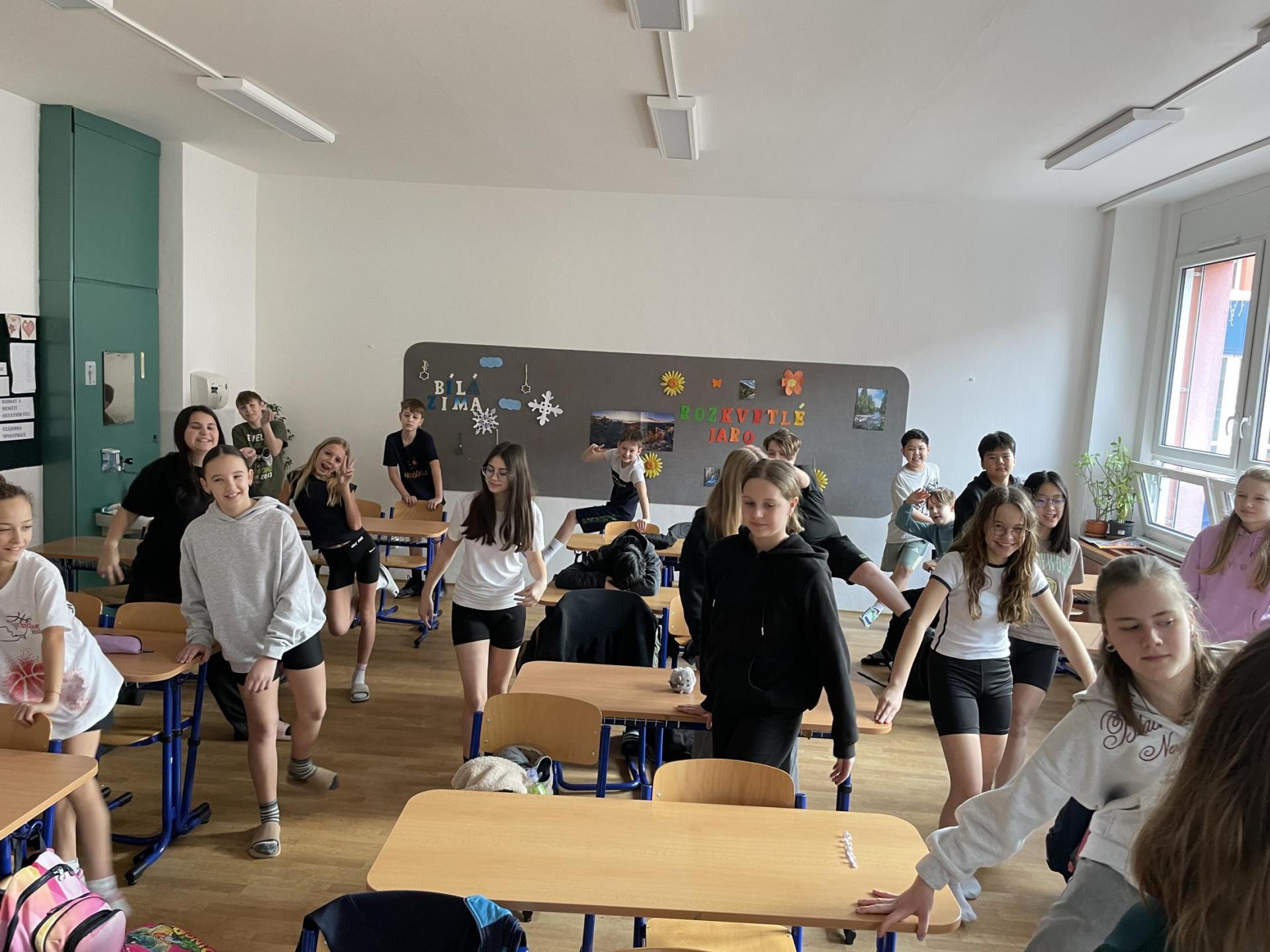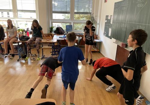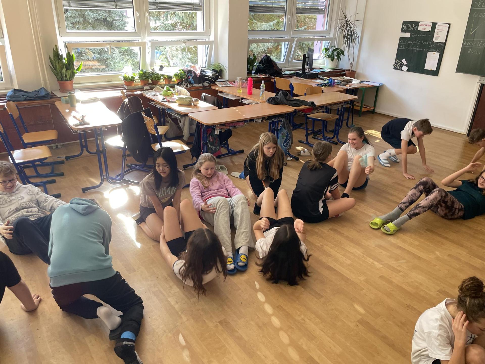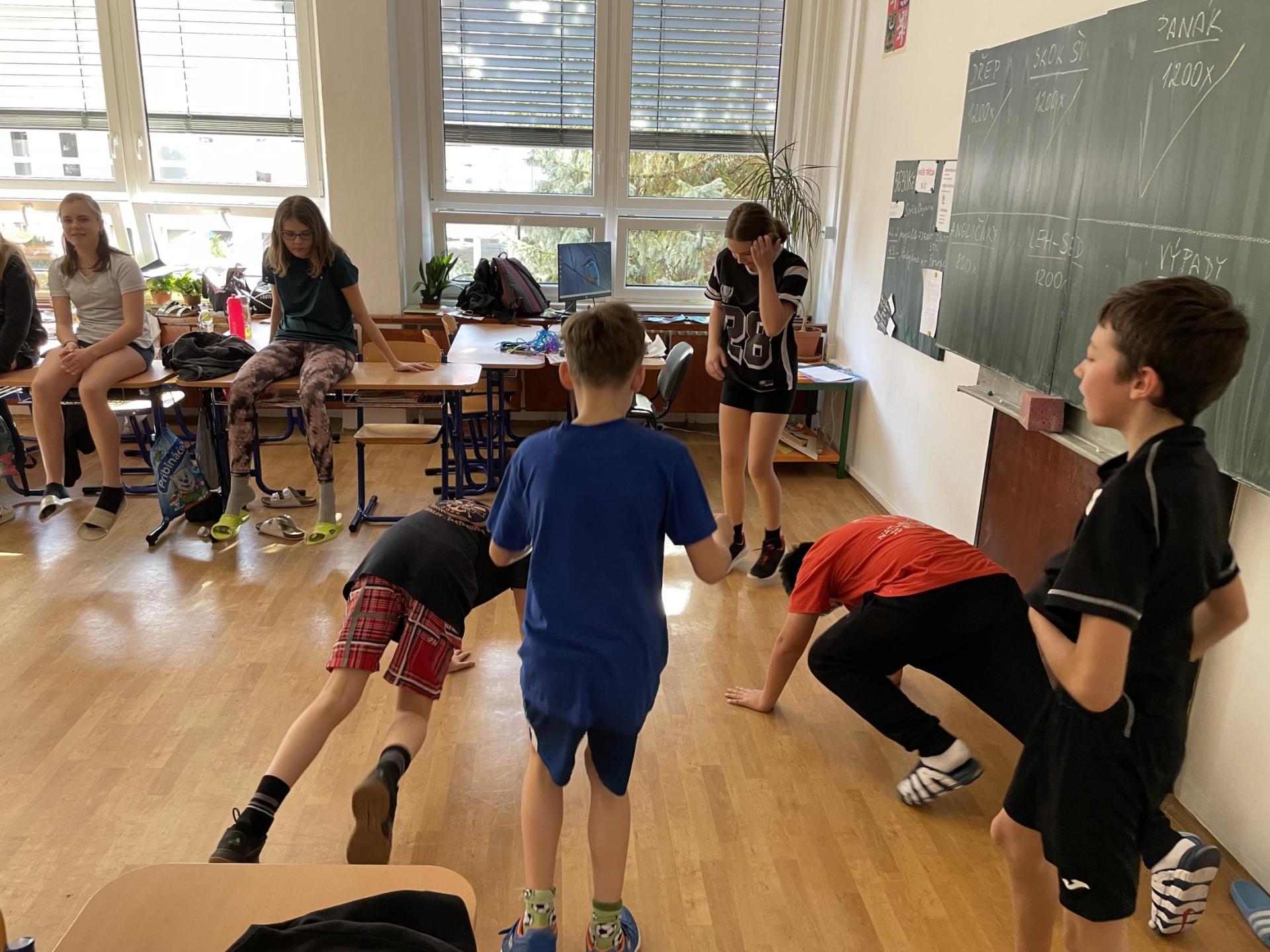 Následovala pohybová výzva, kterou plnili všichni žáci ze třídy (každý něco): 1200x dřepy, 1200x skok přes švihadlo, 1200x výpady, 800x angličáky, 1200x sedy-lehy, 1200x panák.