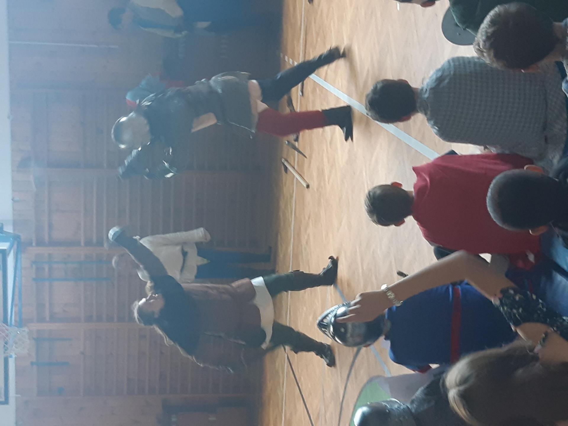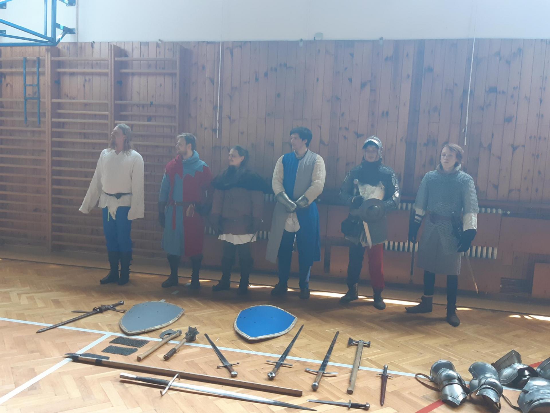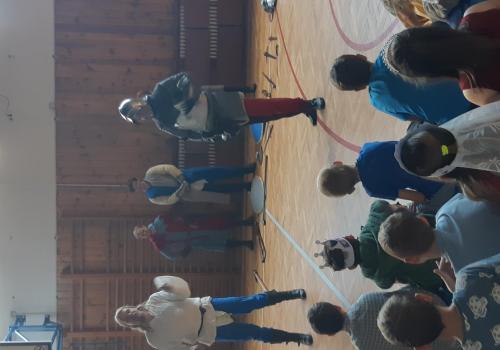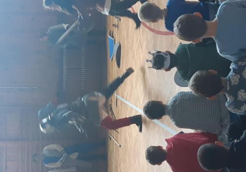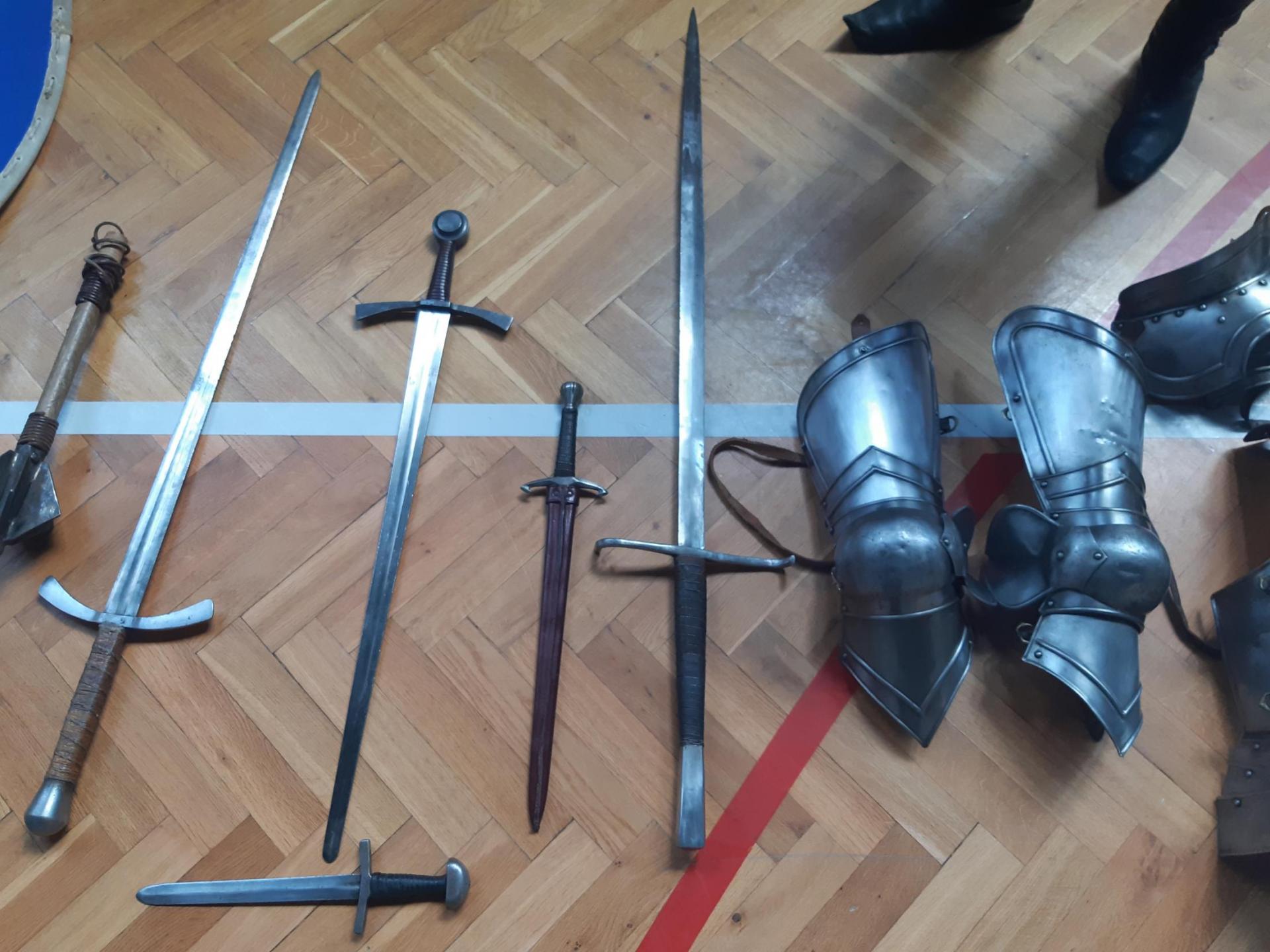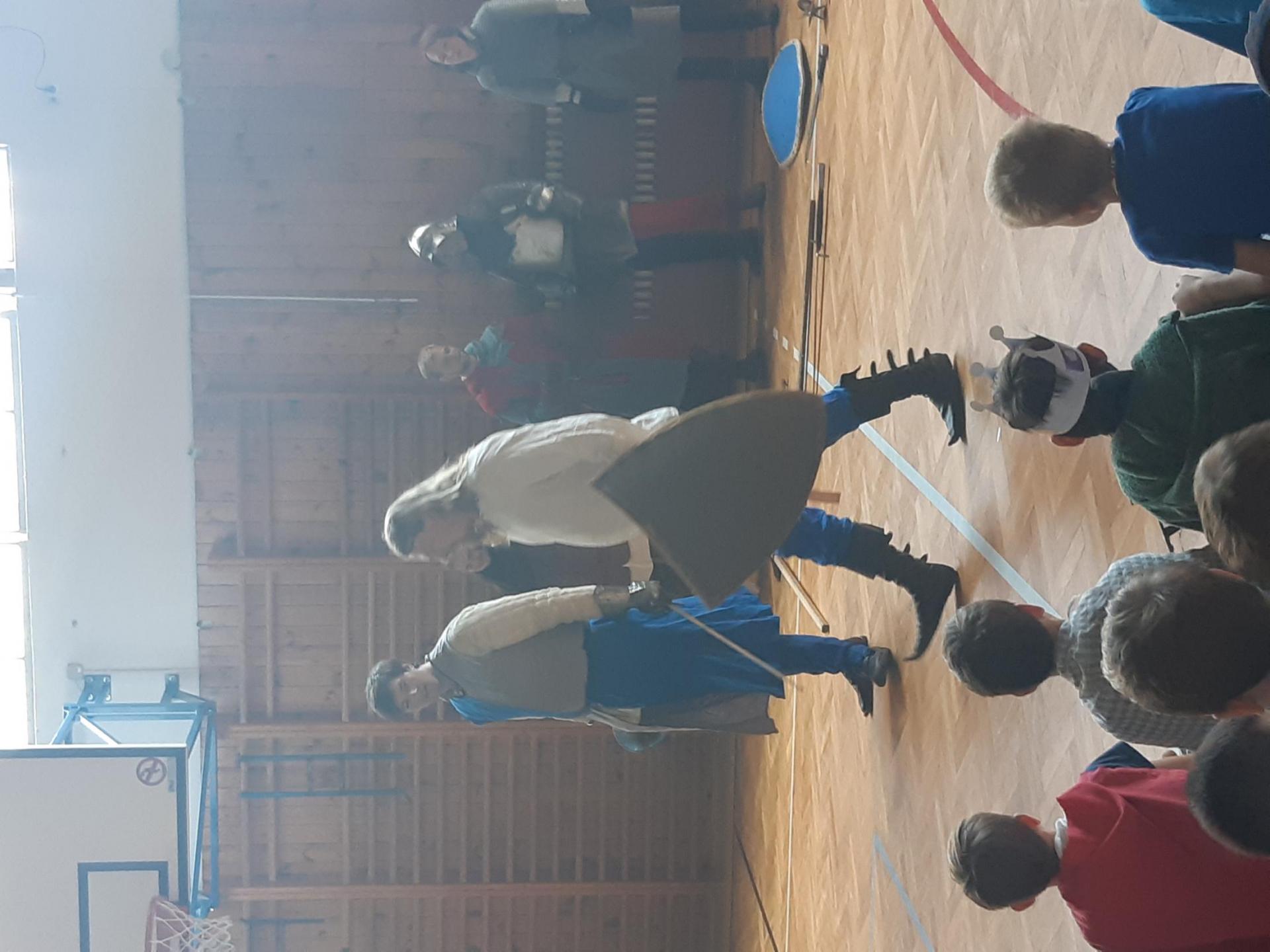 Rytíři ve ŠD. 1.6. nás ve ŠD navštívili rytíři z Pardubic a ukázali žákům středověké zbraně a rytířské klání.