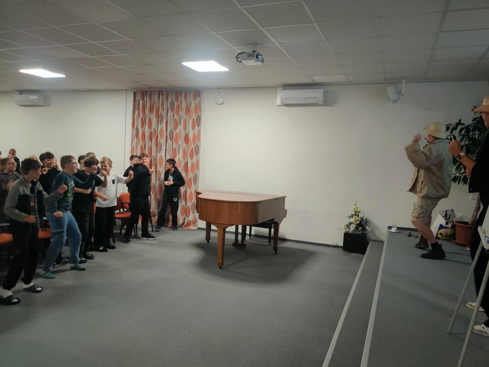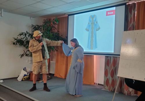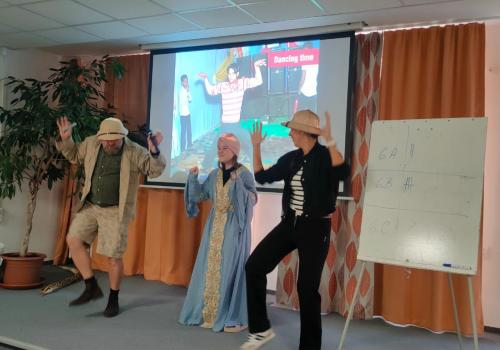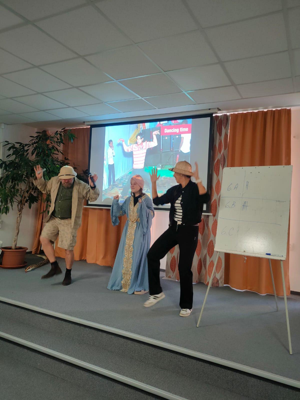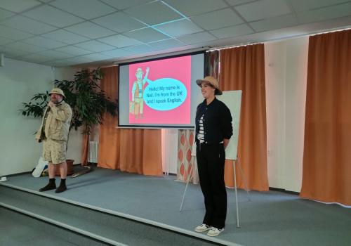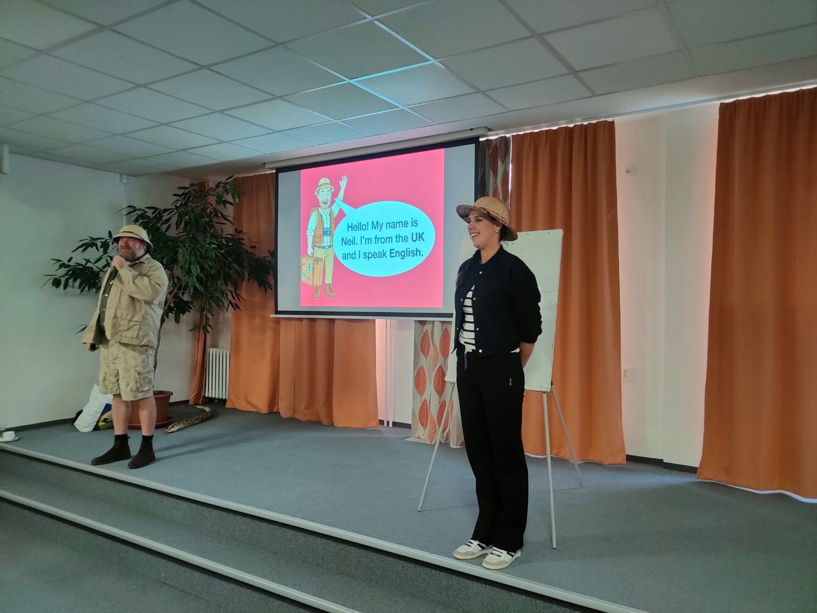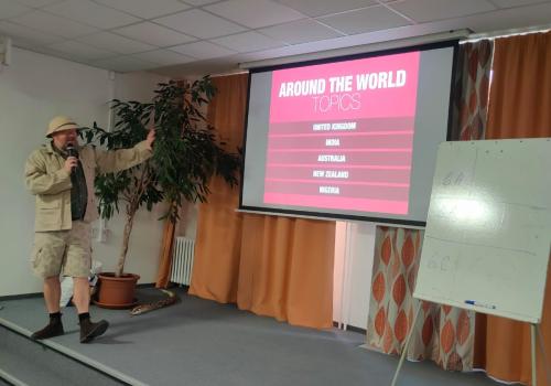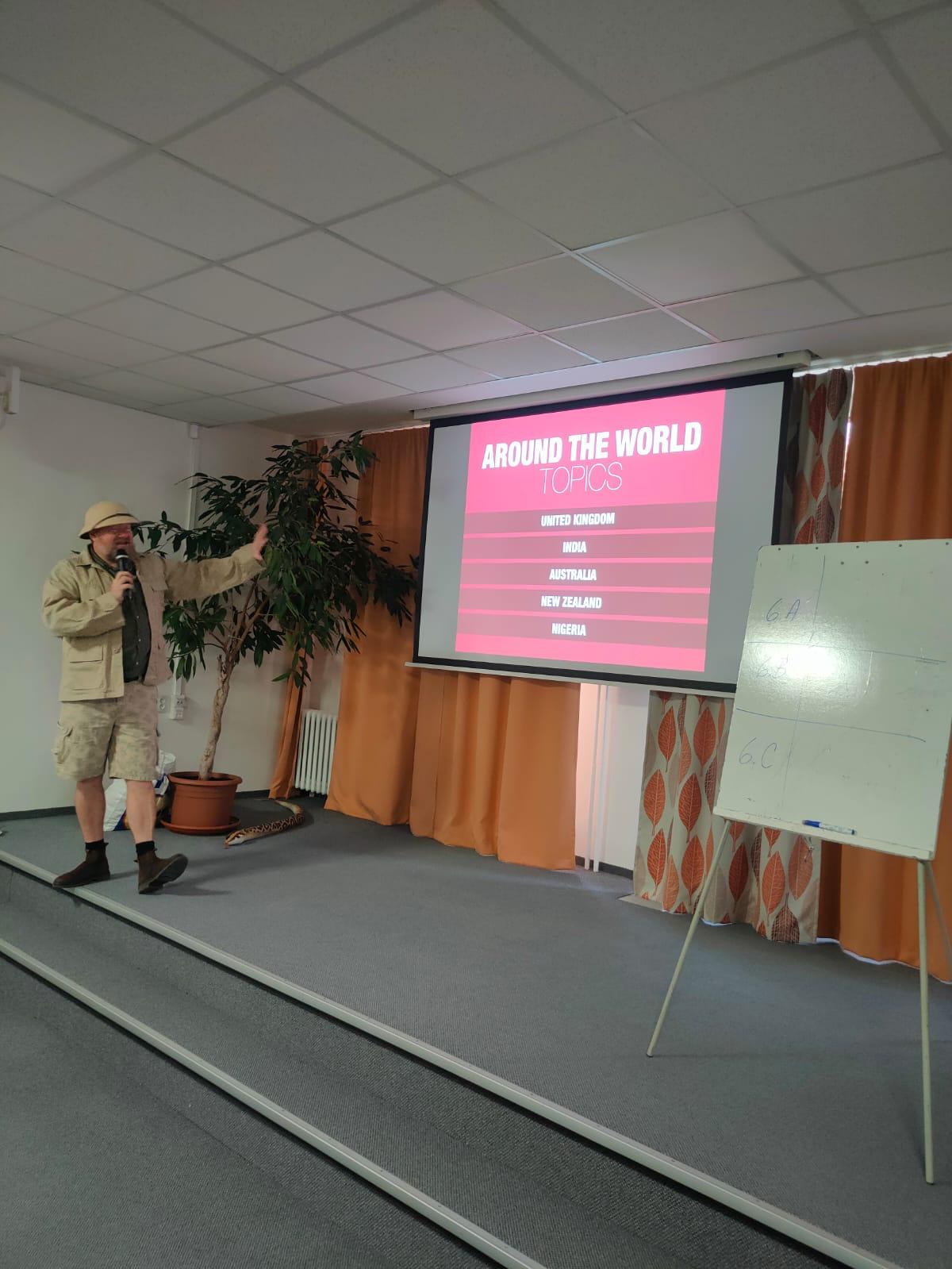 Zábavnou formou plnou informací, soutěží a hudby seznámil žáky 6. – 9. tříd po Británii a Americe s dalšími zeměmi, ve kterých se mluví anglicky.