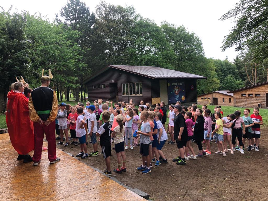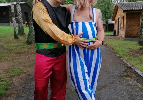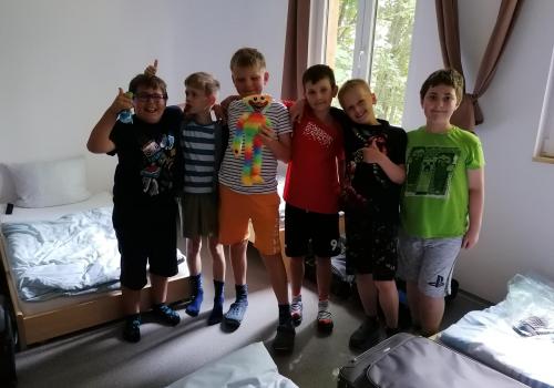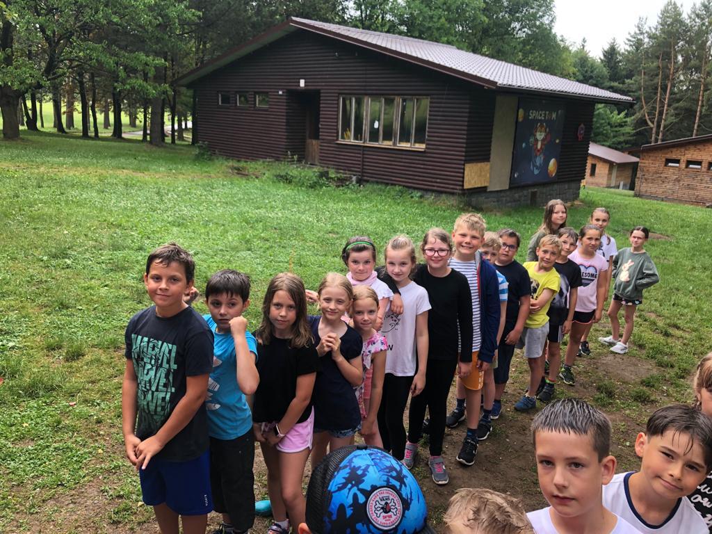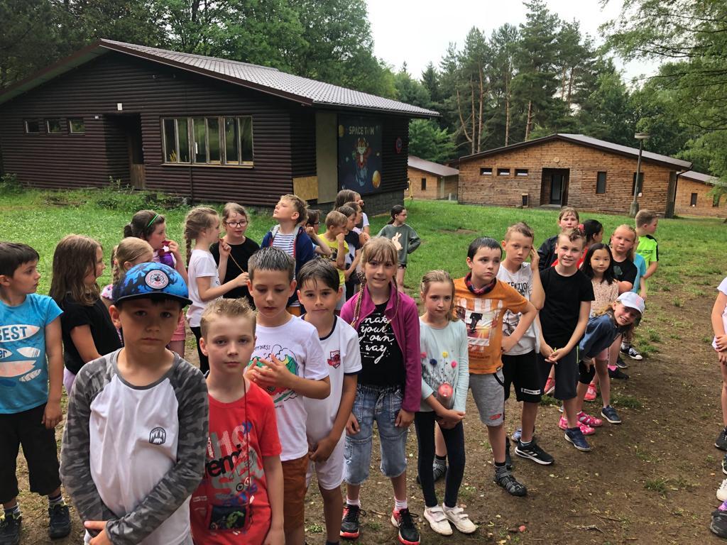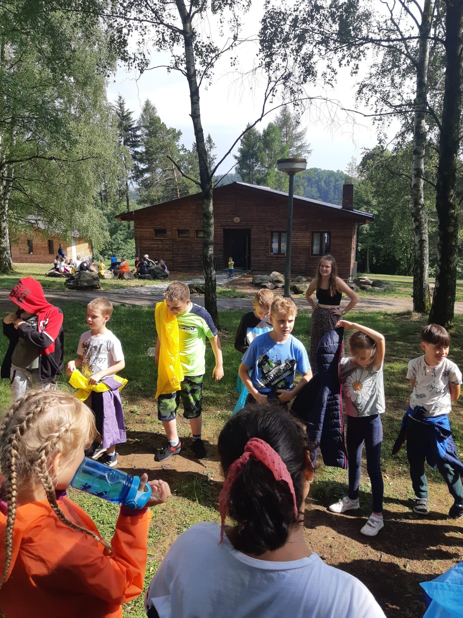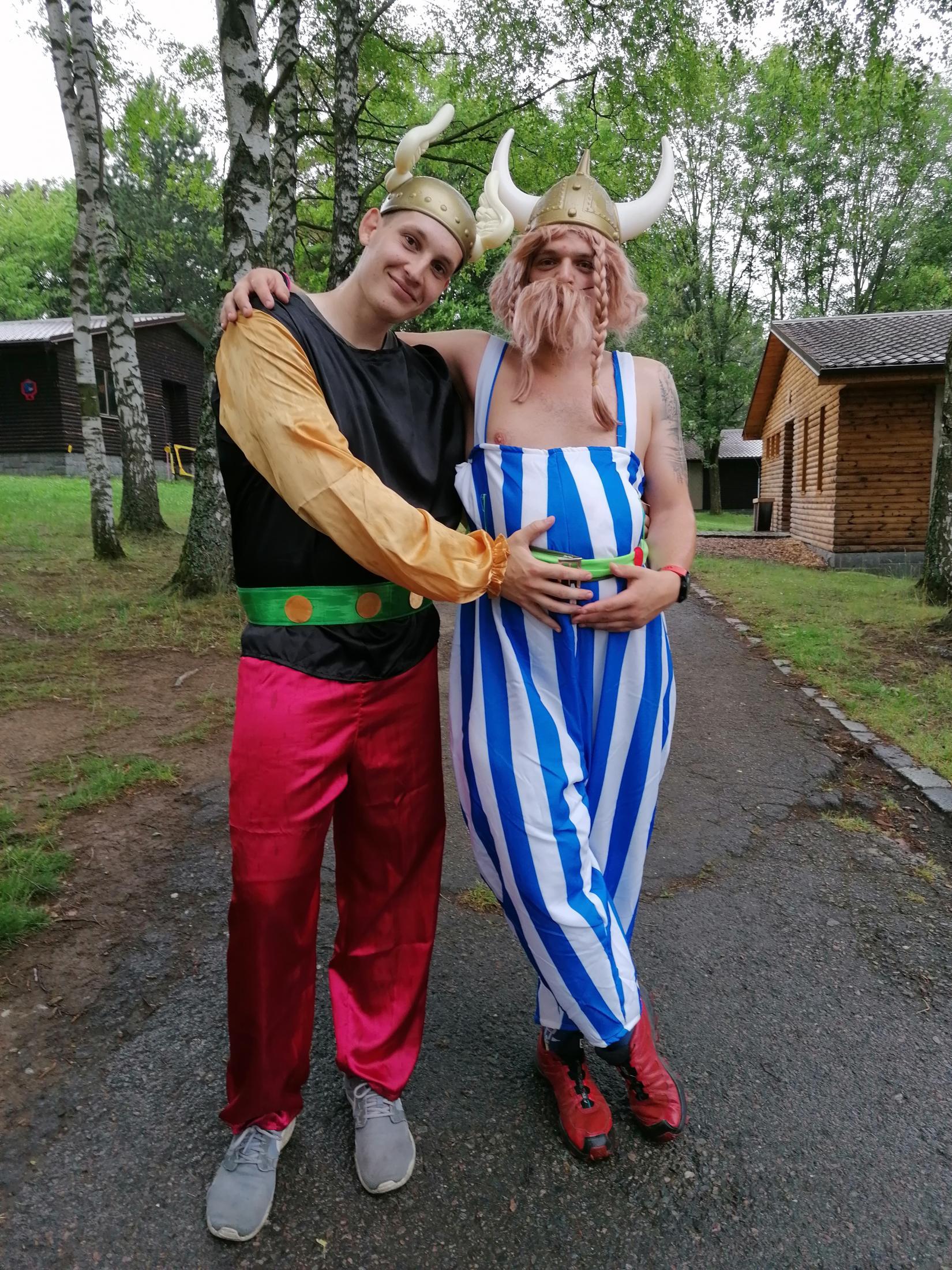 Cesta proběhla bez problémů a za chvíli jsme byli na místě. Po příjezdu jsme se nejdříve ubytovali, trochu si vybalili a hned jsme se šli seznámit s areálem. Po obědě (vývar s nočky a kuře s bramborem) a poledním klidu jsme se kvůli dešti schovali v klubovně a chvíli koukali na film Asterix a Obelix. Když to počasí dovolilo, poprvé se Asterix a Obelix ukázal a rozdělil nás do týmů. Následně jsme se seznámili a zahráli si hry. Čeká nás velké dobrodružství.